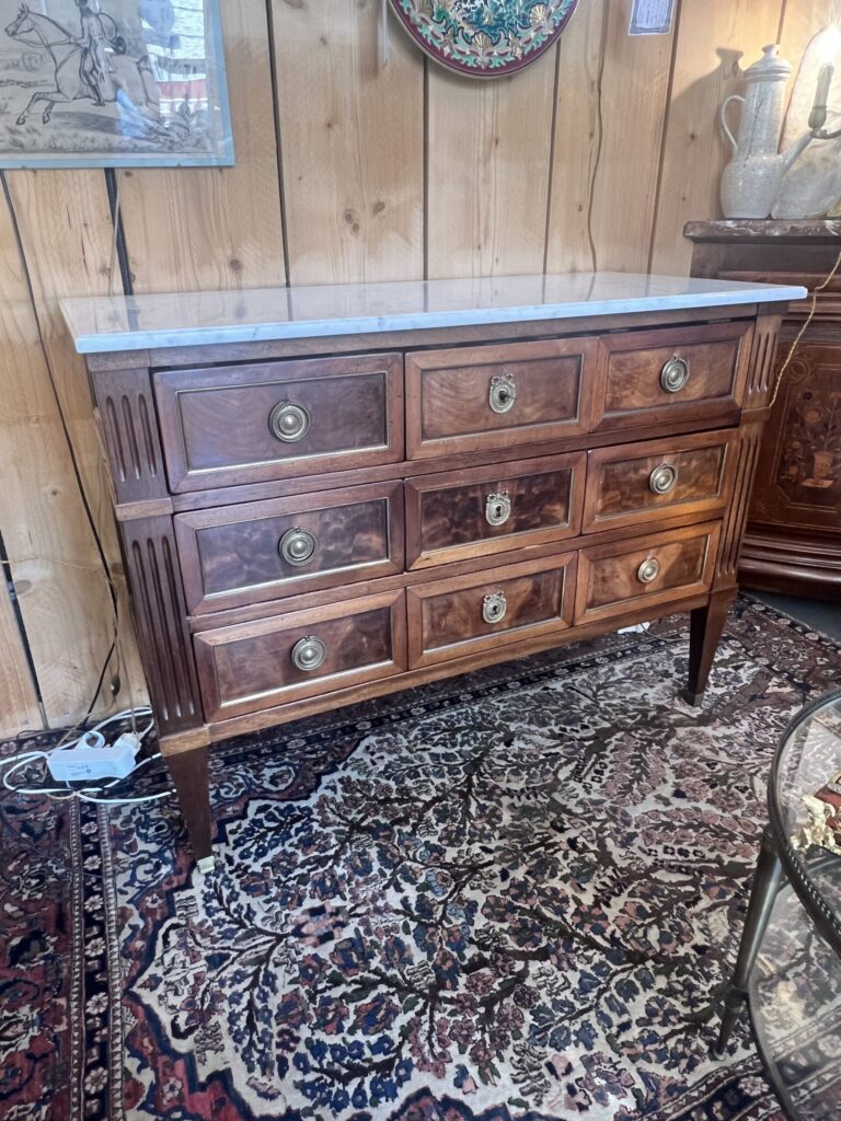 « Commode Louis XVI en acajou, marbre blanc, époque XIXe. Pièce d’antiquité et brocante, élégance et histoire pour votre intérieur. »