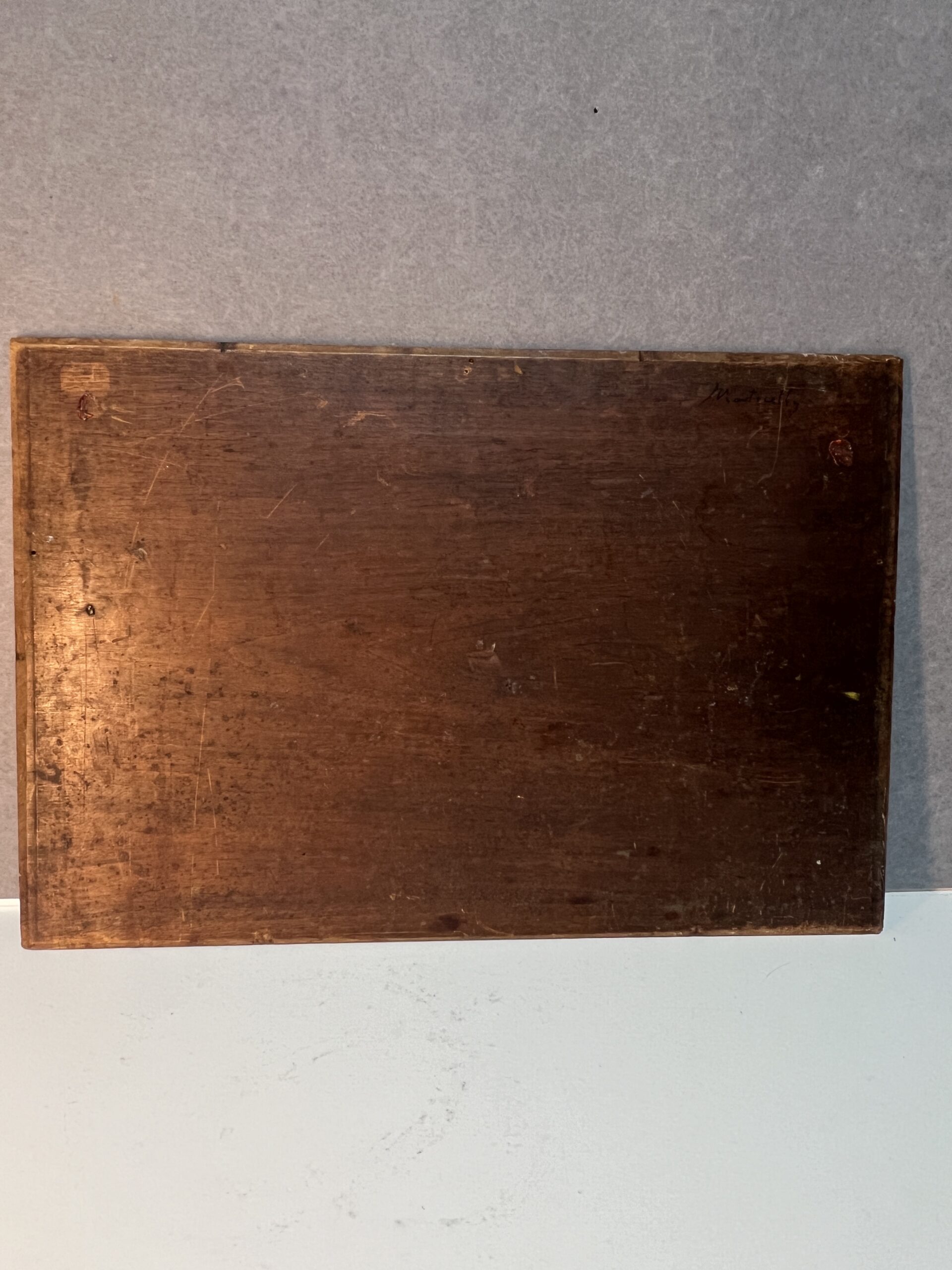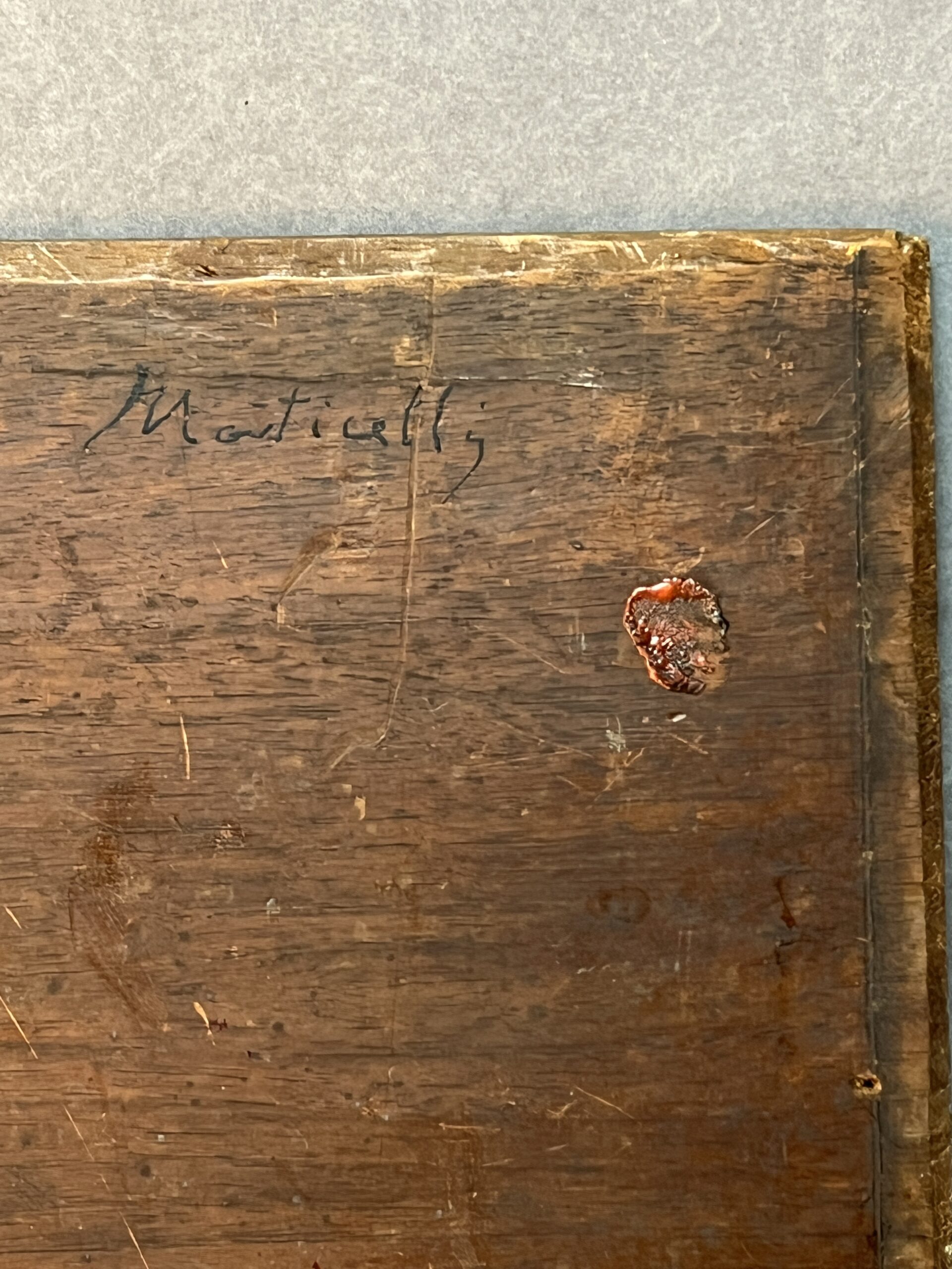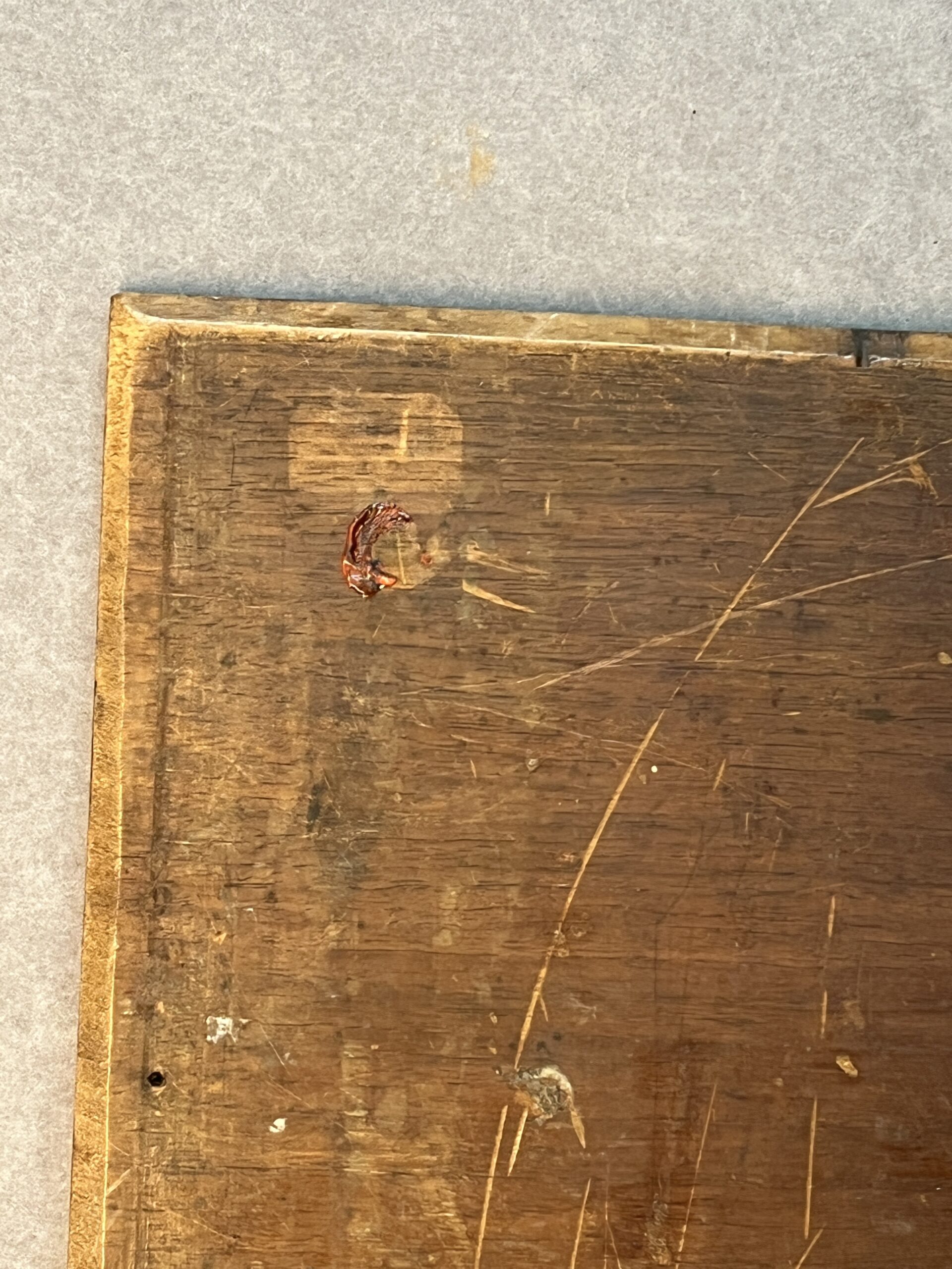 Une autre caractéristique intrigante est la présence d’anciennes traces de cire de sceaux à l’arrière du tableau. Ces traces peuvent susciter des questions sur l’histoire de l’œuvre, suggérant peut-être des propriétaires antérieurs ou des circonstances particulières entourant sa création et sa préservation.