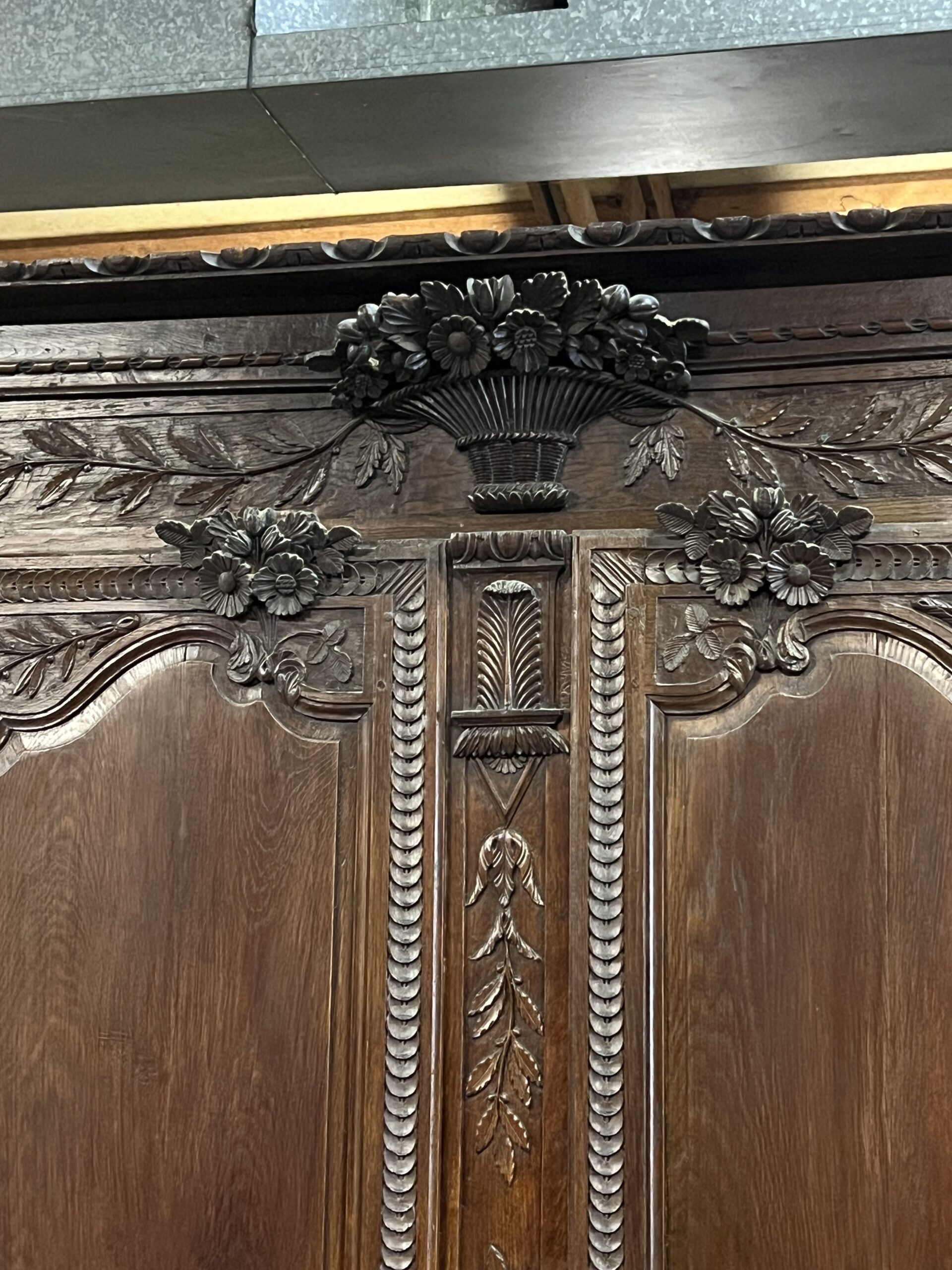 Dès le premier regard, l’œil est captivé par la finesse des détails sculptés qui ornent chaque centimètre de cette pièce. Sur la traverse supérieure, un motif délicat de panier fleuri évoque la nature dans toute sa splendeur. Les artisans qui ont façonné cette armoire ont su capturer la beauté éphémère des fleurs dans un élan de pérennité, conférant ainsi à cette pièce une élégance intemporelle.
