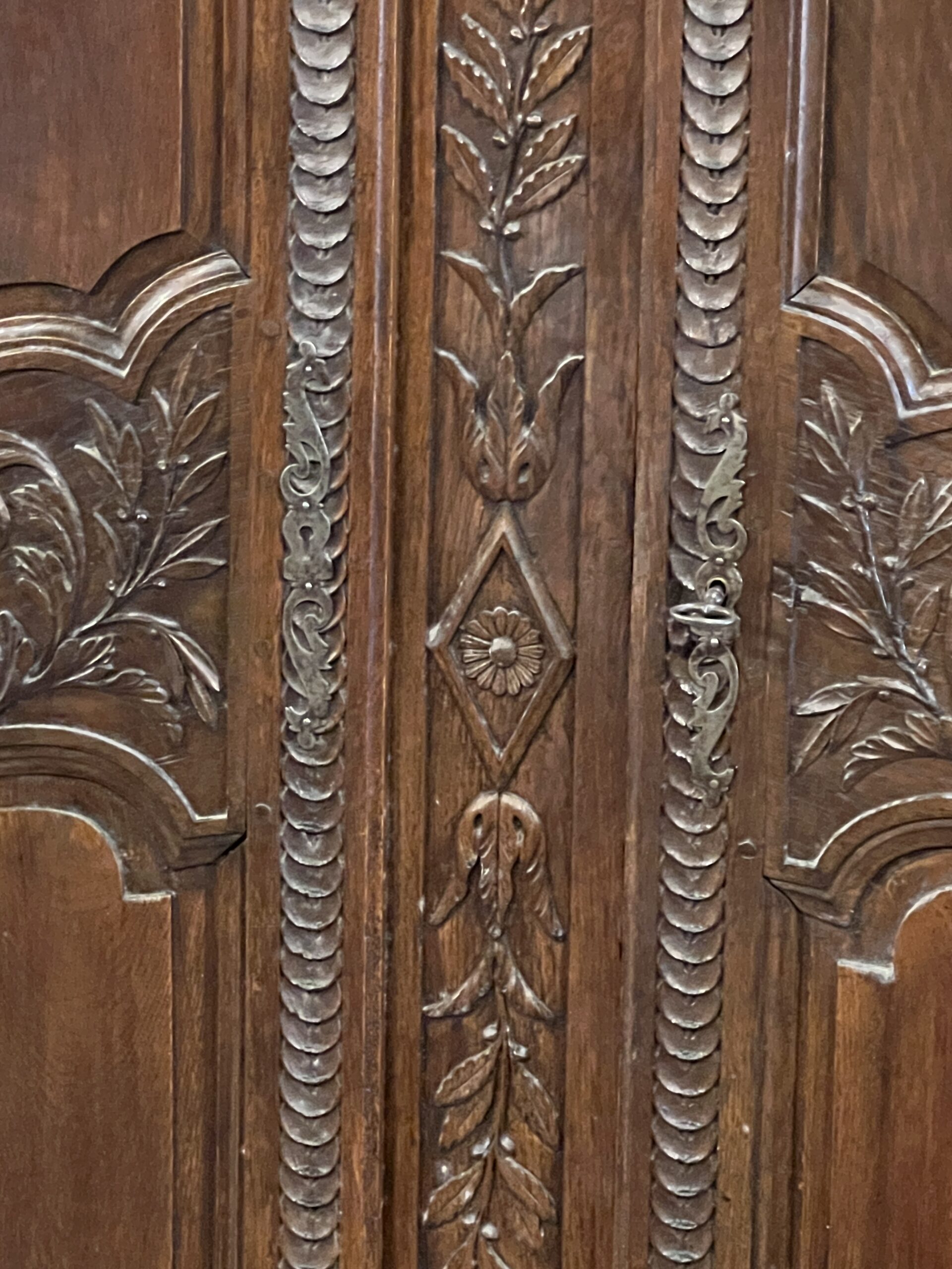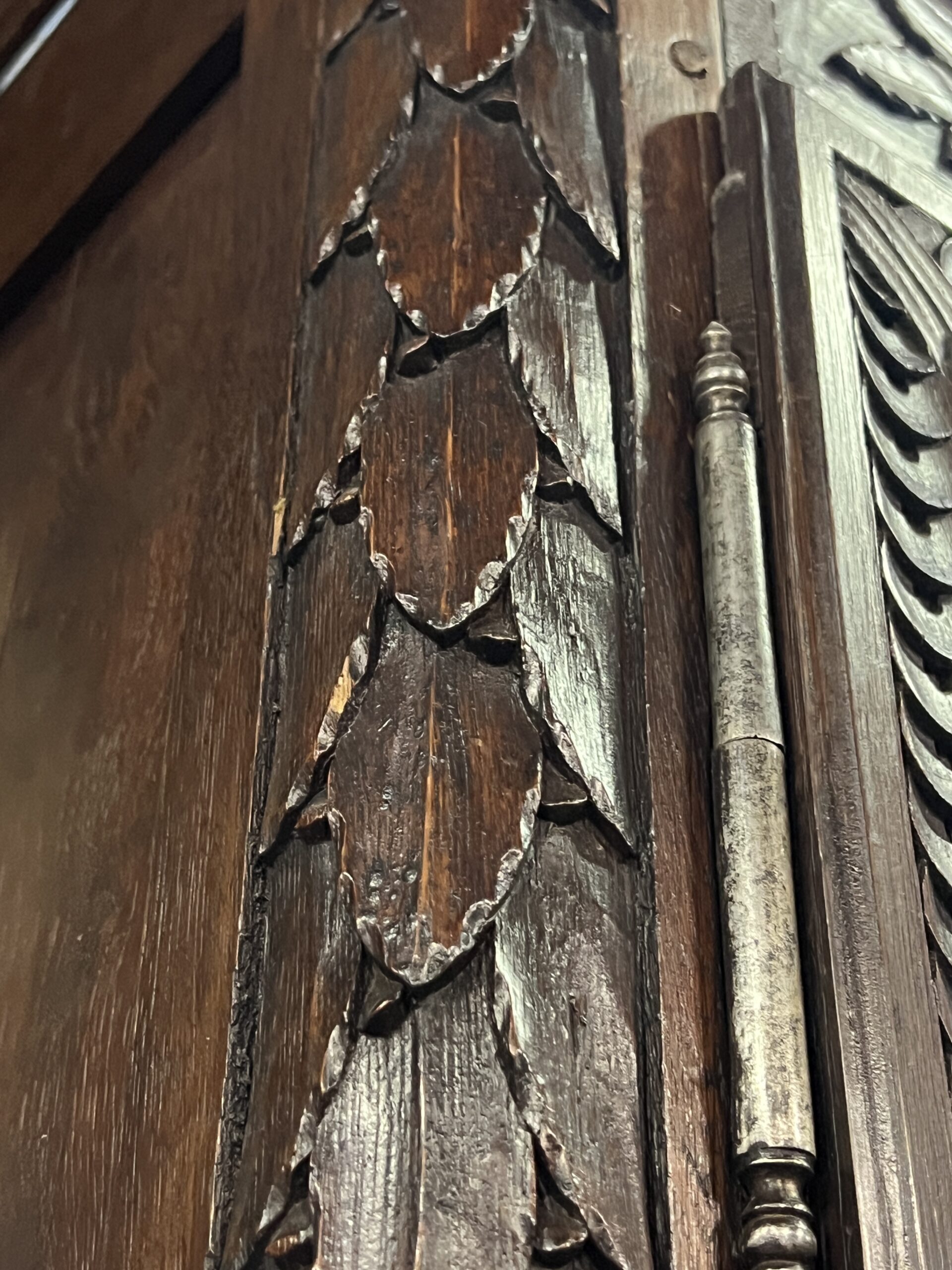 Les portes de l’armoire sont encadrées par un entourage sculpté de la monnaie du pape, un motif botanique classique qui ajoute une subtile touche de sophistication à l’ensemble. Ce choix de décor témoigne non seulement du goût esthétique de l’époque, mais aussi de l’attachement à la nature et à ses symboles.