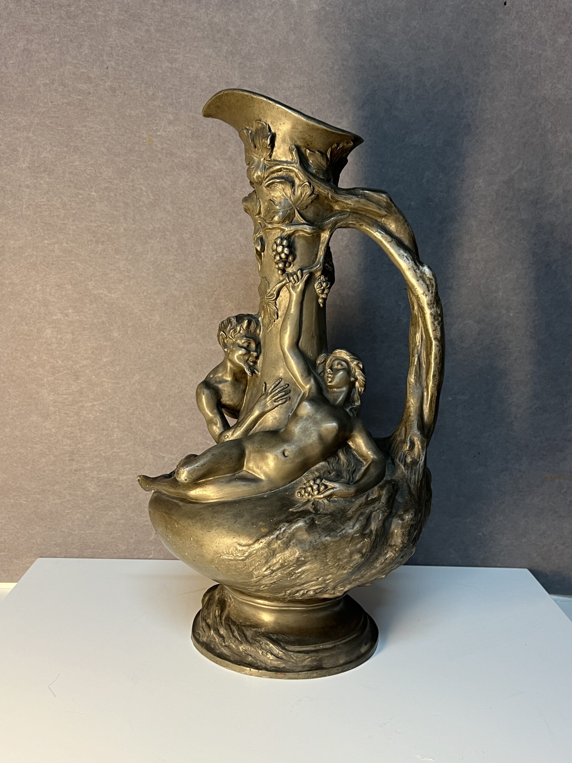 L’aiguière, d’une hauteur de 39 cm, est réalisée en bronze avec une sculpture en relief en étain sur sa panse.