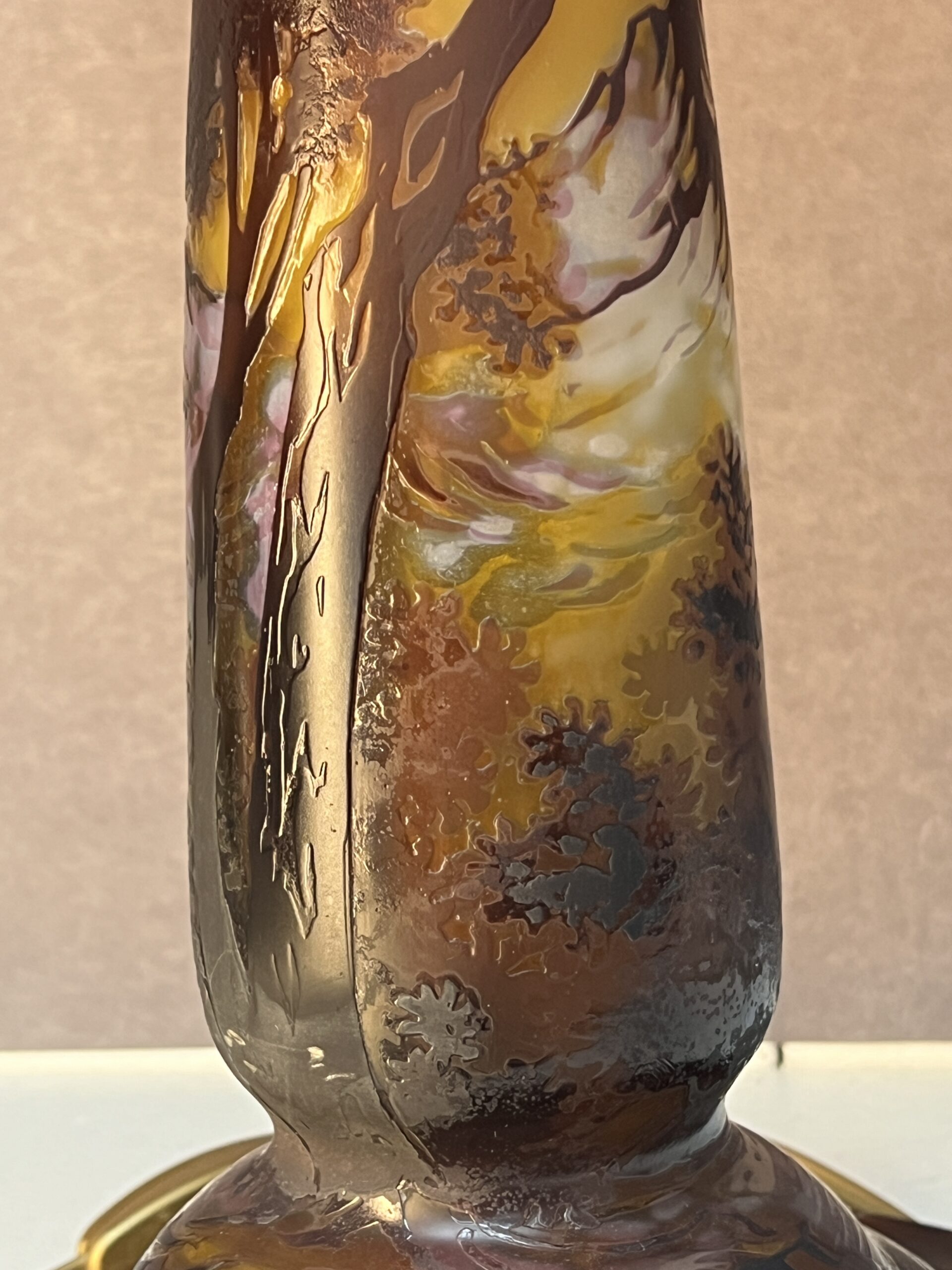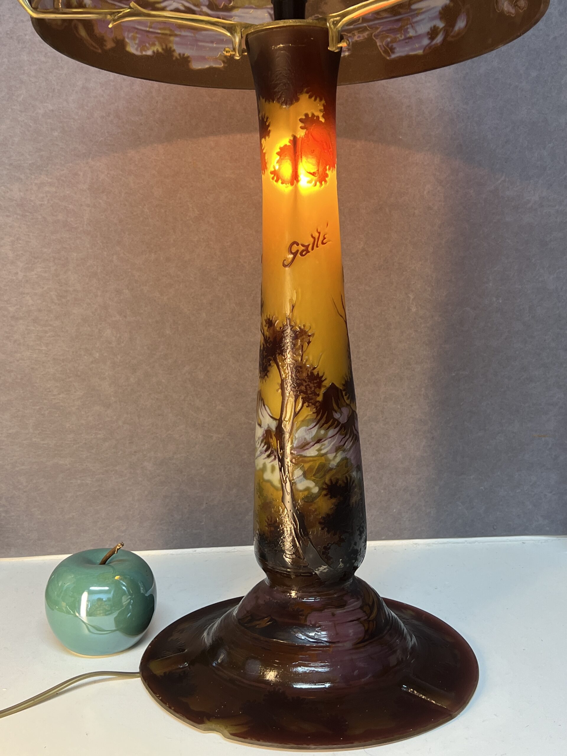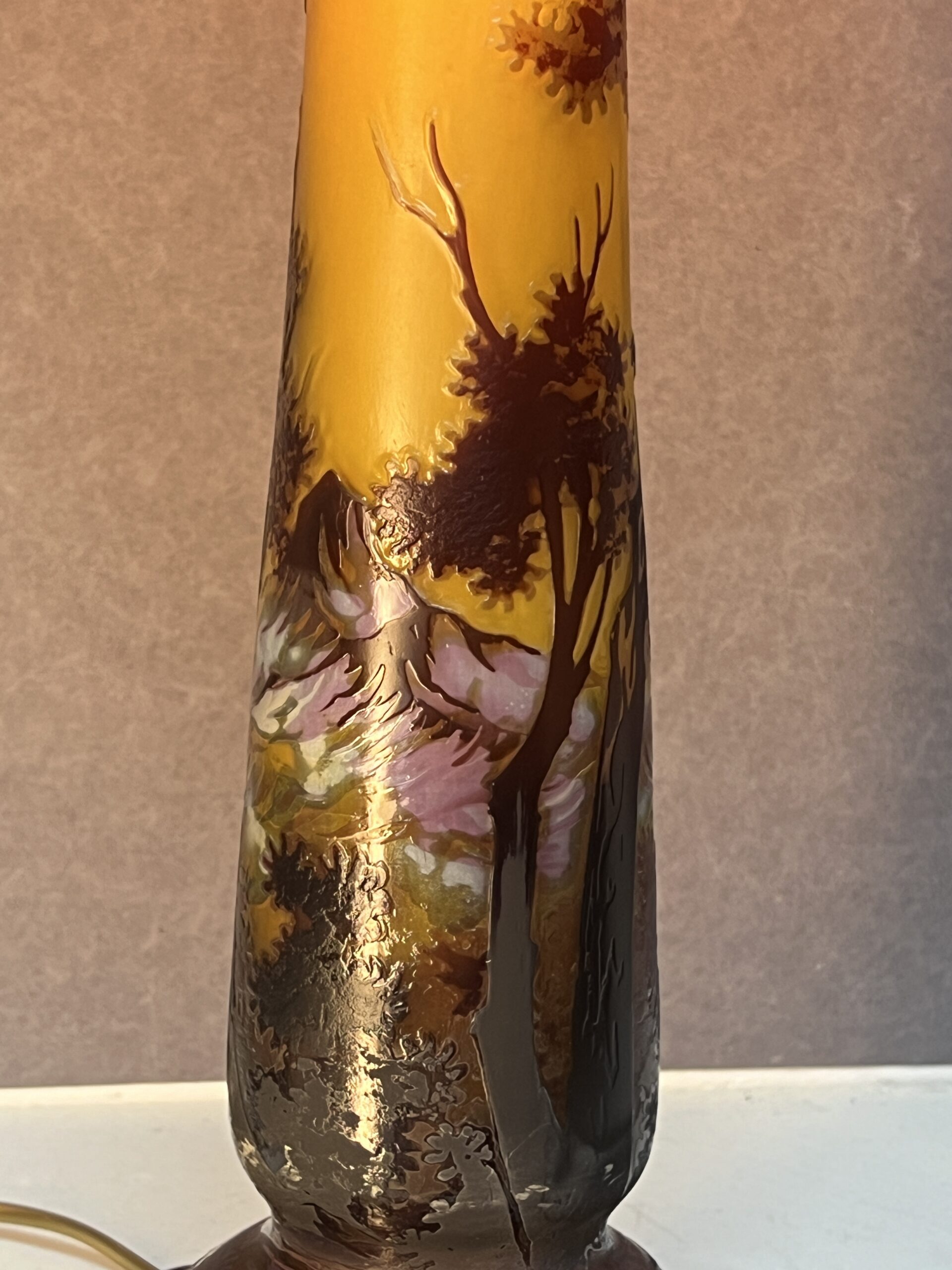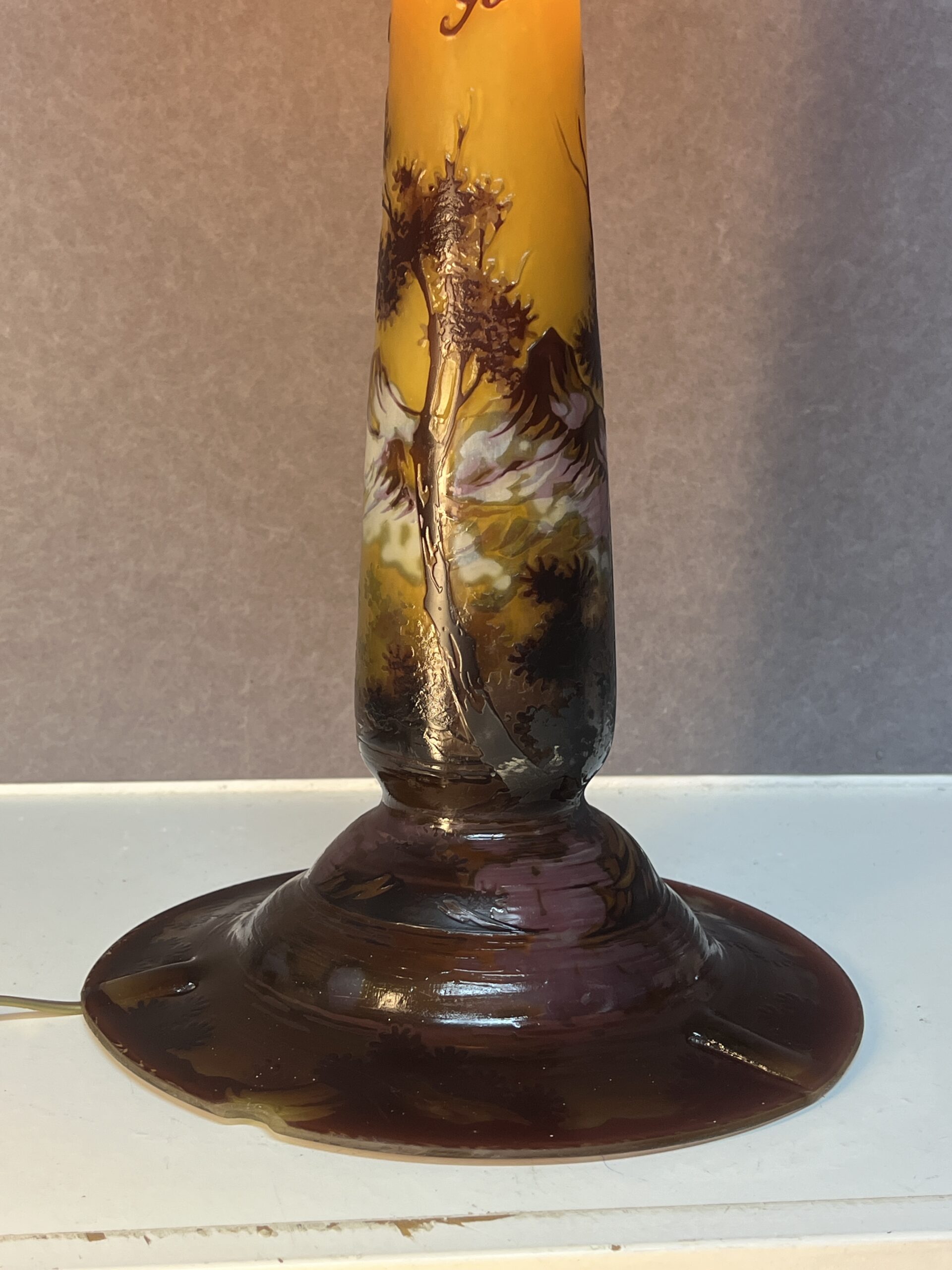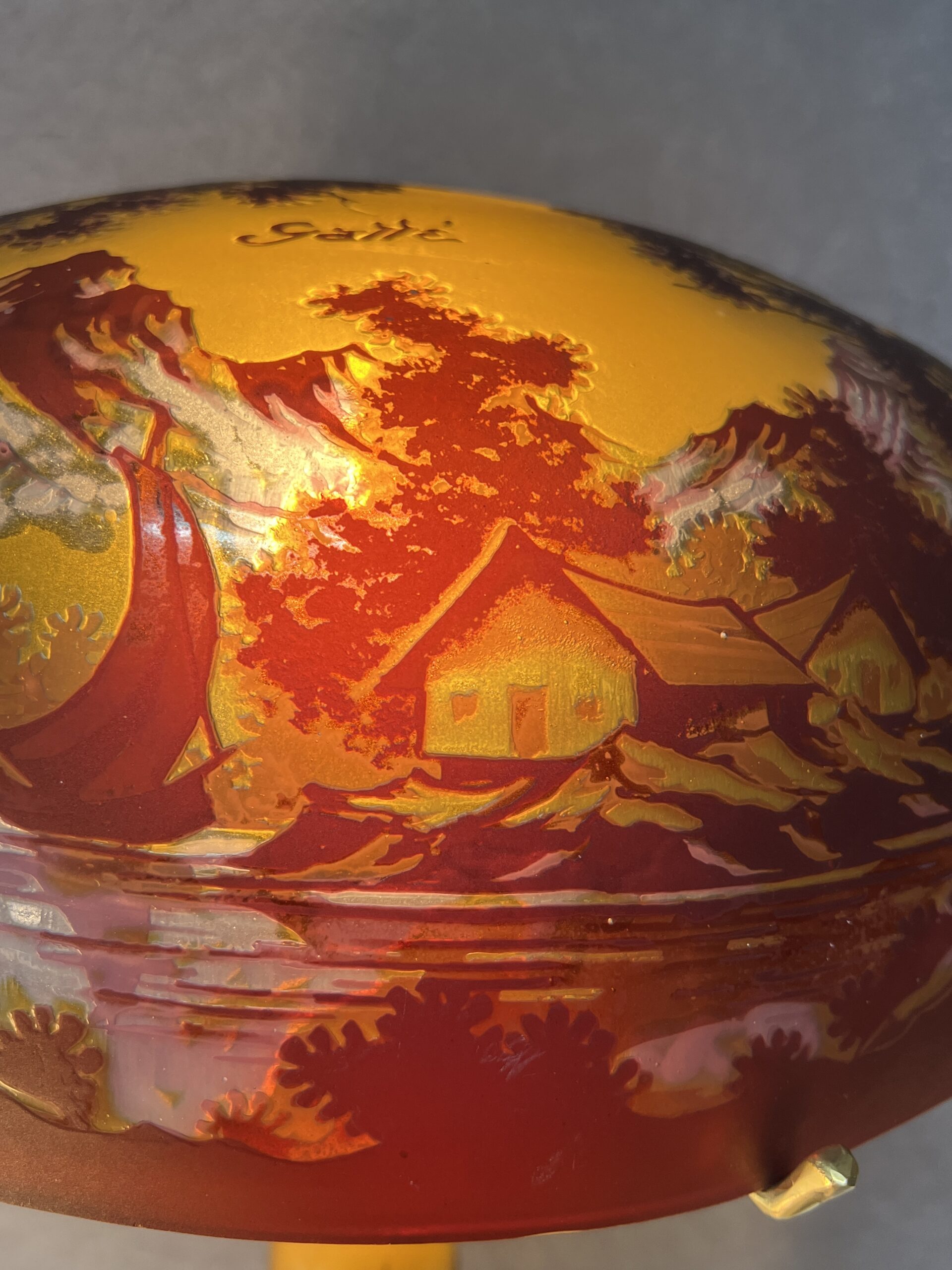 Ce qui rend cette lampe encore plus spéciale, c’est son harmonie avec le style et l’esthétique d’Émile Gallé, le célèbre maître verrier et designer français. Les lignes élégantes, les motifs floraux délicats et l’utilisation judicieuse de la pâte de verre rappellent incontestablement l’influence de ce grand artiste. Cela confère à la lampe une aura de sophistication et de raffinement même avec son petit défaut de cuisson qui se trouve a son pied, tout en lui rendant hommage à travers un style intemporel.