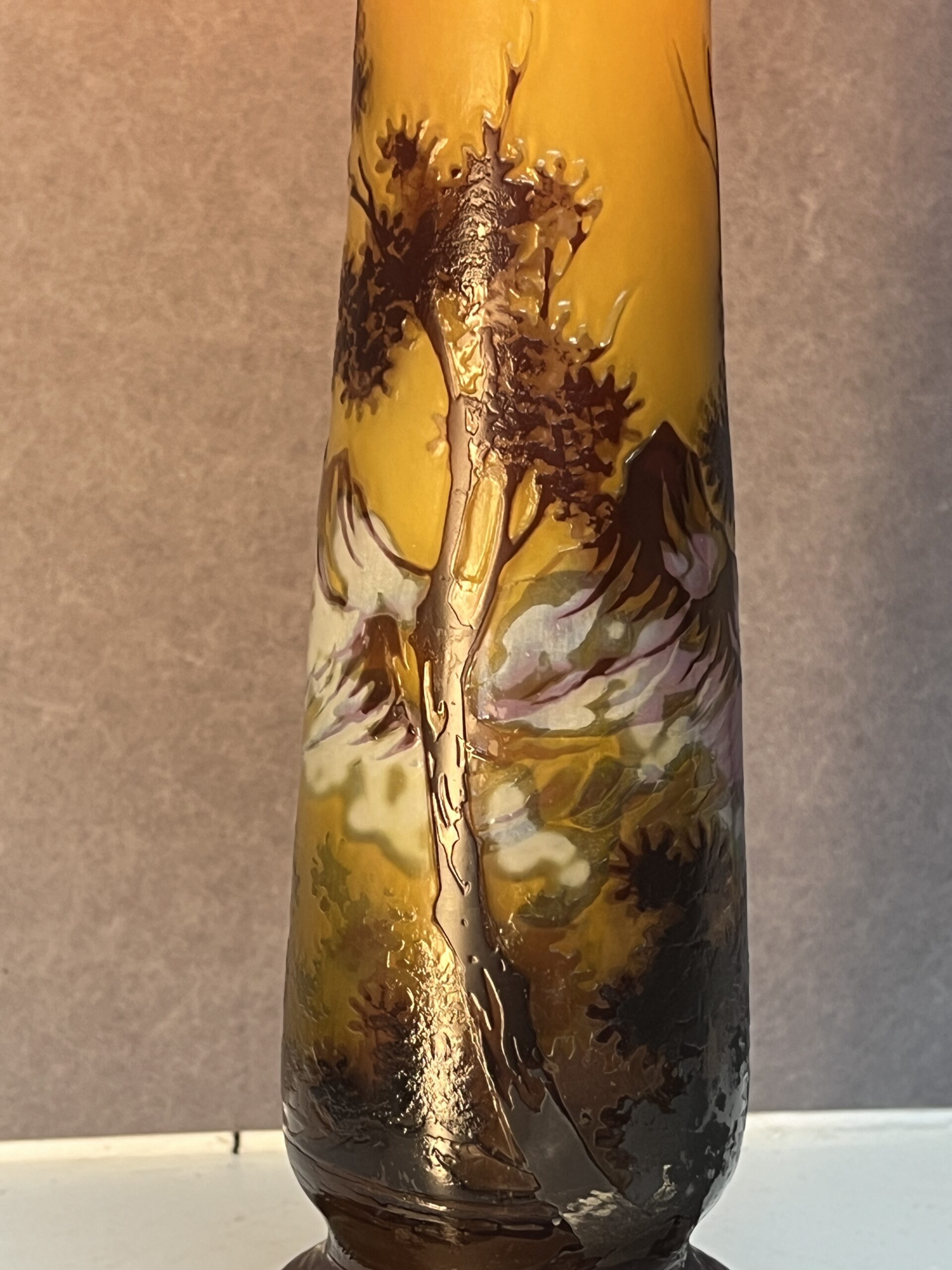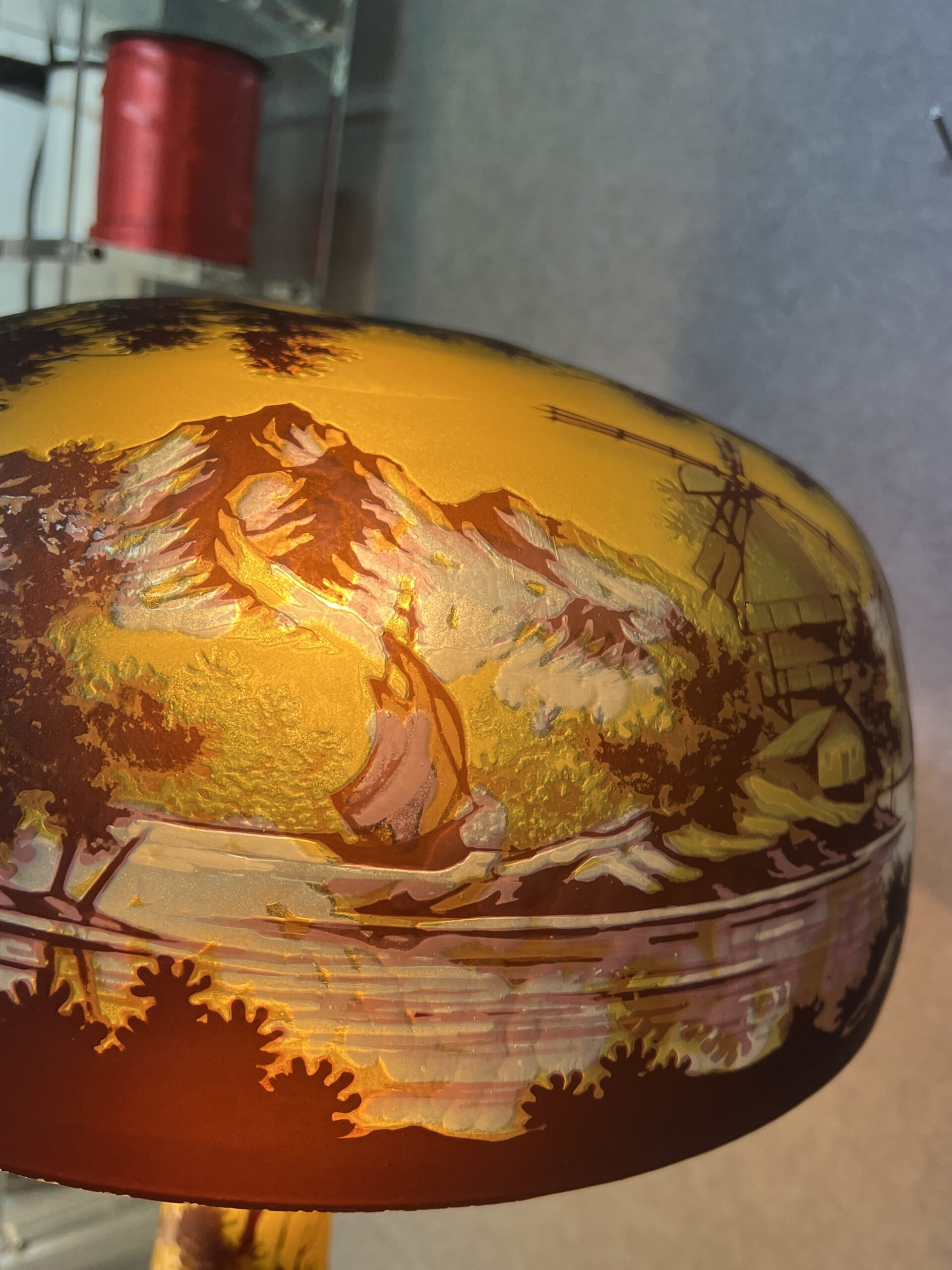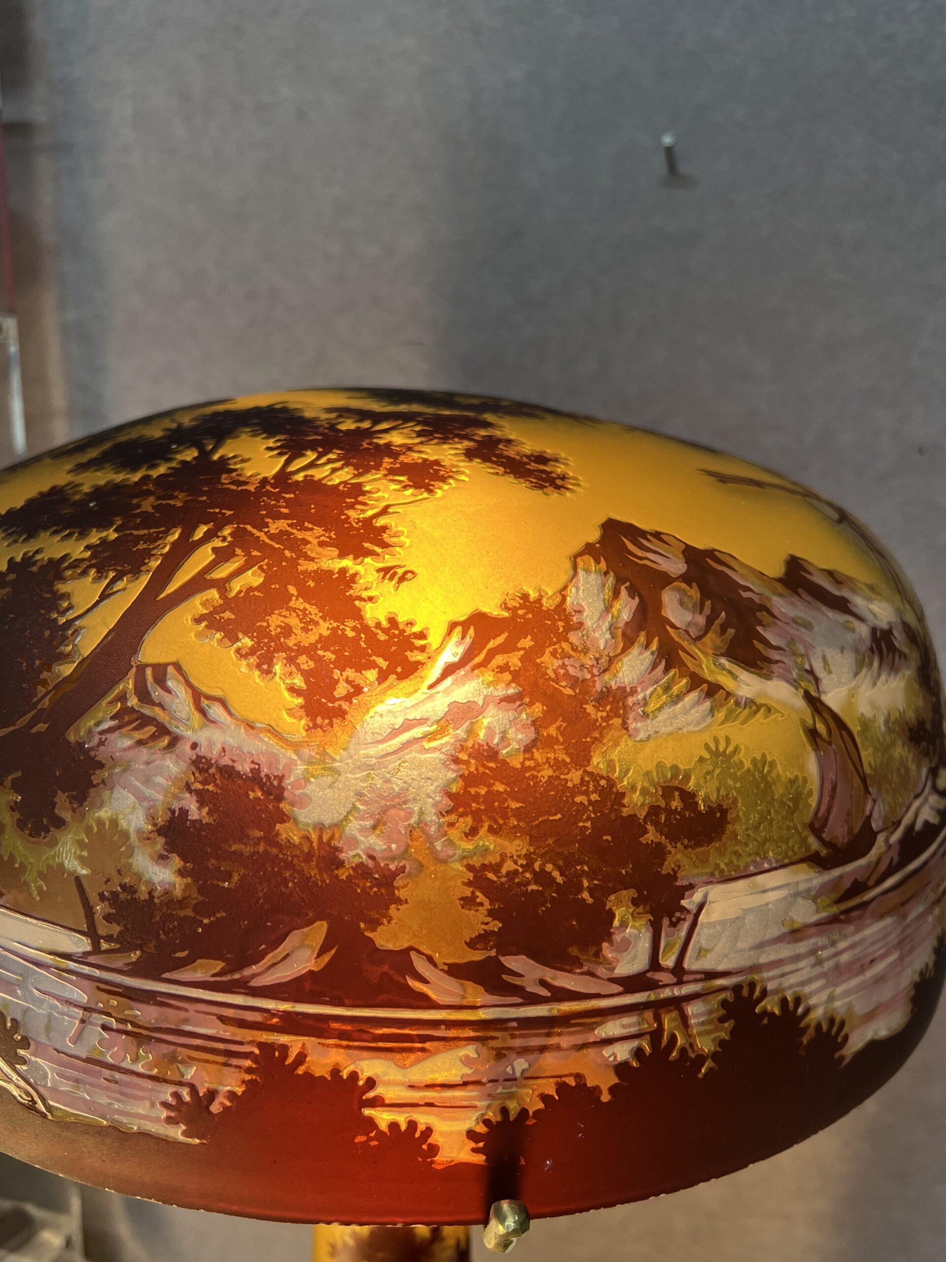 Dès le premier regard, on est captivé par le décor enchanteur qui enveloppe la lampe. Un paysage de montagne, réalisé en multicouche de pâte de verre, s’étend sur sa surface. Chaque détail est finement travaillé, chaque nuance capturant la beauté des reliefs et des nuances de la nature. C’est comme si l’on pouvait presque sentir l’air frais des sommets et entendre le murmure des ruisseaux. Cette représentation artistique transporte le spectateur dans un monde de poésie et de contemplation.