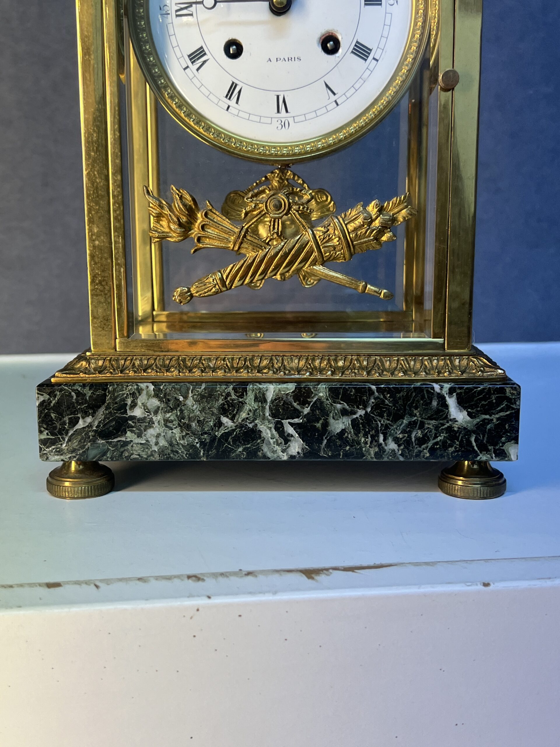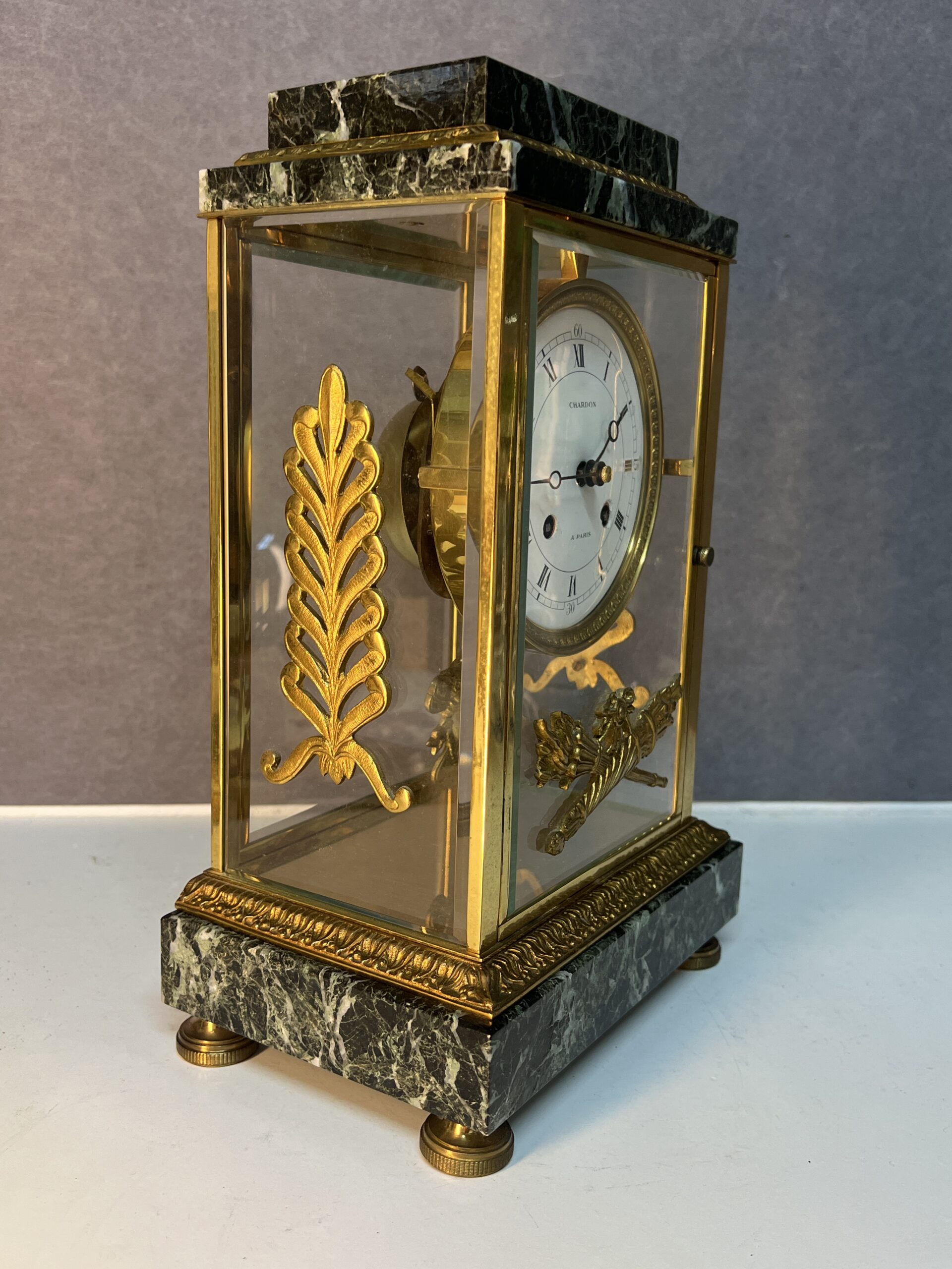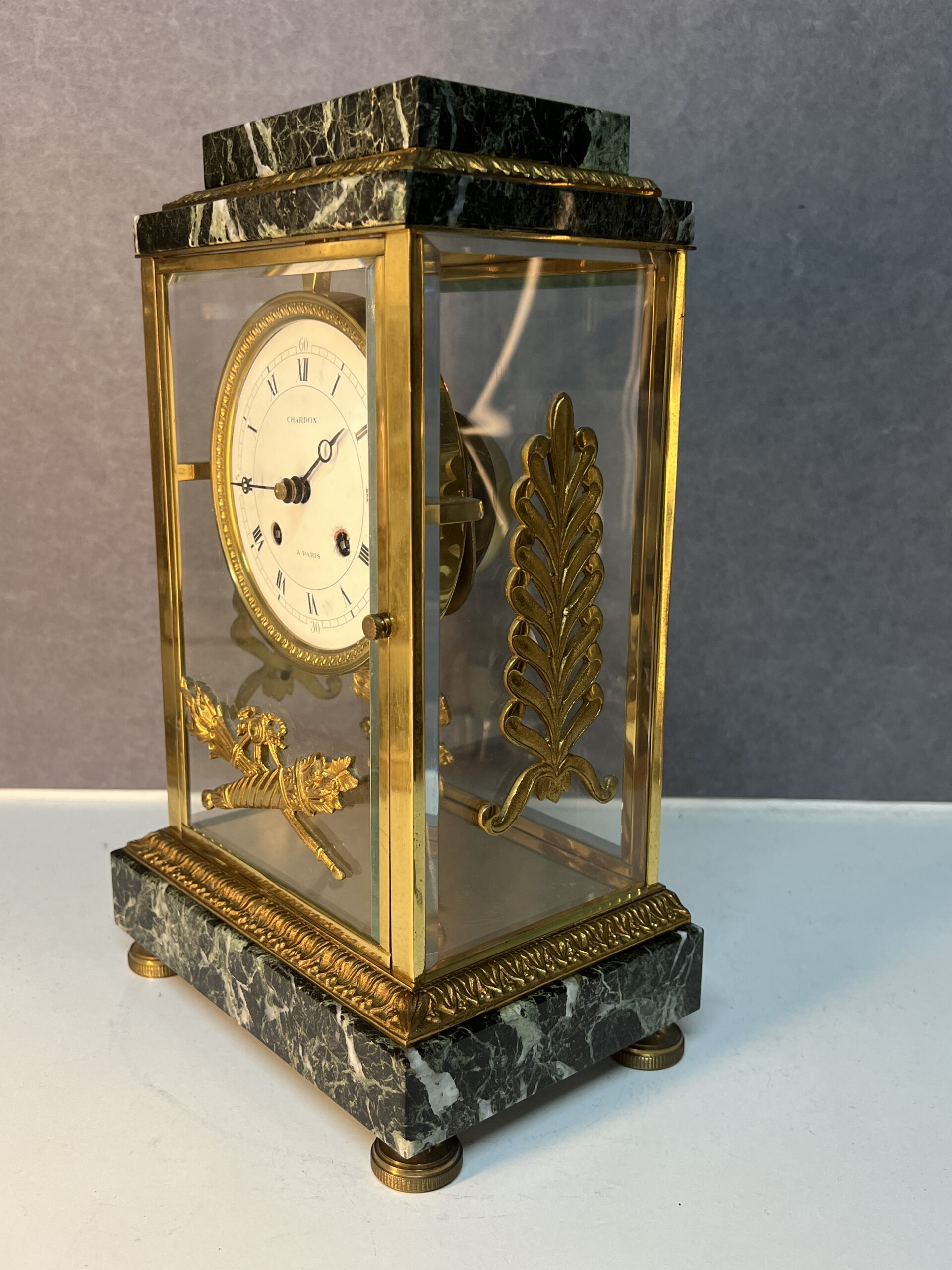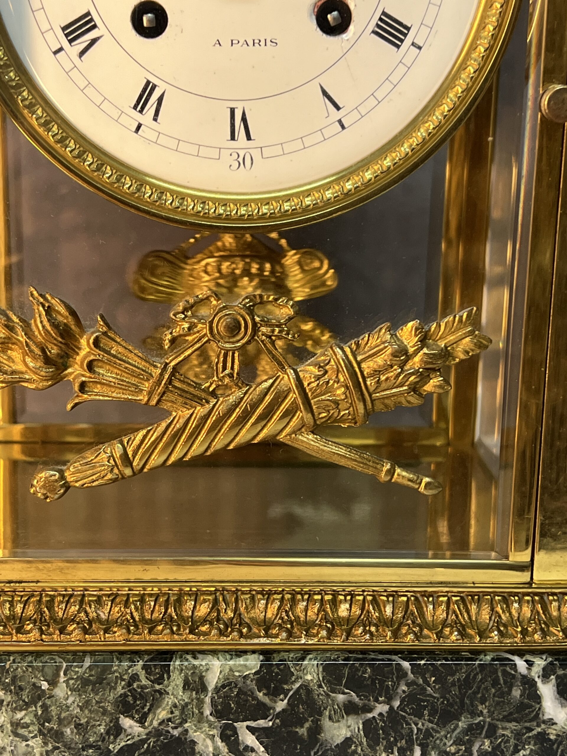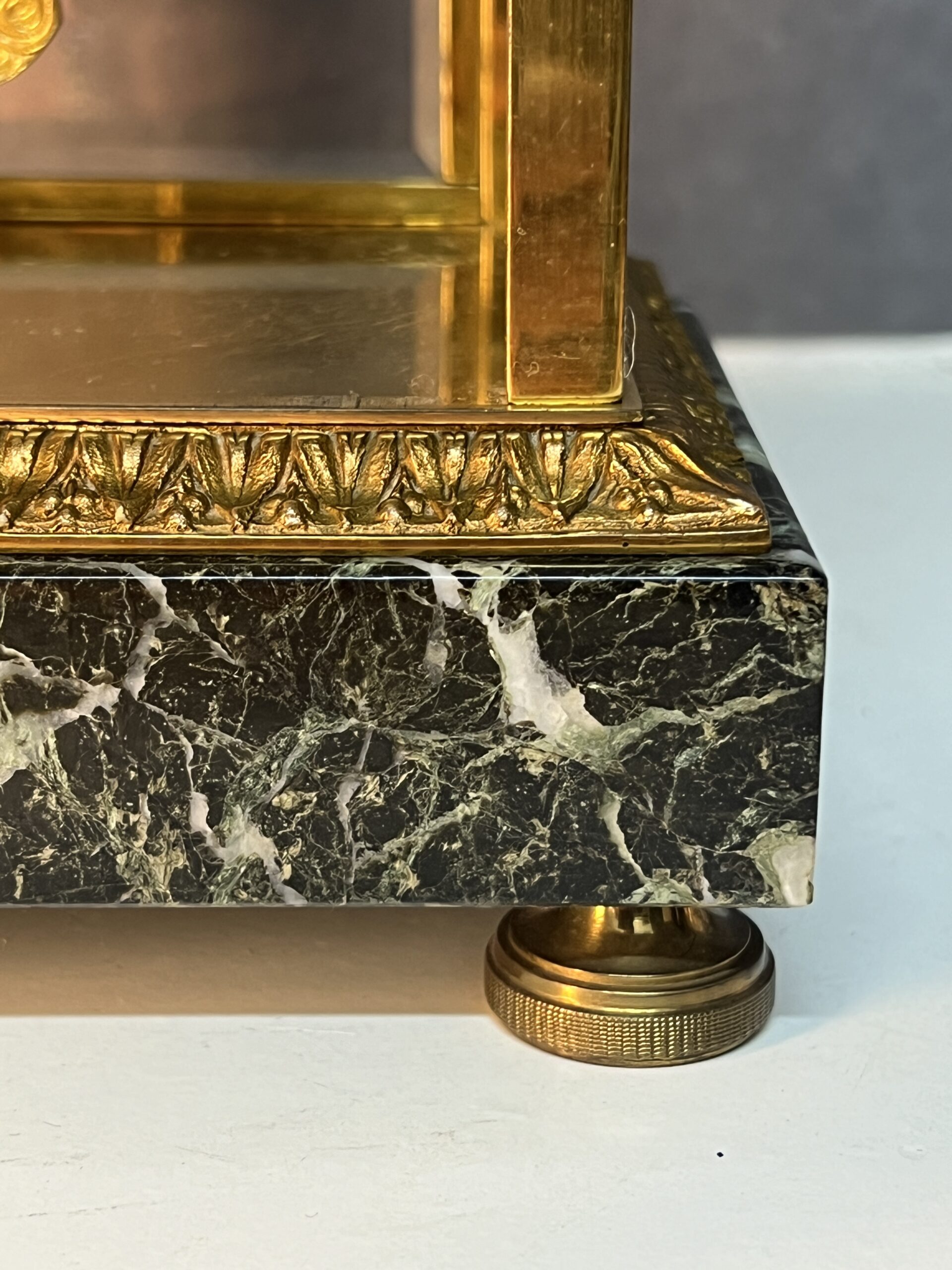 La base et la partie supérieure de la pendule sont en marbre vert de mer, un matériau prisé pour sa beauté et sa durabilité. Ce marbre est orné de frises finement ciselées, typiques du style Empire. Les motifs de palmettes, de flambeaux et de nœuds croisés ajoutent une touche de luxe et de grandeur, reflétant l’opulence et le goût raffiné de l’époque. Ces détails ornementaux témoignent d’un savoir-faire exceptionnel et d’une attention minutieuse aux finitions.