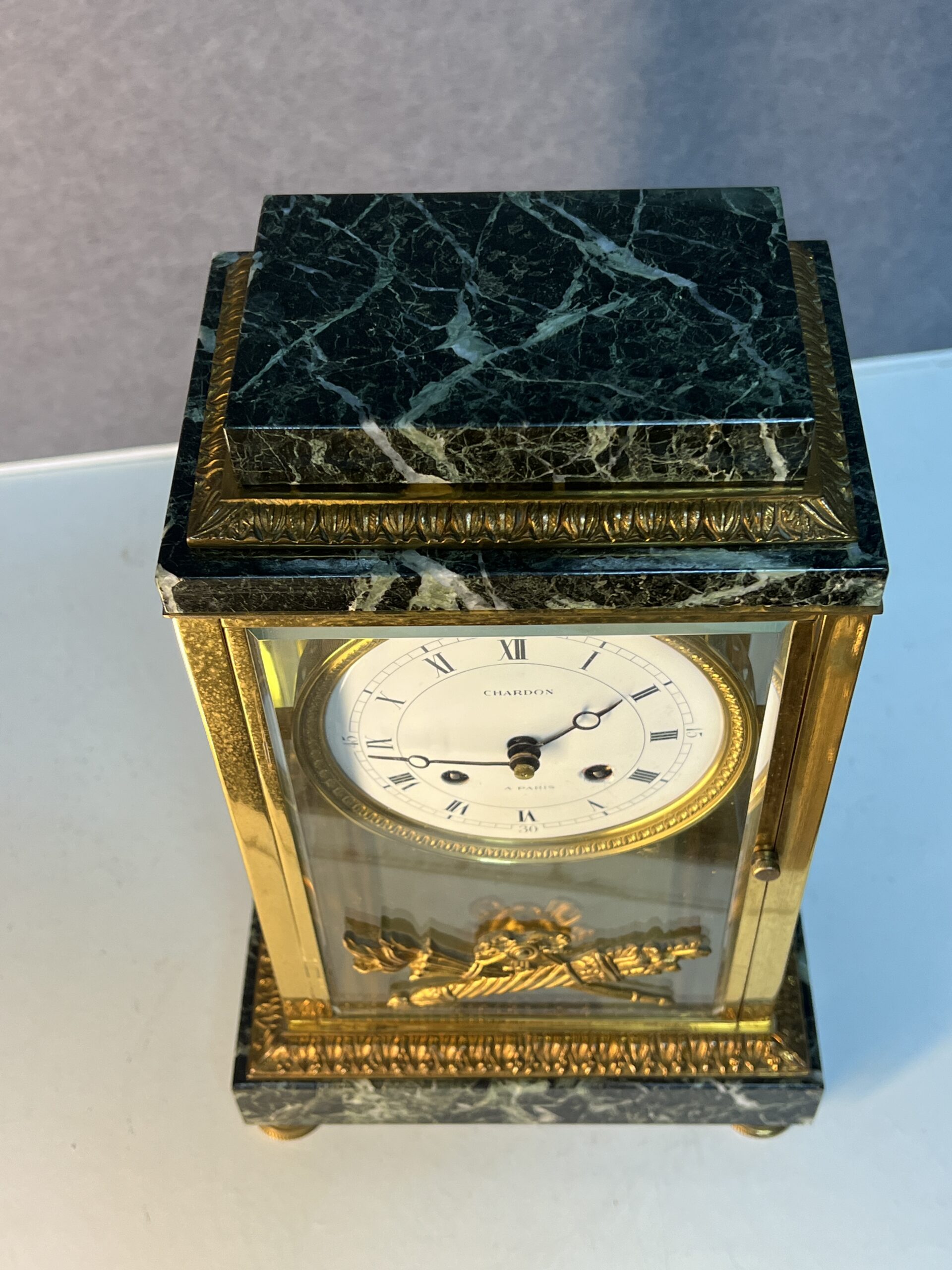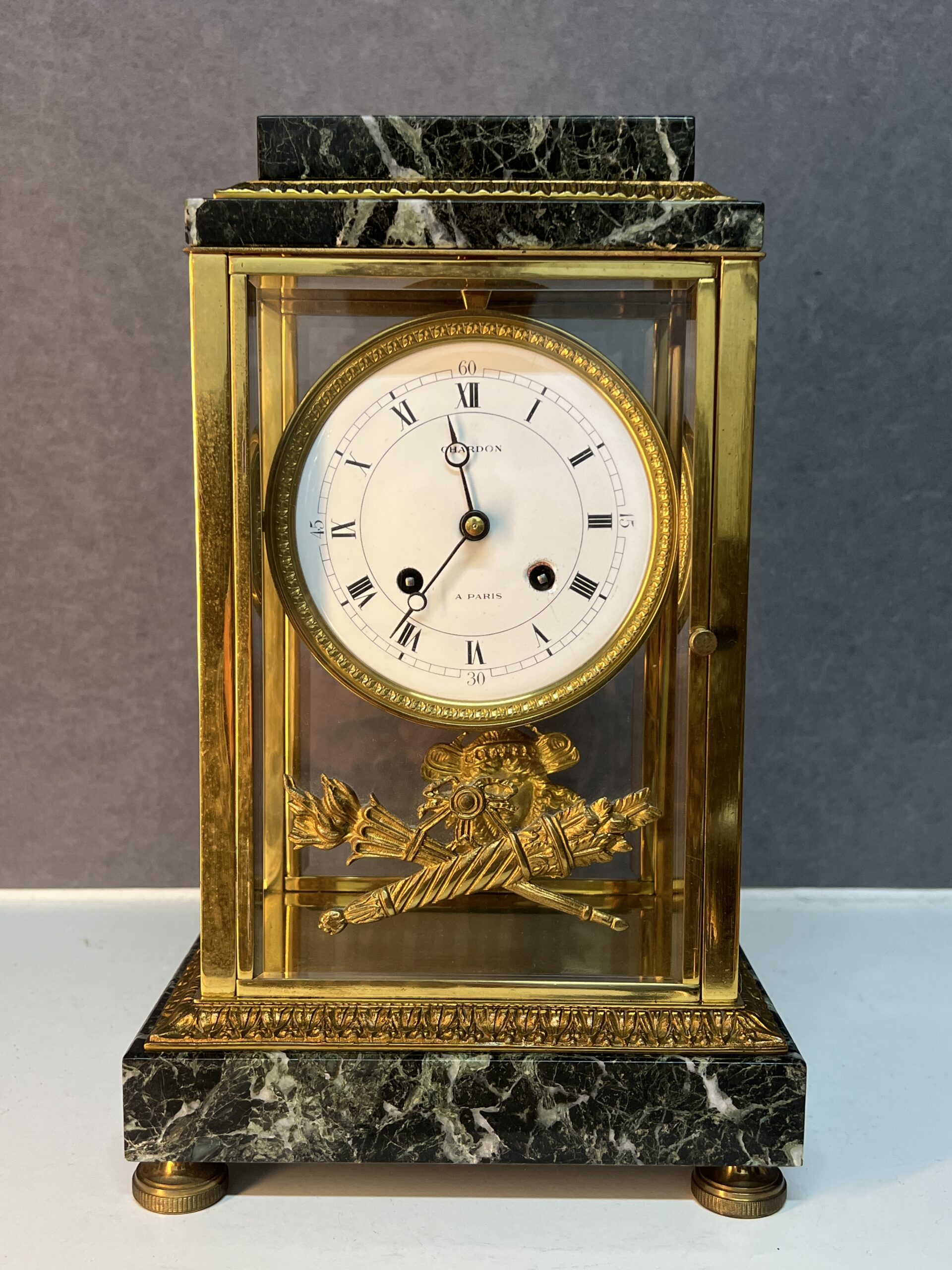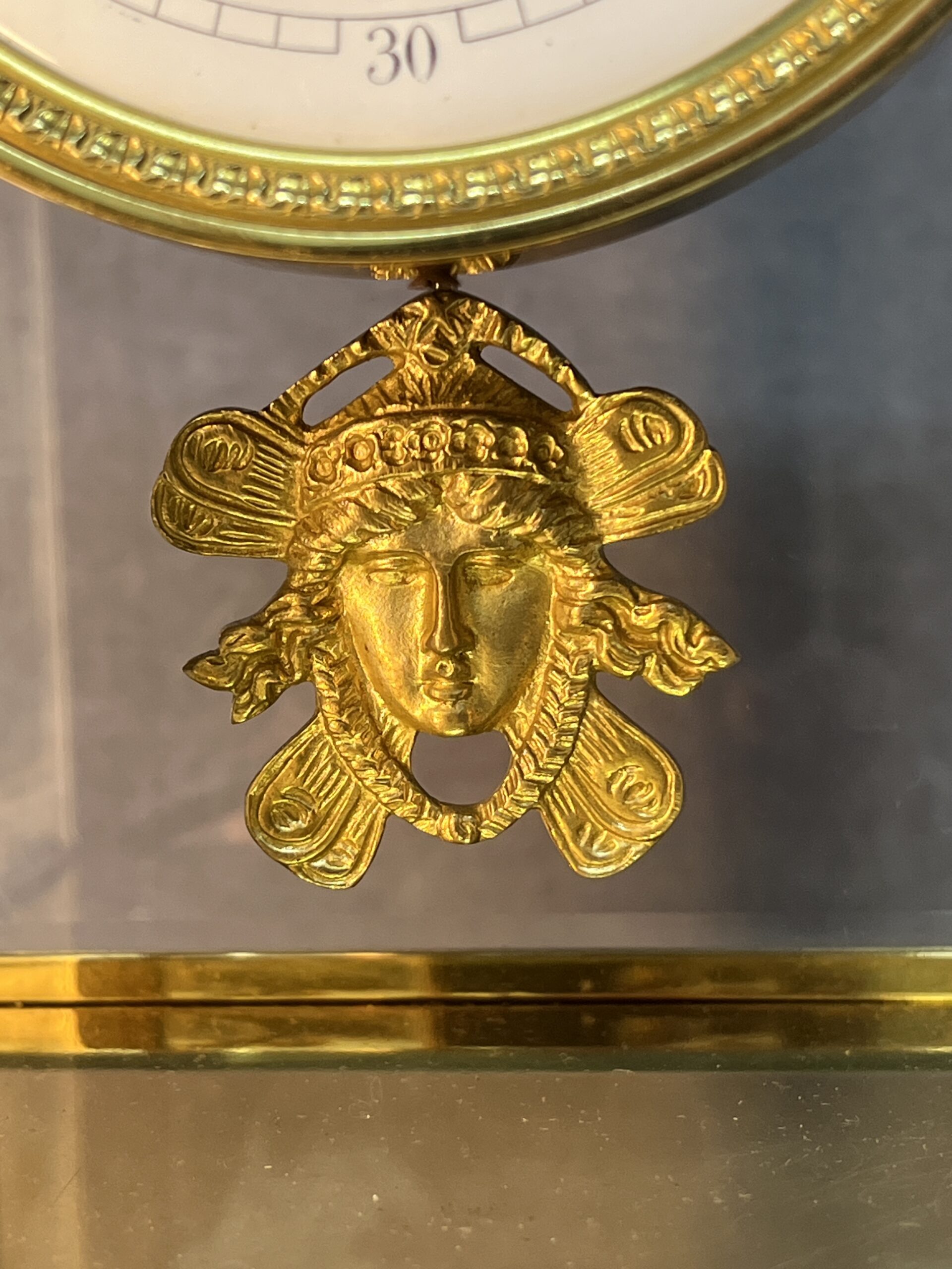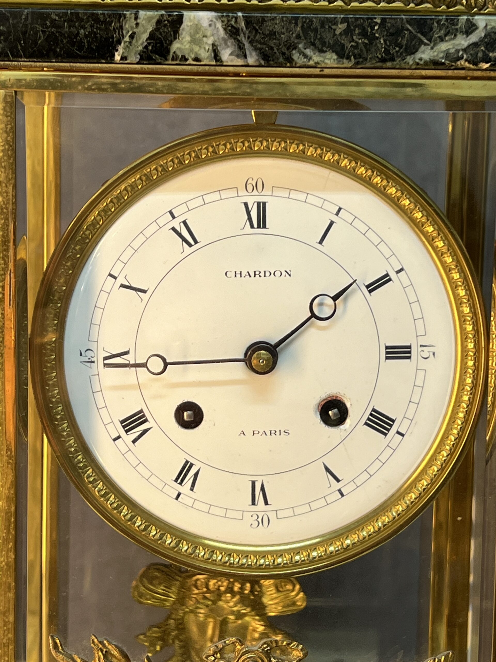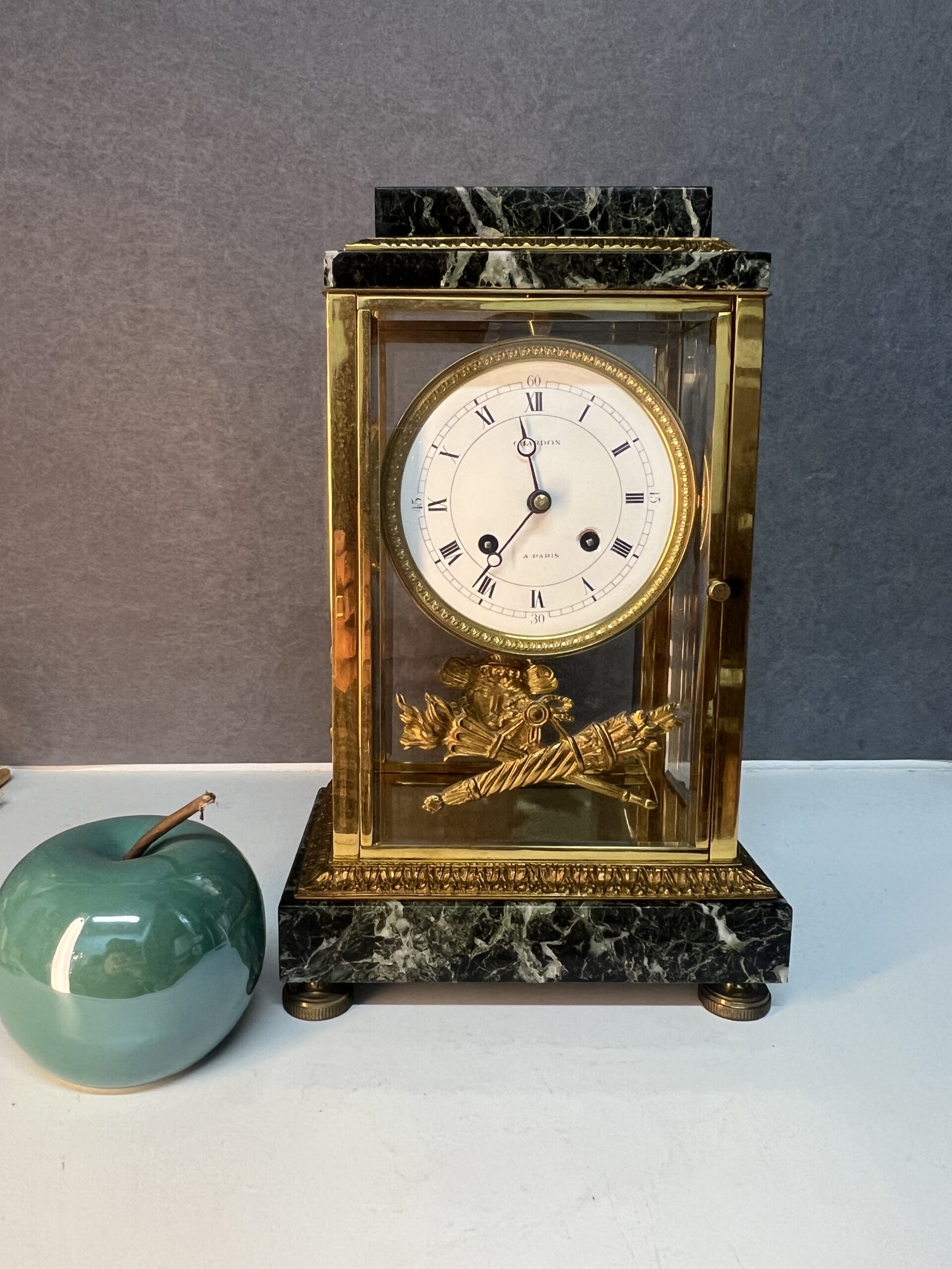 La base et la partie supérieure de la pendule sont en marbre vert de mer, un matériau prisé pour sa beauté et sa durabilité. Ce marbre est orné de frises finement ciselées, typiques du style Empire. Les motifs de palmettes, de flambeaux et de nœuds croisés ajoutent une touche de luxe et de grandeur, reflétant l’opulence et le goût raffiné de l’époque. Ces détails ornementaux témoignent d’un savoir-faire exceptionnel et d’une attention minutieuse aux finitions.