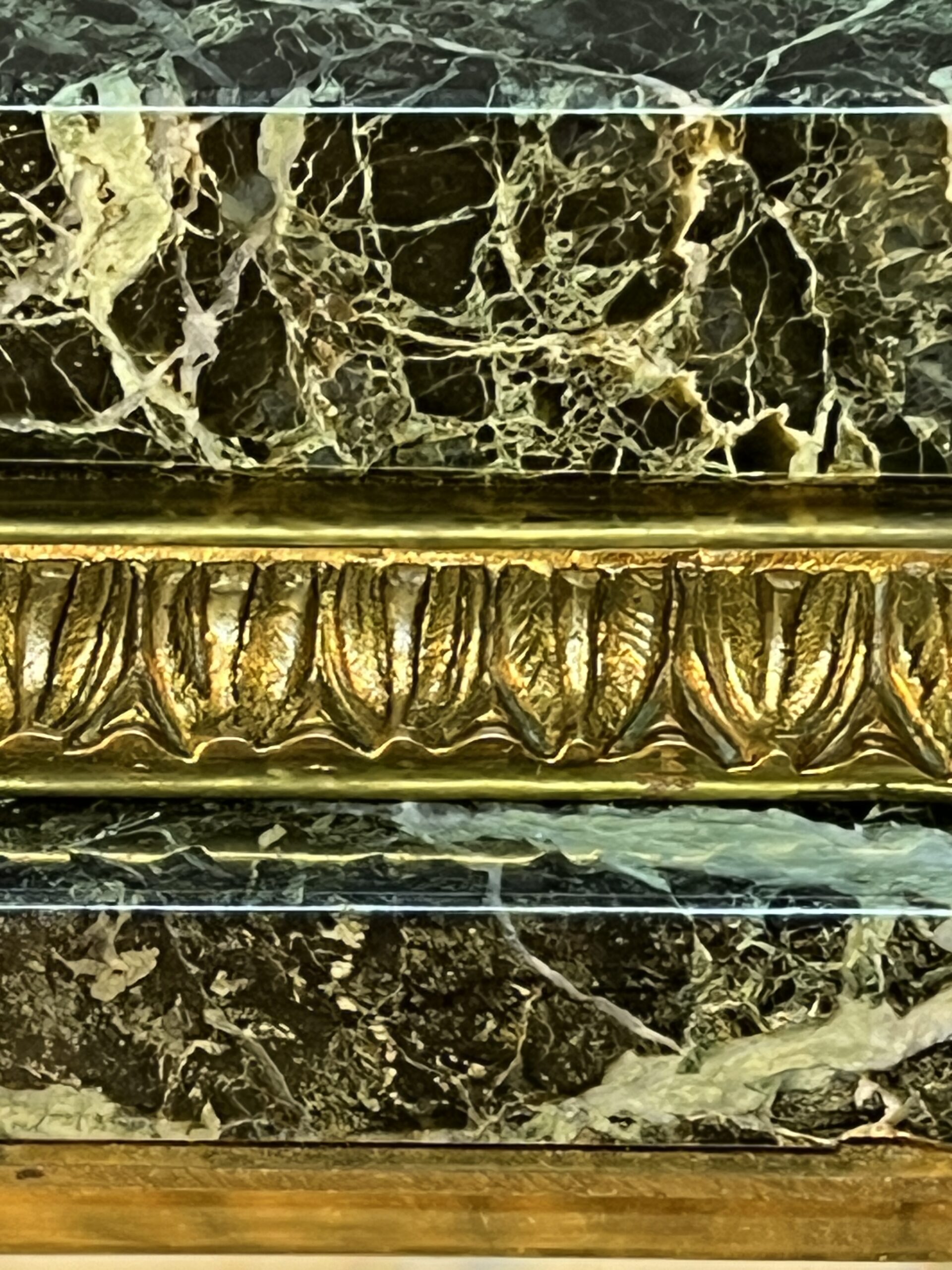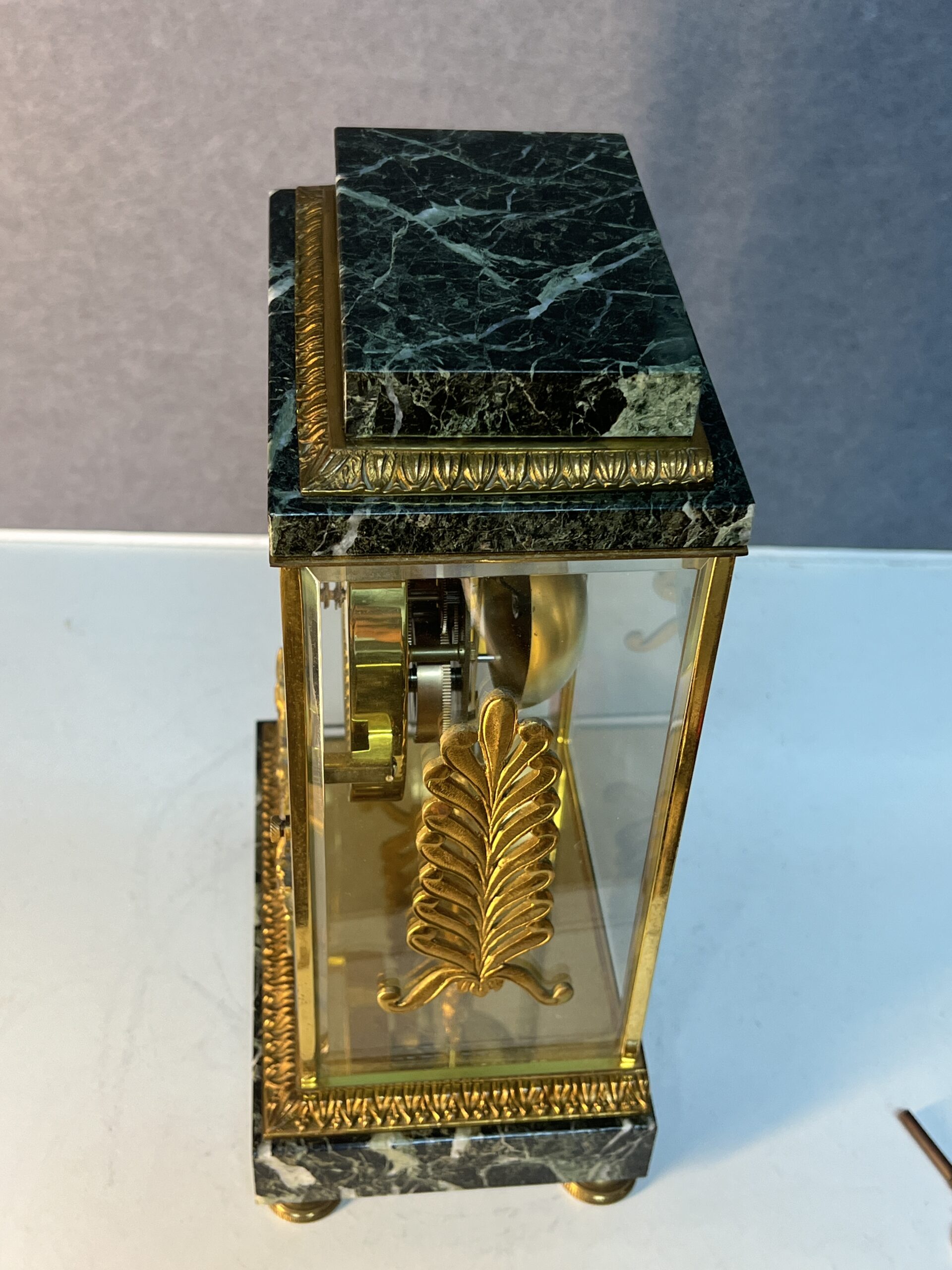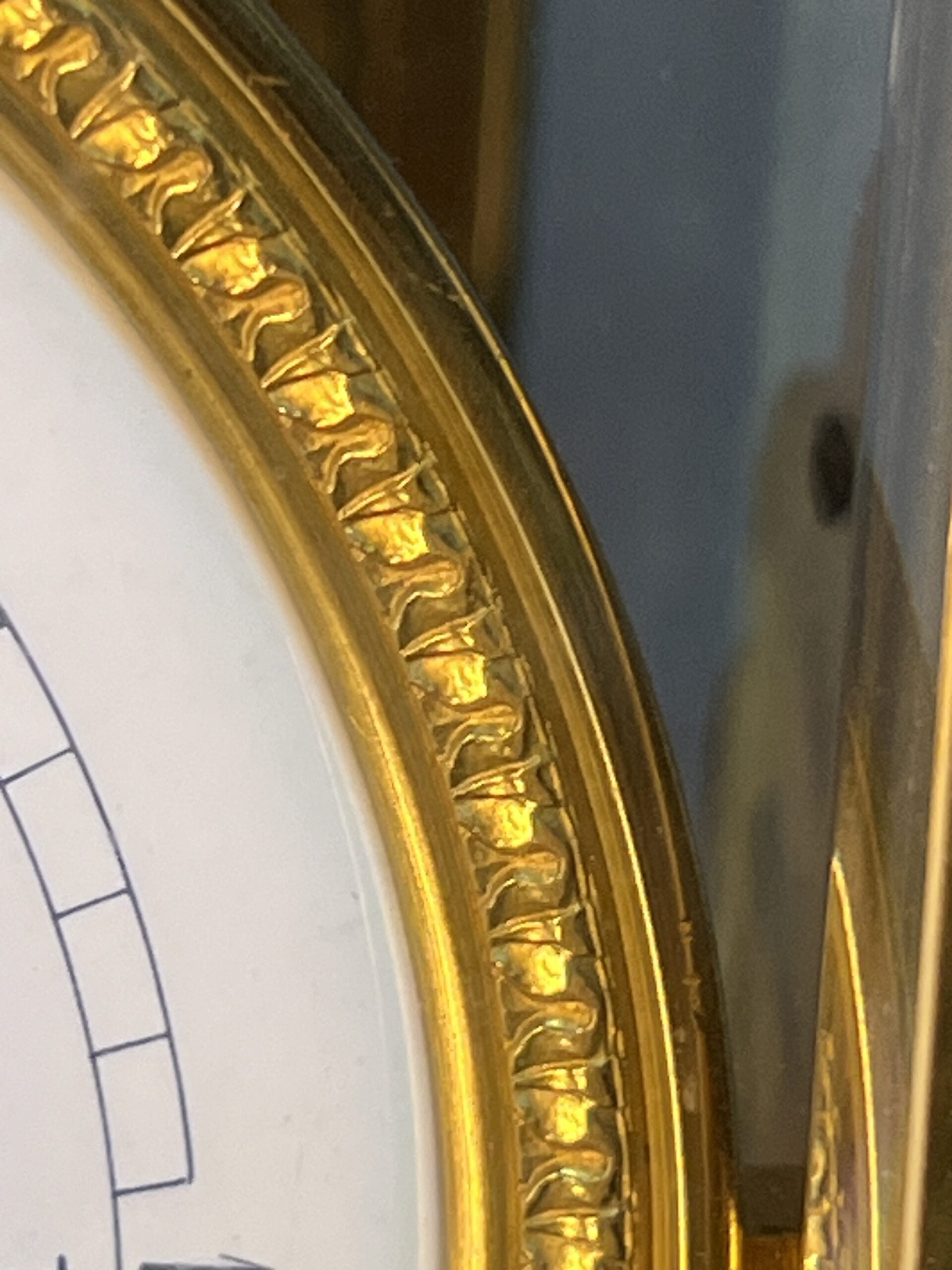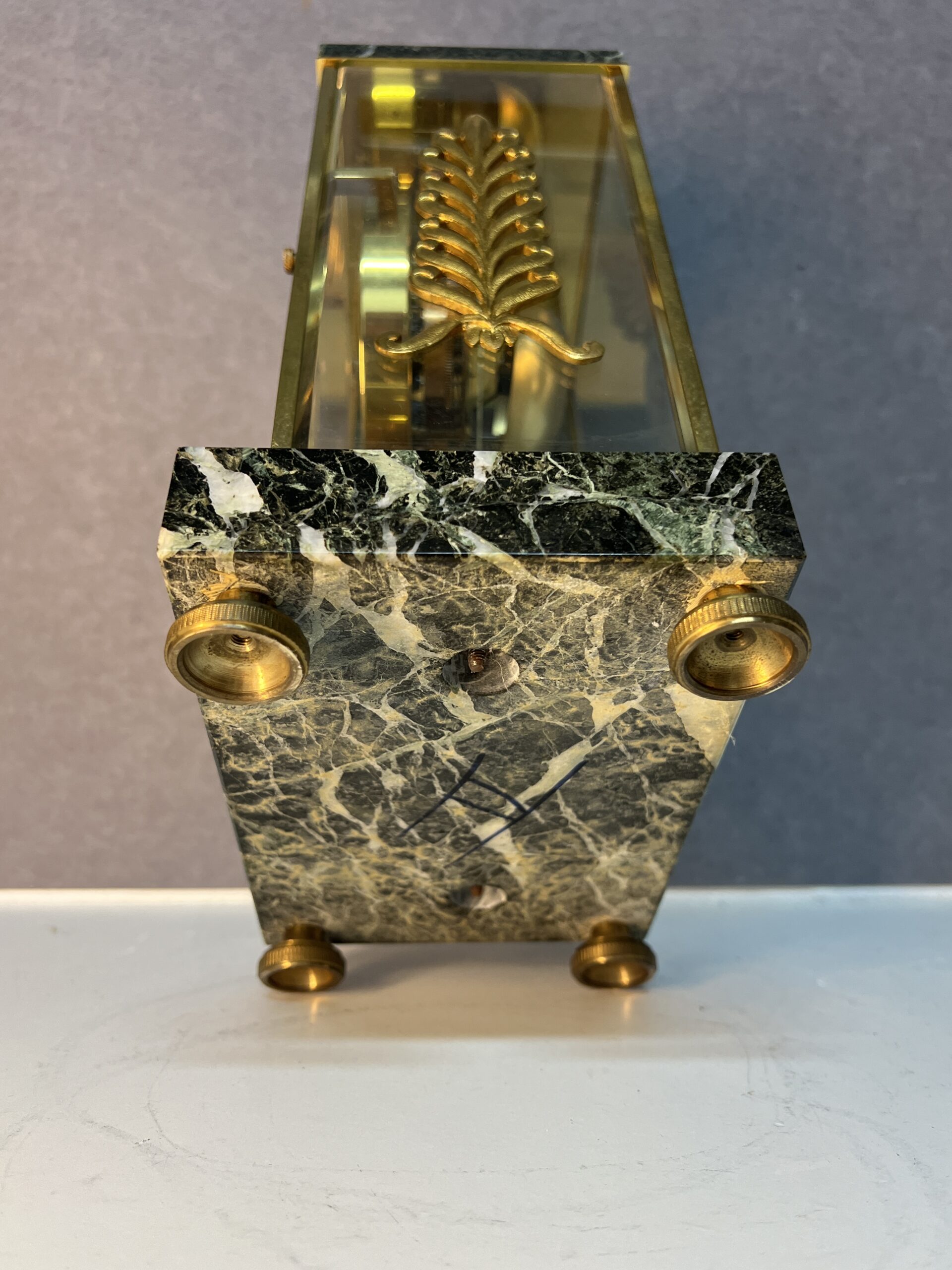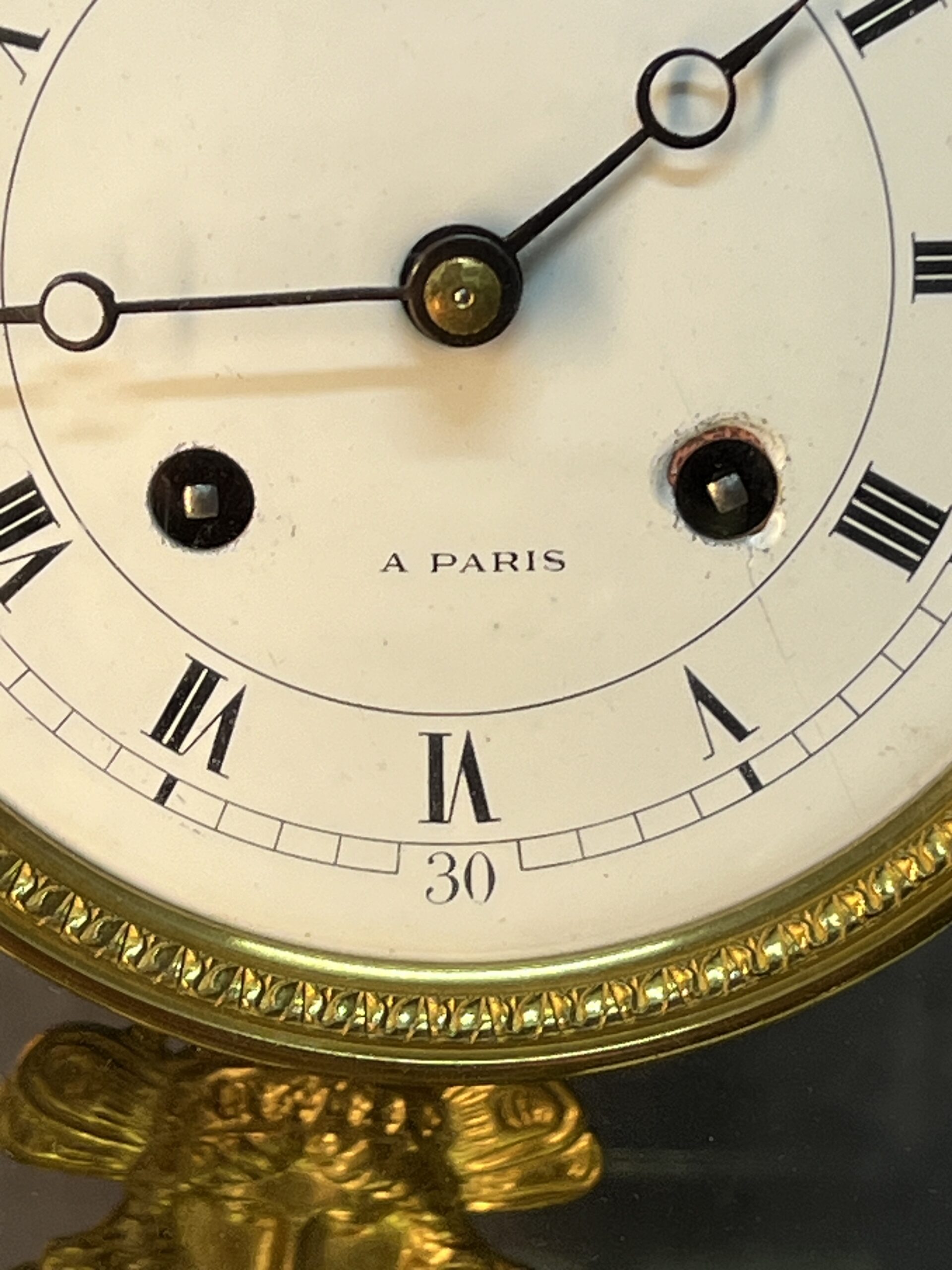 La base et la partie supérieure de la pendule sont en marbre vert de mer, un matériau prisé pour sa beauté et sa durabilité. Ce marbre est orné de frises finement ciselées, typiques du style Empire. Les motifs de palmettes, de flambeaux et de nœuds croisés ajoutent une touche de luxe et de grandeur, reflétant l’opulence et le goût raffiné de l’époque. Ces détails ornementaux témoignent d’un savoir-faire exceptionnel et d’une attention minutieuse aux finitions.