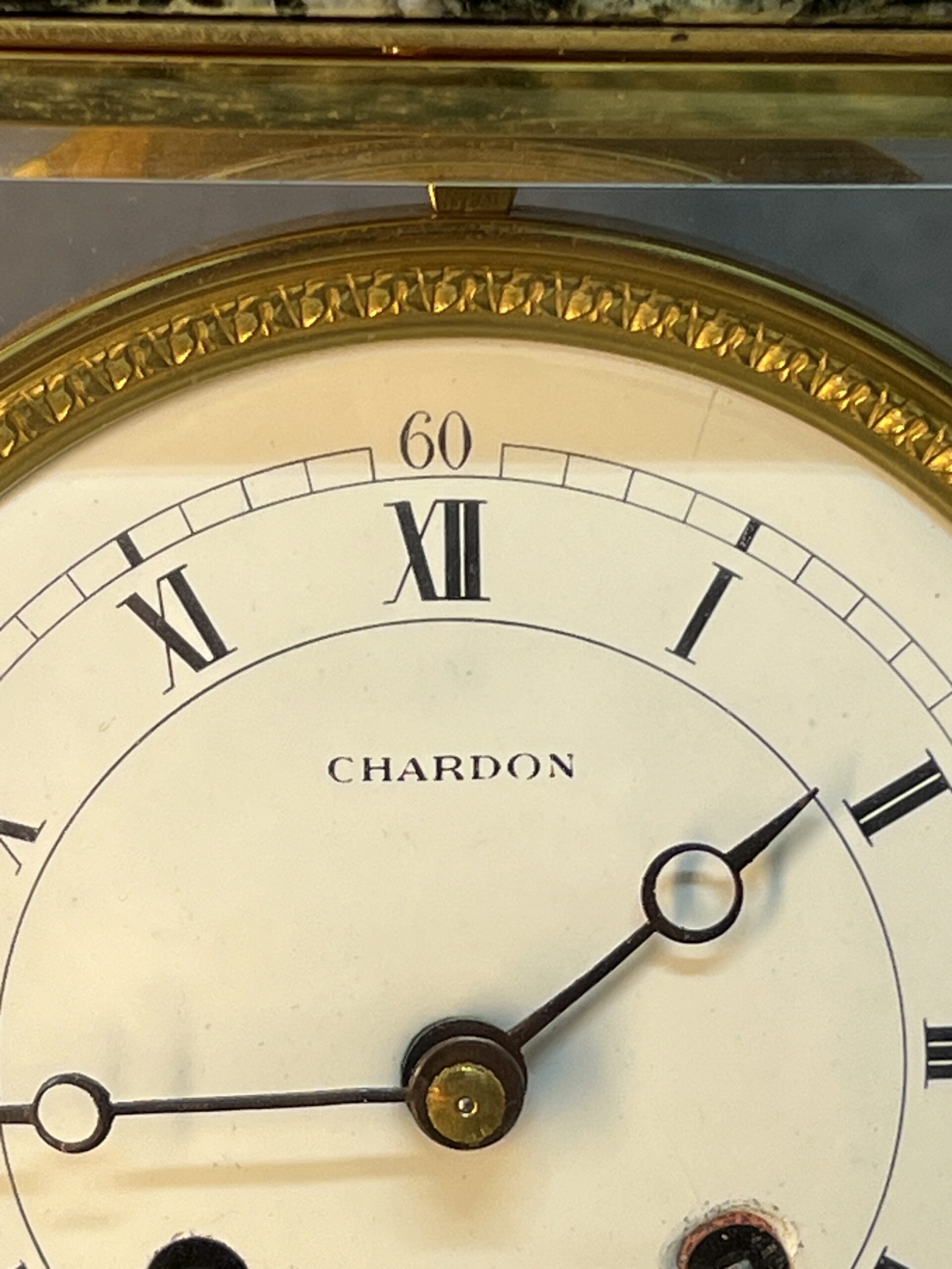 Le grand cadran est un chef-d’œuvre en soi. Fabriqué en émail blanc, il porte la signature prestigieuse de Chardon à Paris, une référence en matière d’horlogerie de luxe. Les chiffres arabes et romains se côtoient harmonieusement, facilitant la lecture de l’heure tout en ajoutant une dimension historique et artistique. Le balancier, décoré d’une tête égyptienne, évoque l’influence néoclassique du style Empire, rappelant les campagnes napoléoniennes en Égypte et l’engouement pour l’art et l’architecture de l’Antiquité.