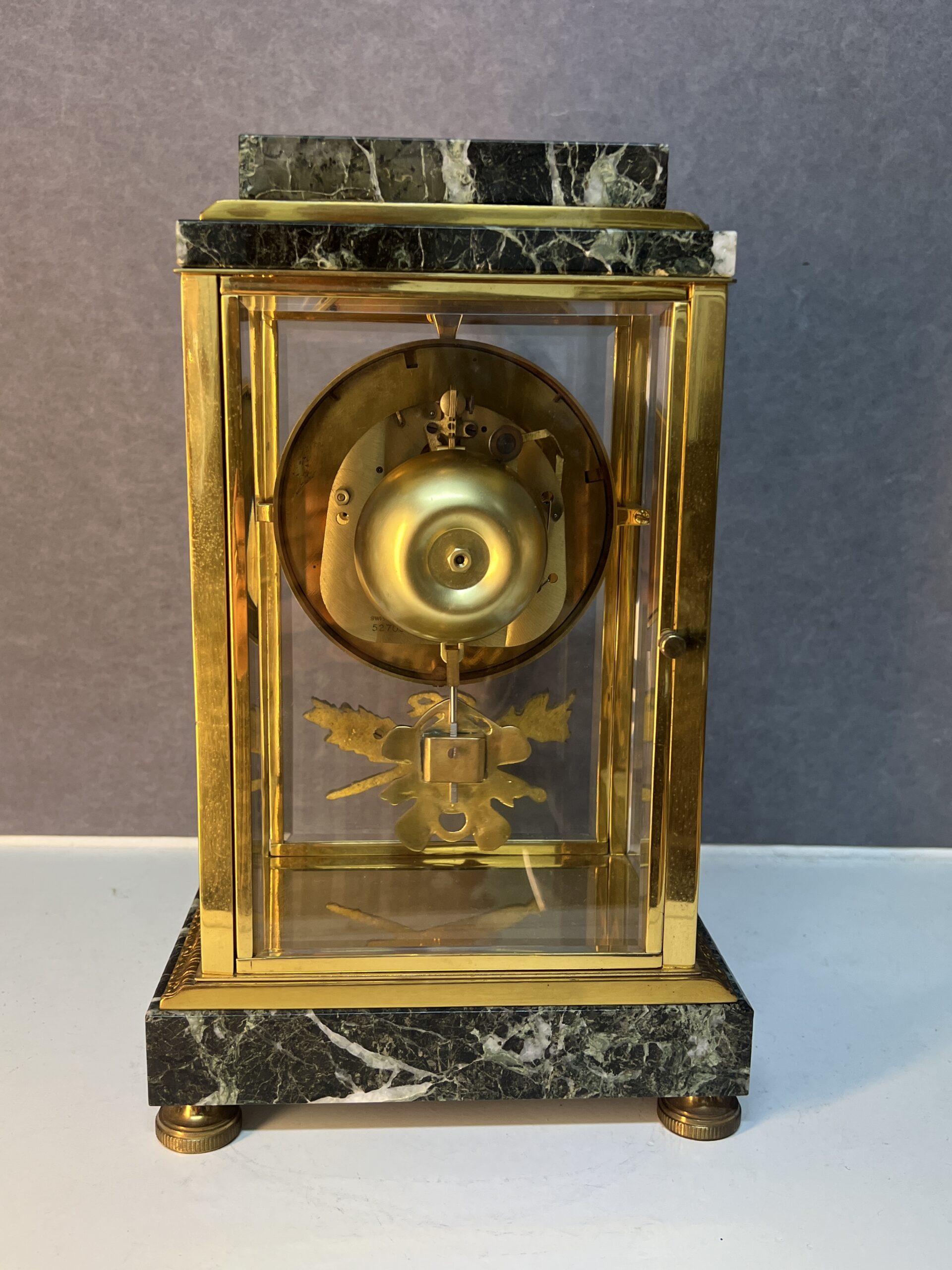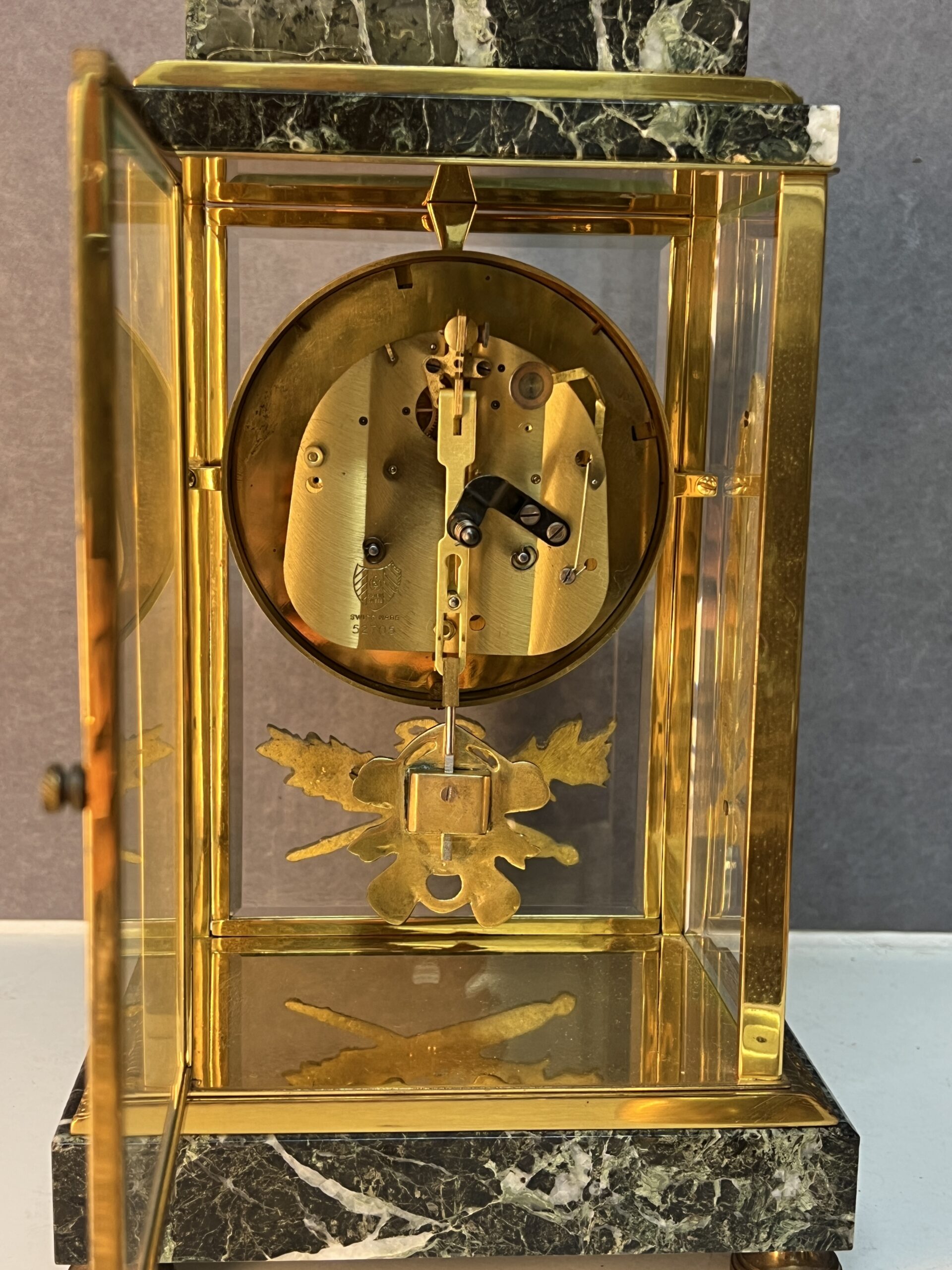 Le cœur de cette pendule est un mécanisme suisse de fabrication artisanale, réputé pour sa précision et sa fiabilité. D’origine et sans modification, il garantit une performance optimale et une longue durée de vie. La pendule est dotée d’une sonnerie qui marque les heures et les demi-heures, résonnant sur un gong avec une sonorité douce et agréable. Cette mélodie discrète et harmonieuse ajoute une dimension auditive à la beauté visuelle de l’horloge, créant une ambiance sereine et élégante dans n’importe quel intérieur.