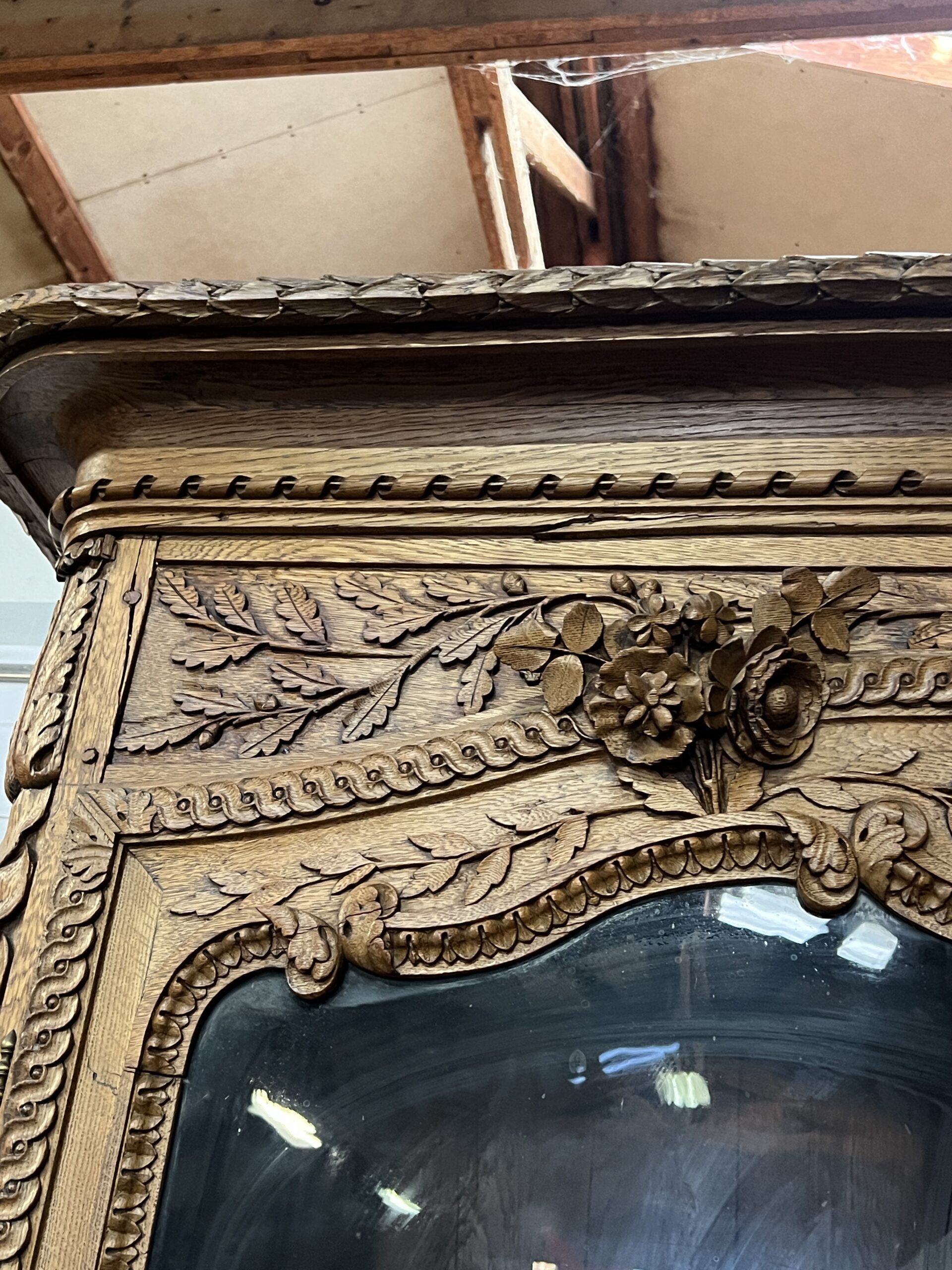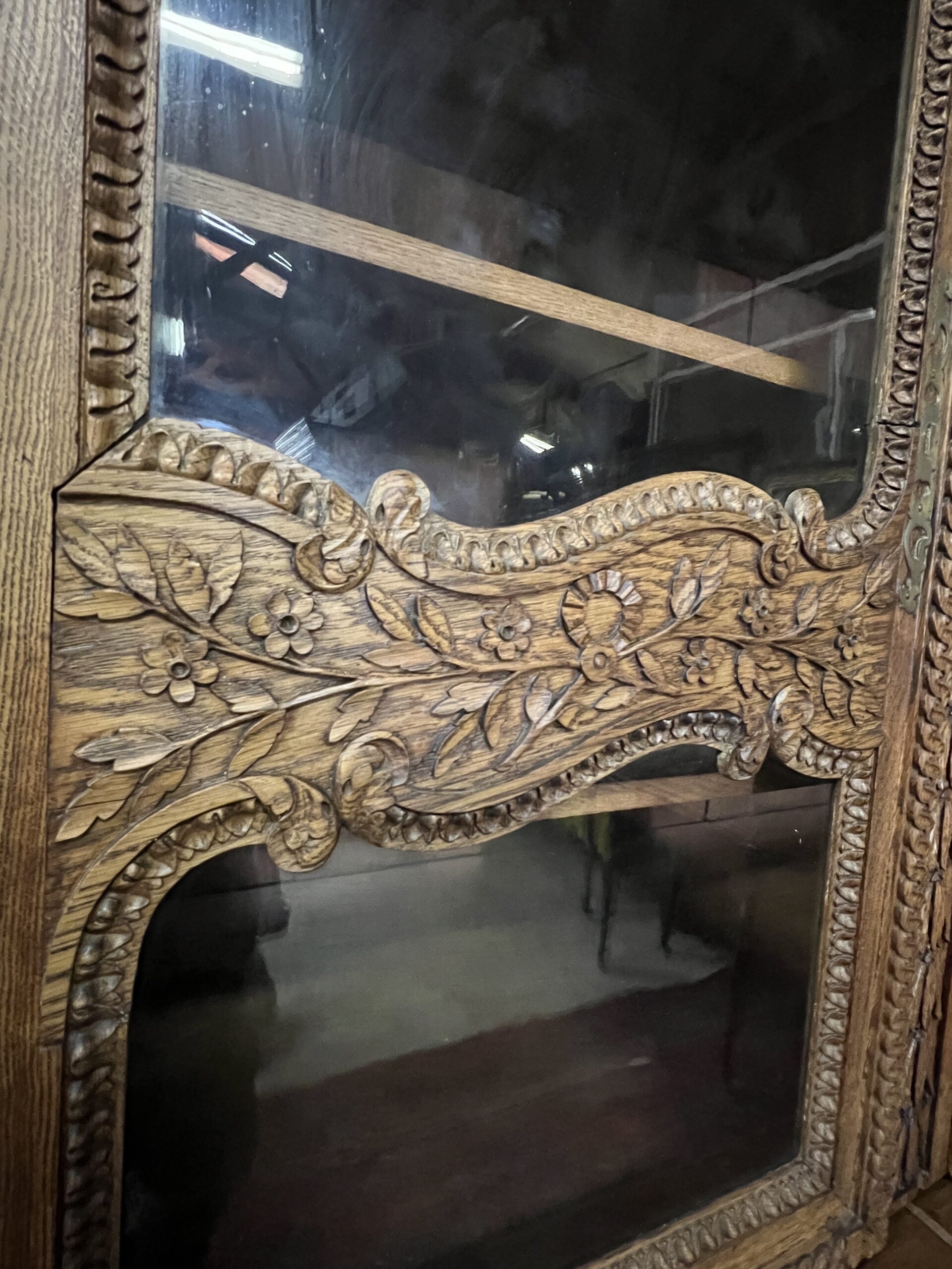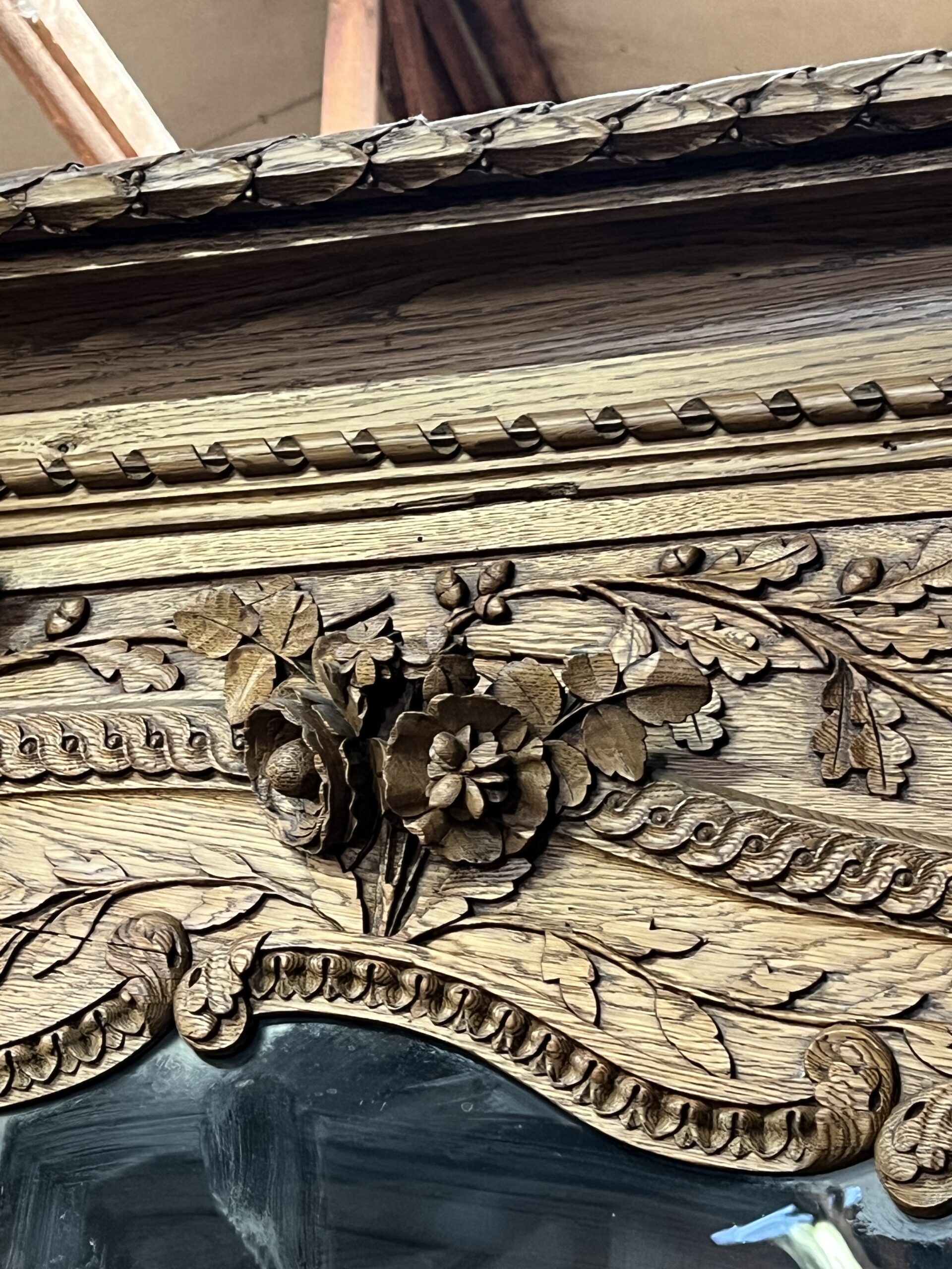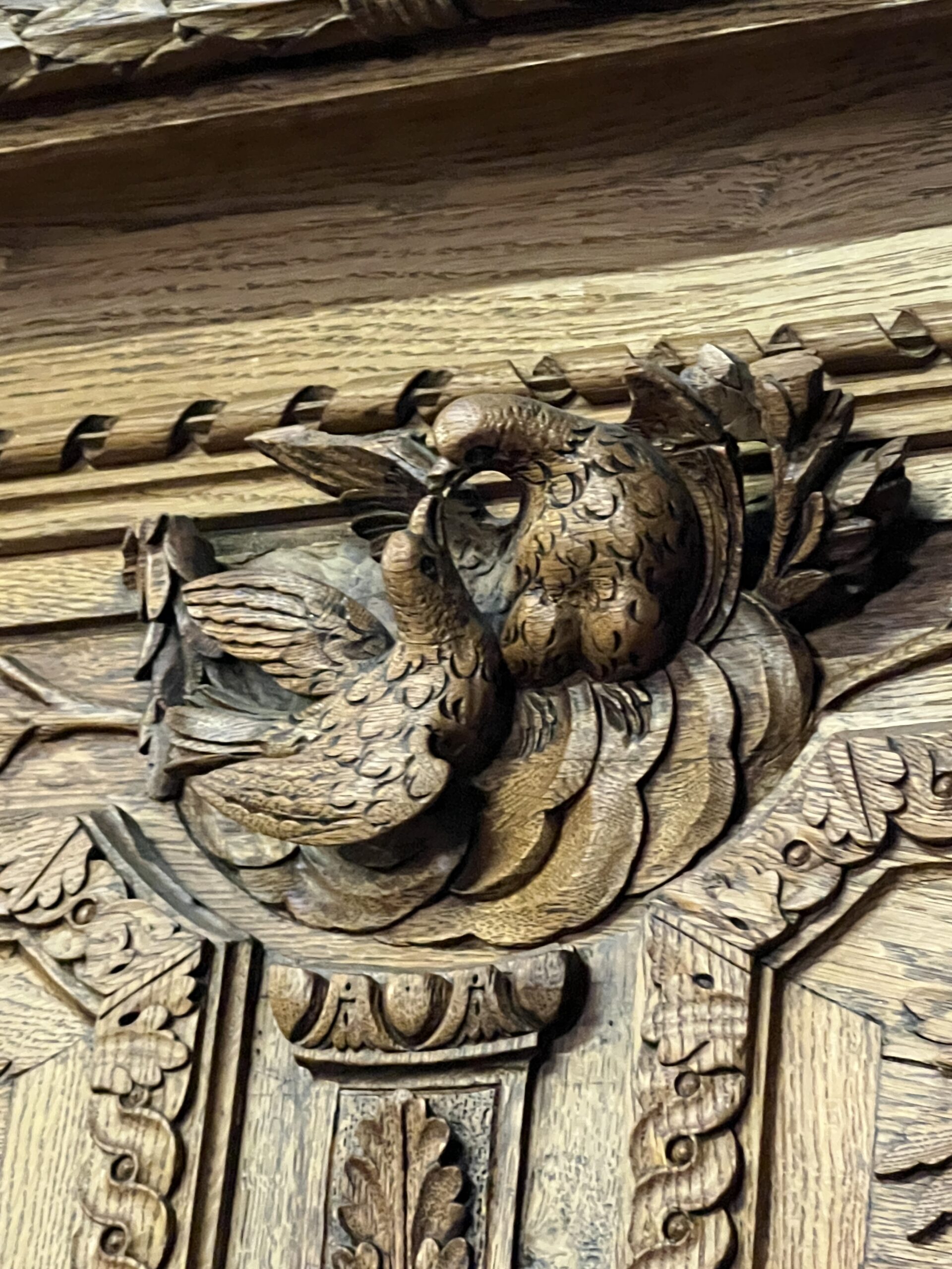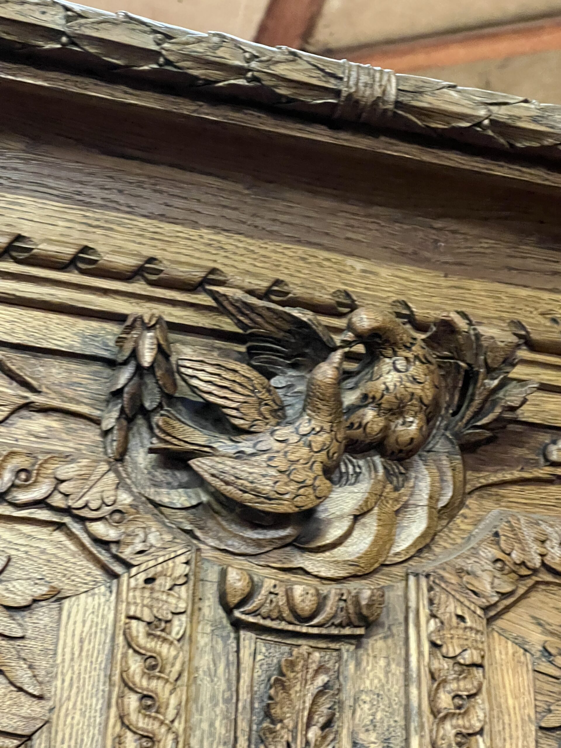 La première chose qui frappe en regardant ce buffet, c’est sa remarquable sculpture. Chaque détail est méticuleusement travaillé, témoignant du savoir-faire exceptionnel des artisans qui l’ont créé. Les colombes ornant la corniche sont particulièrement remarquables, symbolisant la paix, l’amour et l’harmonie, des thèmes parfaitement appropriés pour un meuble de mariage. Leur présence délicate ajoute une touche de grâce et de poésie à l’ensemble, renforçant l’aspect romantique et intemporel du buffet.