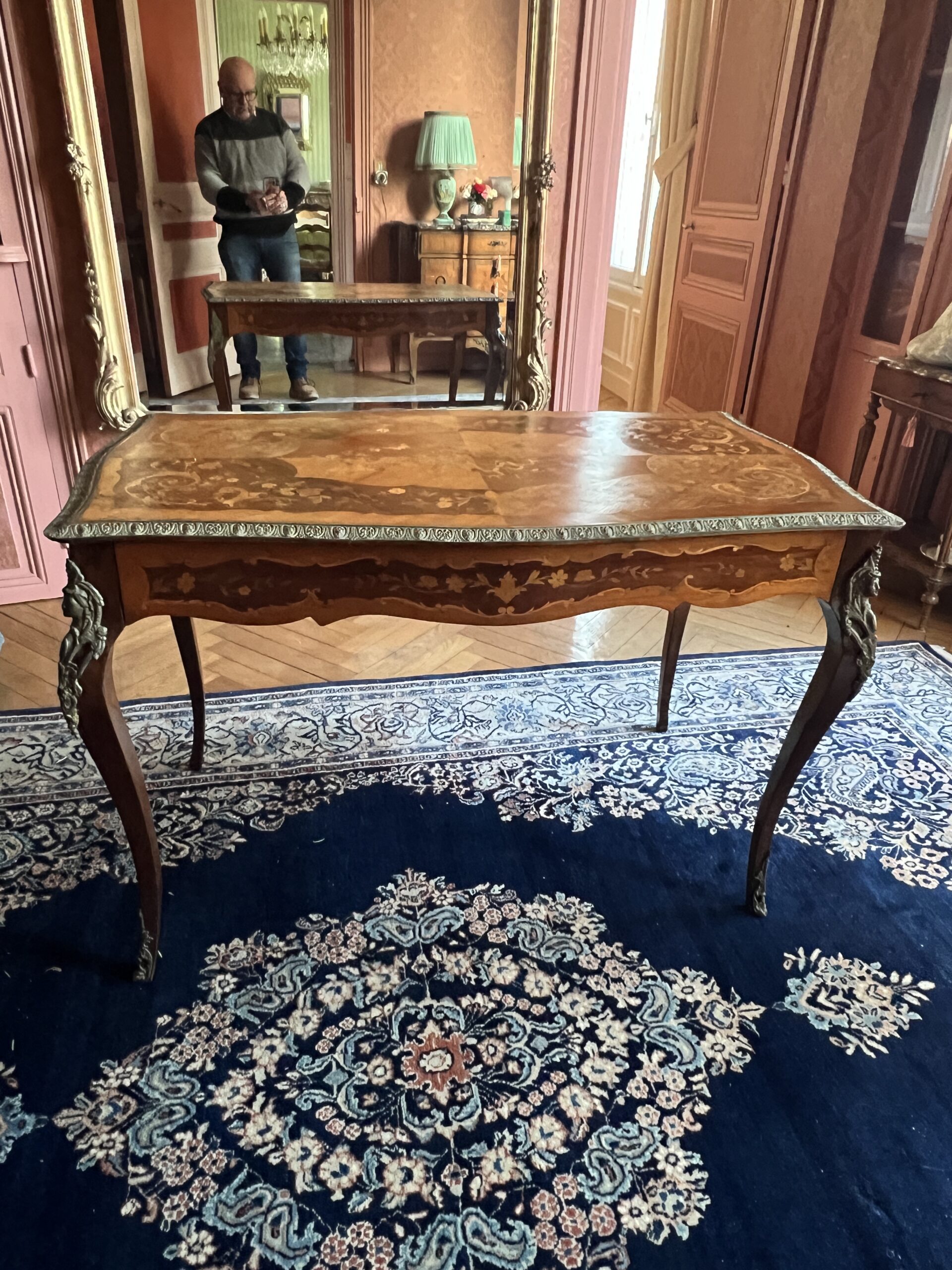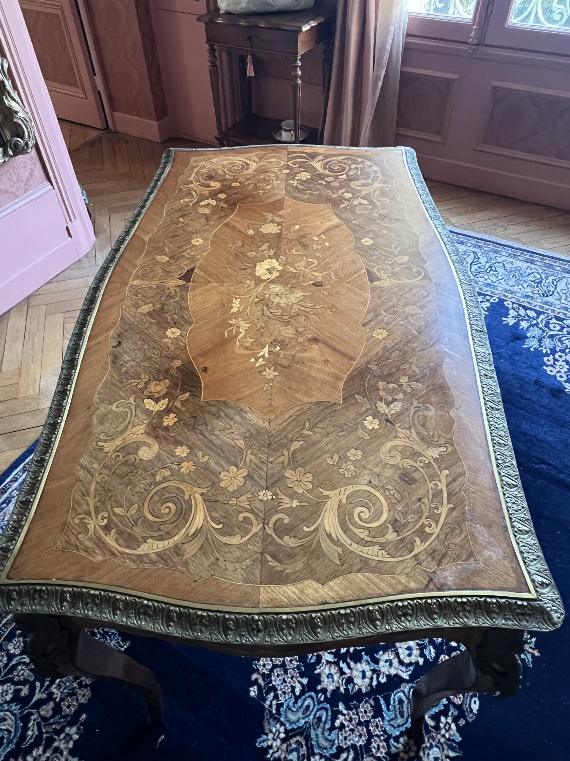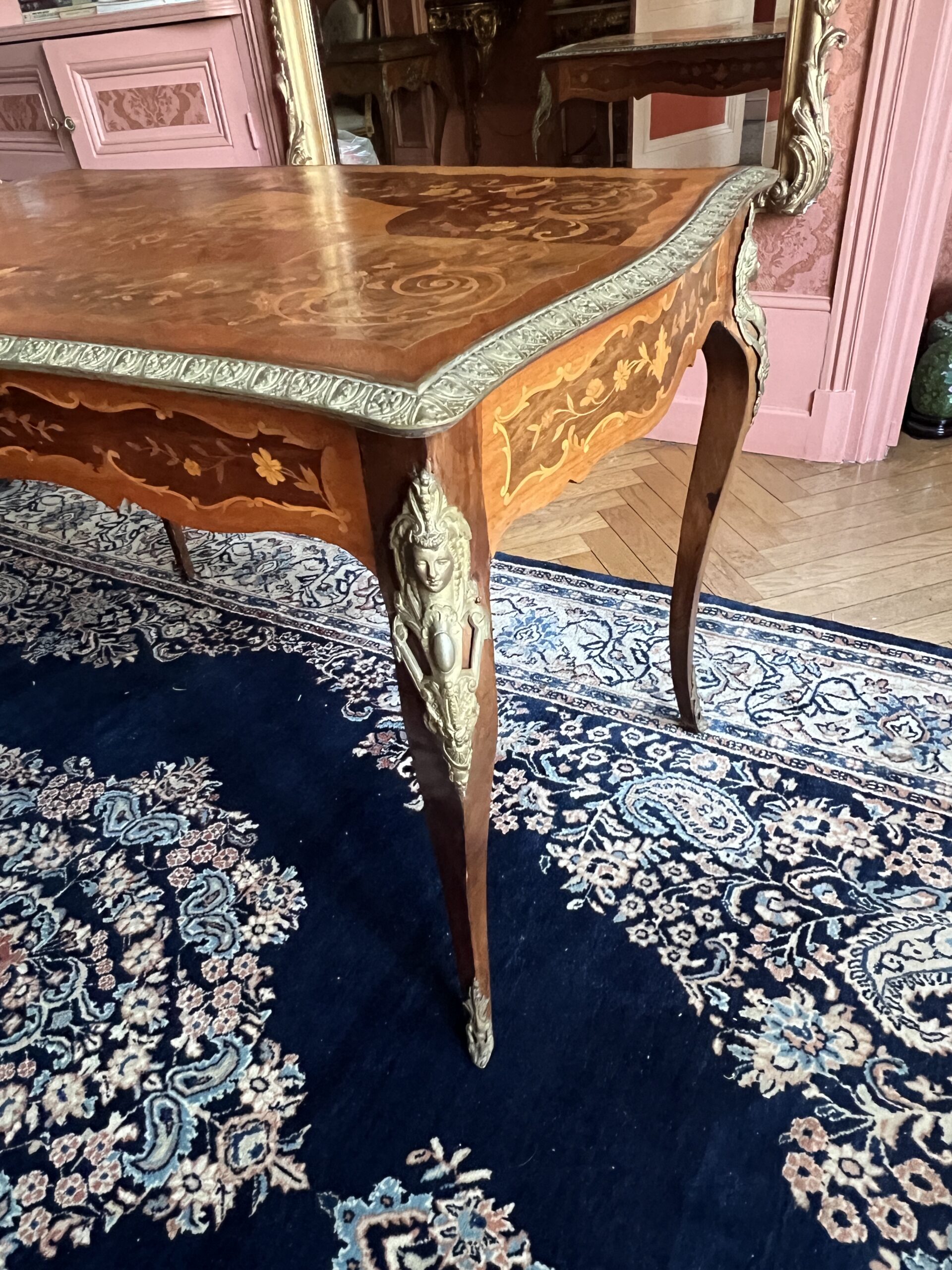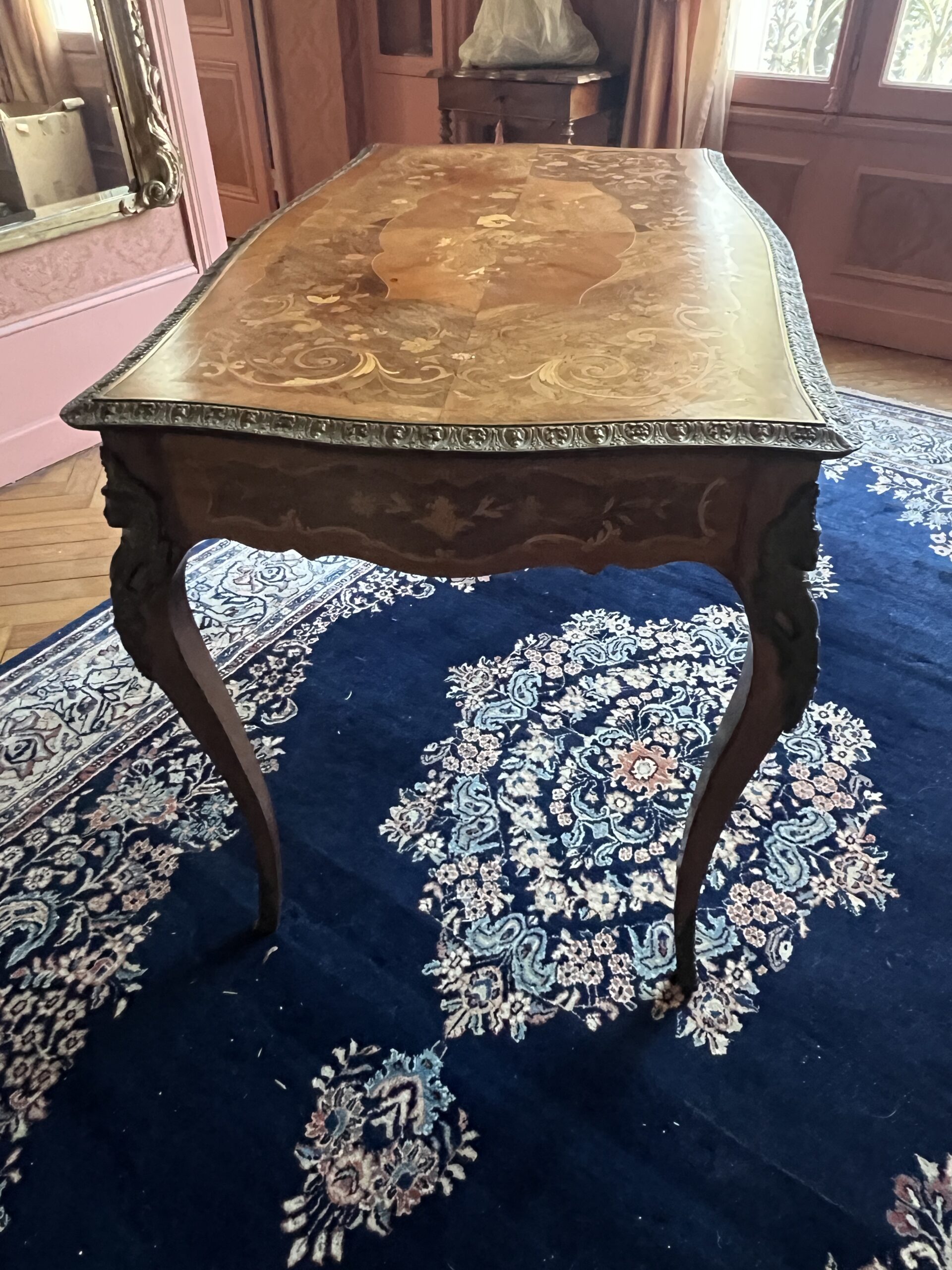 Bureau, table en bois de rose marqueté, ornements en bronze datant de la fin du XIXᵉ siècle.Bureau, table en bois de rose marqueté, ornements en bronze datant de la fin du XIXᵉ siècle.