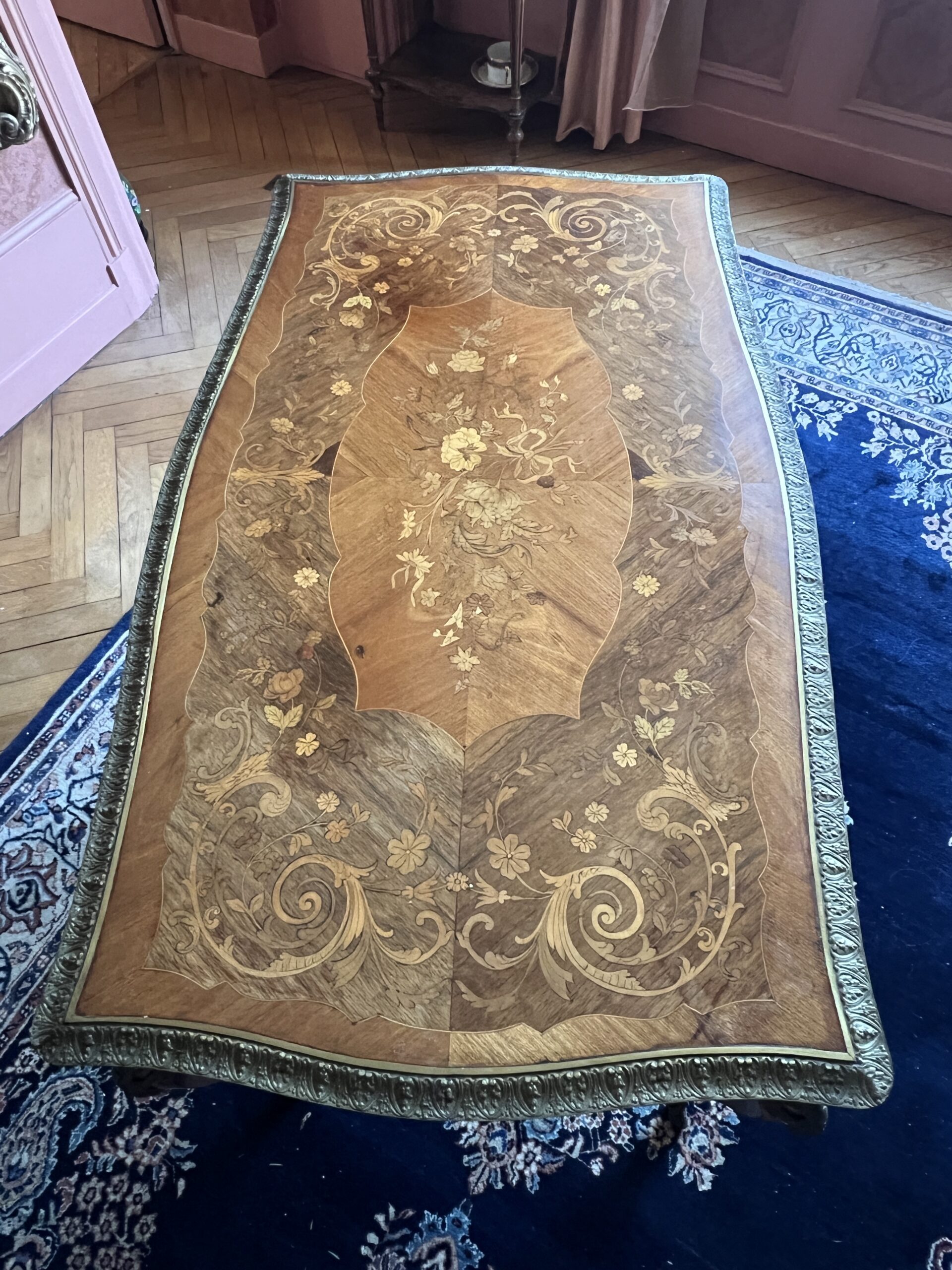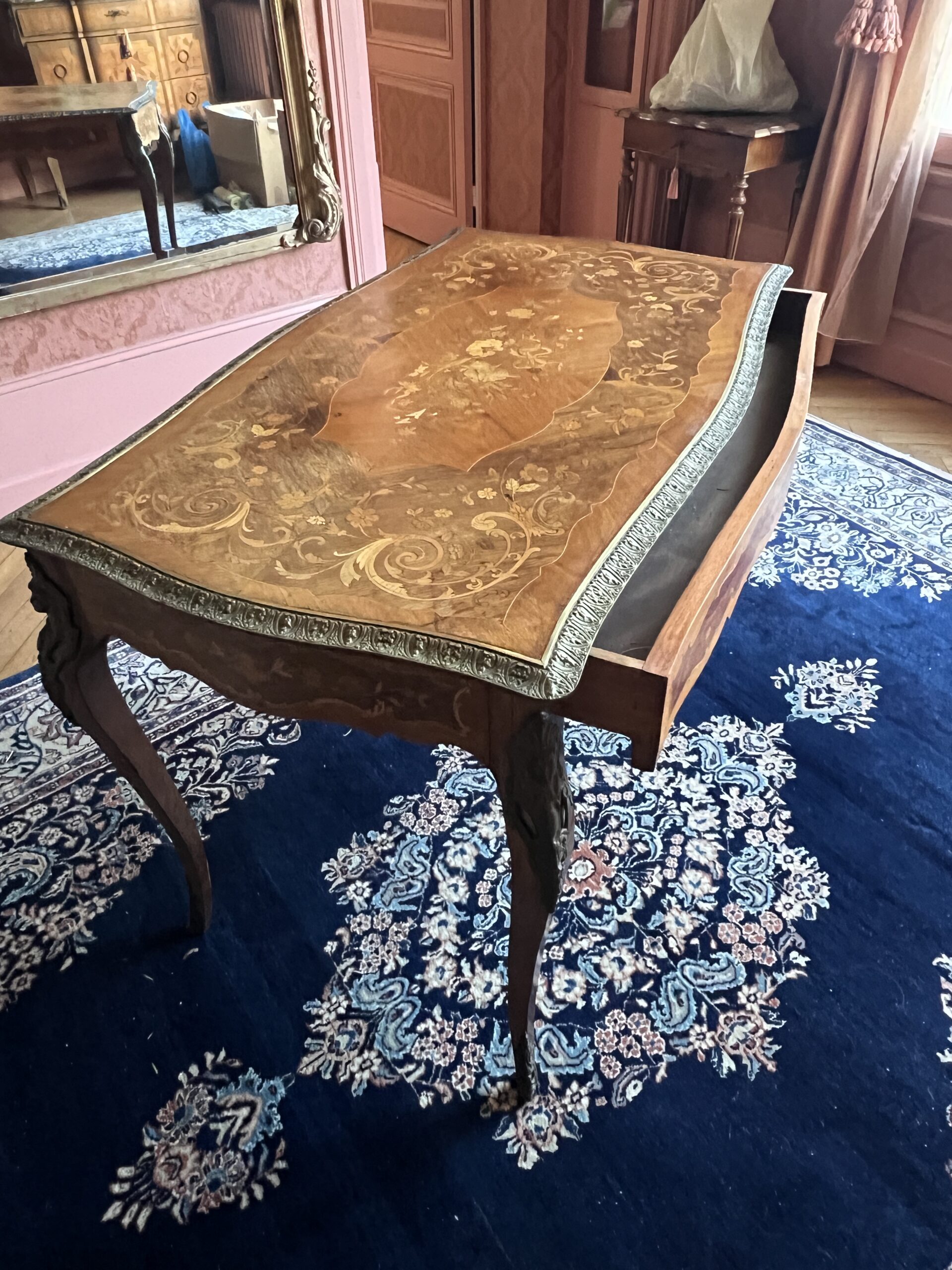 Bureau table en bois de rose marqueté avec ornements en bronze, datant de la fin du XIXᵉ siècle. Un meuble ancien élégant au charme authentique et raffiné