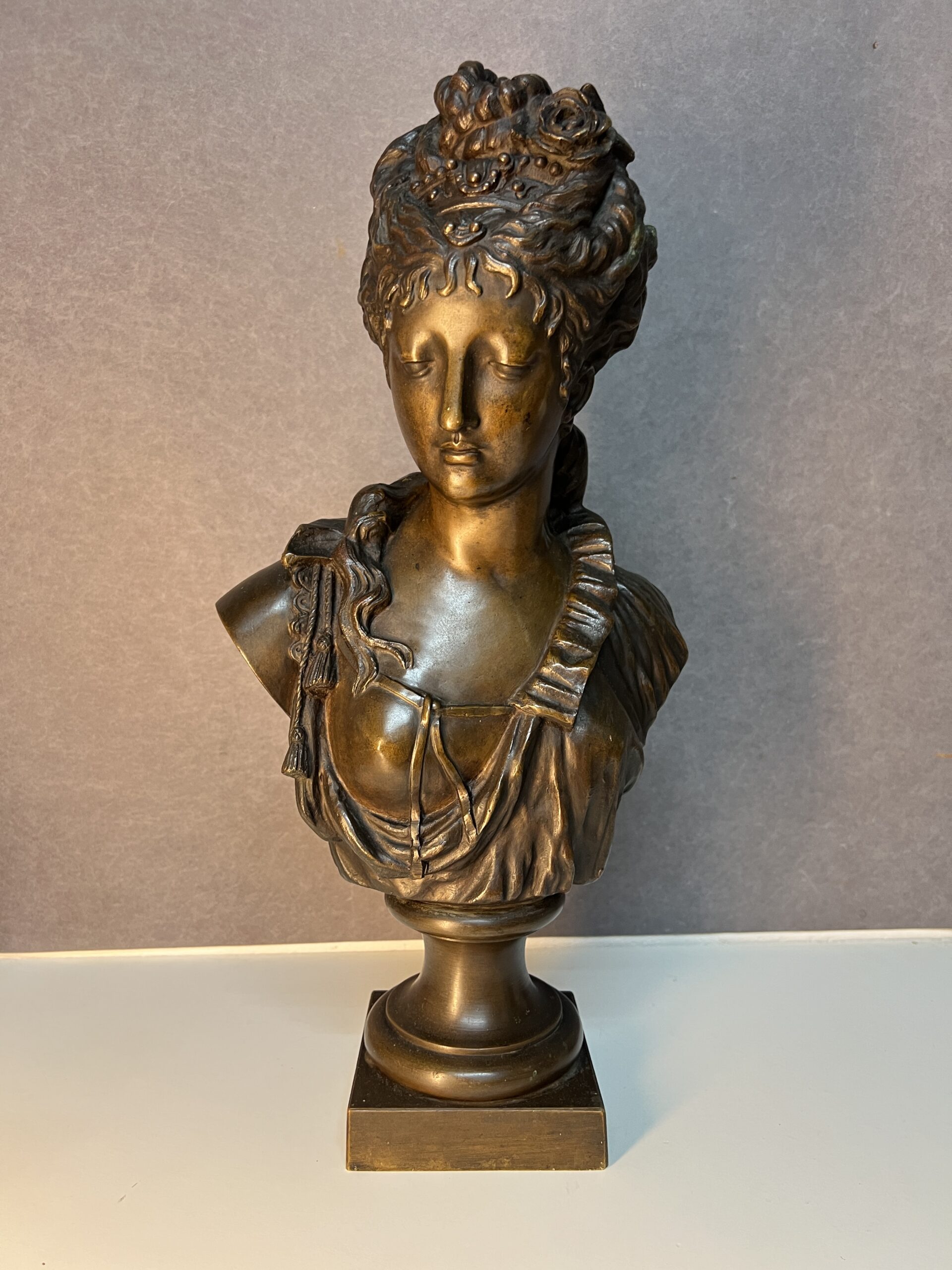 Le buste montre une femme gracieuse et raffinée, caractéristique de l’époque romantique. Les détails minutieux de la coiffure et des vêtements révèlent une grande maîtrise technique. Les cheveux de la femme sont coiffés de manière complexe, avec des mèches élaborées qui encadrent son visage. Son expression sereine et ses yeux fermés ajoutent une sensation de calme et de contemplation à l’œuvre.