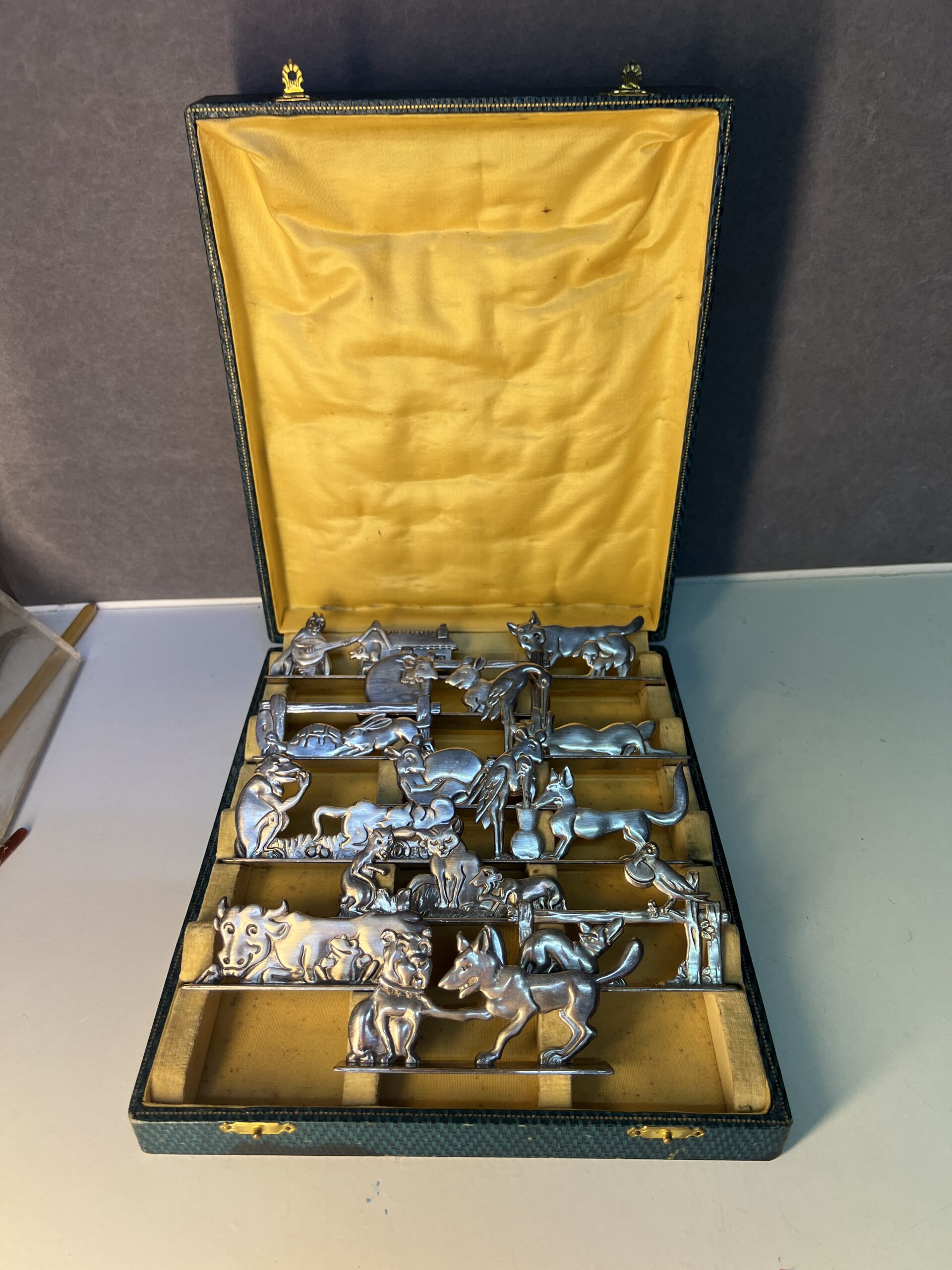 Cet ensemble de douze porte-couteaux en métal argenté, inspiré par les célèbres Fables de La Fontaine, constitue une œuvre remarquable de l’époque Art déco. Créés par Benjamin Rabier (1869-1939), un artiste français de renom, ces porte-couteaux sont non seulement des objets d’art, mais aussi des témoignages d’une époque où l’élégance et le raffinement se reflétaient jusque dans les moindres détails du quotidien.