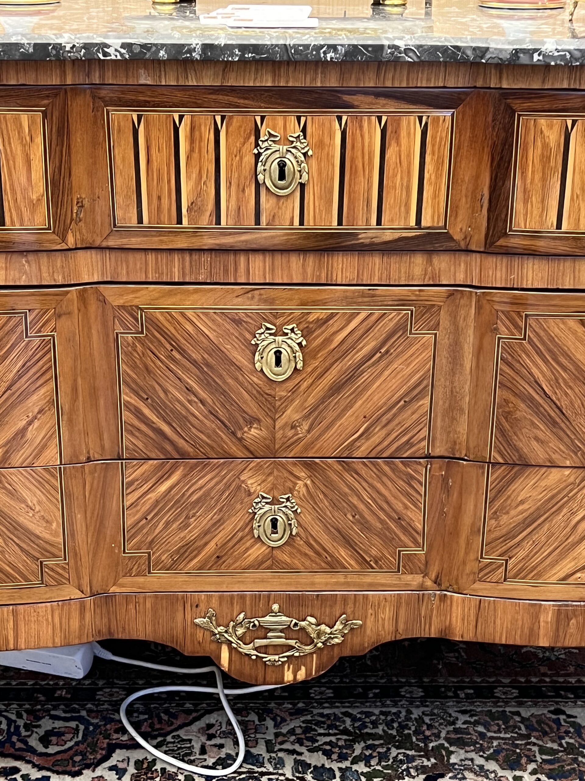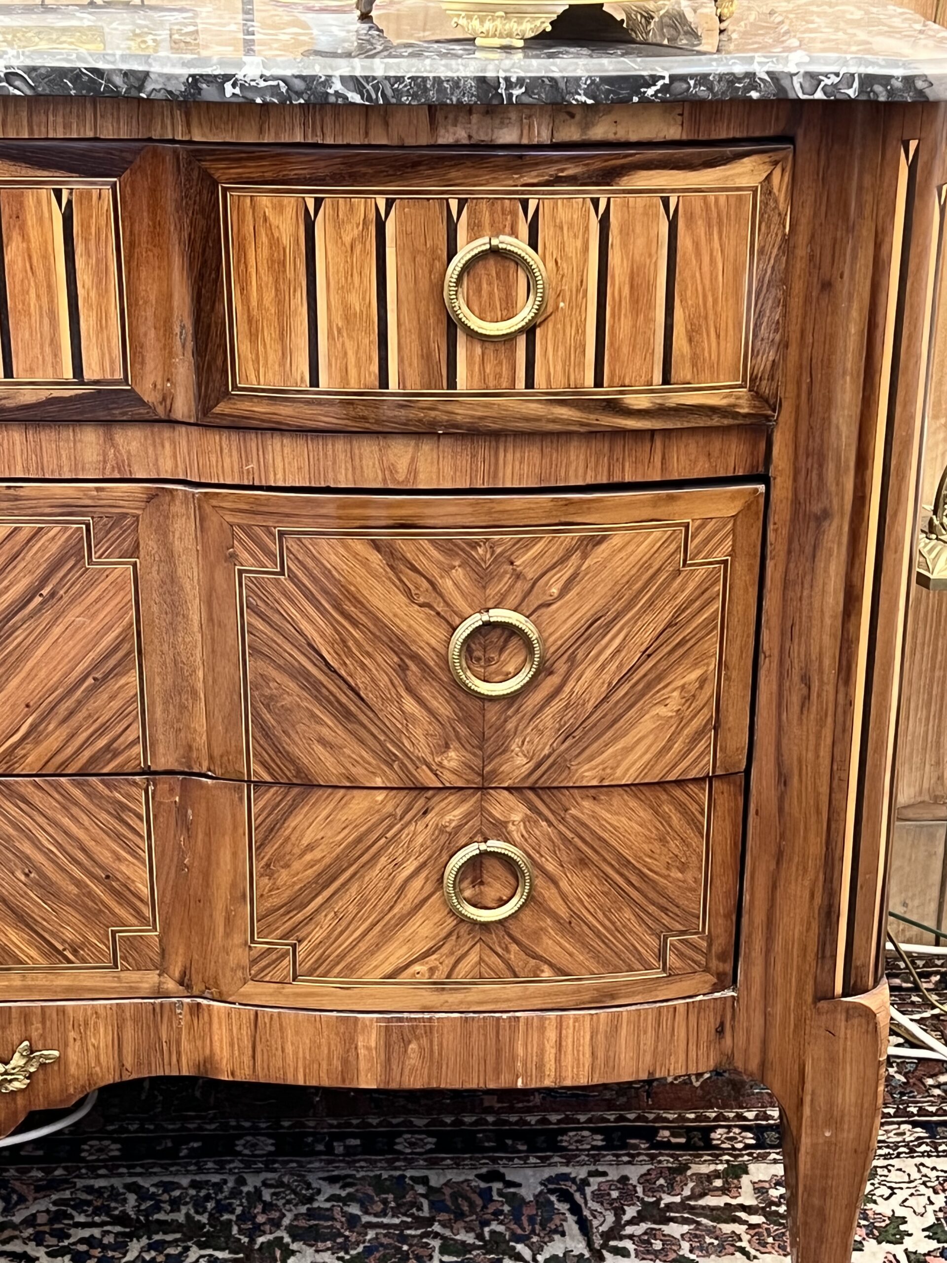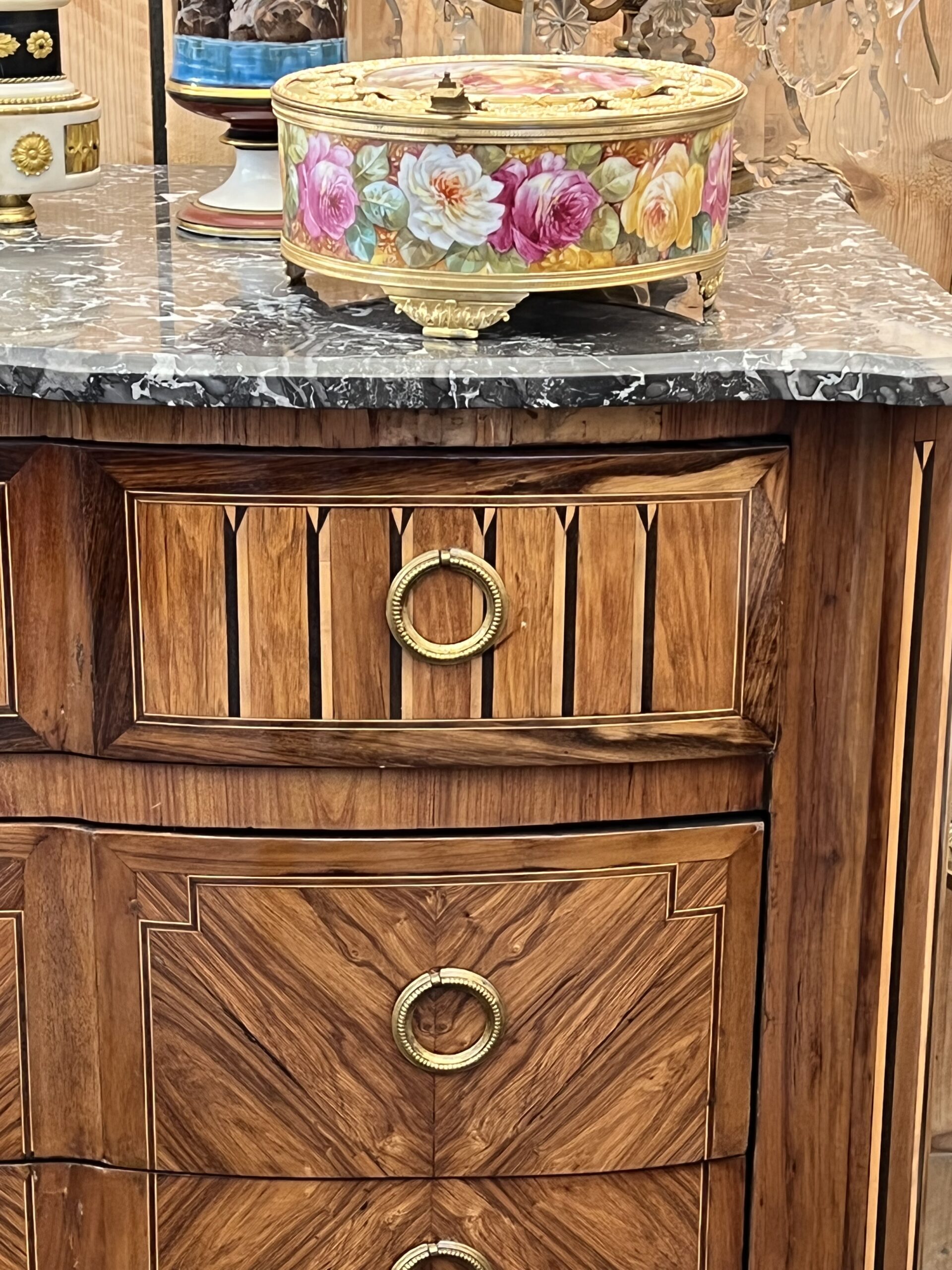 La commode que je vais vous présenter incarne l’élégance intemporelle et le raffinement caractéristiques du style Transition, un mariage harmonieux entre les ornements délicats du Louis XV et la sobriété géométrique du Louis XVI. Datant du XIXe siècle, cette pièce offre une fusion exquise de design et de fonctionnalité.