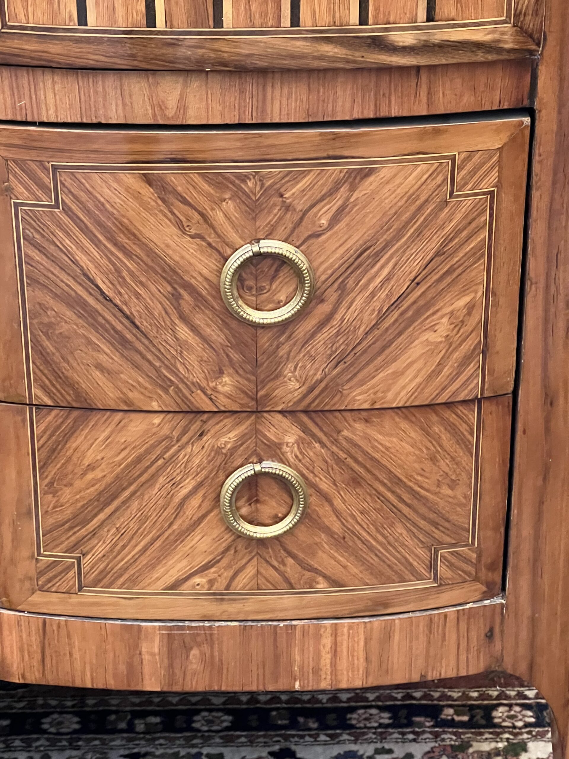 En somme, cette commode incarne parfaitement l’esthétique raffinée et l’artisanat exquis du style Transition. Témoin d’une époque où le design était synonyme d’élégance et de sophistication, elle demeure une pièce intemporelle qui saura ajouter une touche d’histoire et de charme à tout intérieur contemporain.