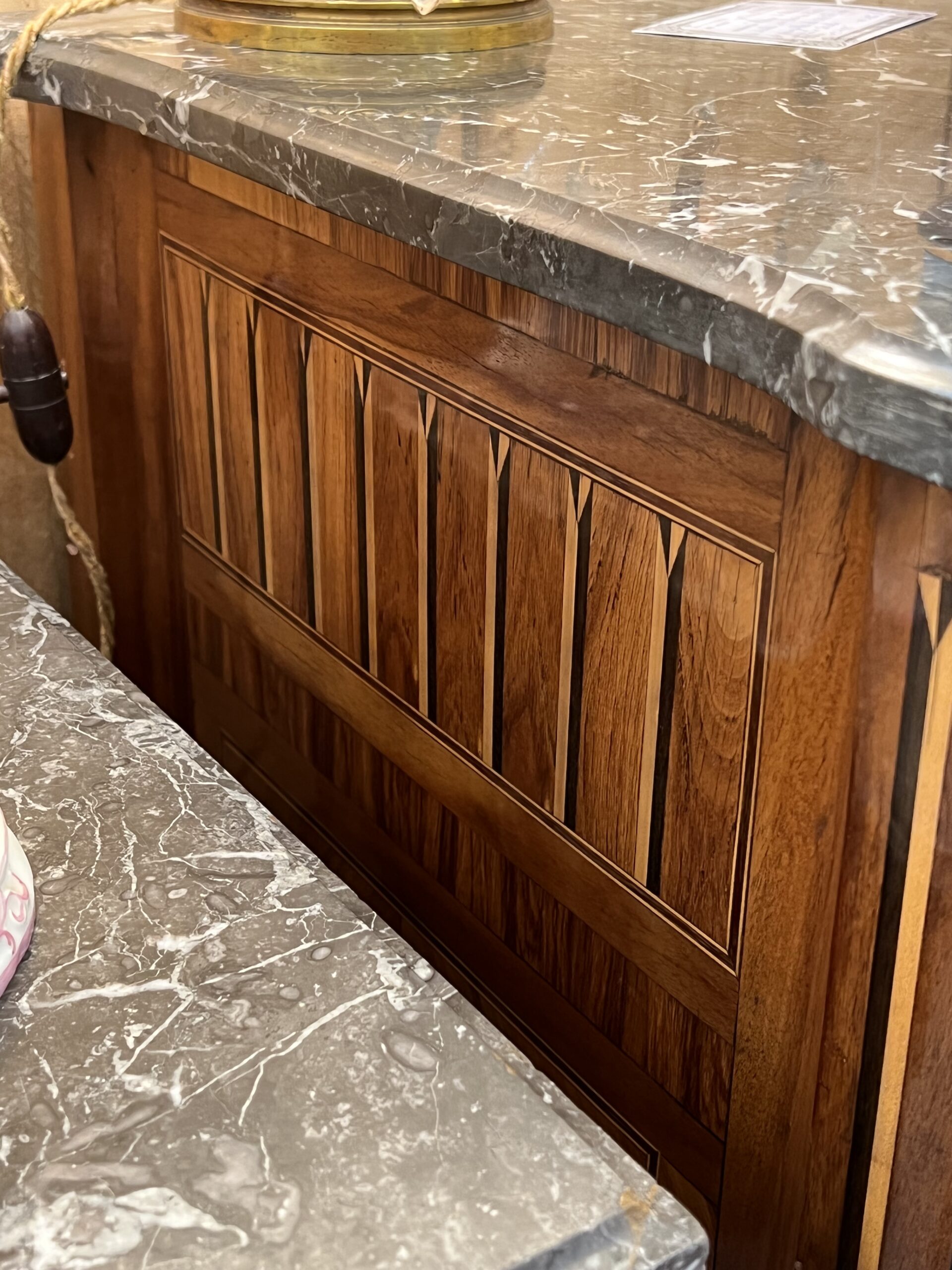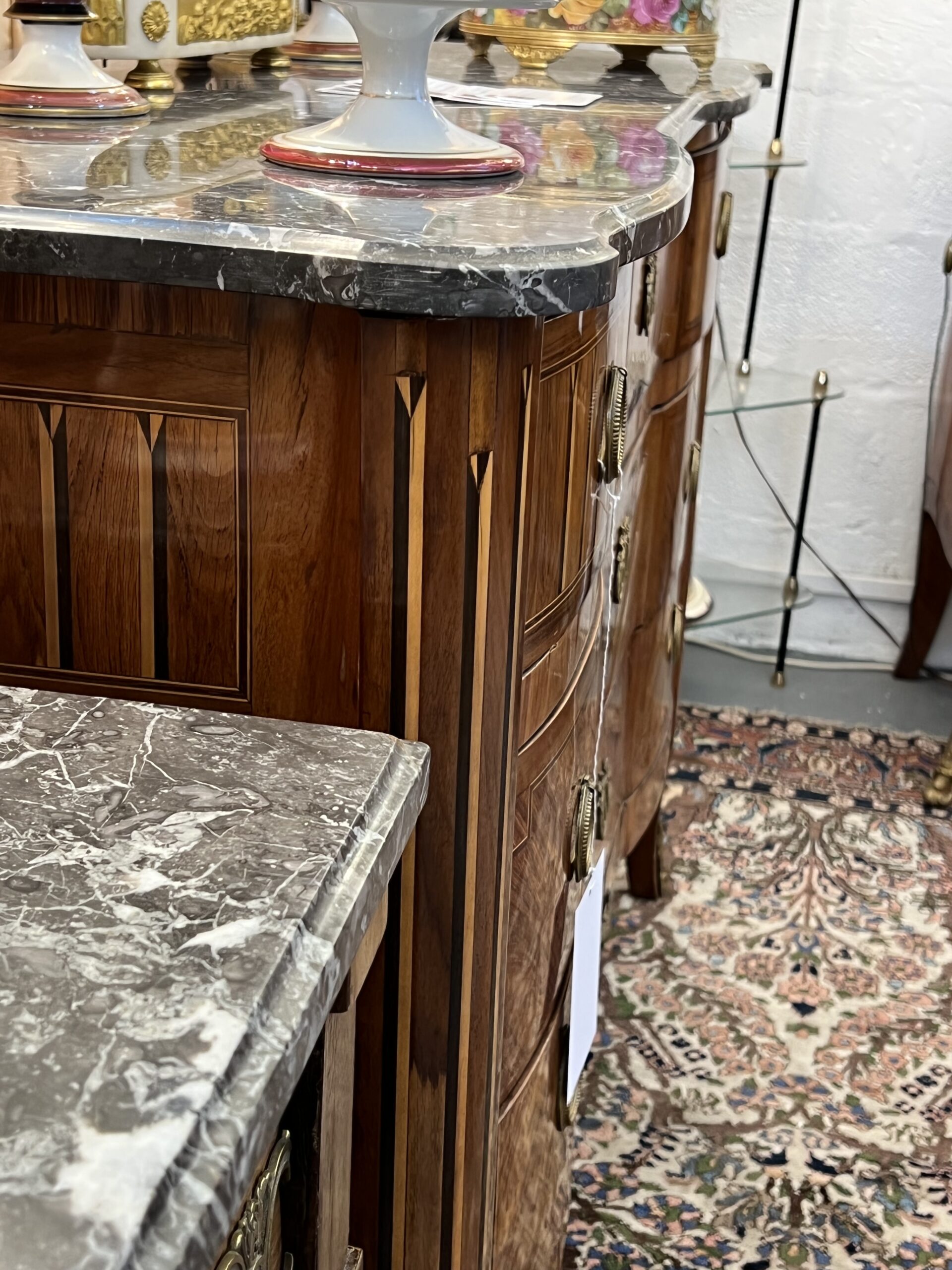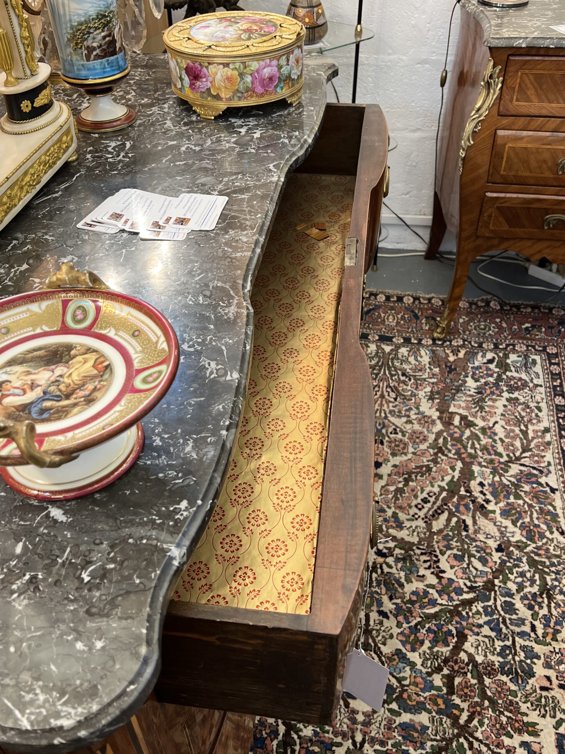 Les pieds galbés apportent une touche de grâce et de stabilité à l’ensemble, complétant harmonieusement la silhouette élégante de la commode. Surplombant cette œuvre d’art, un plateau de marbre gris ajoute une touche de luxe et de sophistication, tout en offrant une surface robuste et pratique pour exposer des objets décoratifs ou des ornements.