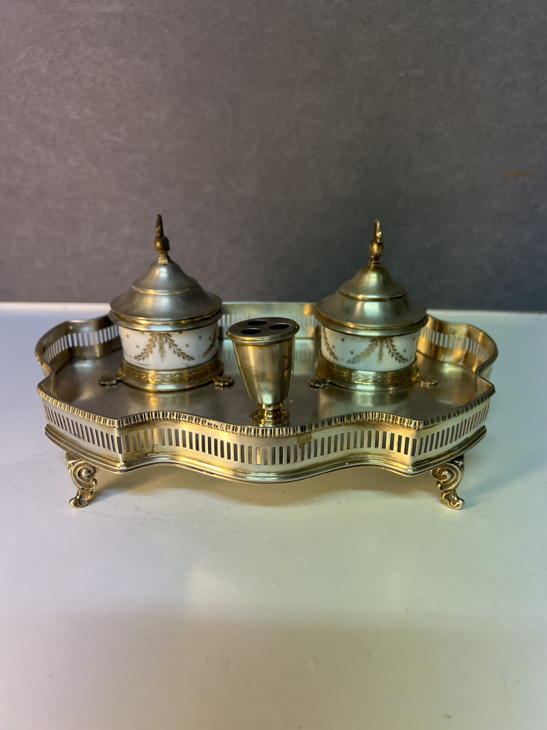 Ce qui rend cet ensemble encore plus remarquable, c’est son origine étrangère. Il porte en lui les influences artistiques et culturelles de contrées lointaines, témoignant de la mondialisation croissante qui caractérisait le XIXe siècle. Chaque encrier est entouré d’une galerie ajourée, une caractéristique typique de l’artisanat étranger de l’époque, ajoutant une dimension de légèreté et d’élégance à l’ensemble.