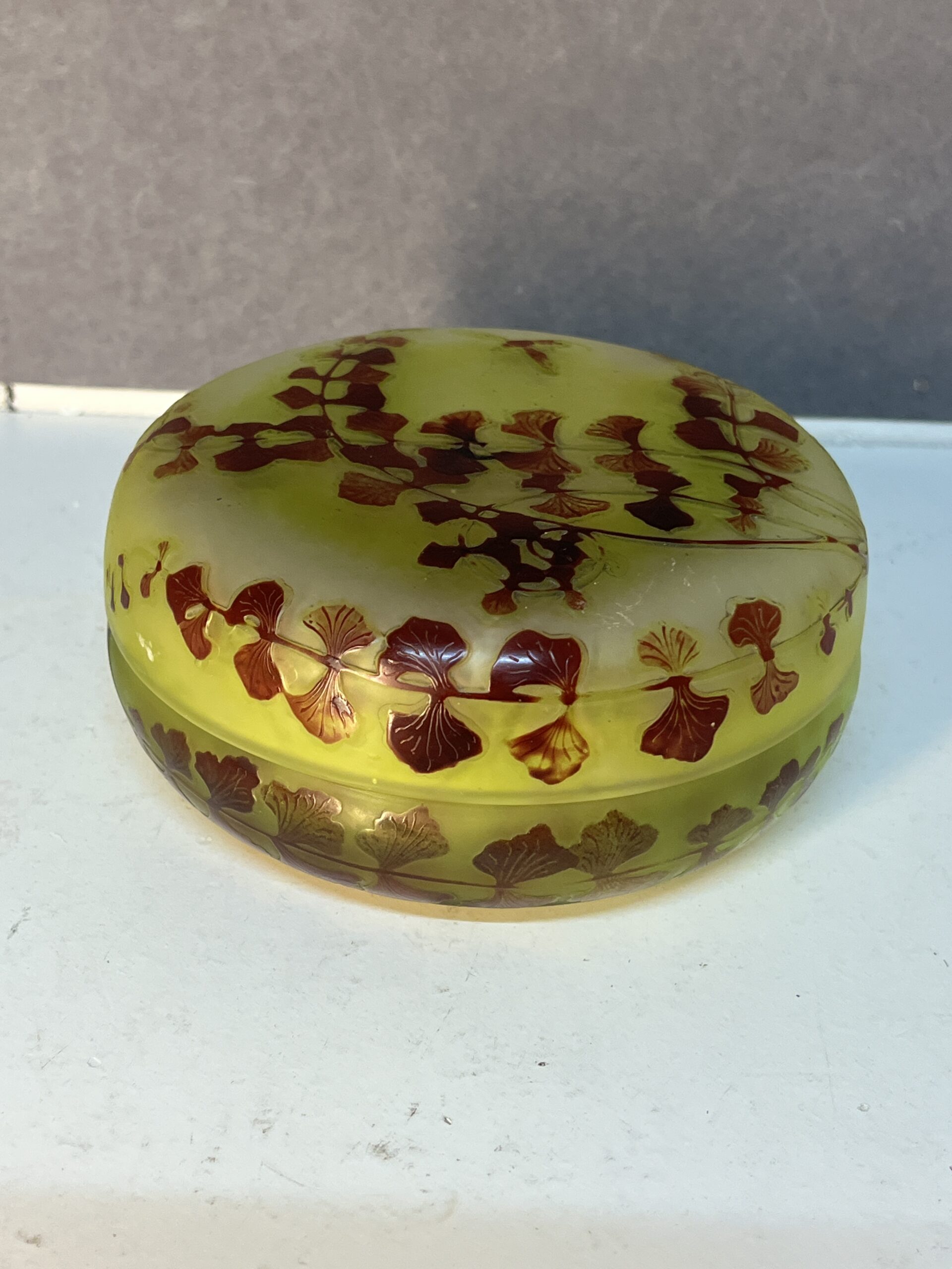 Cette magnifique boîte bonbonnière en verre, datant de l’époque Art Nouveau circa 1900, est une véritable œuvre d’art signée par le célèbre maître verrier Émile Gallé.