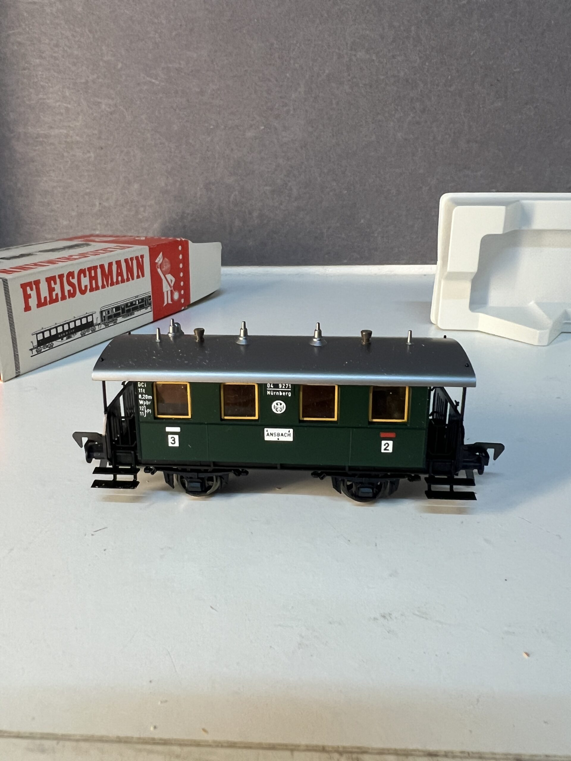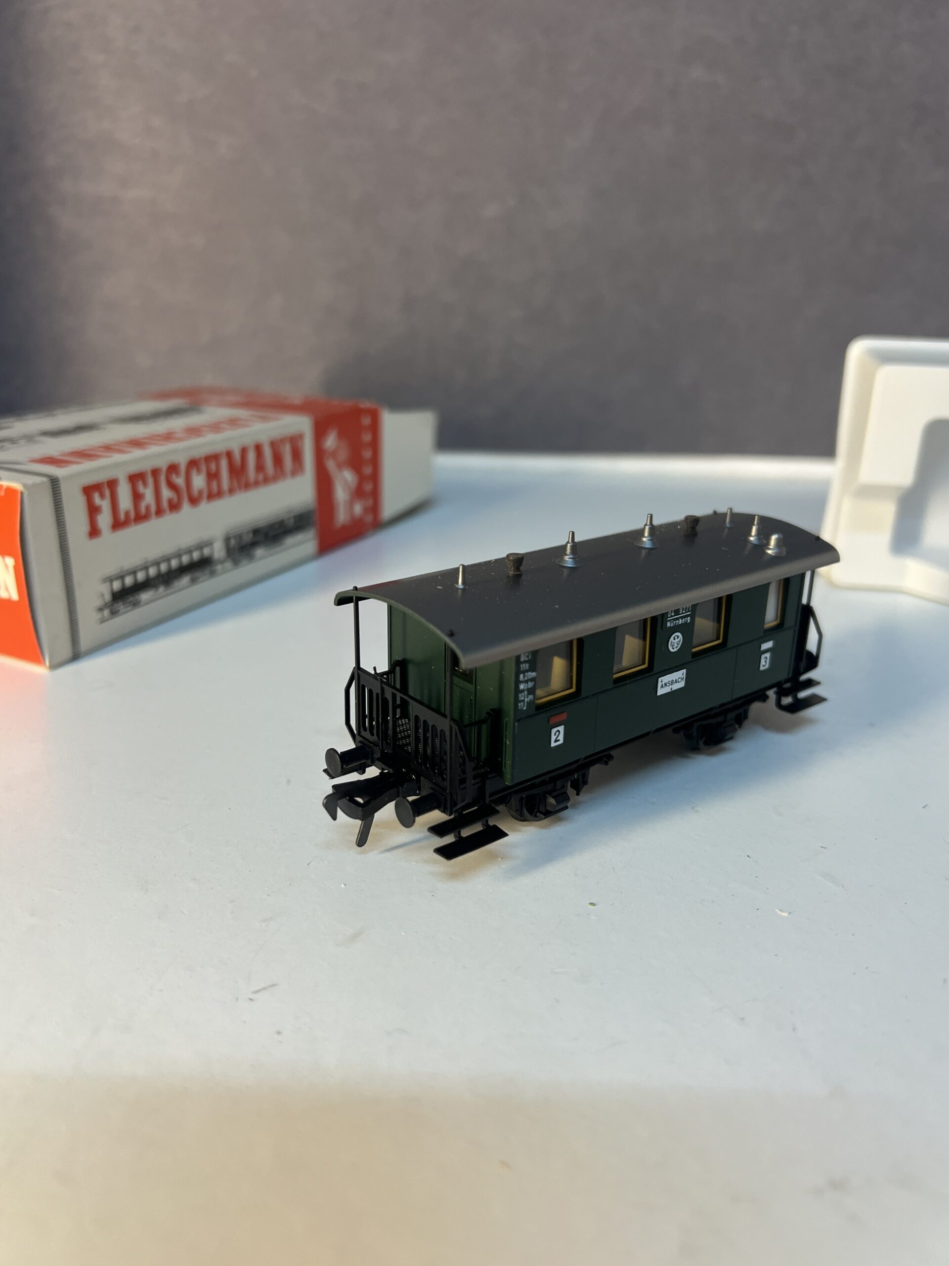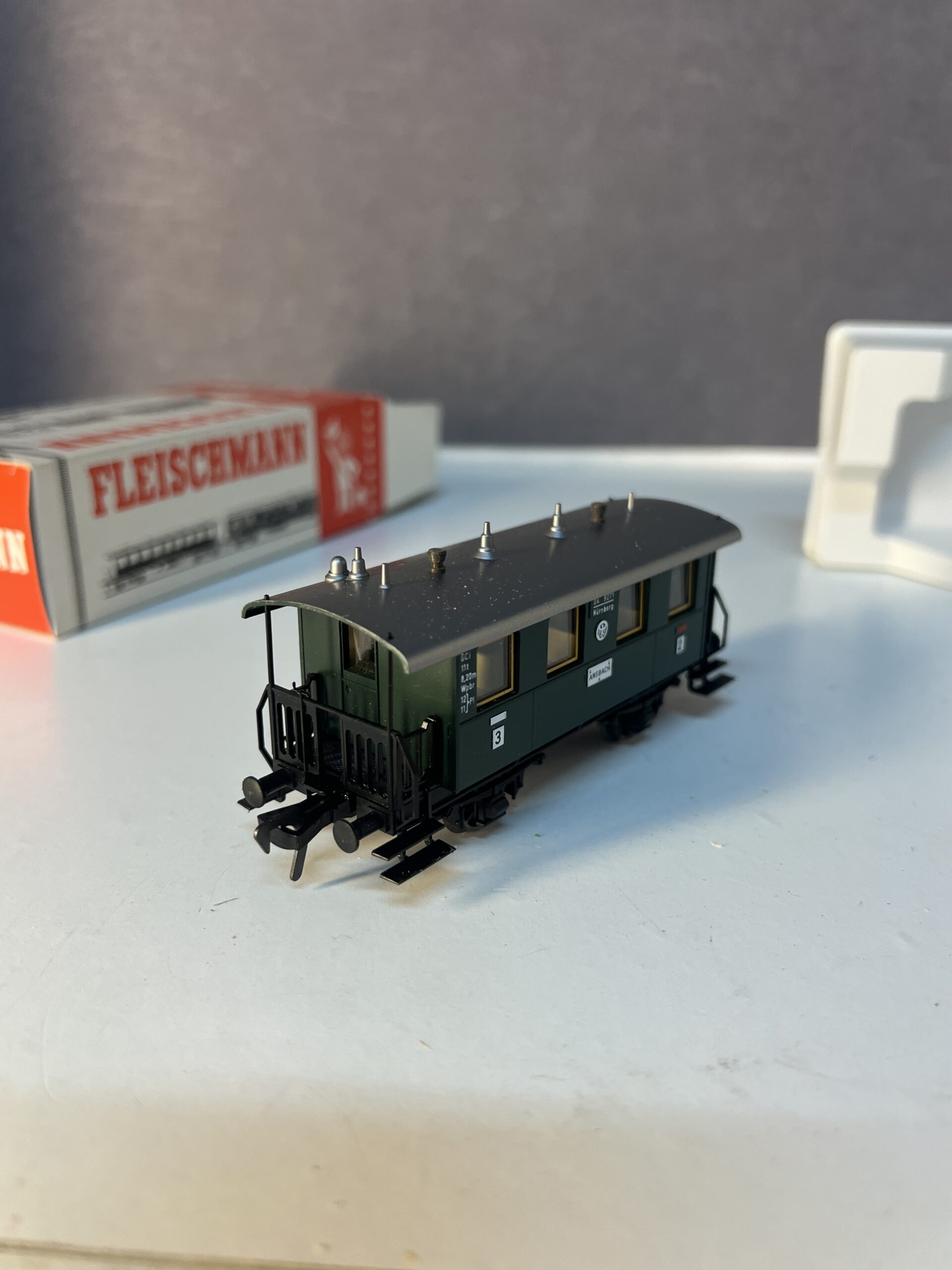 Modèle HO Fleischmann 5052 : voiture DRG 2e et 3e classe avec balcon, époque II, finition soignée, idéale pour collectionneurs et modélistes.