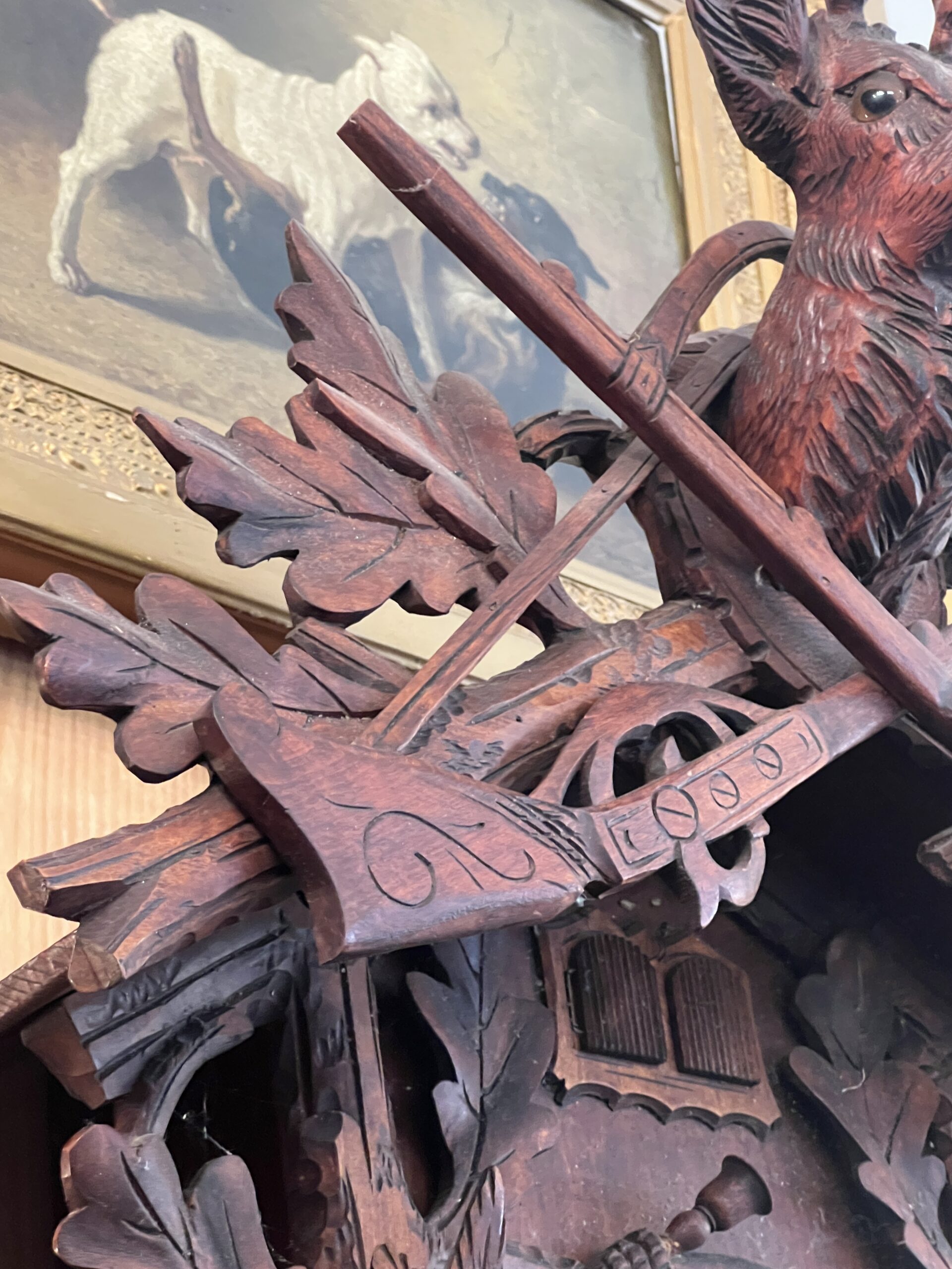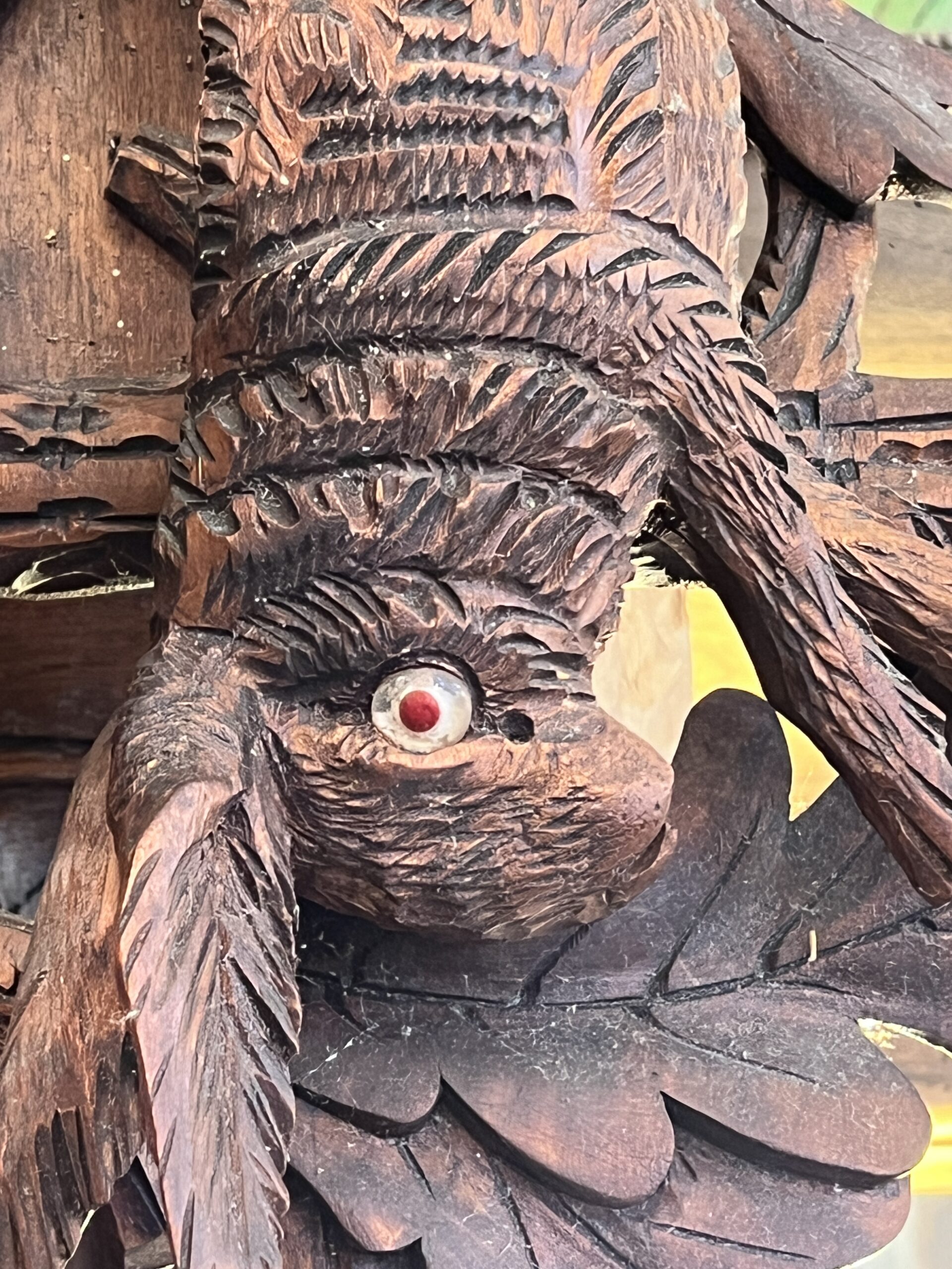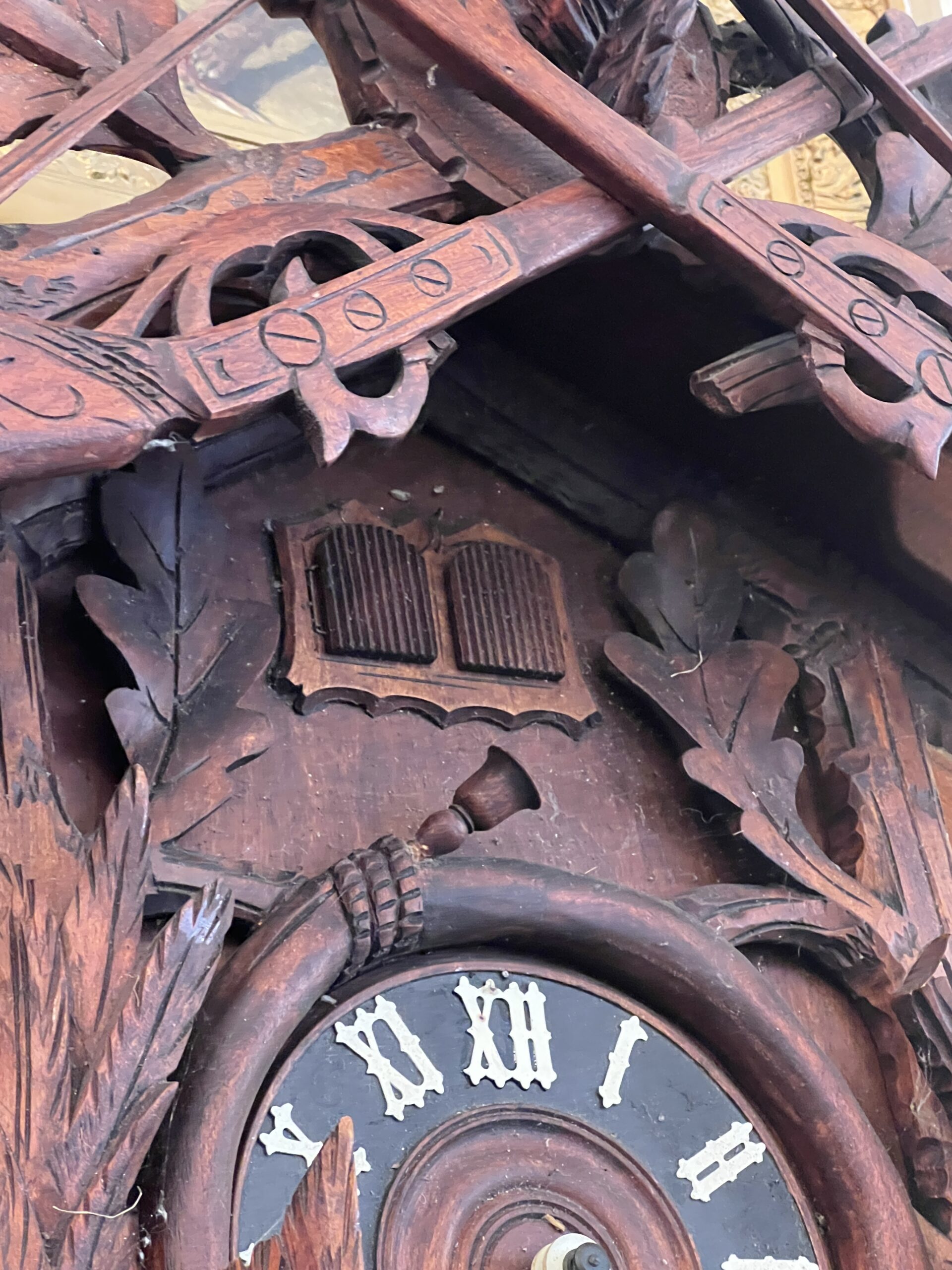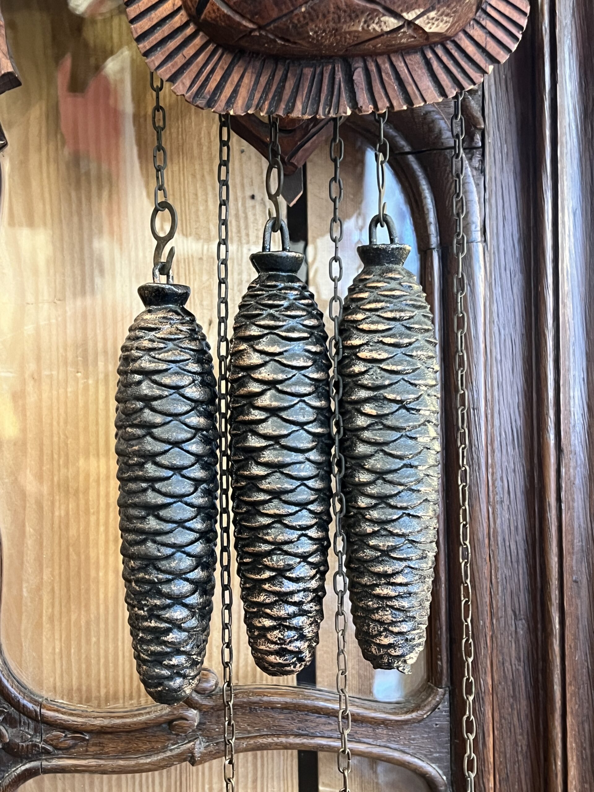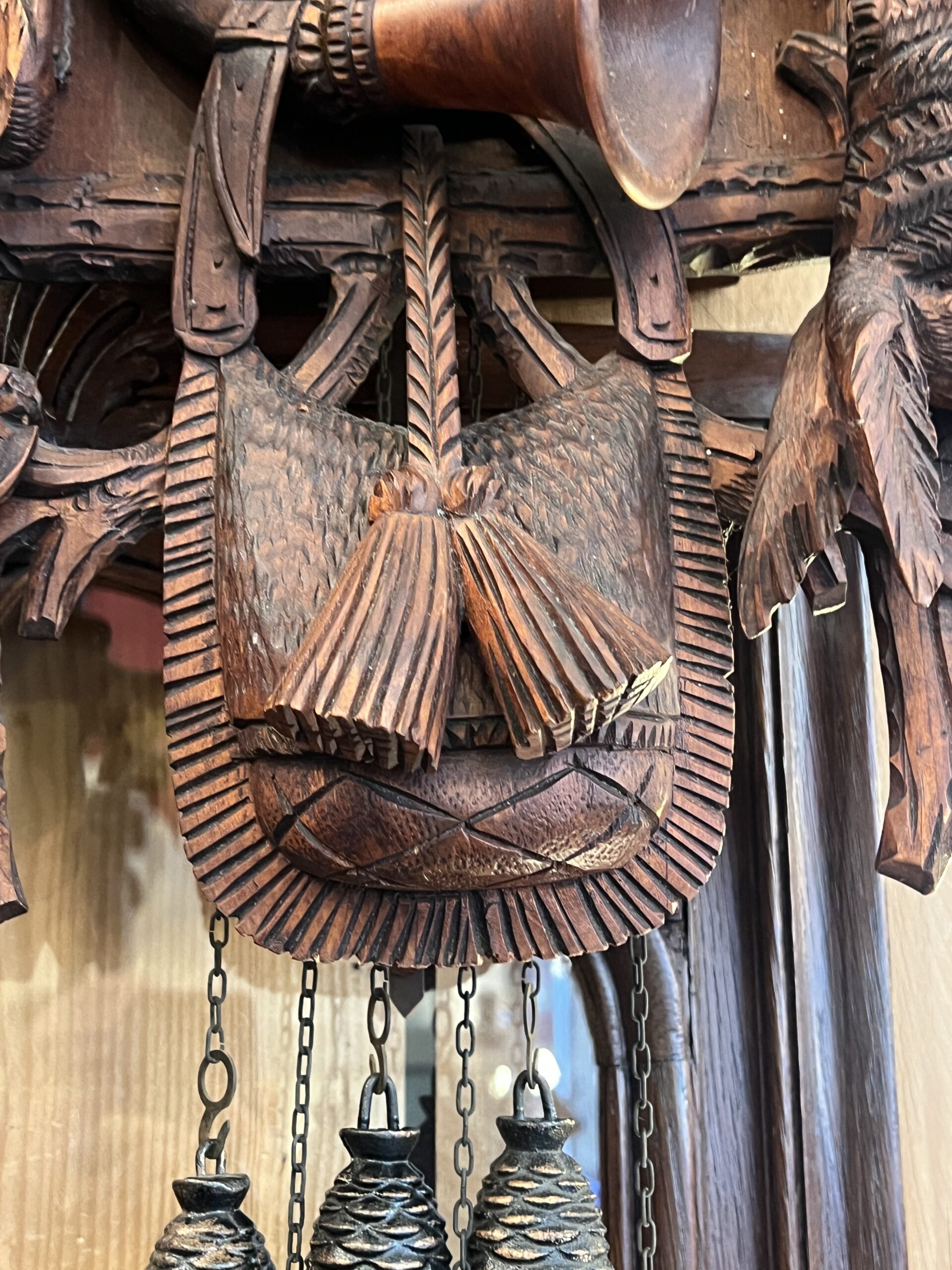 La pièce maîtresse de cette horloge est sans aucun doute son coucou, qui surgit de son abri à chaque heure pour annoncer le temps qui passe. Taillé avec soin dans un bois rouge caractéristique de la région, le coucou est une œuvre d’art en soi. Ses détails minutieux, des plumes délicatement sculptées à son bec finement ciselé, capturent l’essence même de la nature qui l’inspire. À chaque apparition, le coucou apporte une touche de vie et d’authenticité à son environnement.