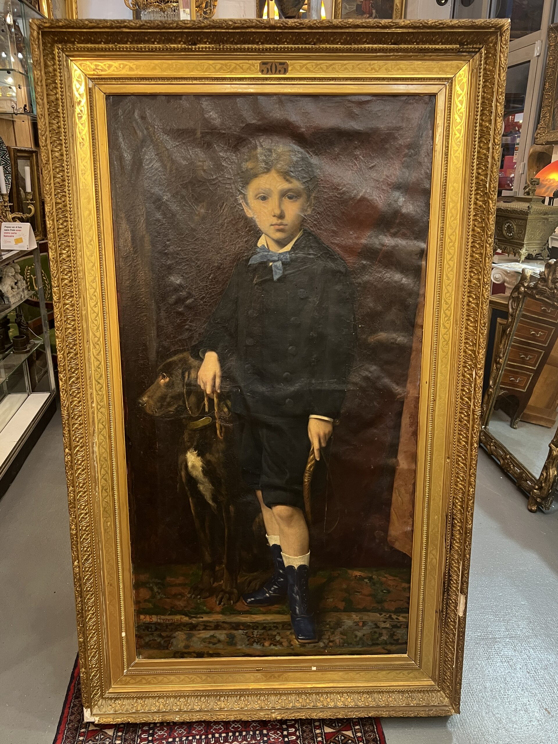 Exceptionnel portrait d’enfant en huile sur toile (163×98 cm) signé Jean‑Baptiste Brunet, daté vers 1878-82, belle facture du XIXᵉ siècle
