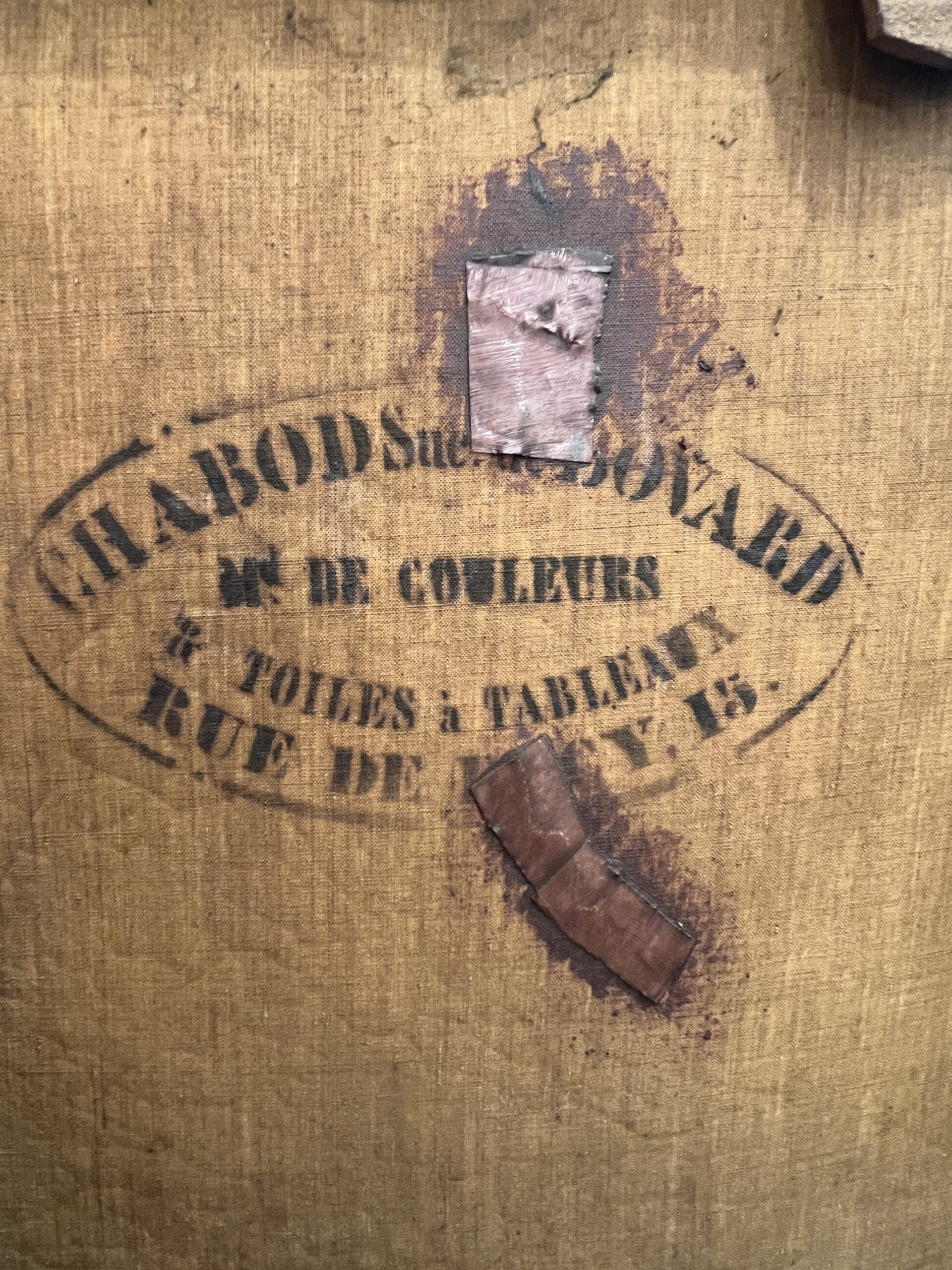 Au verso, un tampon “Chabod, Suc de Bovard” renvoie à un fournisseur de toiles parisien actif entre 1873 et 1885, confirmant la datation de l’œuvre vers 1878 – 1882.