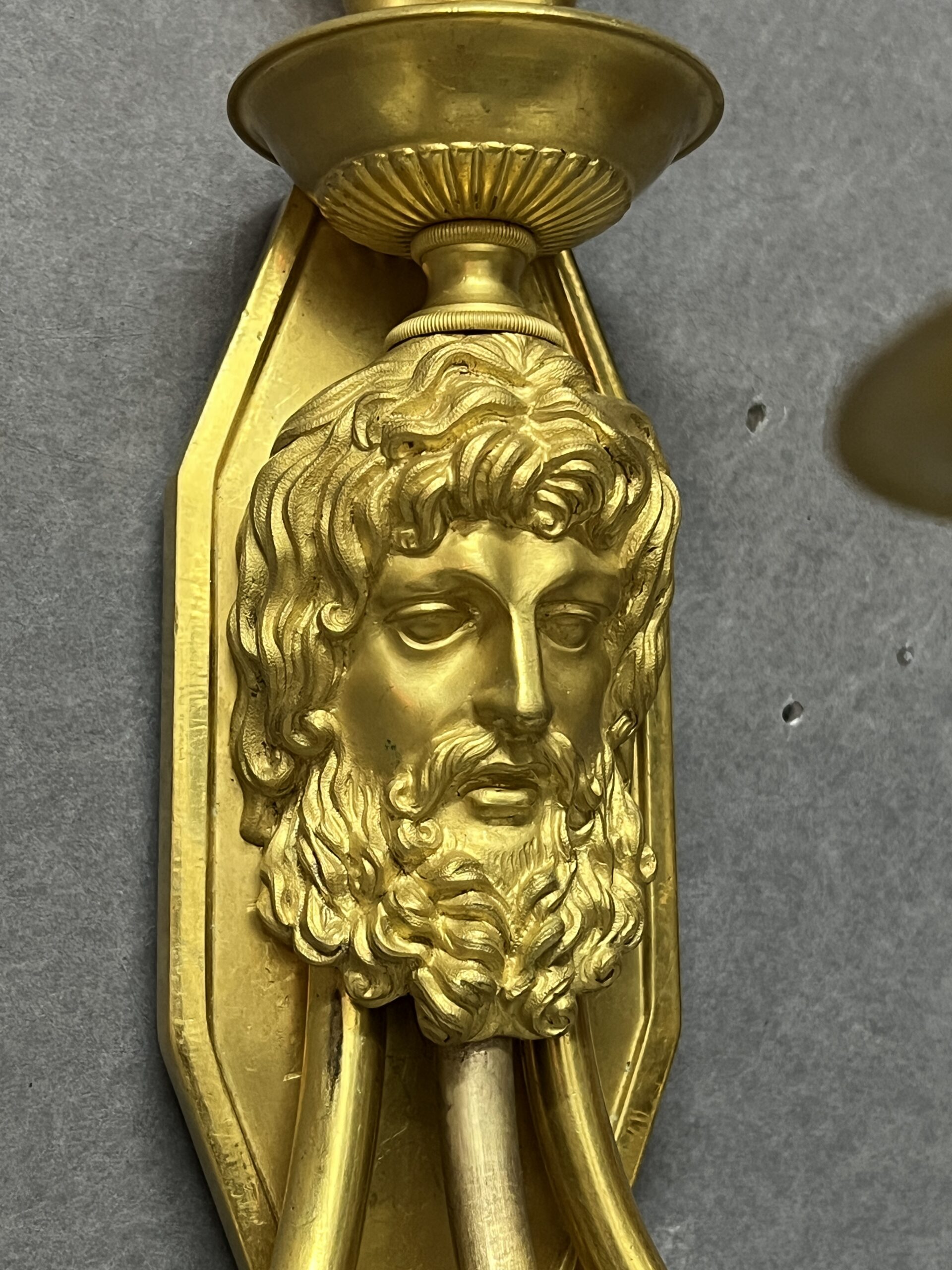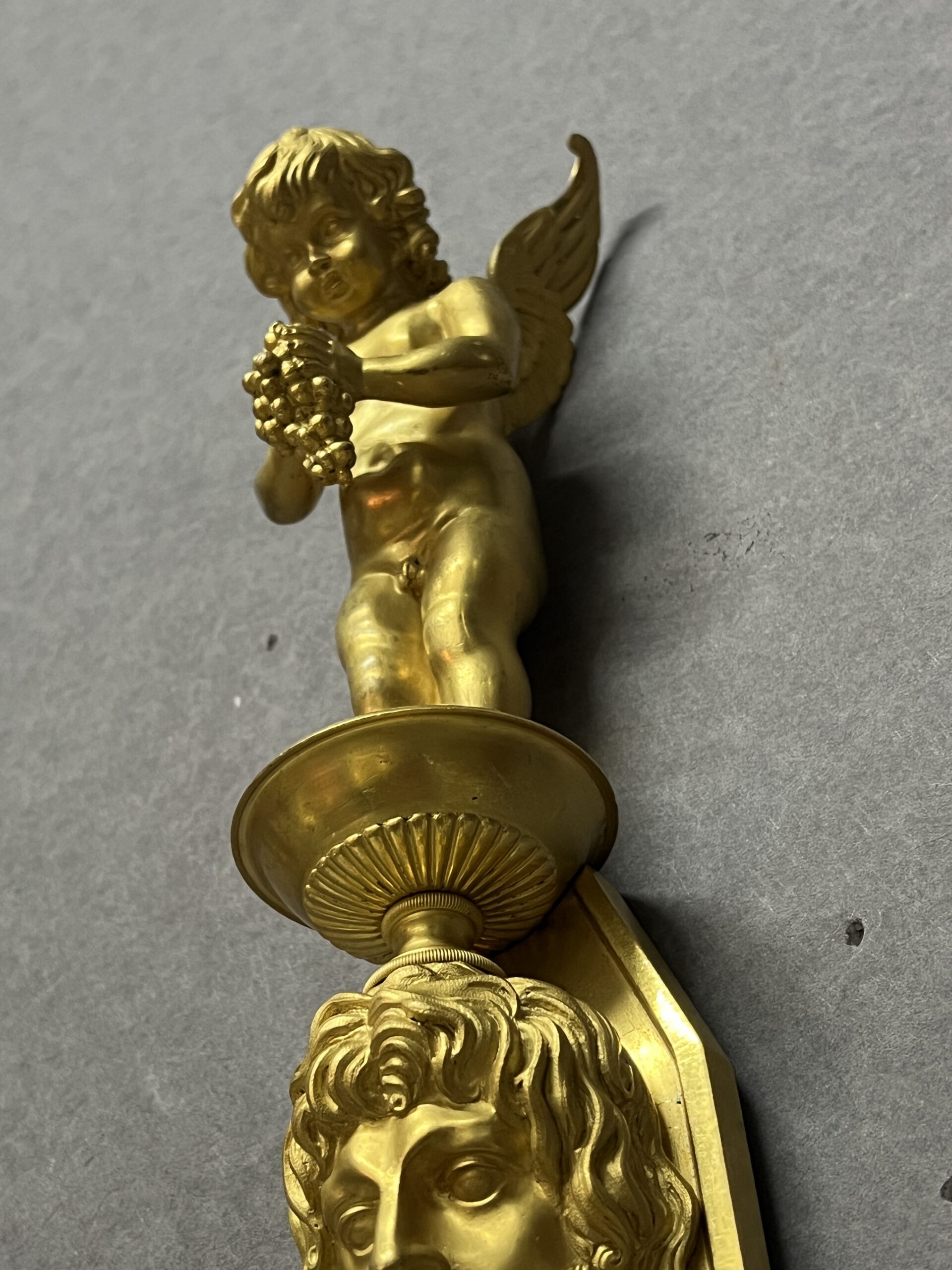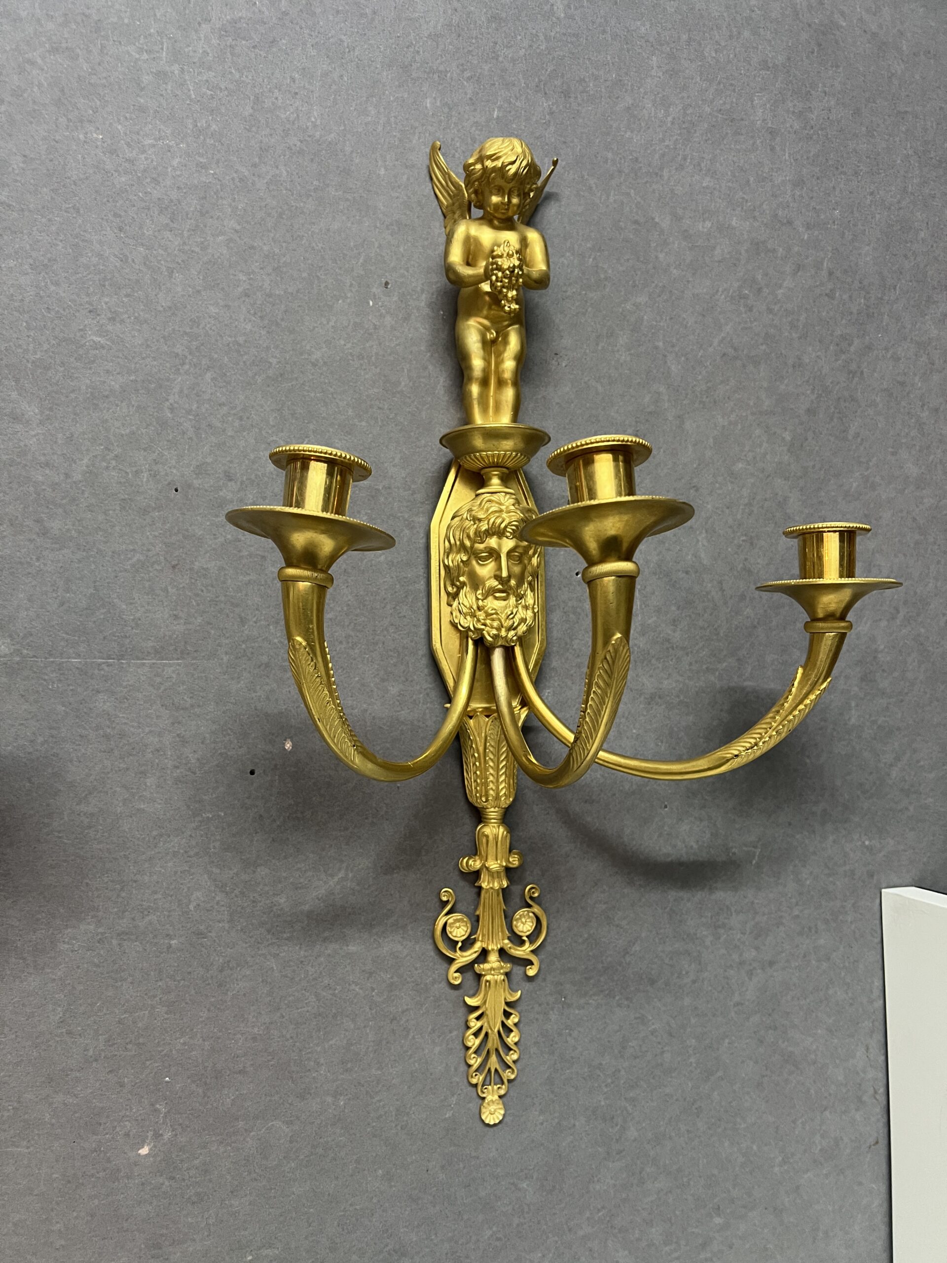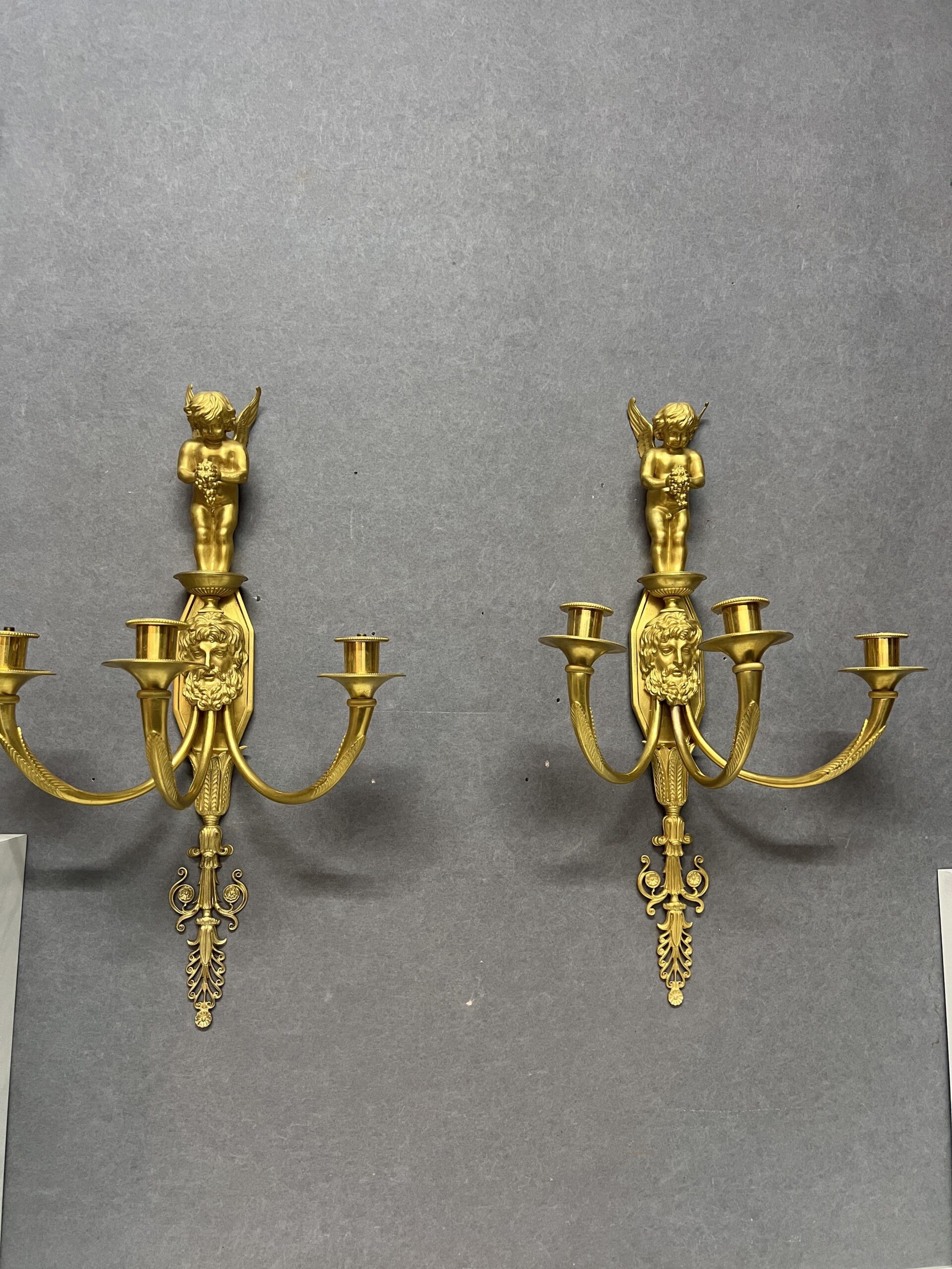 Grande paire d’appliques Empire luminaire en bronze doré 57 cm, époque XIXe, Tête barbu et chérubin