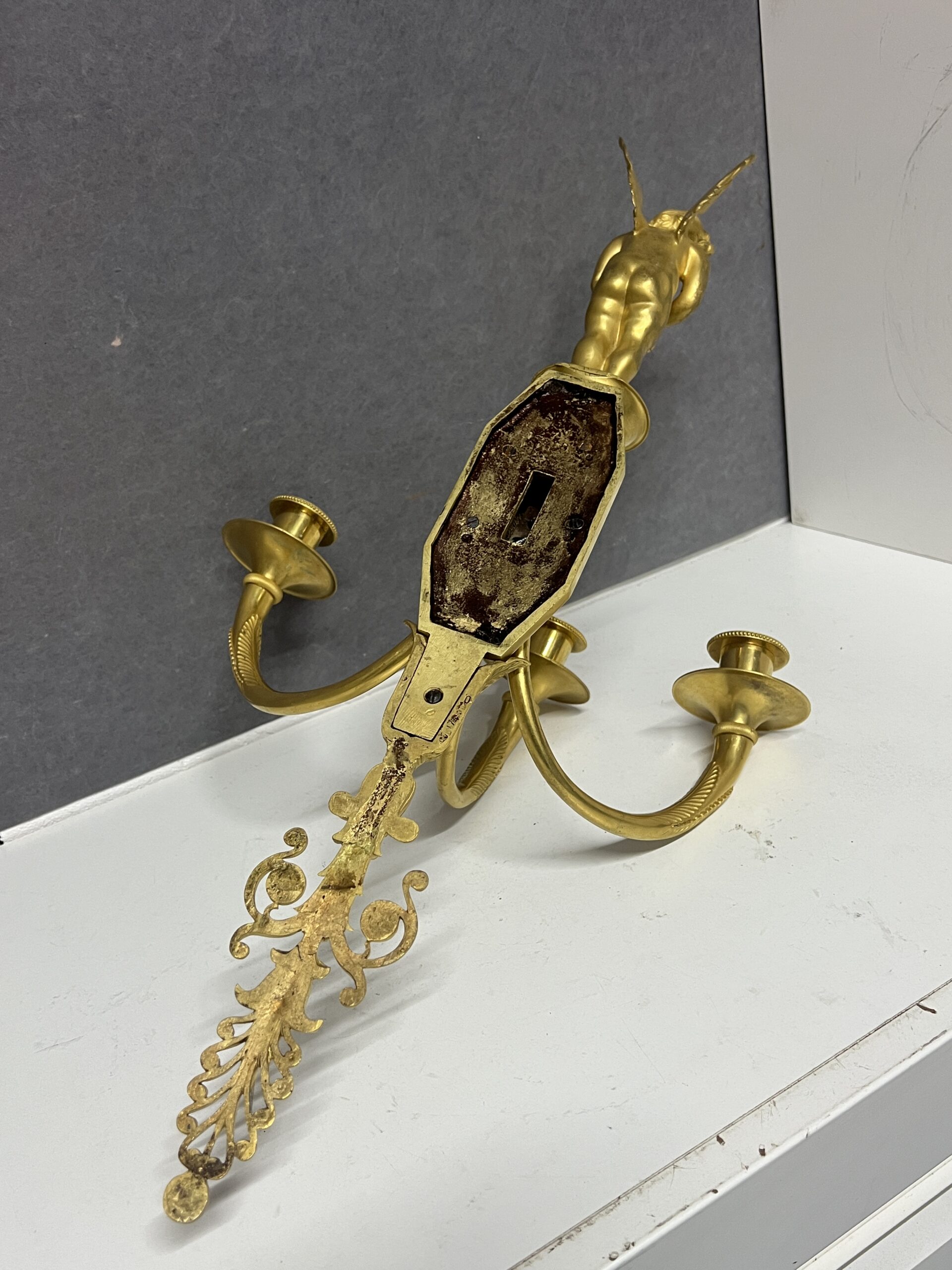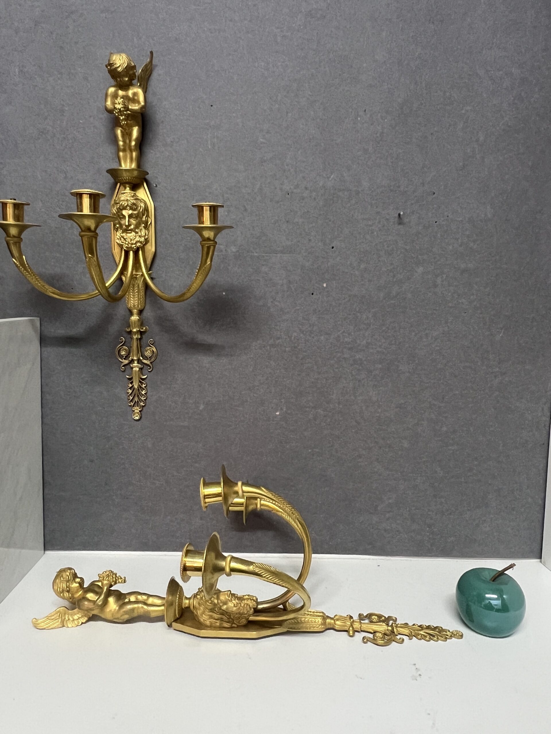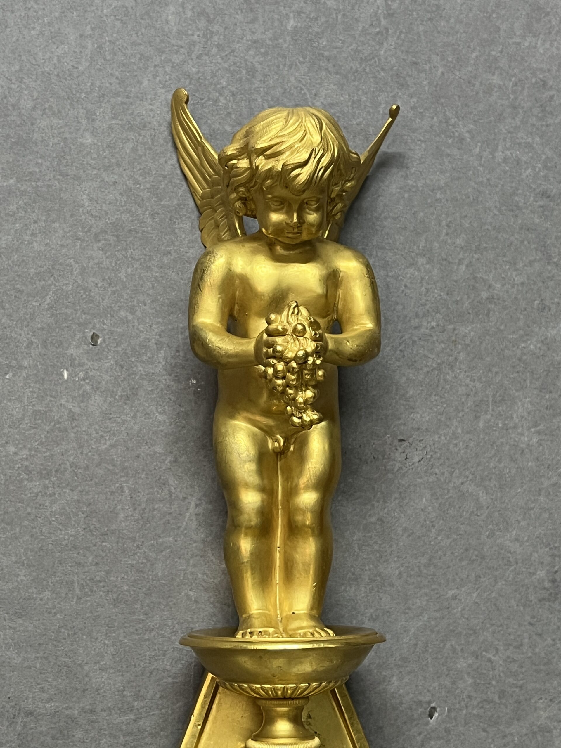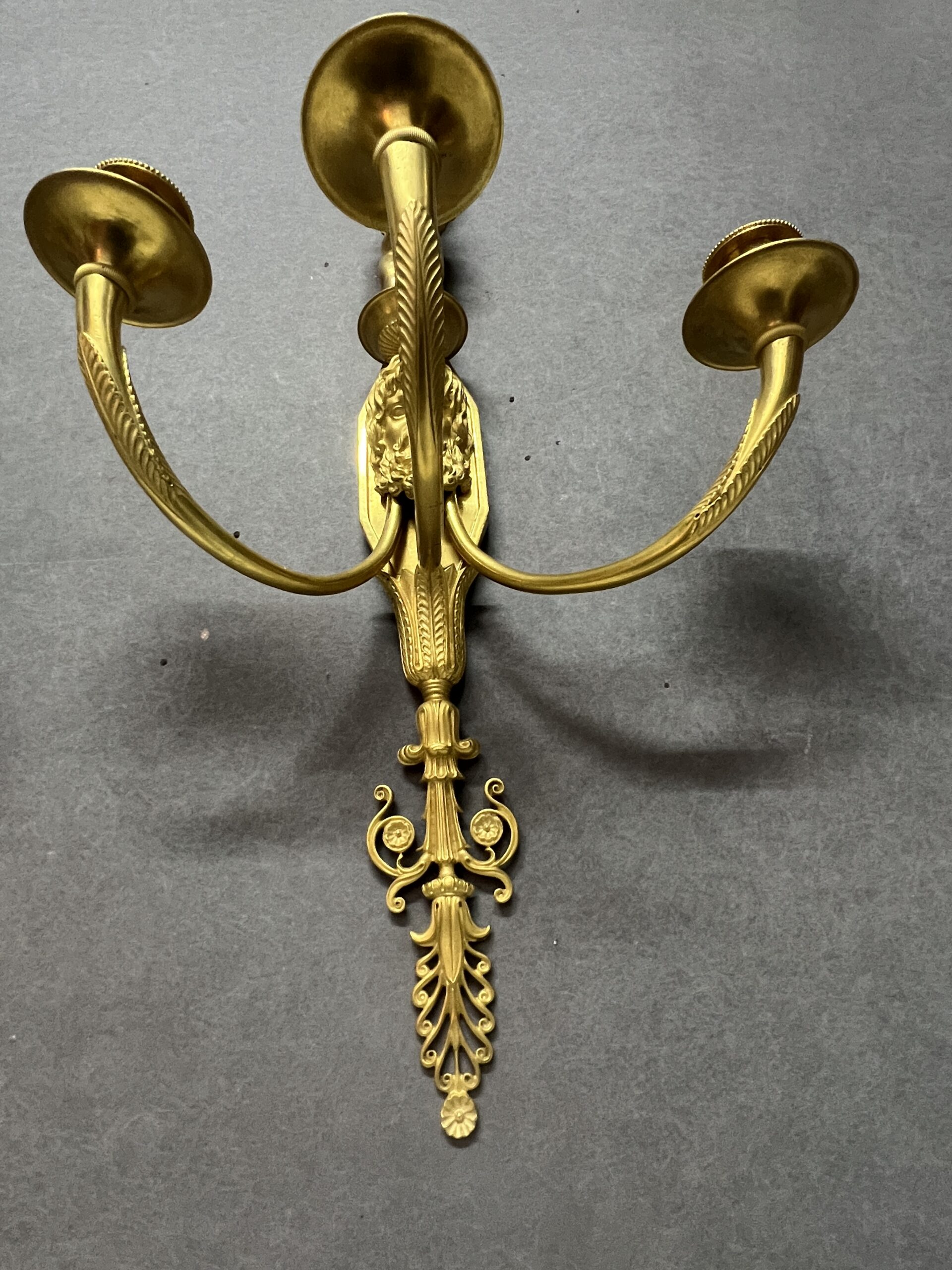 Grande paire d’appliques Empire luminaire en bronze doré 57 cm, époque XIXe, Tête barbu et chérubin