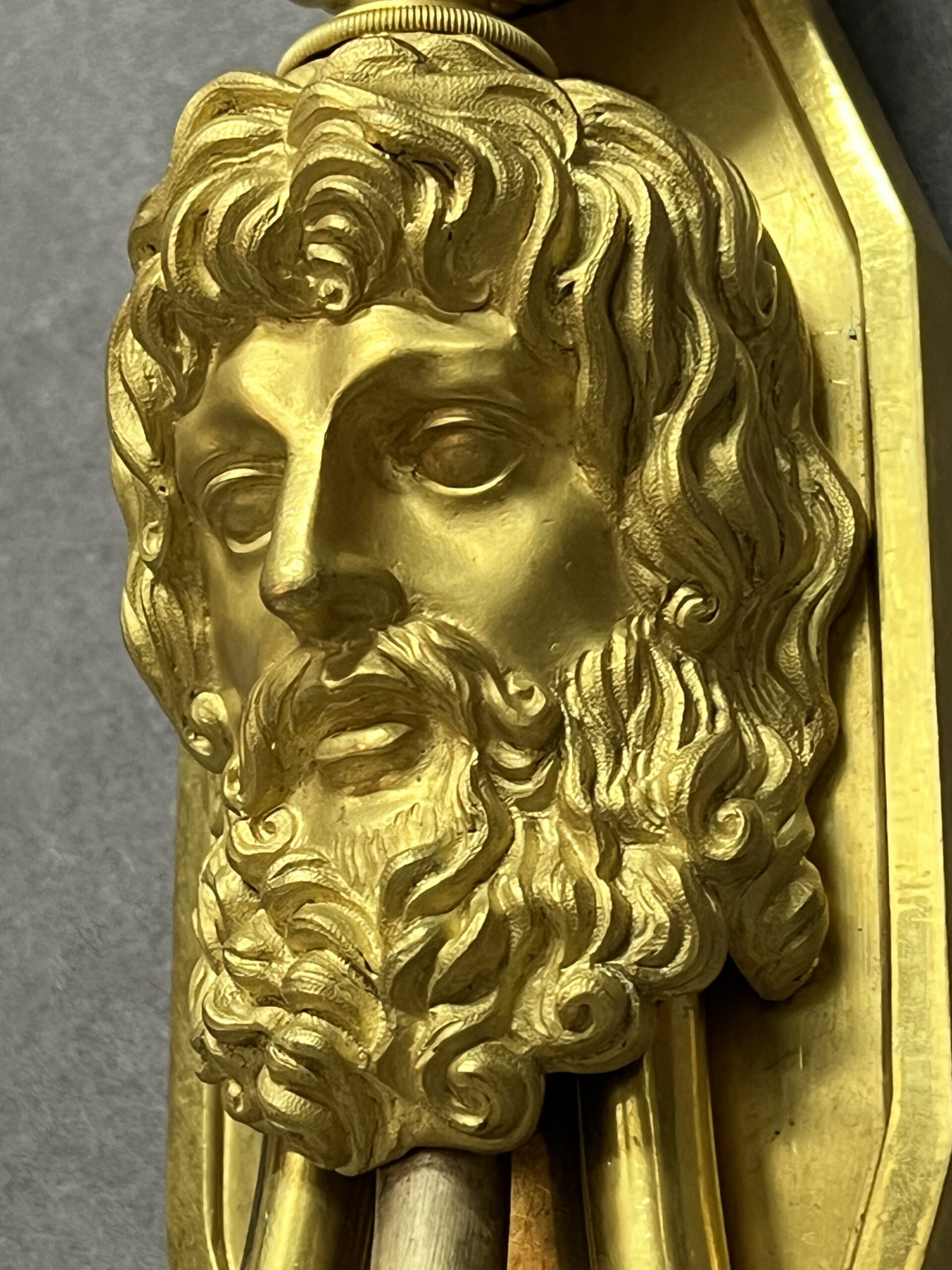 Ce visage mystérieux, aux cheveux bouclés et à la barbe abondante, évoque les figures antiques chères à l’esthétique impériale, rappelant peut-être un dieu ou un héros de la mythologie.