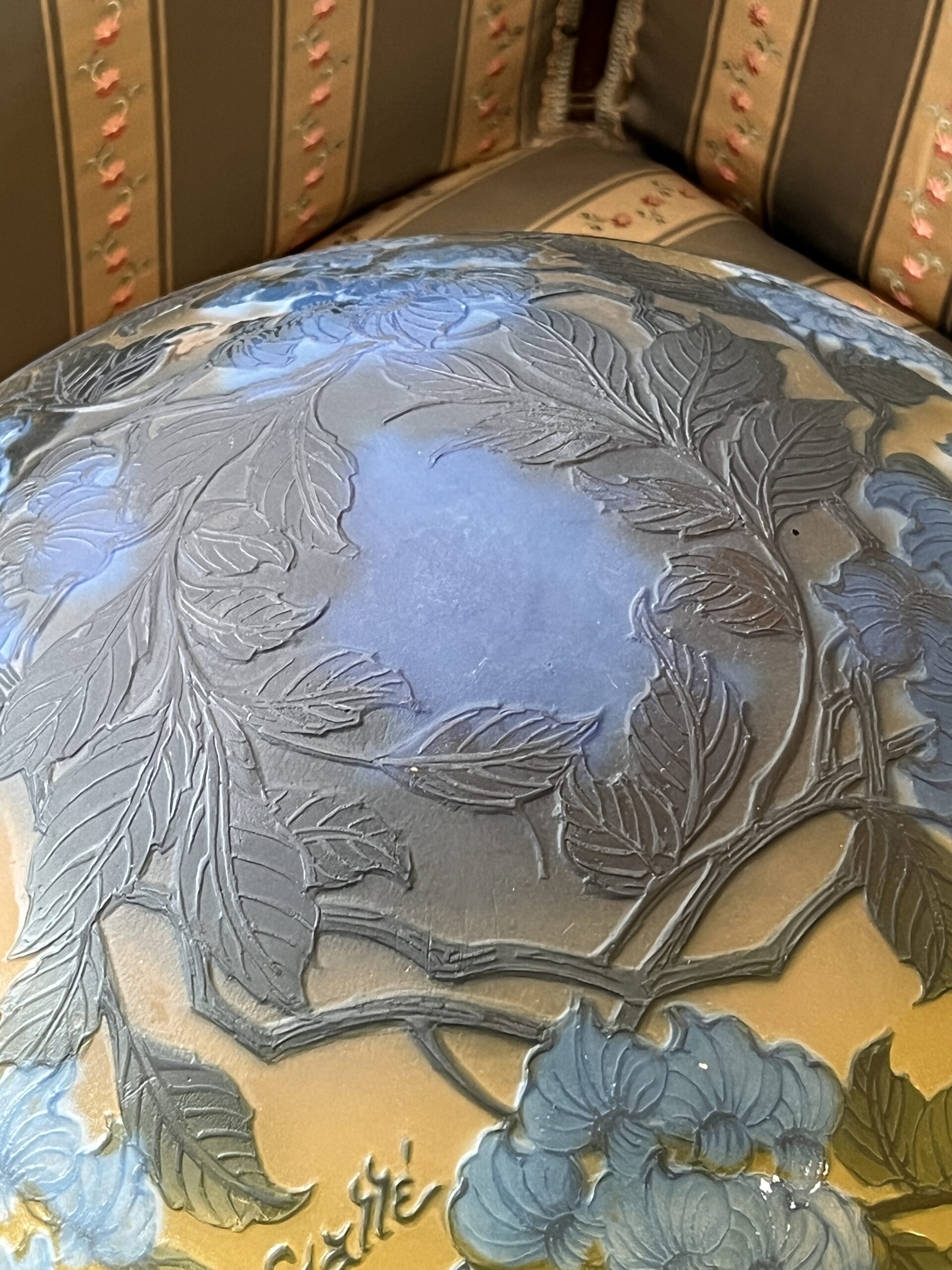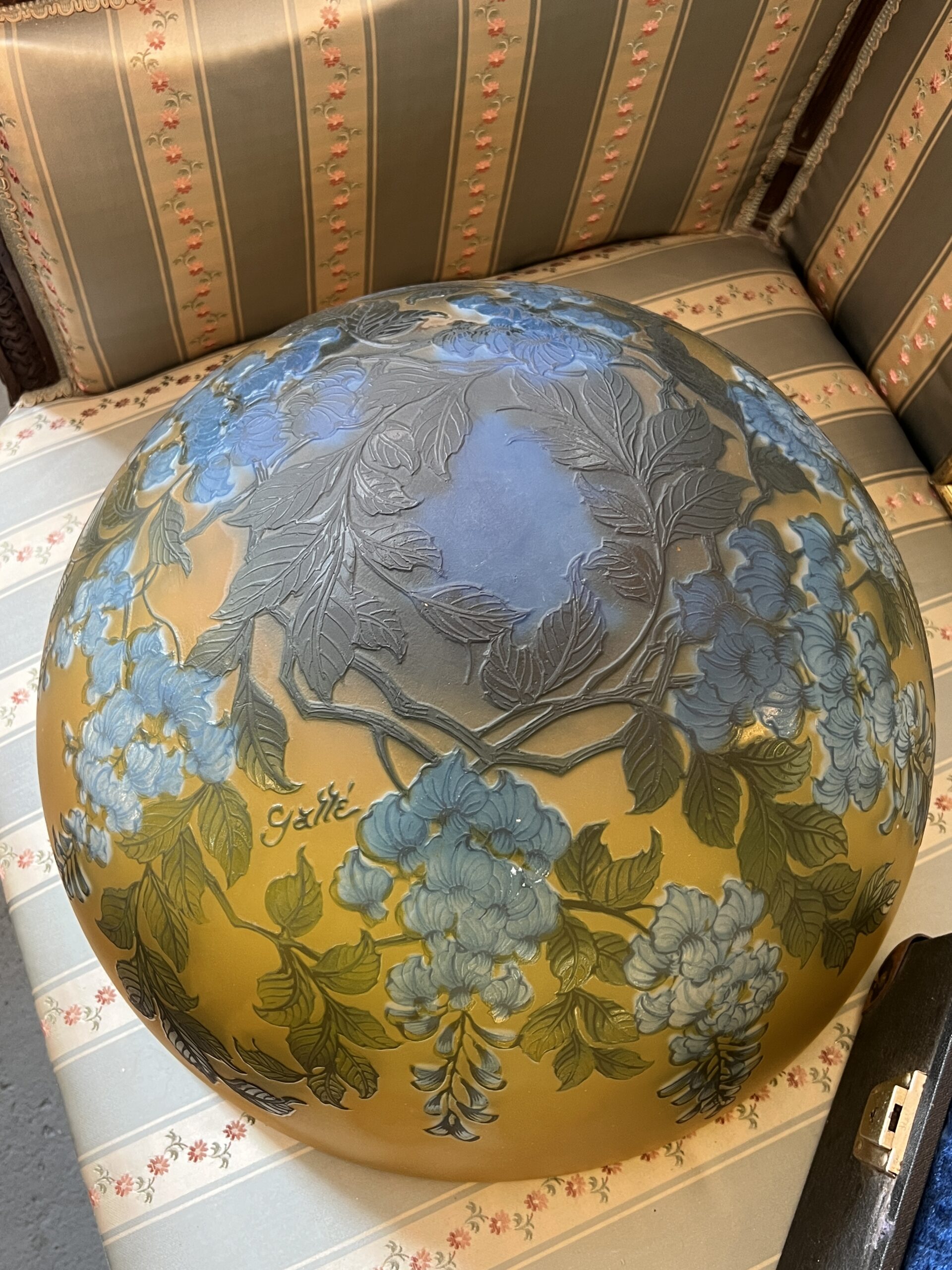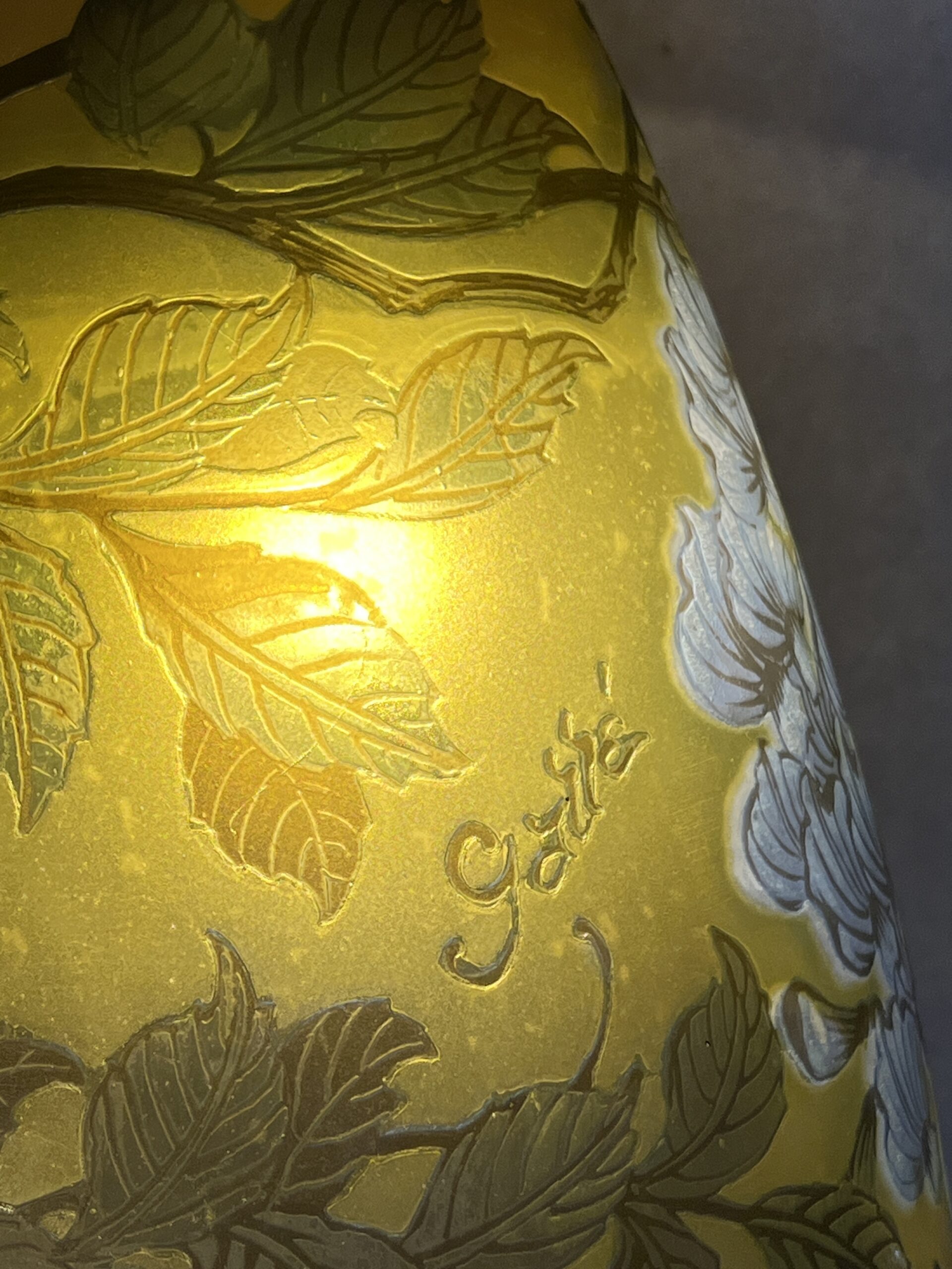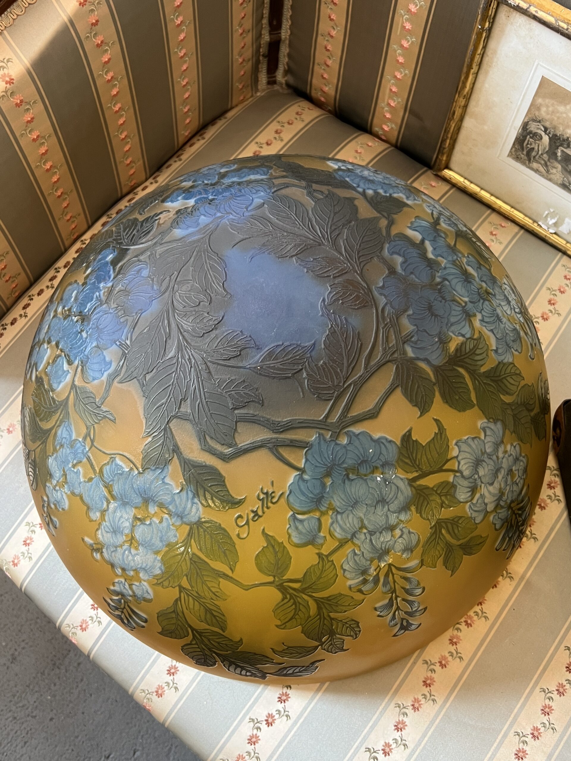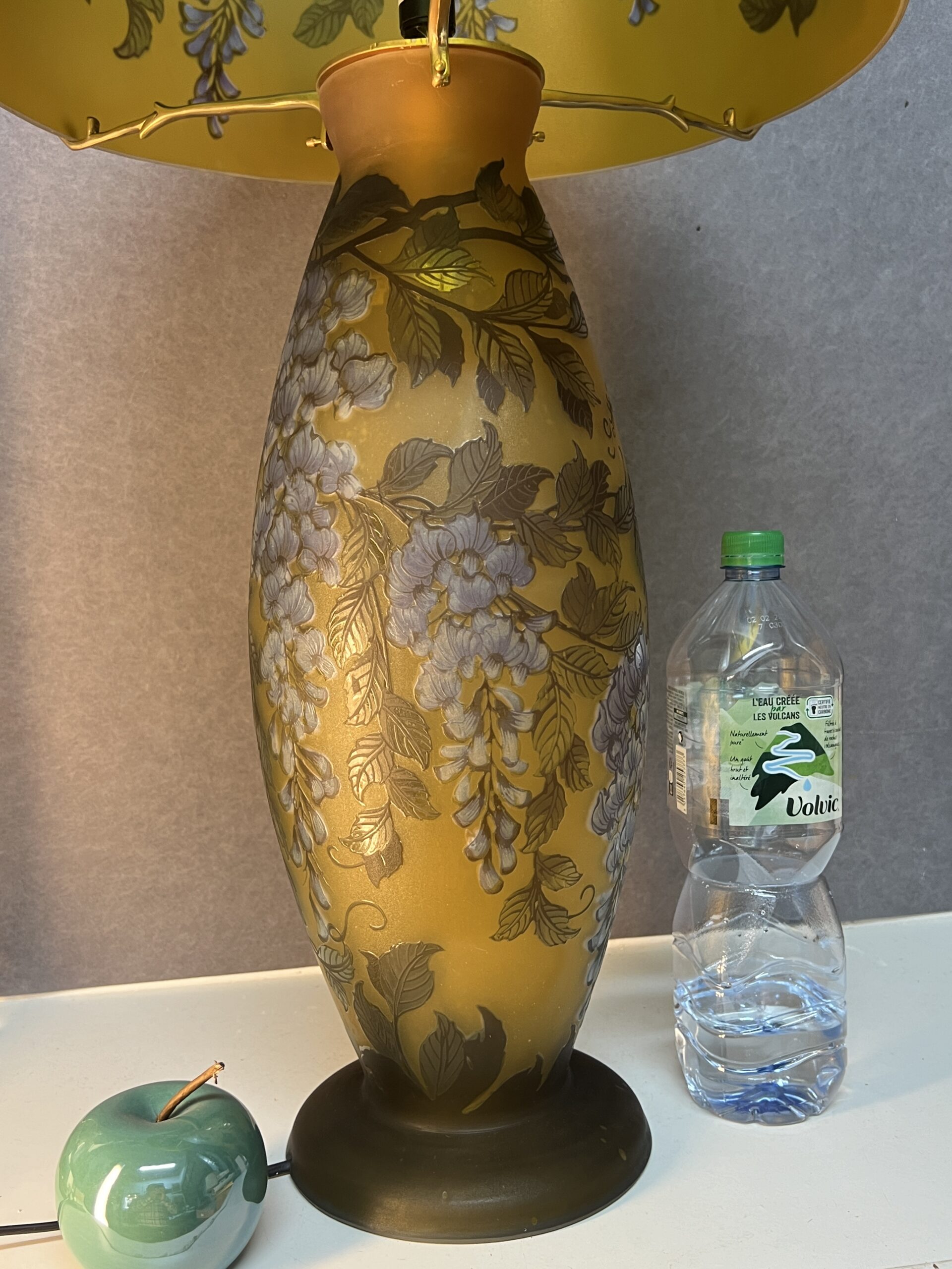 La lampe porte fièrement une signature, un témoignage de son origine. Cette signature évoque irrésistiblement le nom d’Emile Gallé, le maître verrier français dont le travail a marqué l’ère de l’Art Nouveau. L’influence de Gallé est palpable dans chaque courbe gracieuse, dans chaque détail minutieux de cette pièce, rappelant les chefs-d’œuvre intemporels créés par le célèbre artiste.