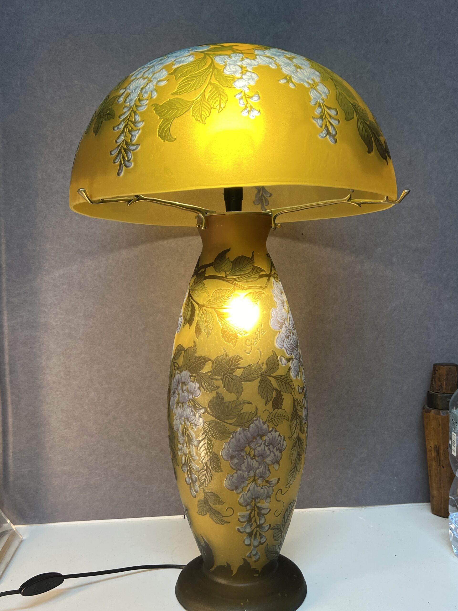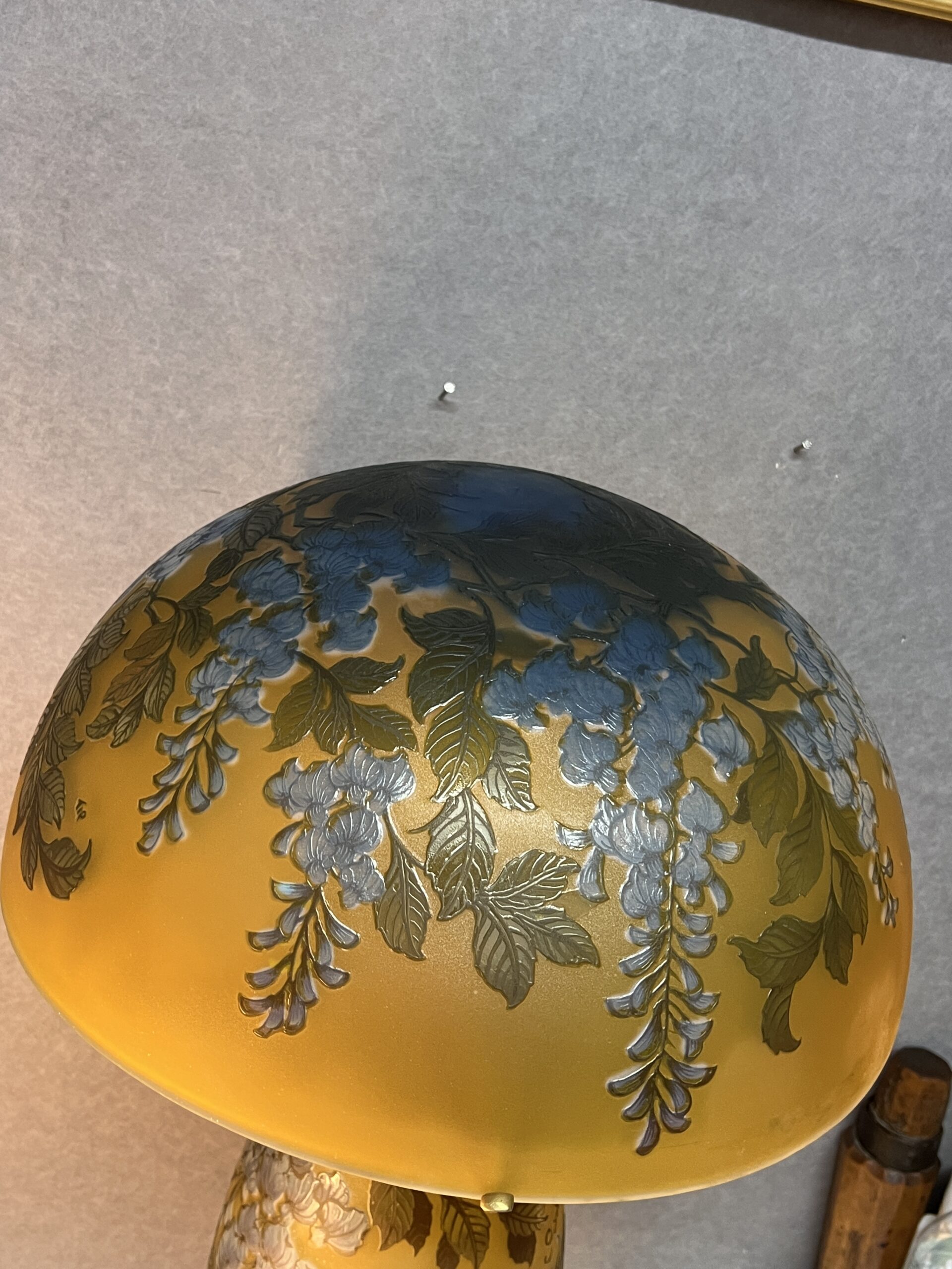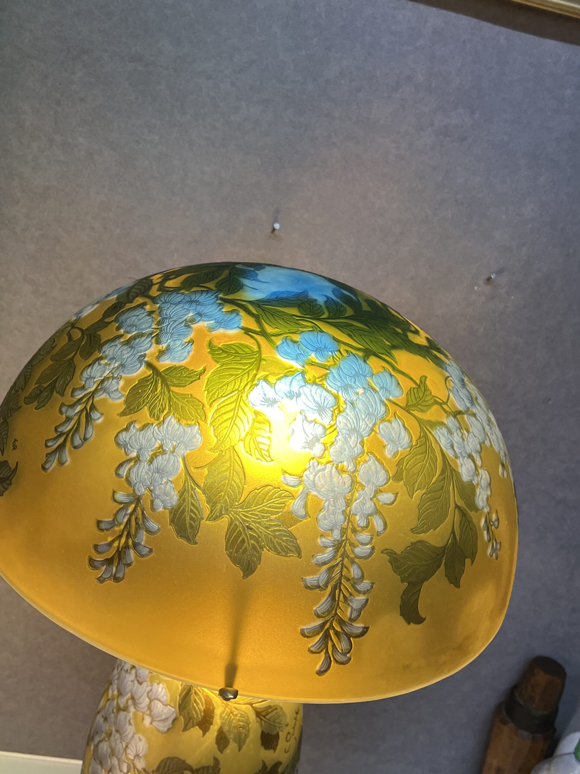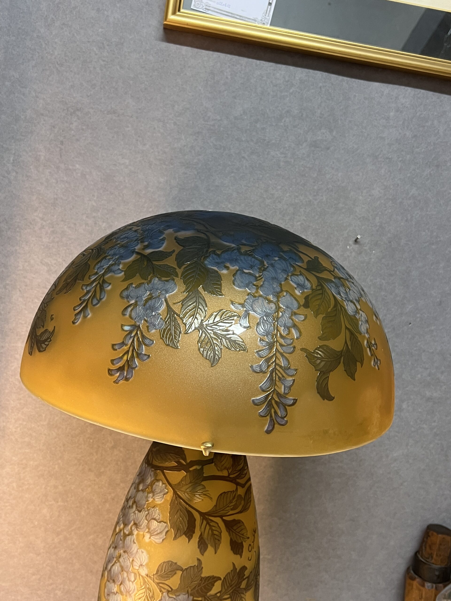 Important lampe champignon à poser en pâte de verre multicouche à décor de glycine