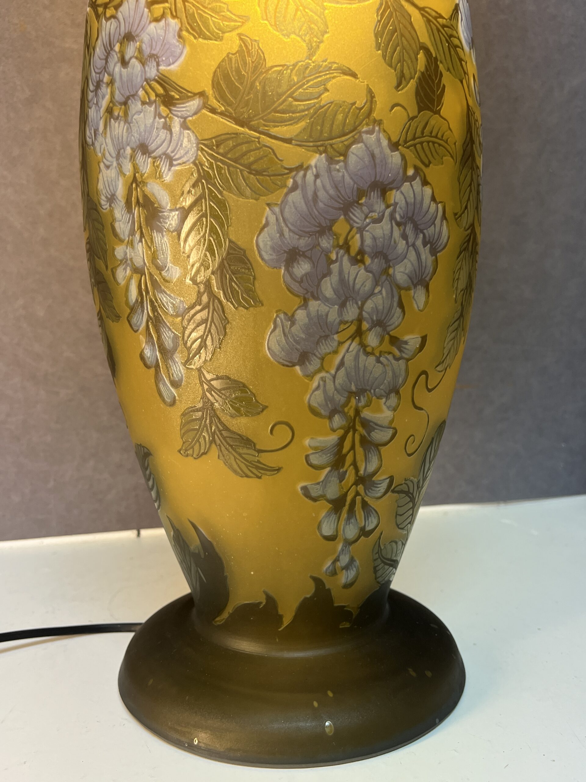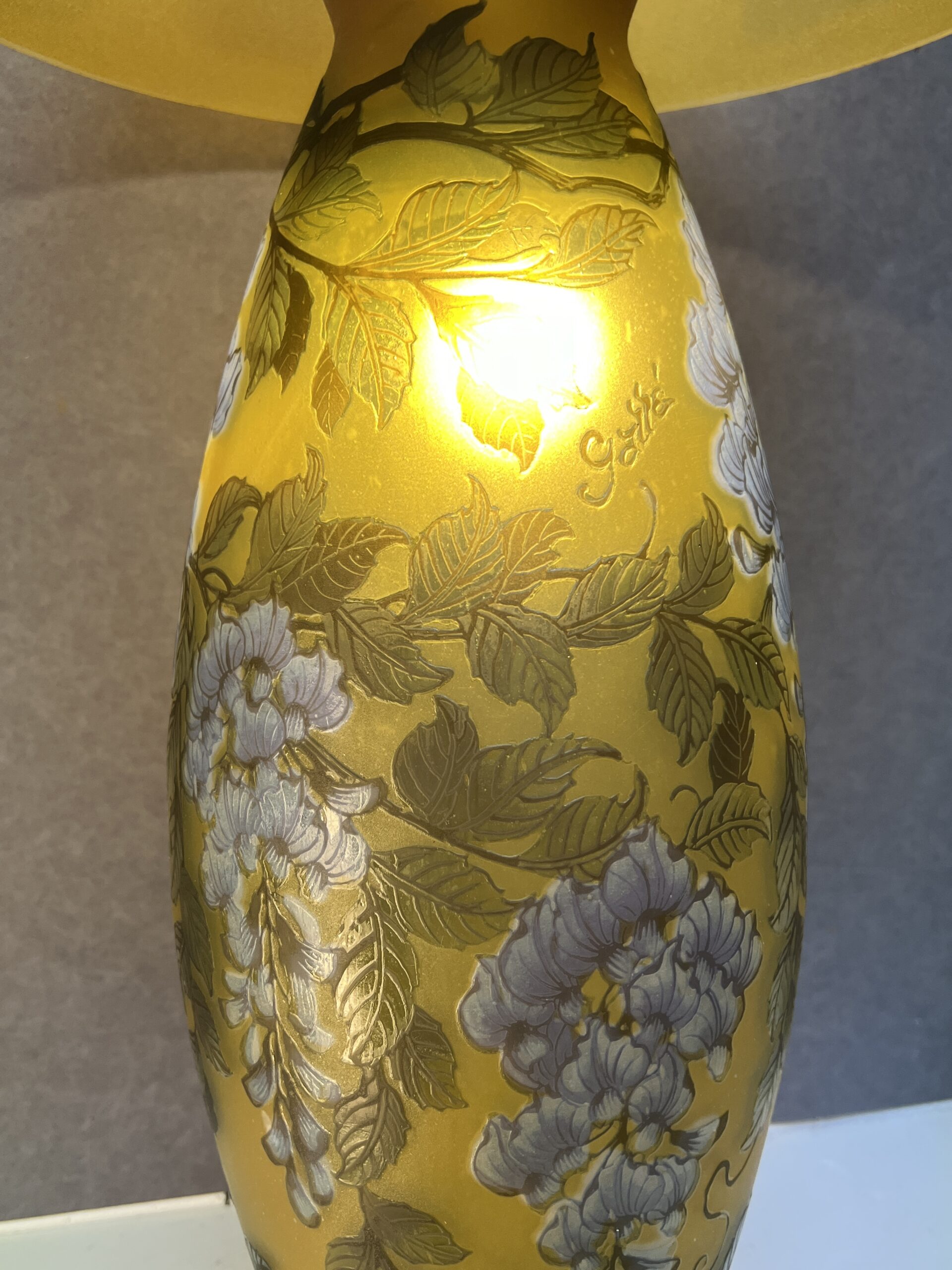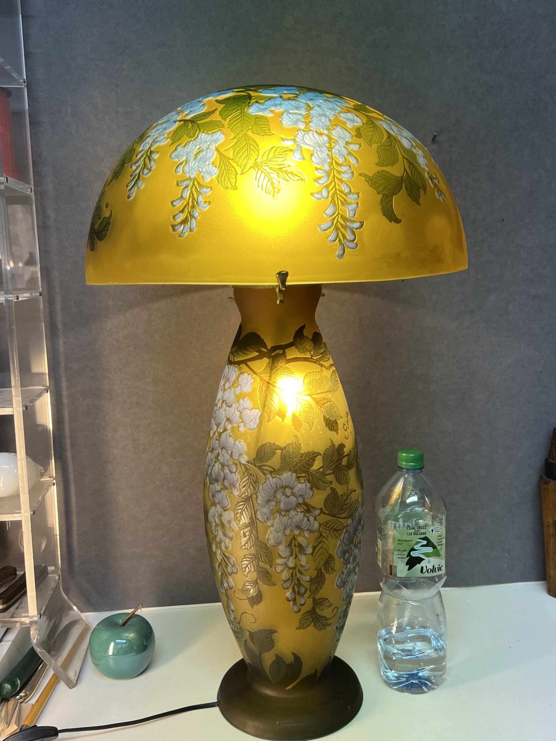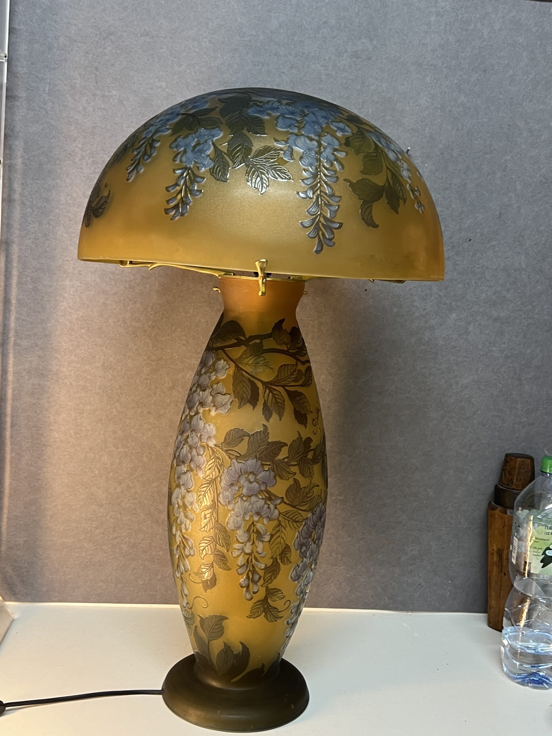 Important lampe champignon à poser en pâte de verre multicouche à décor de glycine