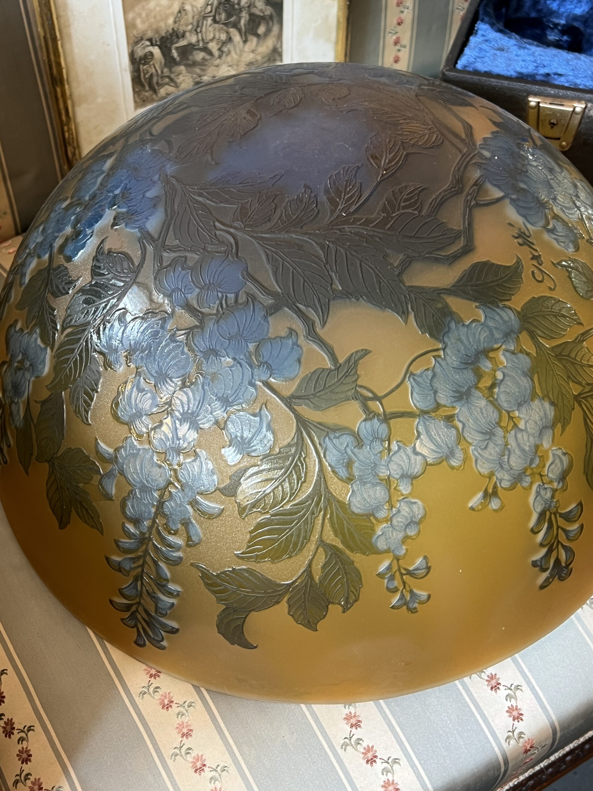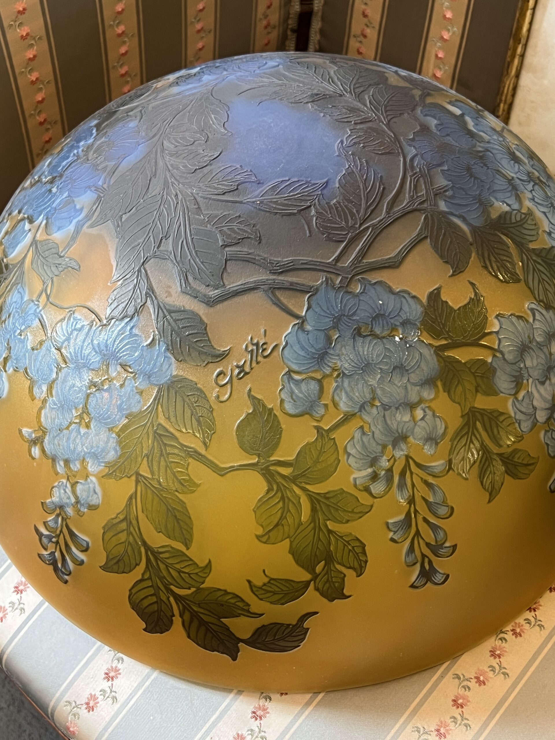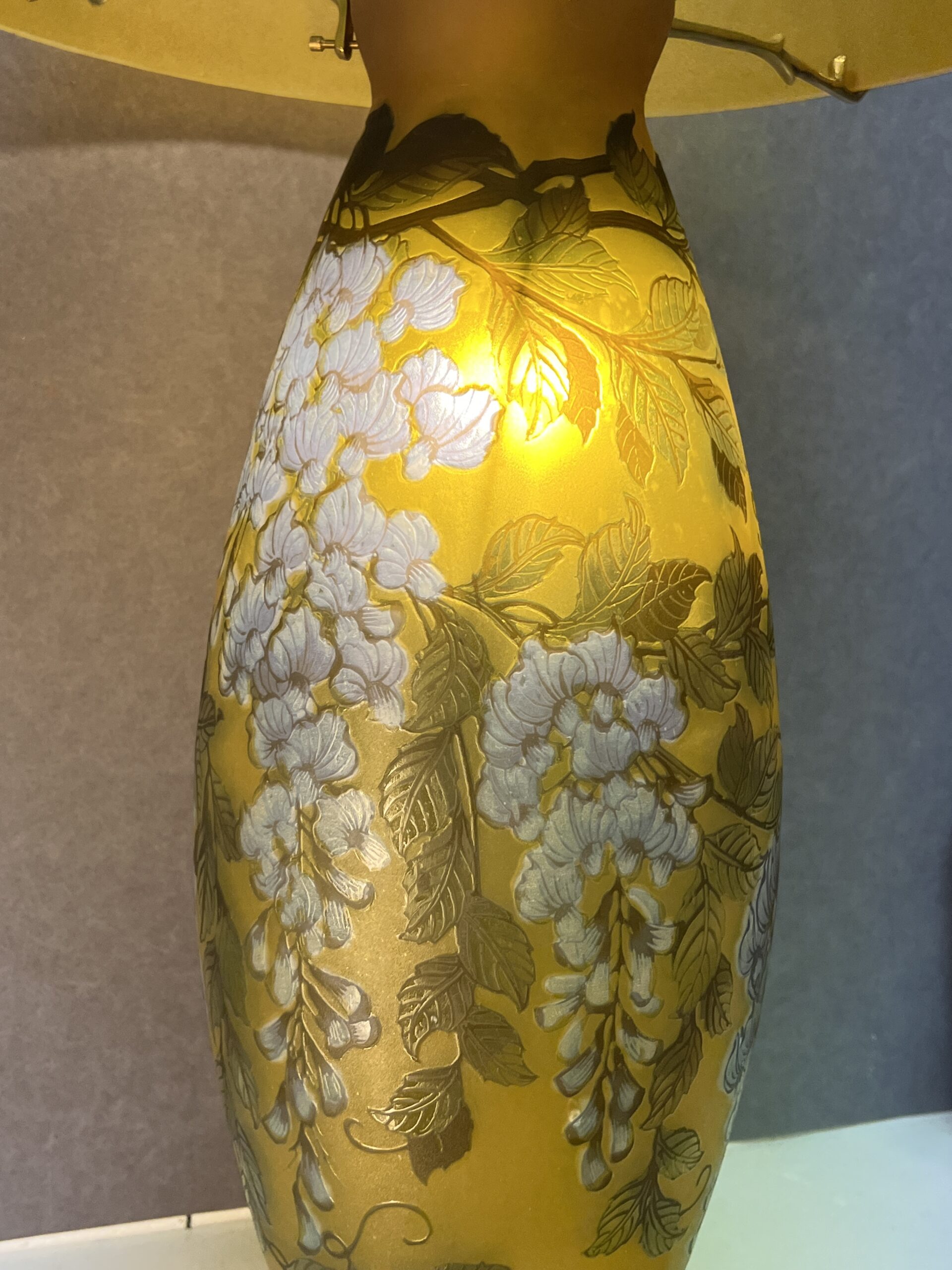 Ce qui distingue cette lampe, c’est son caractère exceptionnel, façonné par des mains expertes et imprégné d’une sensibilité artistique unique. Son décor de glycines, réalisé en multicouche et en pâte de verre, est une véritable œuvre d’art en soi. Chaque détail est méticuleusement travaillé pour capturer la beauté délicate de ces fleurs grimpantes, offrant une profondeur visuelle et une richesse de nuances qui évoquent la sensation de se promener dans un jardin en fleurs.