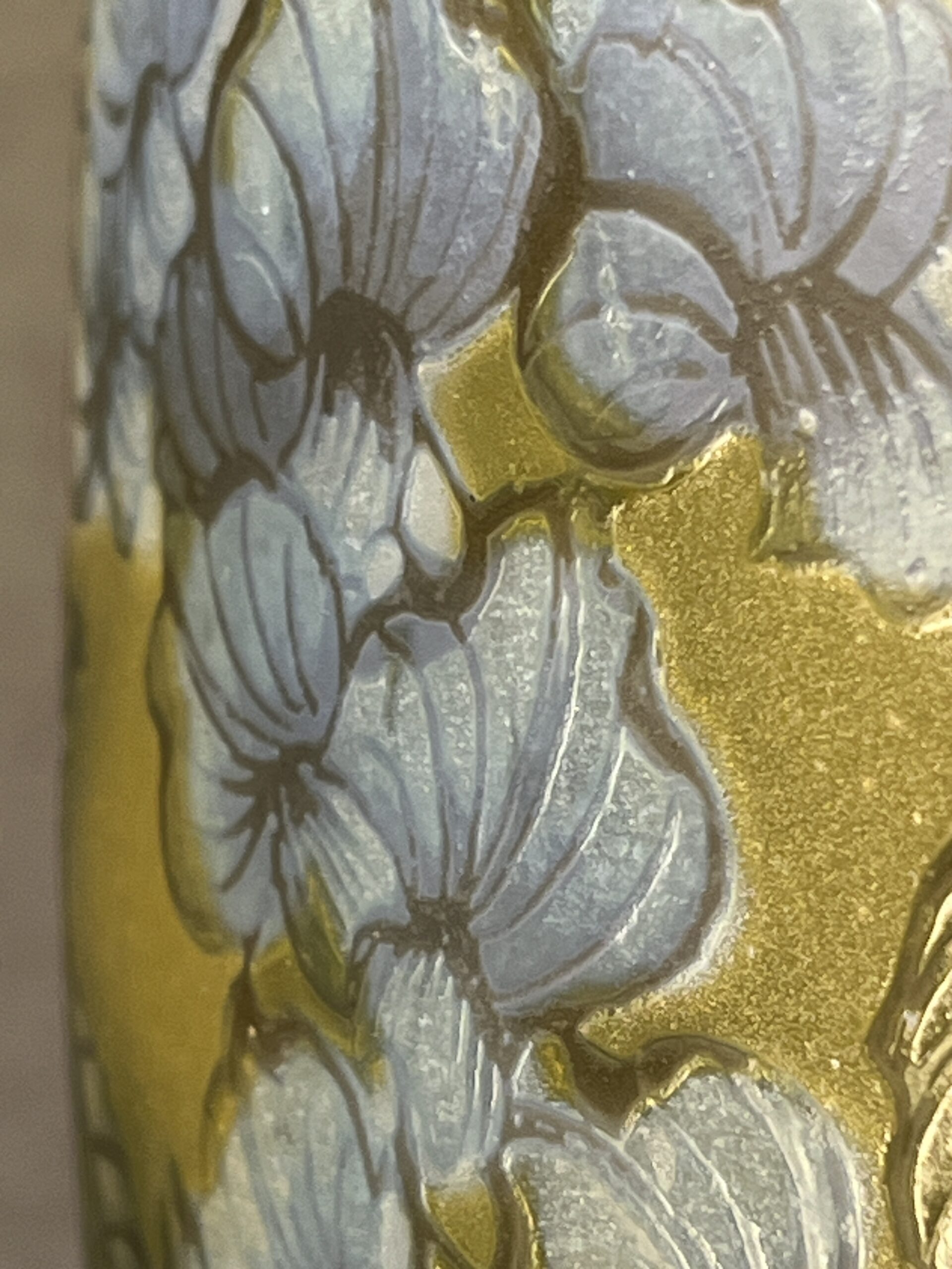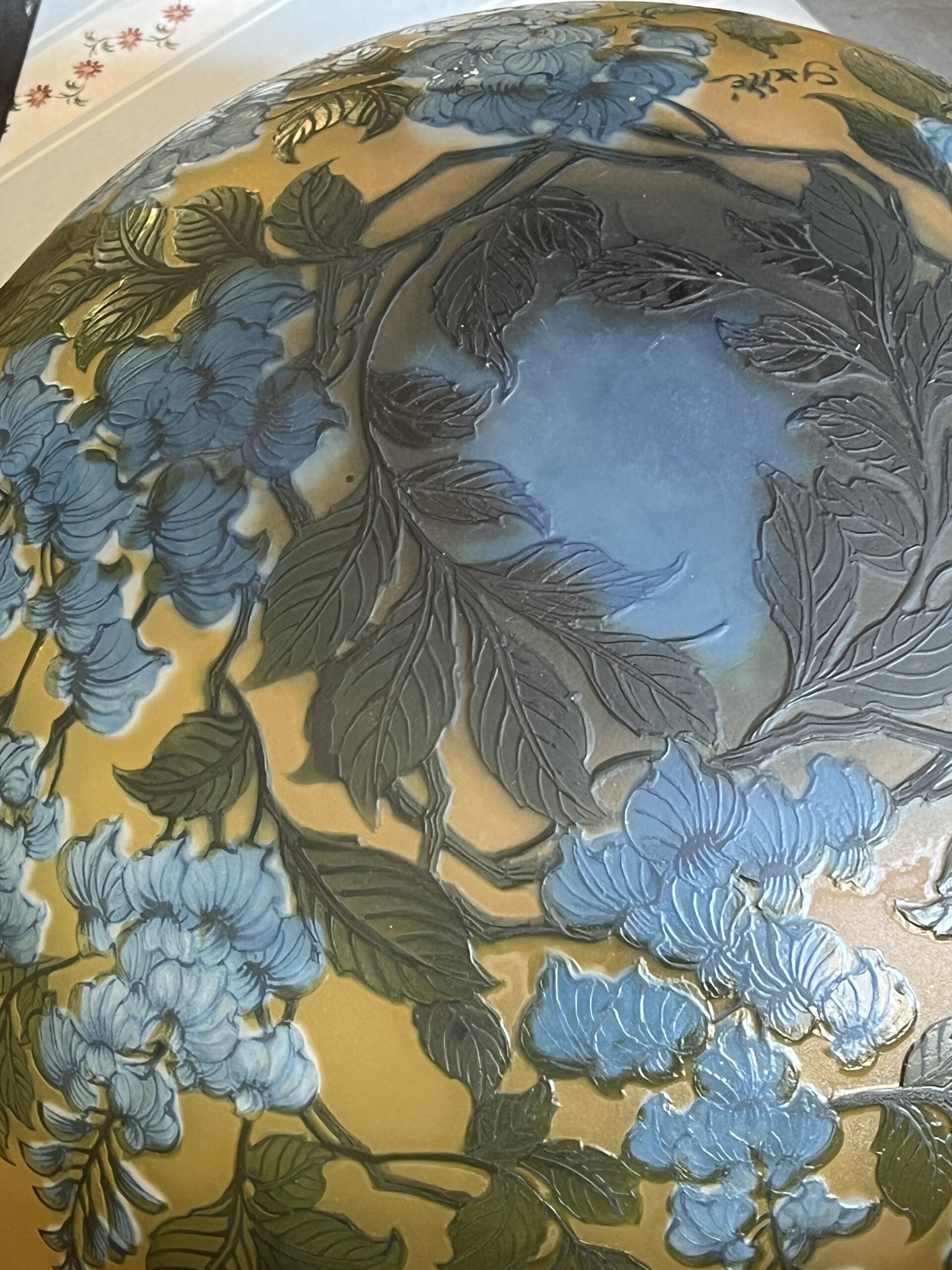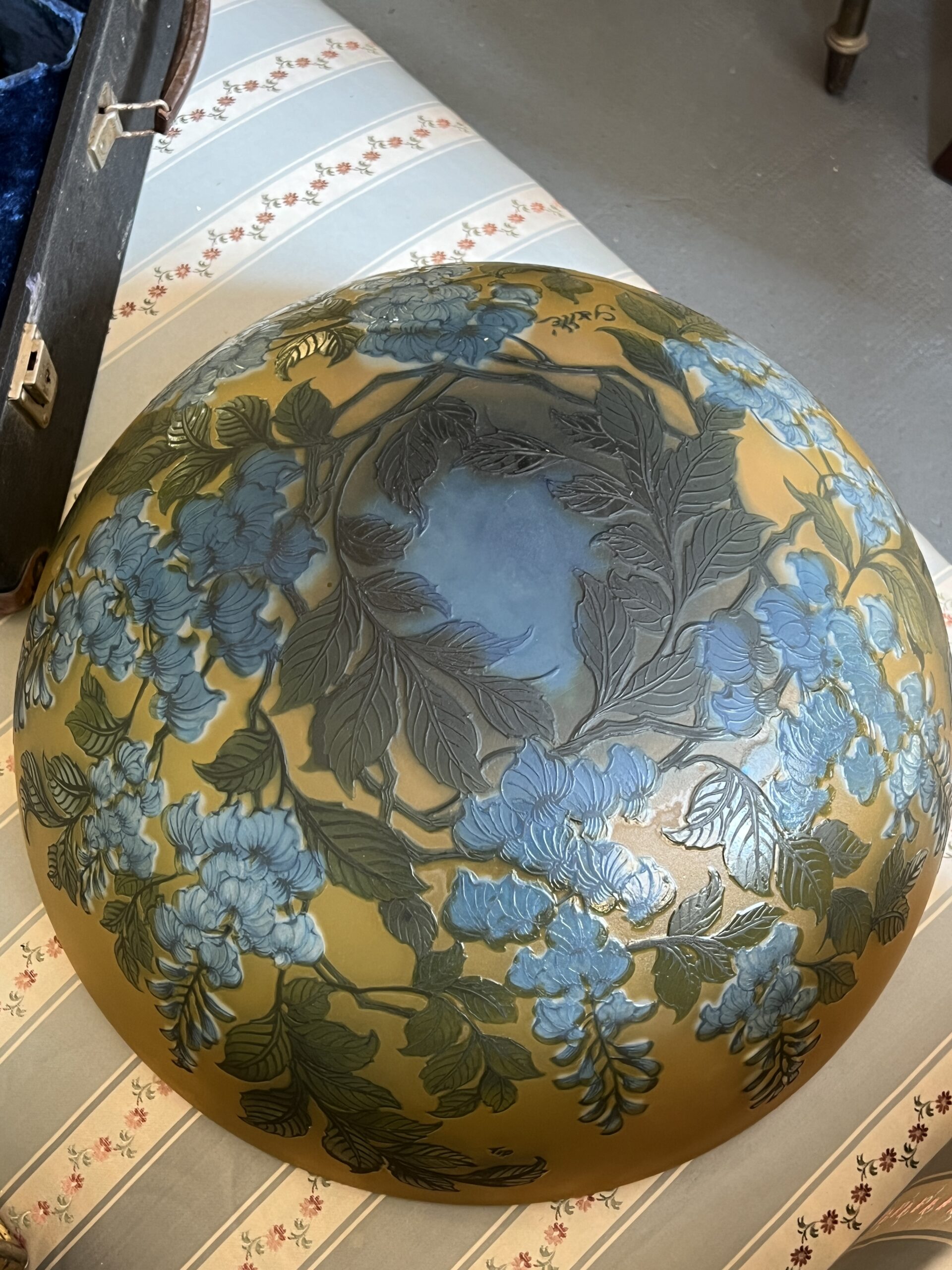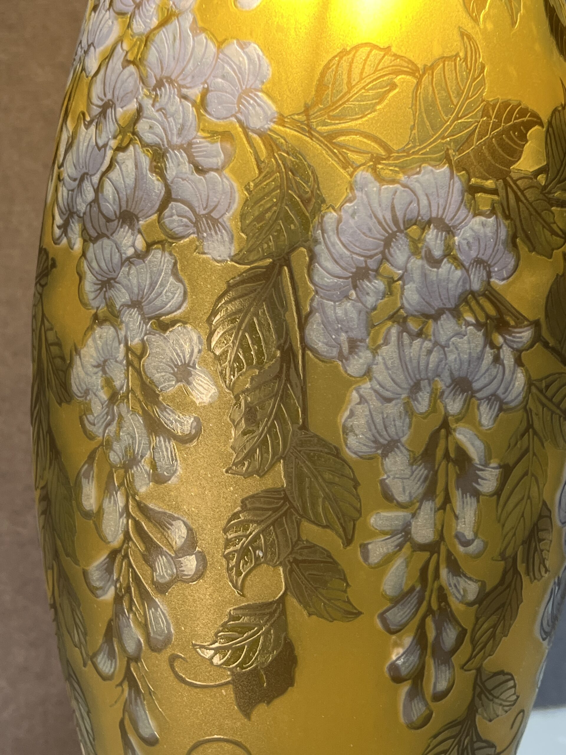 Ce qui distingue cette lampe, c’est son caractère exceptionnel, façonné par des mains expertes et imprégné d’une sensibilité artistique unique. Son décor de glycines, réalisé en multicouche et en pâte de verre, est une véritable œuvre d’art en soi. Chaque détail est méticuleusement travaillé pour capturer la beauté délicate de ces fleurs grimpantes, offrant une profondeur visuelle et une richesse de nuances qui évoquent la sensation de se promener dans un jardin en fleurs.
