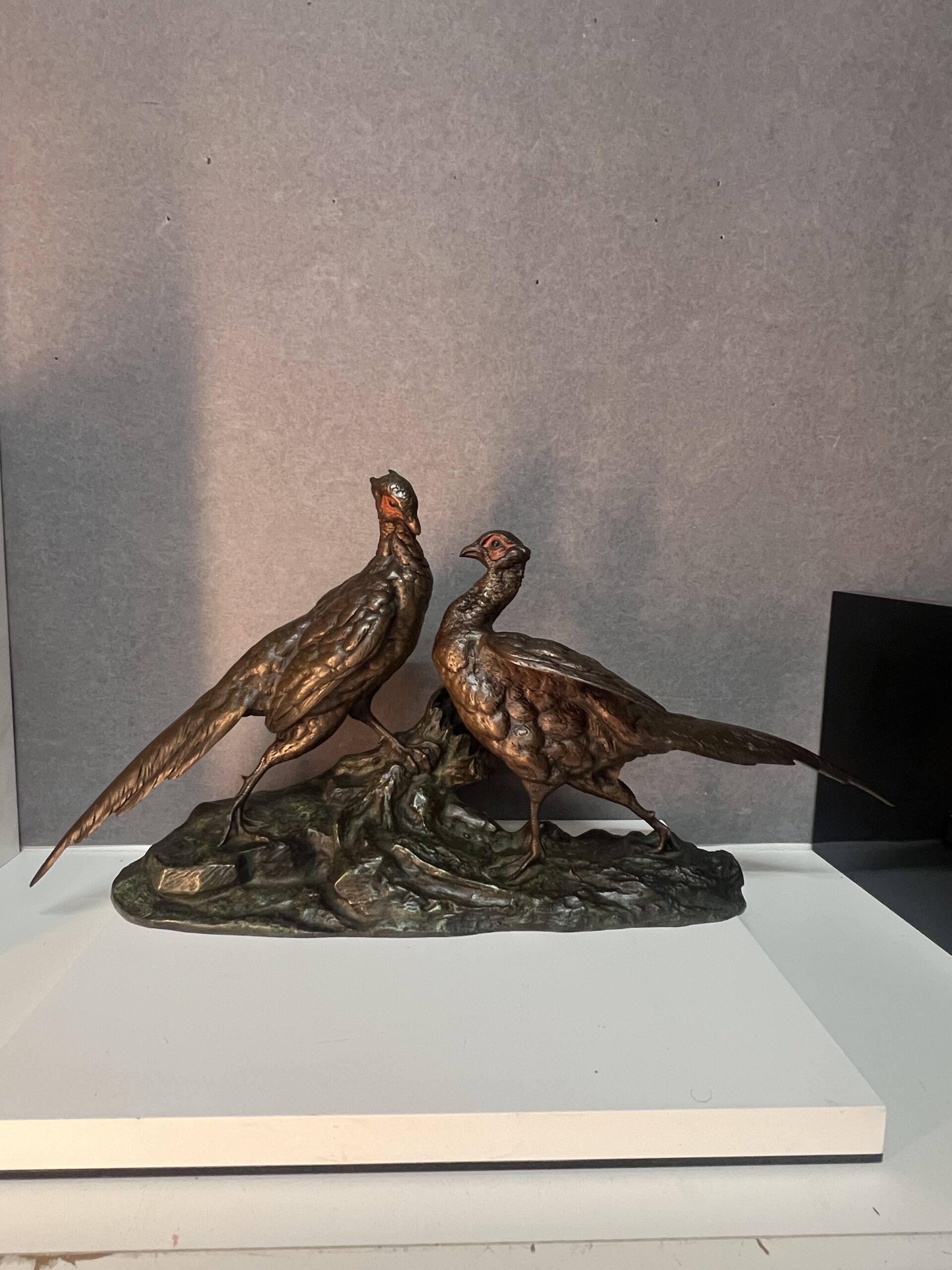 Il s’agit d’un rare groupe en bronze polychrome représentant un combat de faisans.