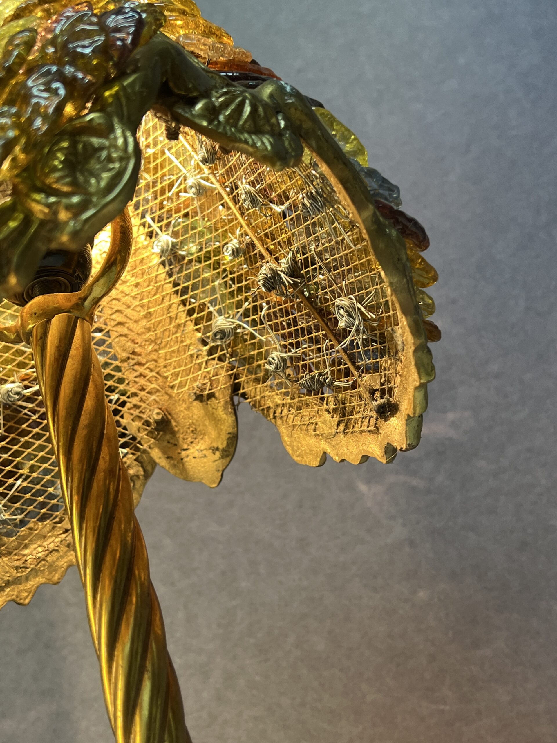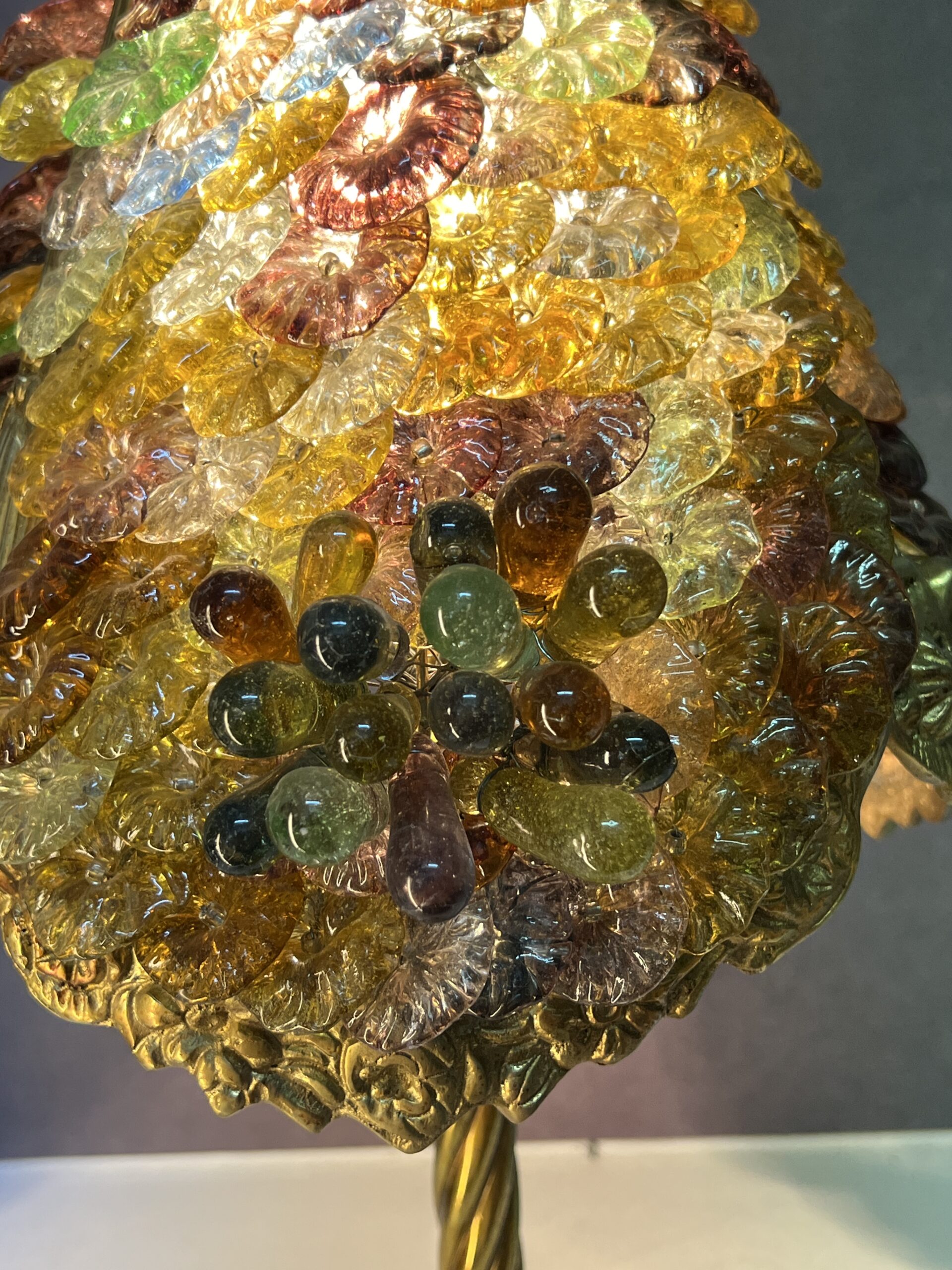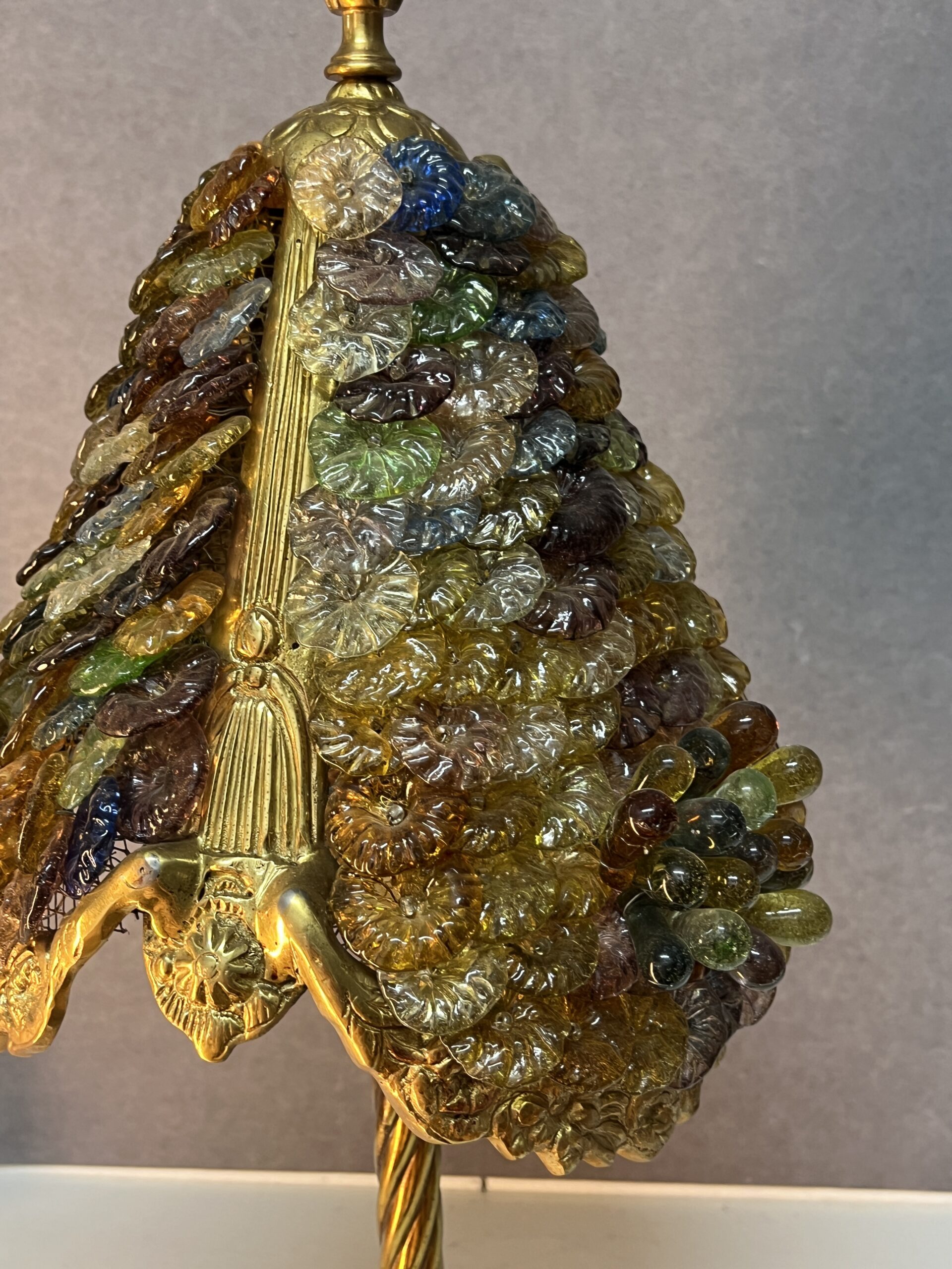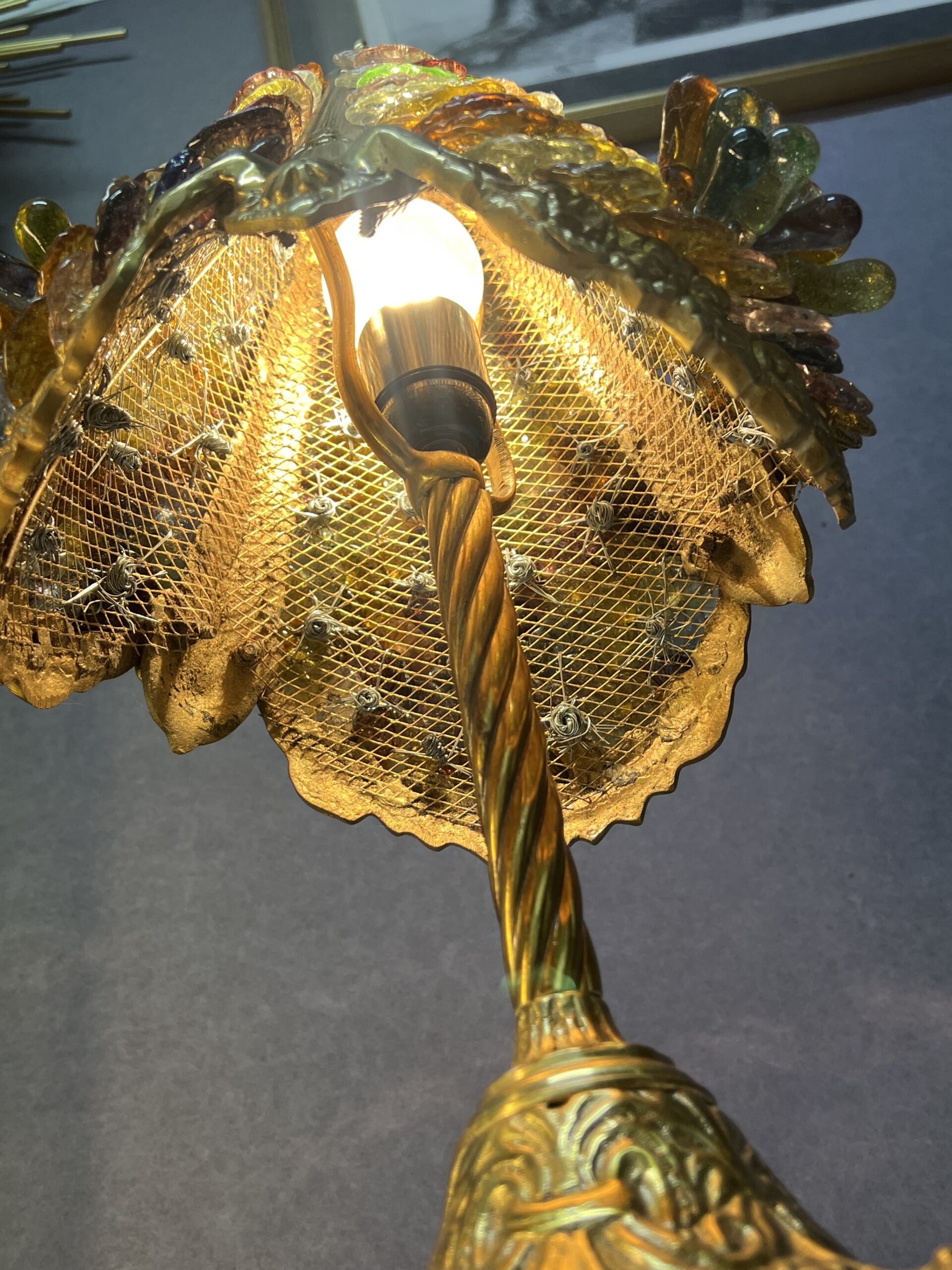 L’abat-jour de cette lampe à poser est une œuvre d’art en soi. Délicatement orné de motifs floraux et de grappes de raisins en pâte de verre, dans une teinte mordorée subtile, il diffuse une lumière chaleureuse et tamisée, créant une atmosphère enchanteresse dans n’importe quelle pièce. La combinaison de la luminosité dorée du bronze et de la teinte riche et profonde de l’abat-jour crée un jeu subtil de lumière et d’ombre, ajoutant une dimension supplémentaire à son charme visuel.