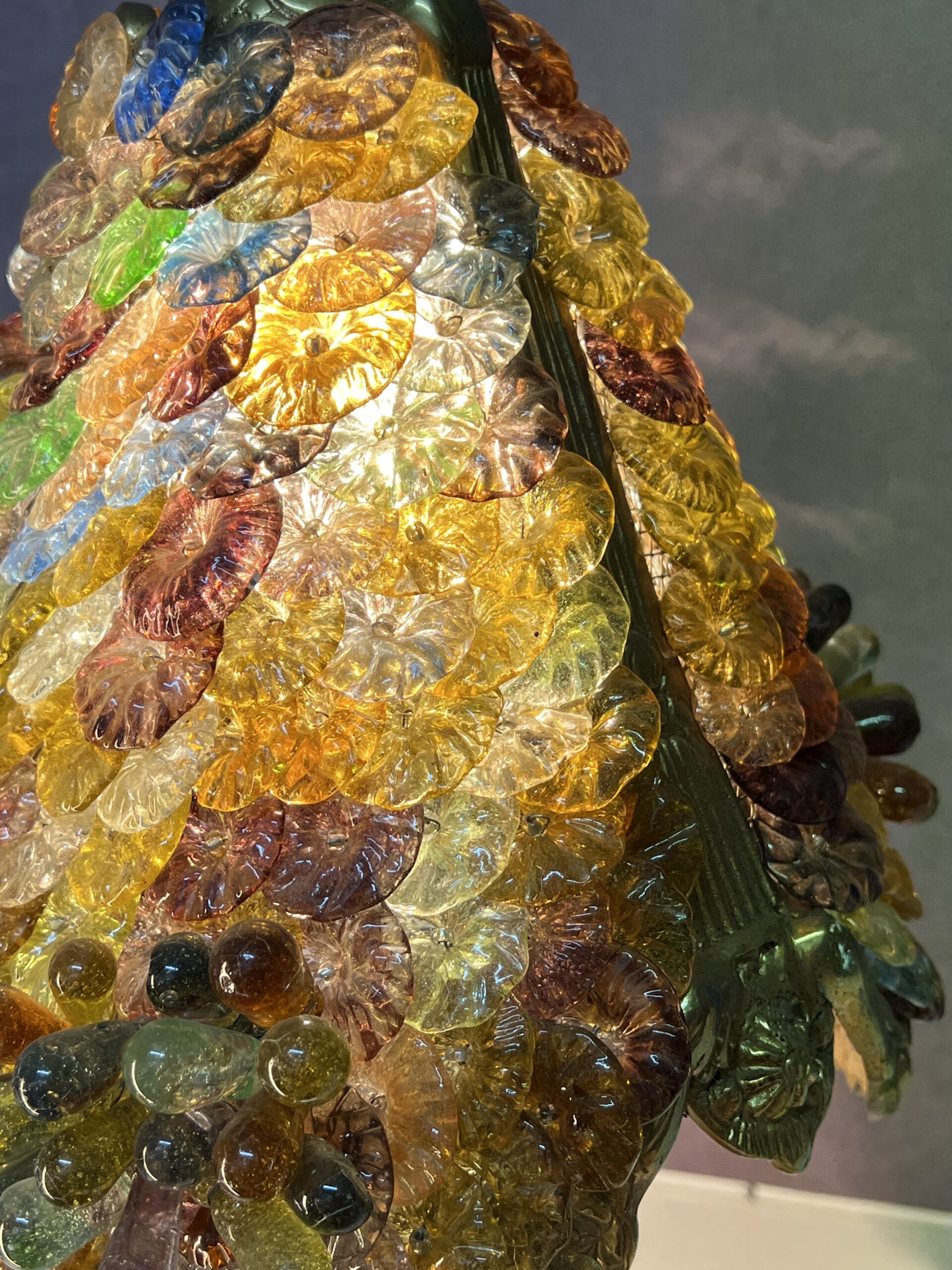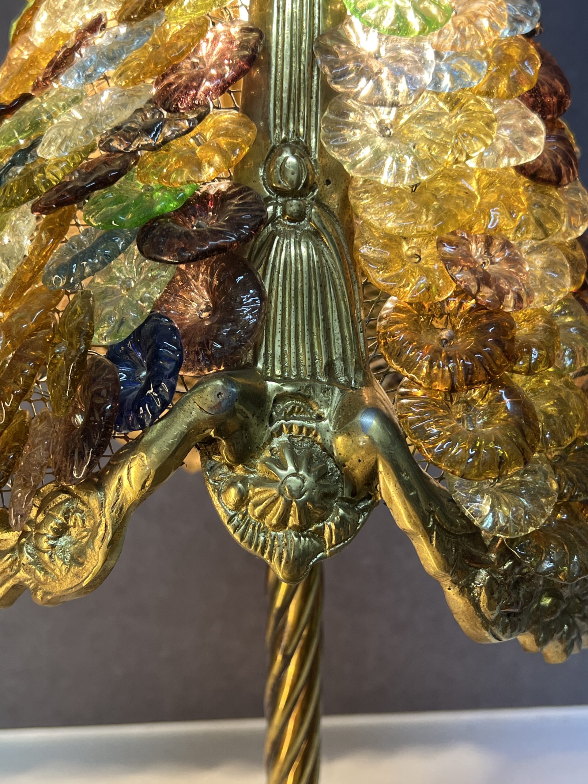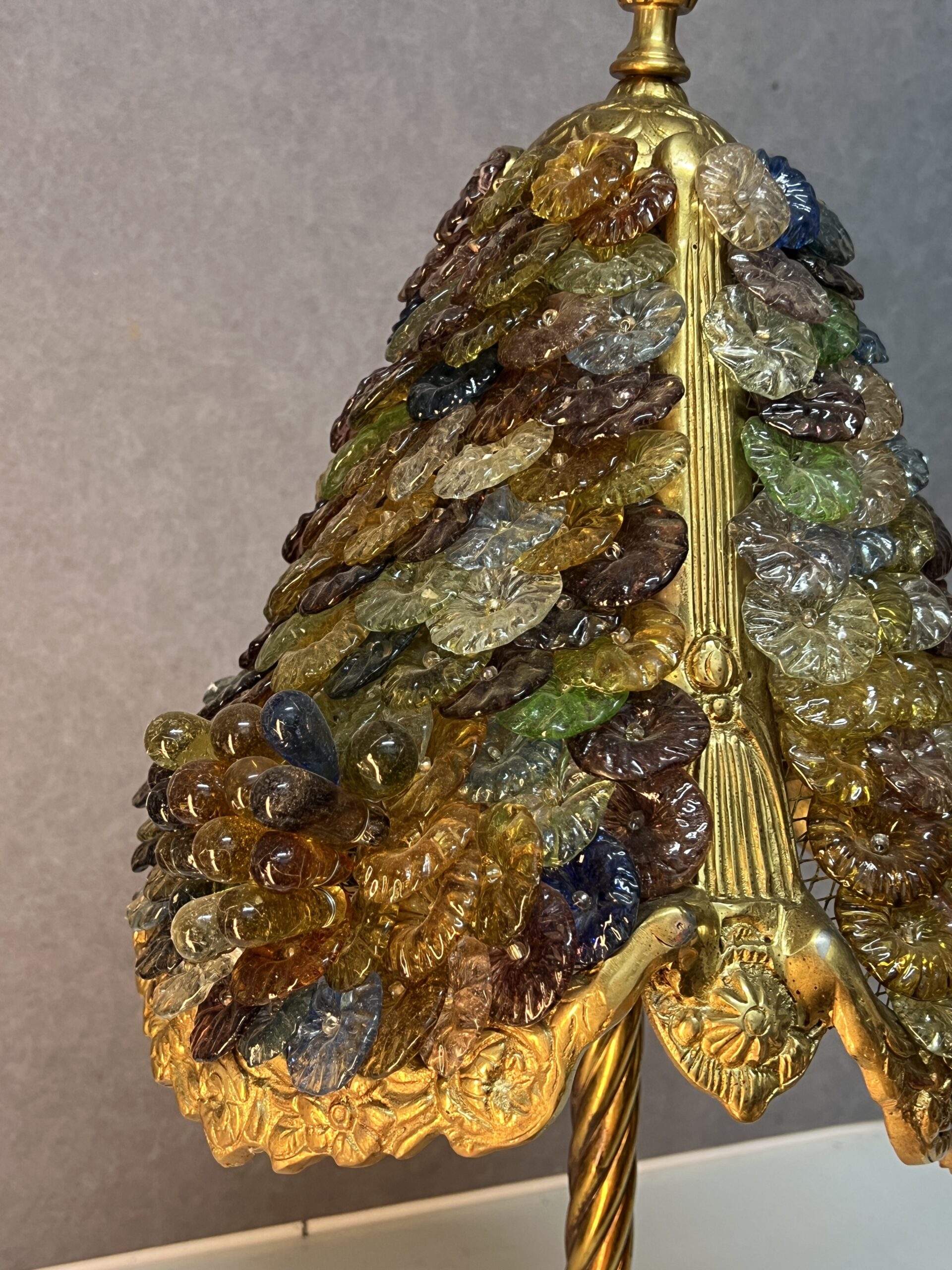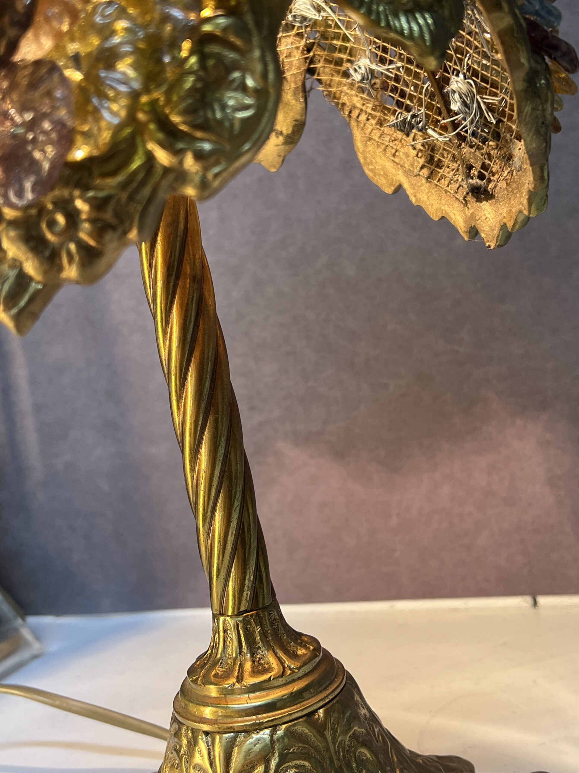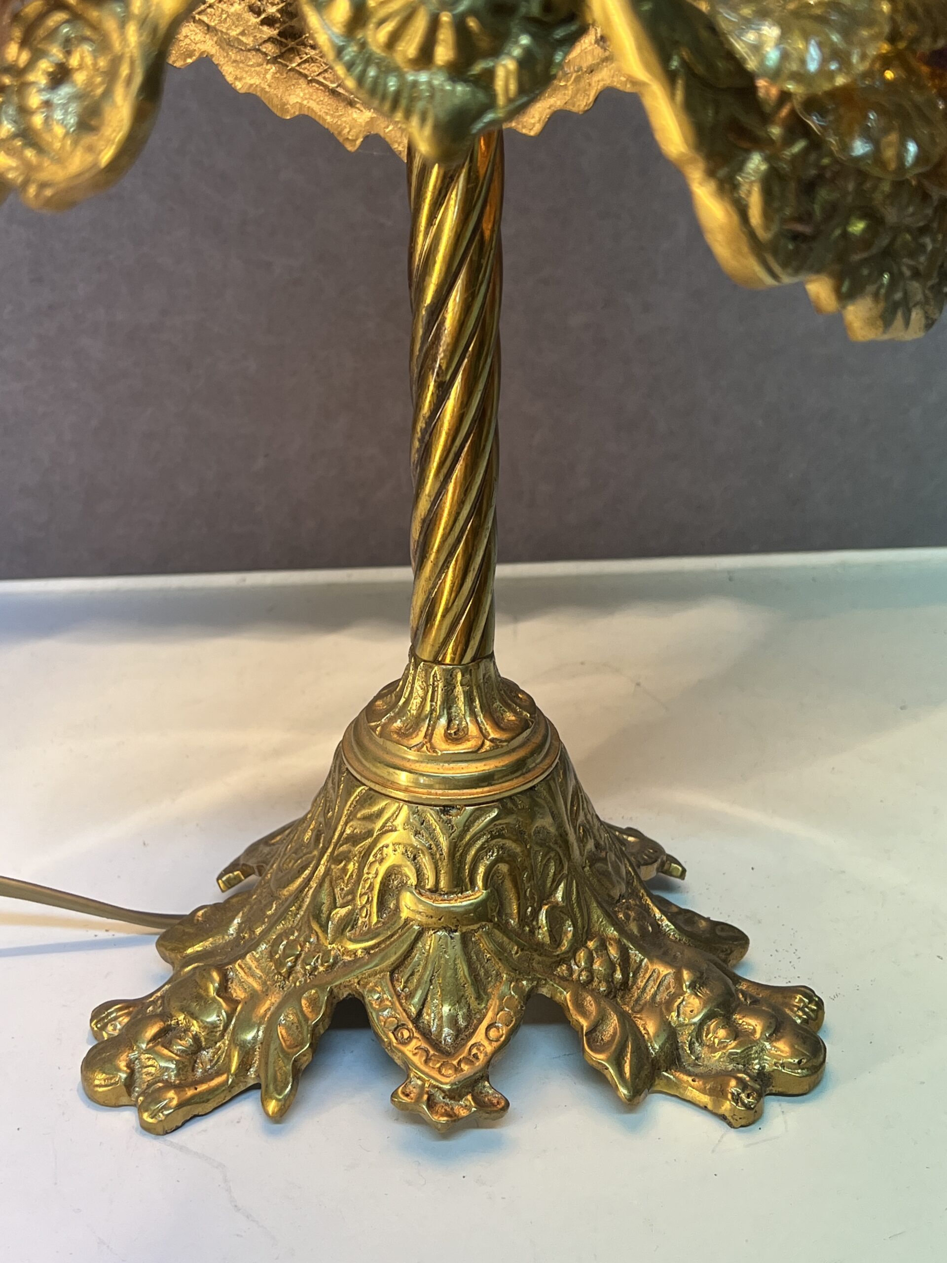 L’abat-jour de cette lampe à poser est une œuvre d’art en soi. Délicatement orné de motifs floraux et de grappes de raisins en pâte de verre, dans une teinte mordorée subtile, il diffuse une lumière chaleureuse et tamisée, créant une atmosphère enchanteresse dans n’importe quelle pièce. La combinaison de la luminosité dorée du bronze et de la teinte riche et profonde de l’abat-jour crée un jeu subtil de lumière et d’ombre, ajoutant une dimension supplémentaire à son charme visuel.