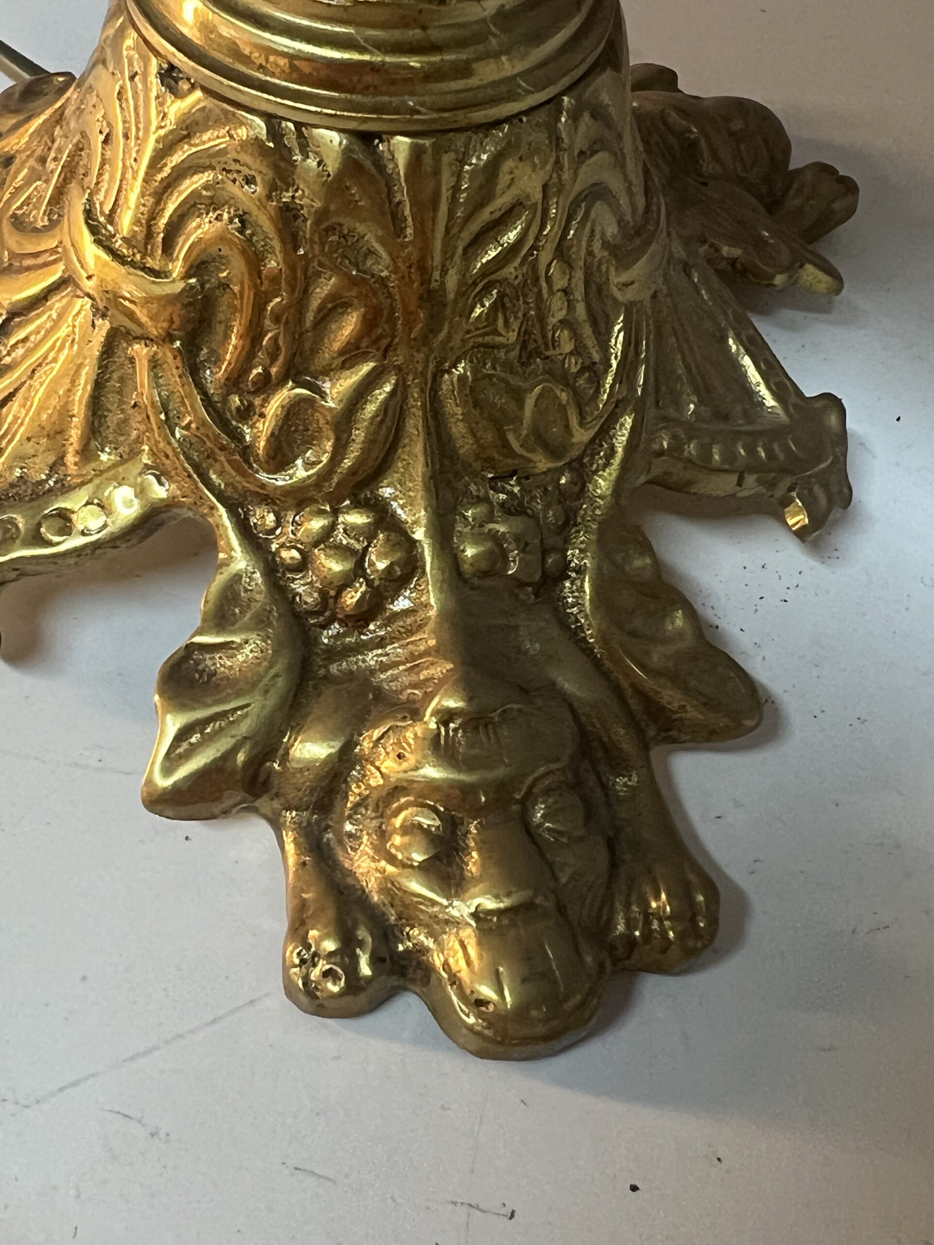 L’élément le plus remarquable de cette lampe réside dans sa base tripode, où chaque jambe est finement sculptée pour représenter une tête de lion majestueuse. Ces détails exquis ajoutent une dimension de caractère et de puissance à l’esthétique globale de la lampe, capturant l’attention et suscitant l’admiration à chaque regard.