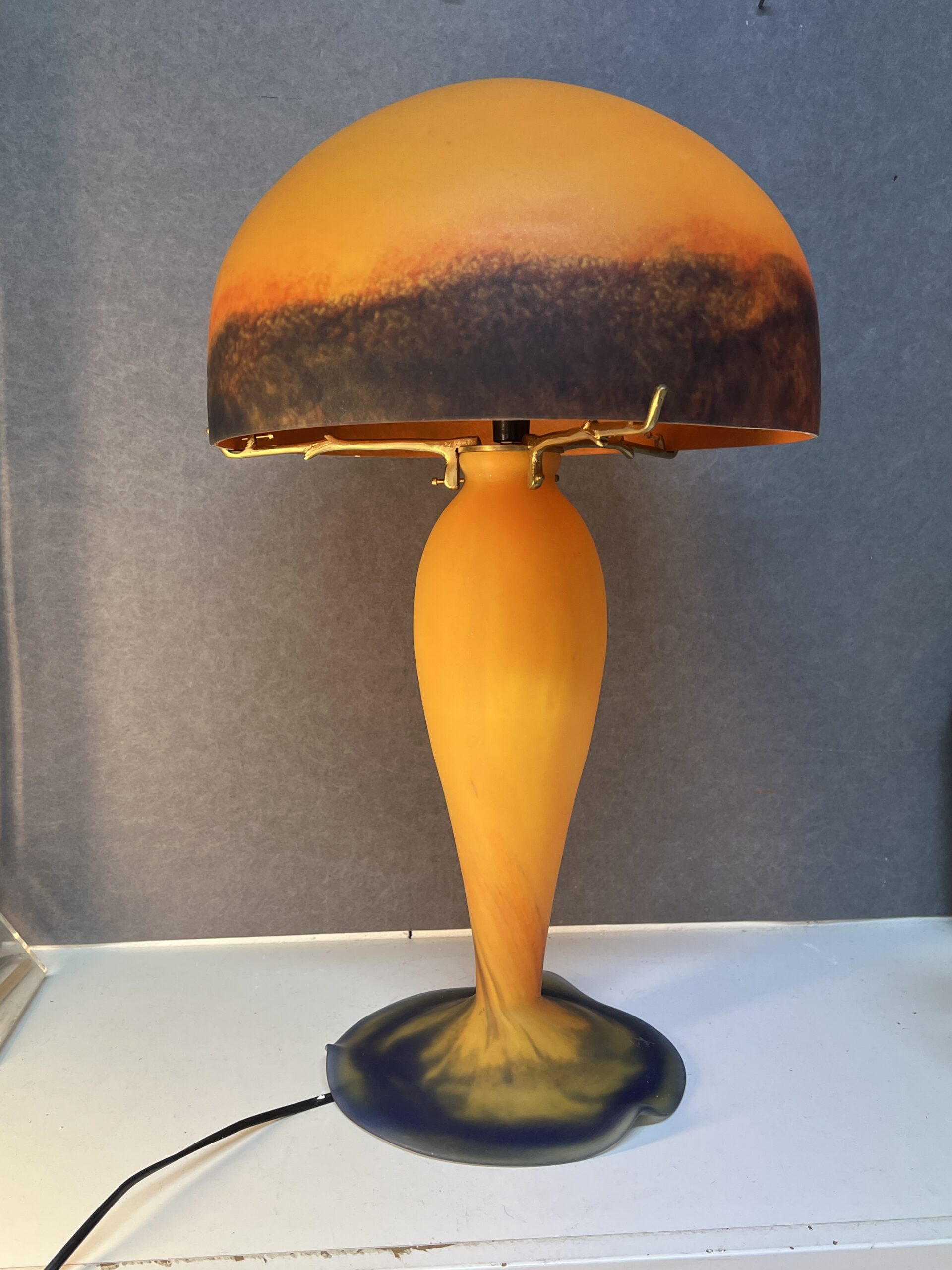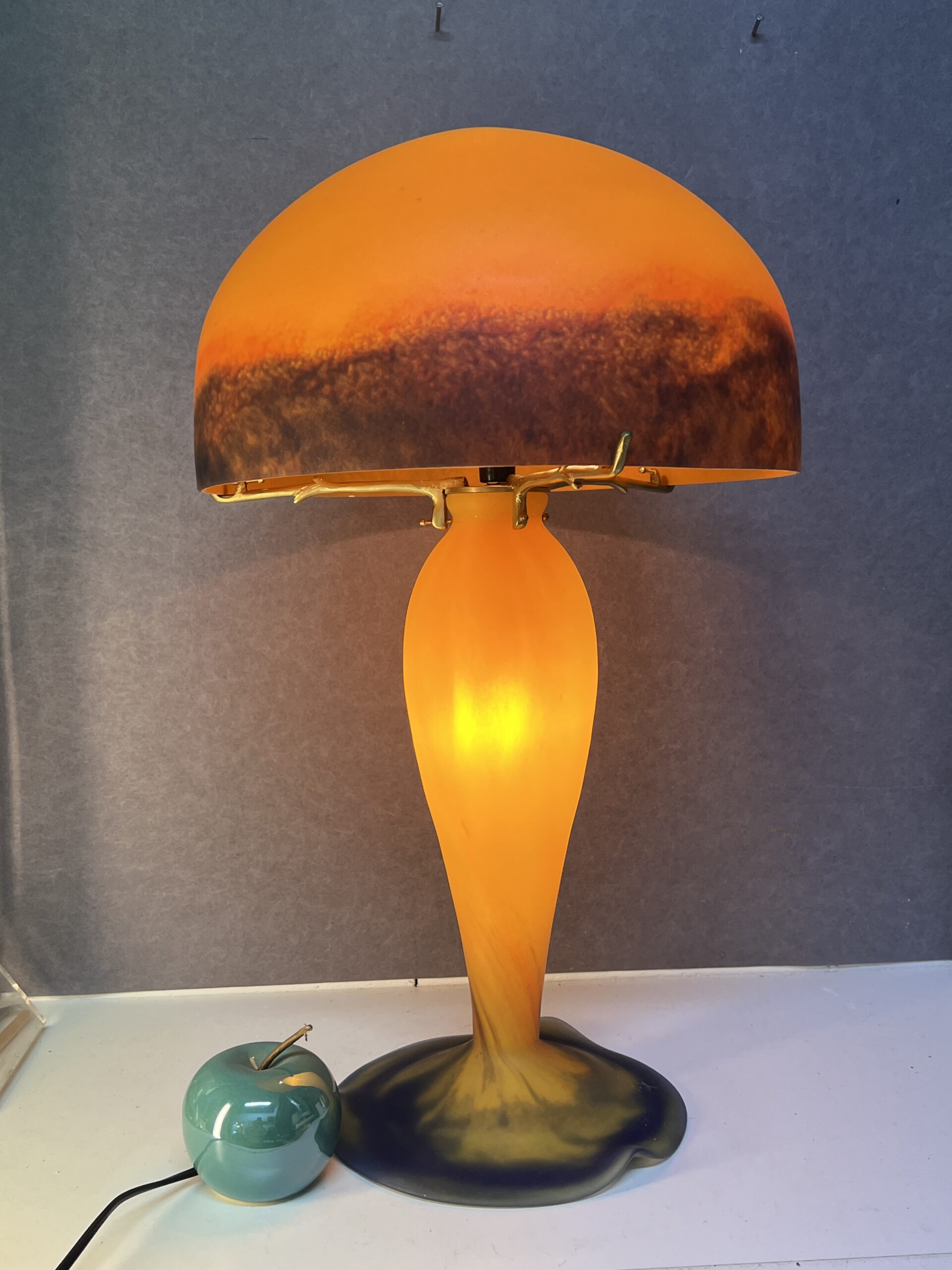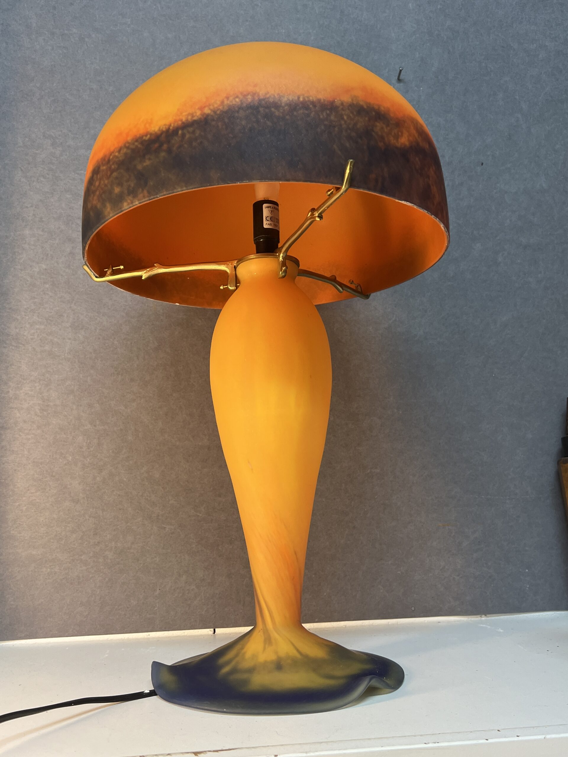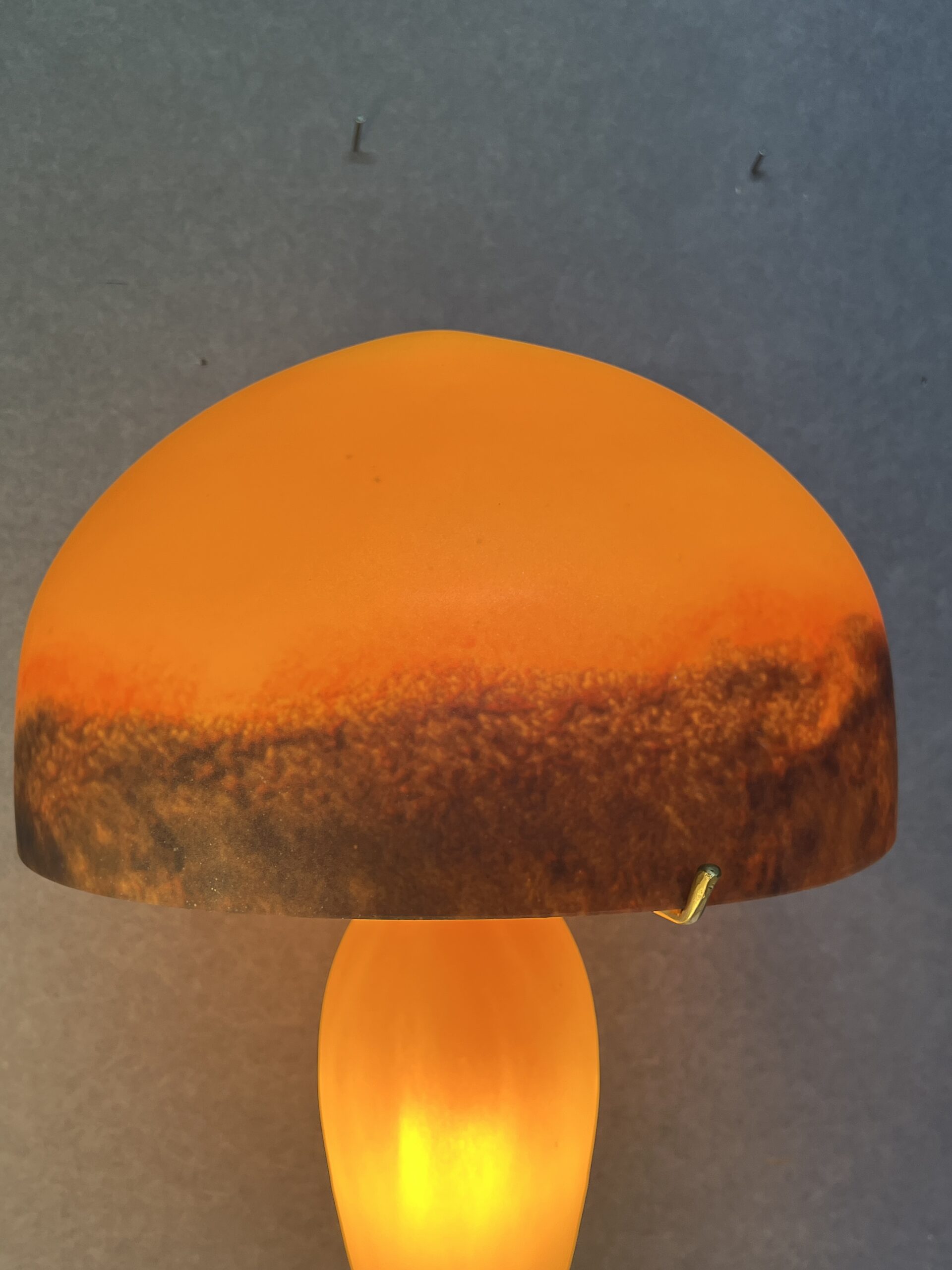 Lampe champignon en pâte de verre signé Tief, sur fond orange nuancé de bleu, Hauteur 60 cm