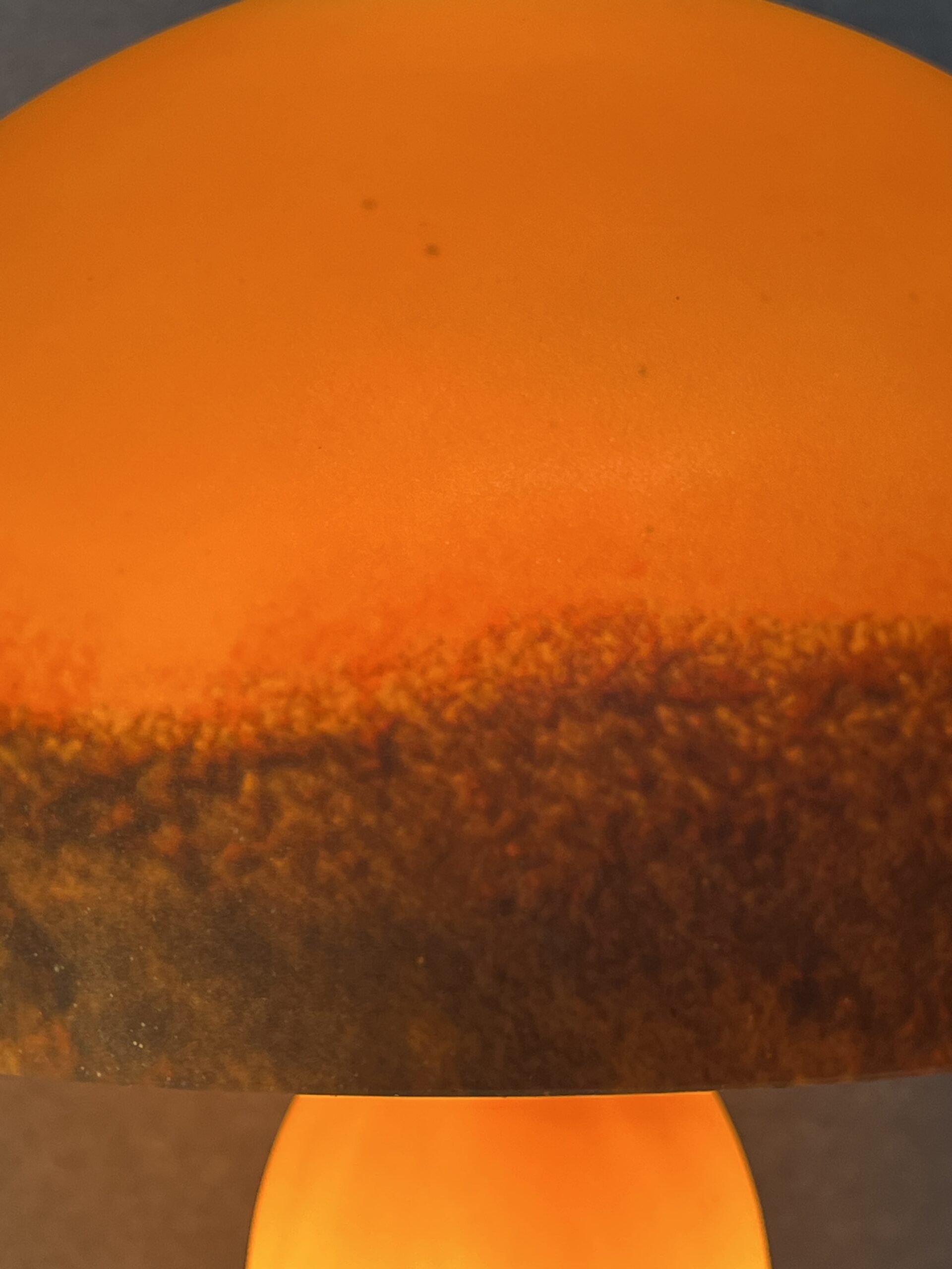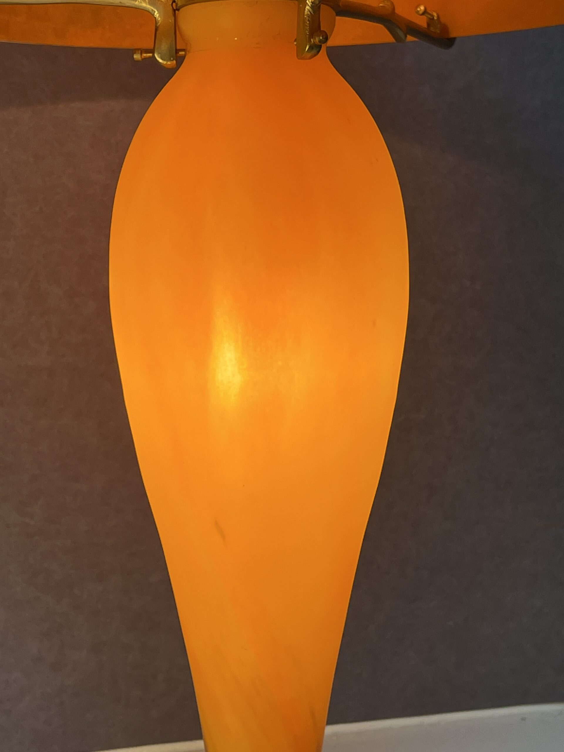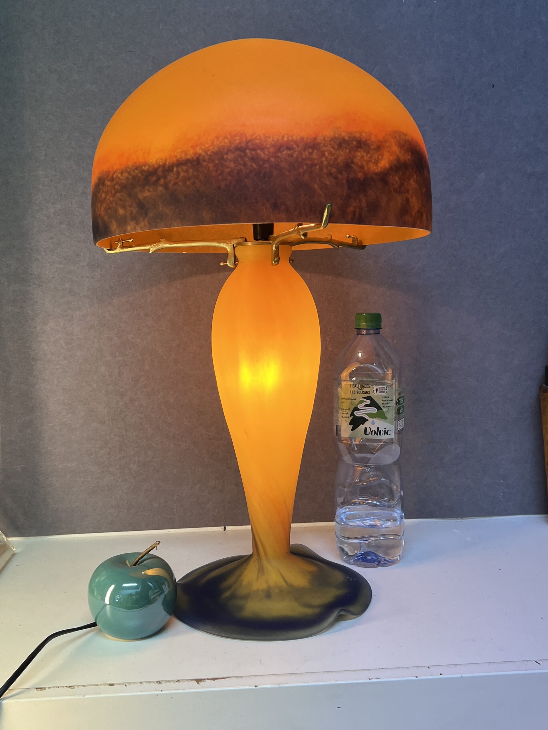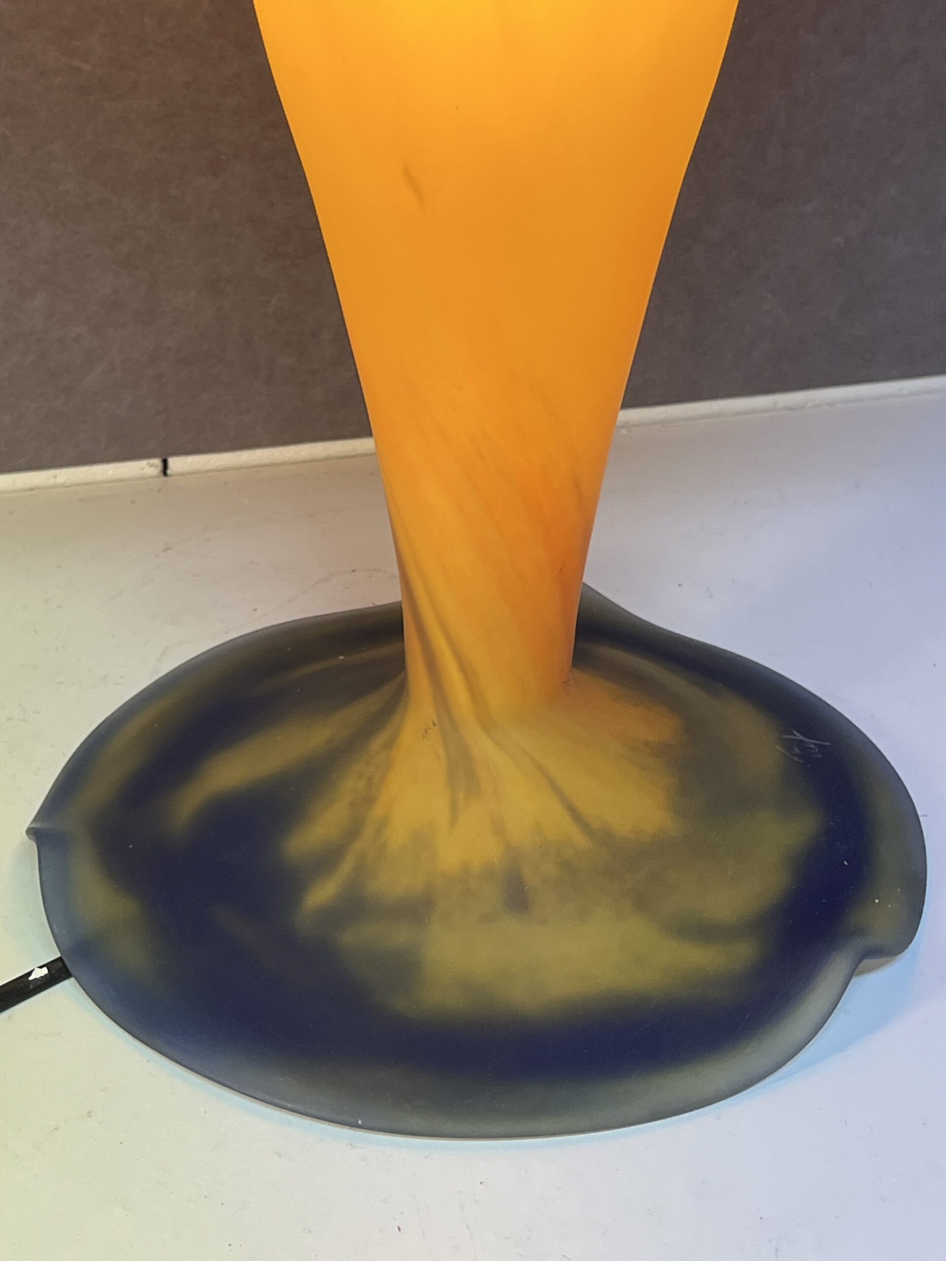 Lampe champignon en pâte de verre signé Tief, sur fond orange nuancé de bleu, Hauteur 60 cm