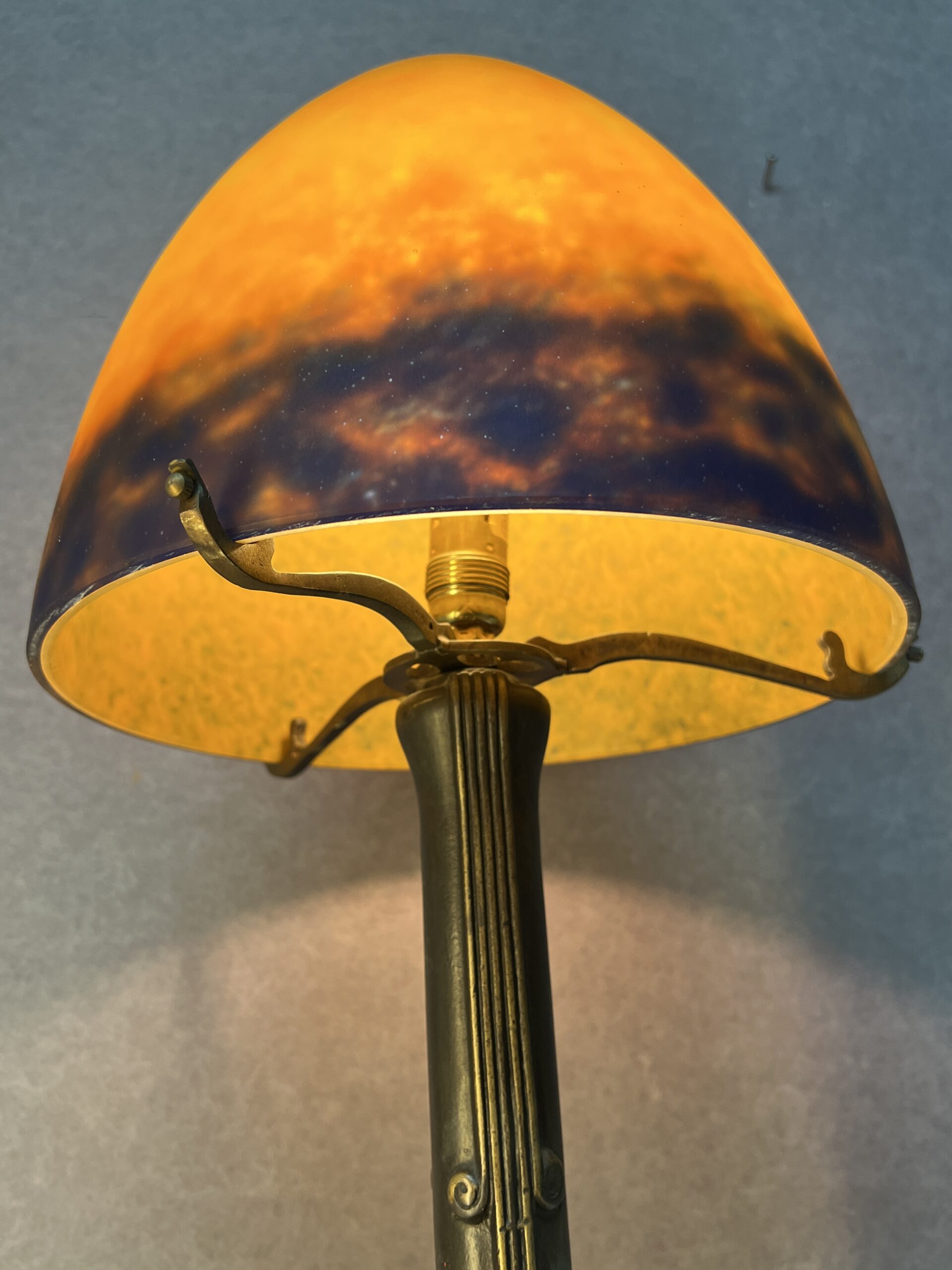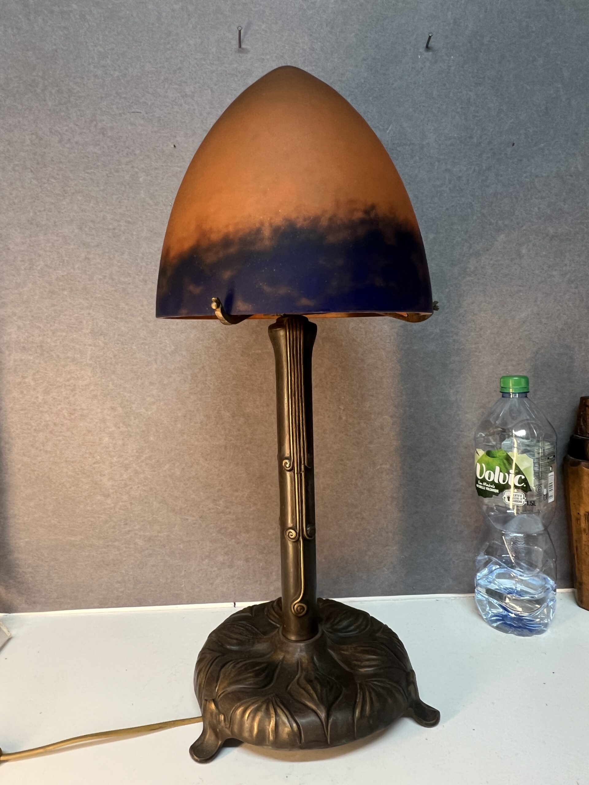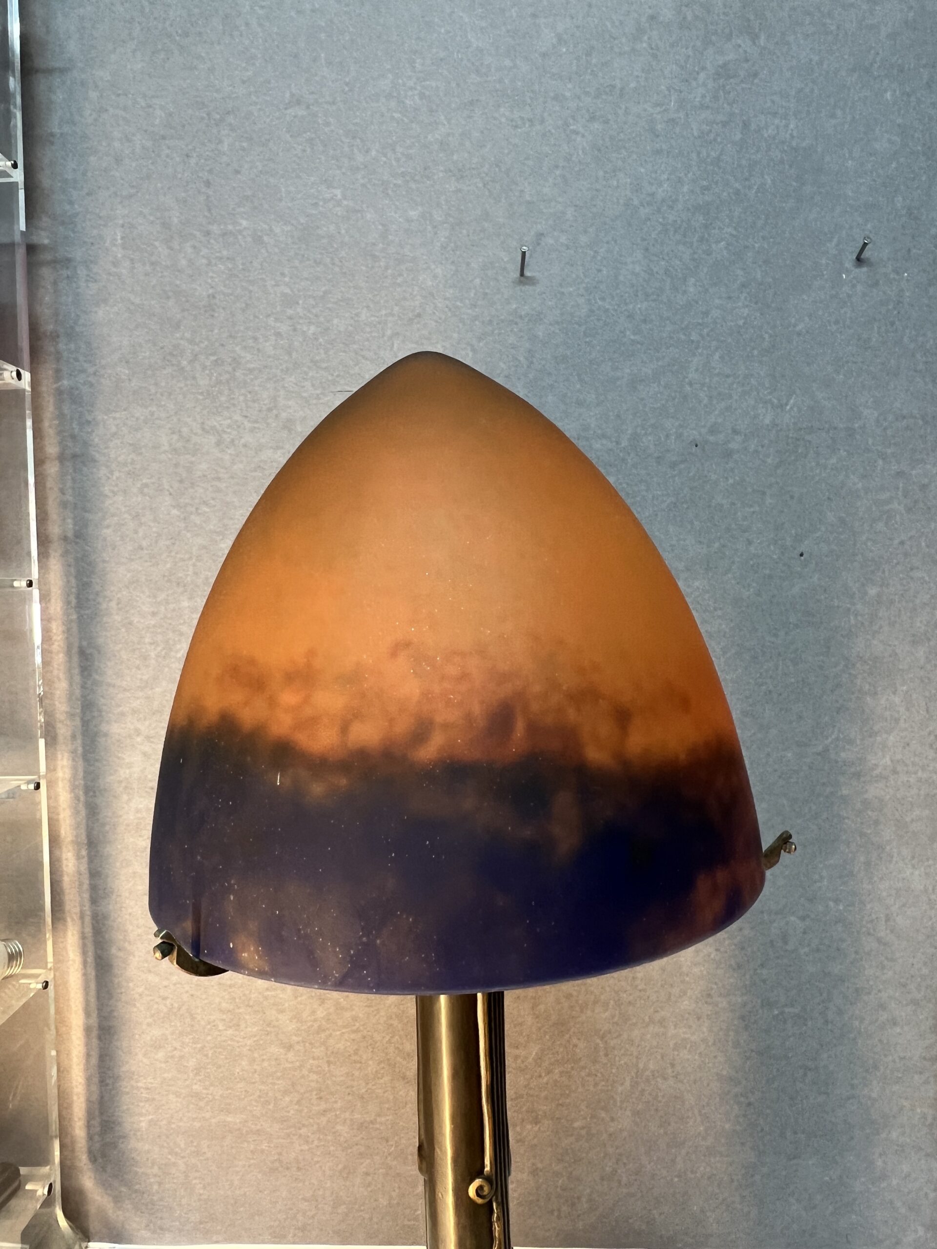 Lampe contemporaine de type champignon, piétement bronze, obus en verre nuancé