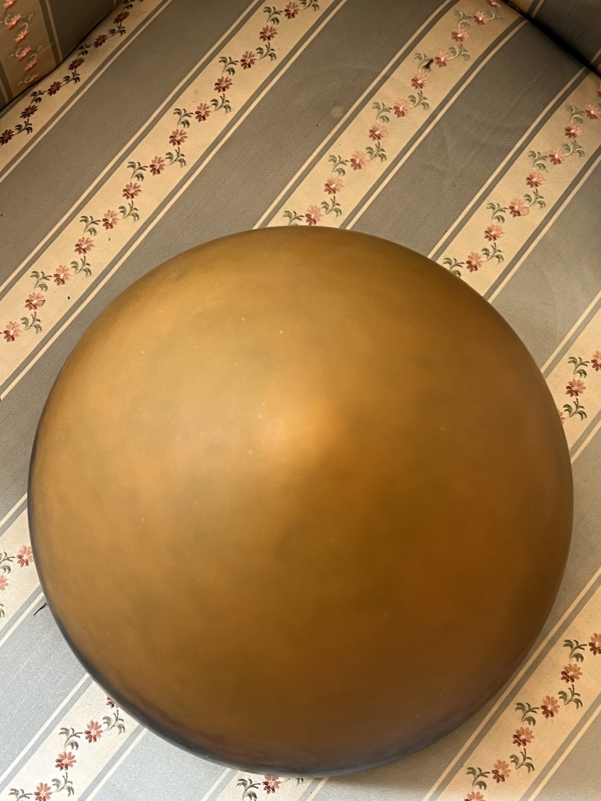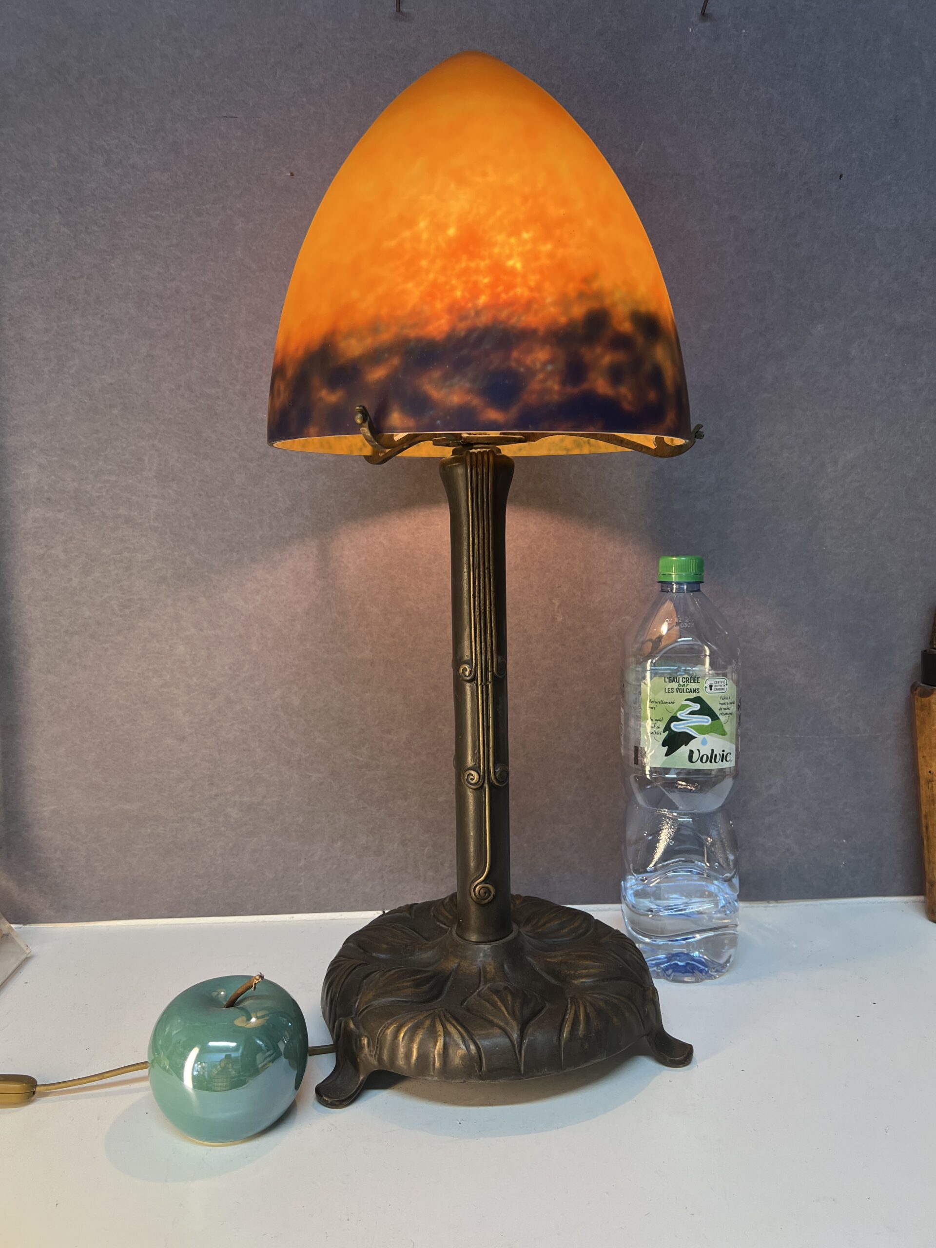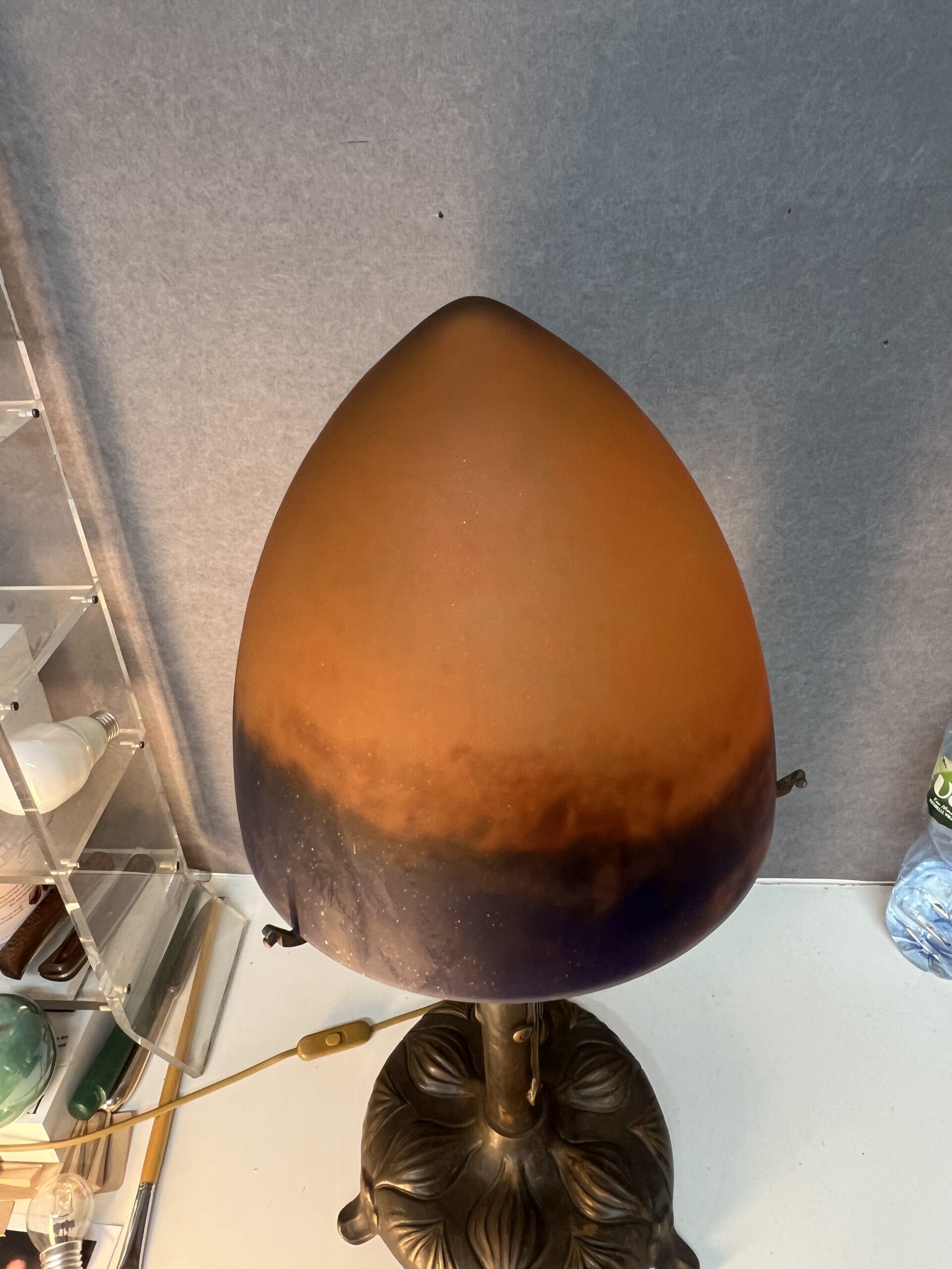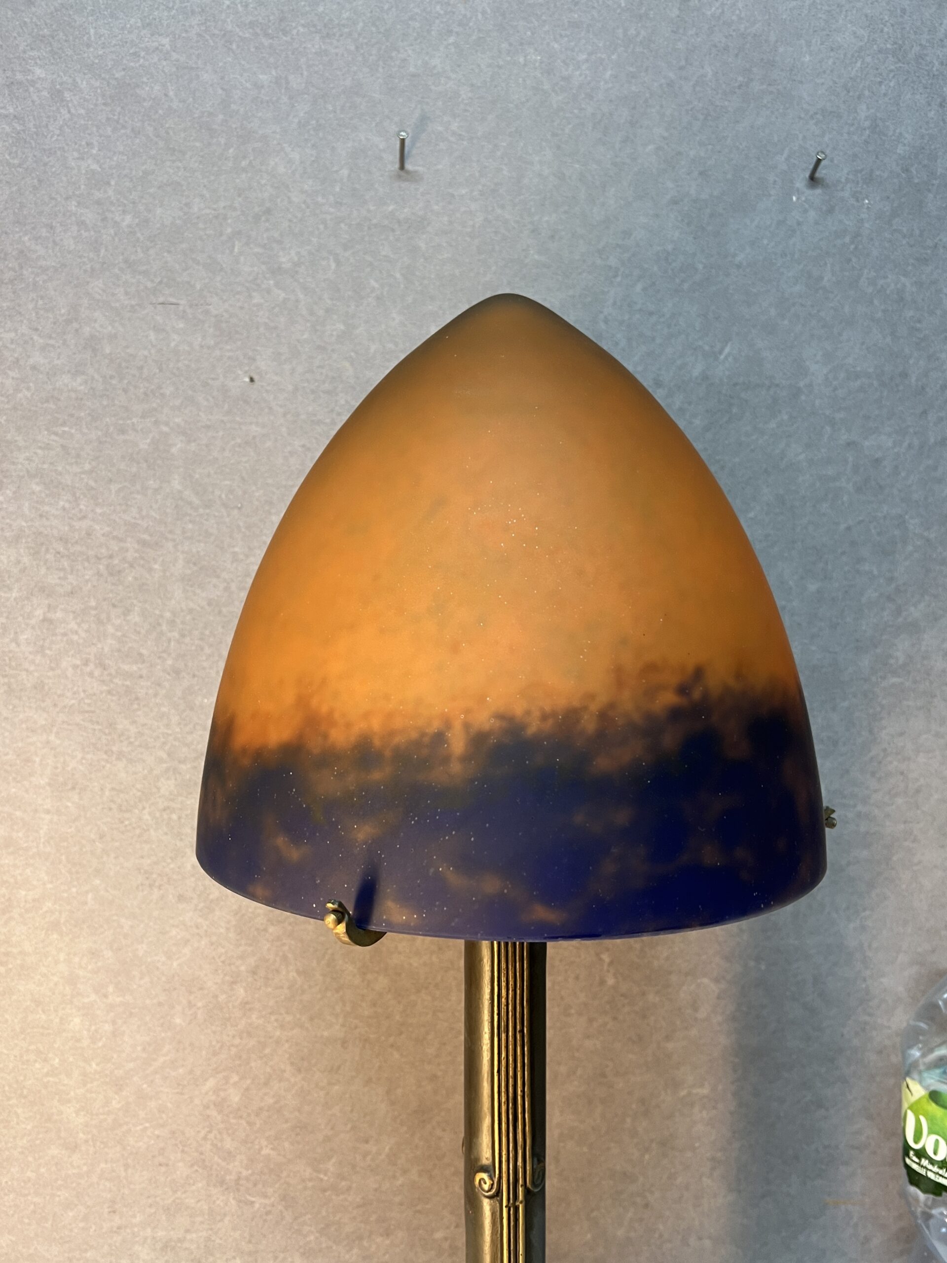 Lampe contemporaine de type champignon, piétement bronze, obus en verre nuancé