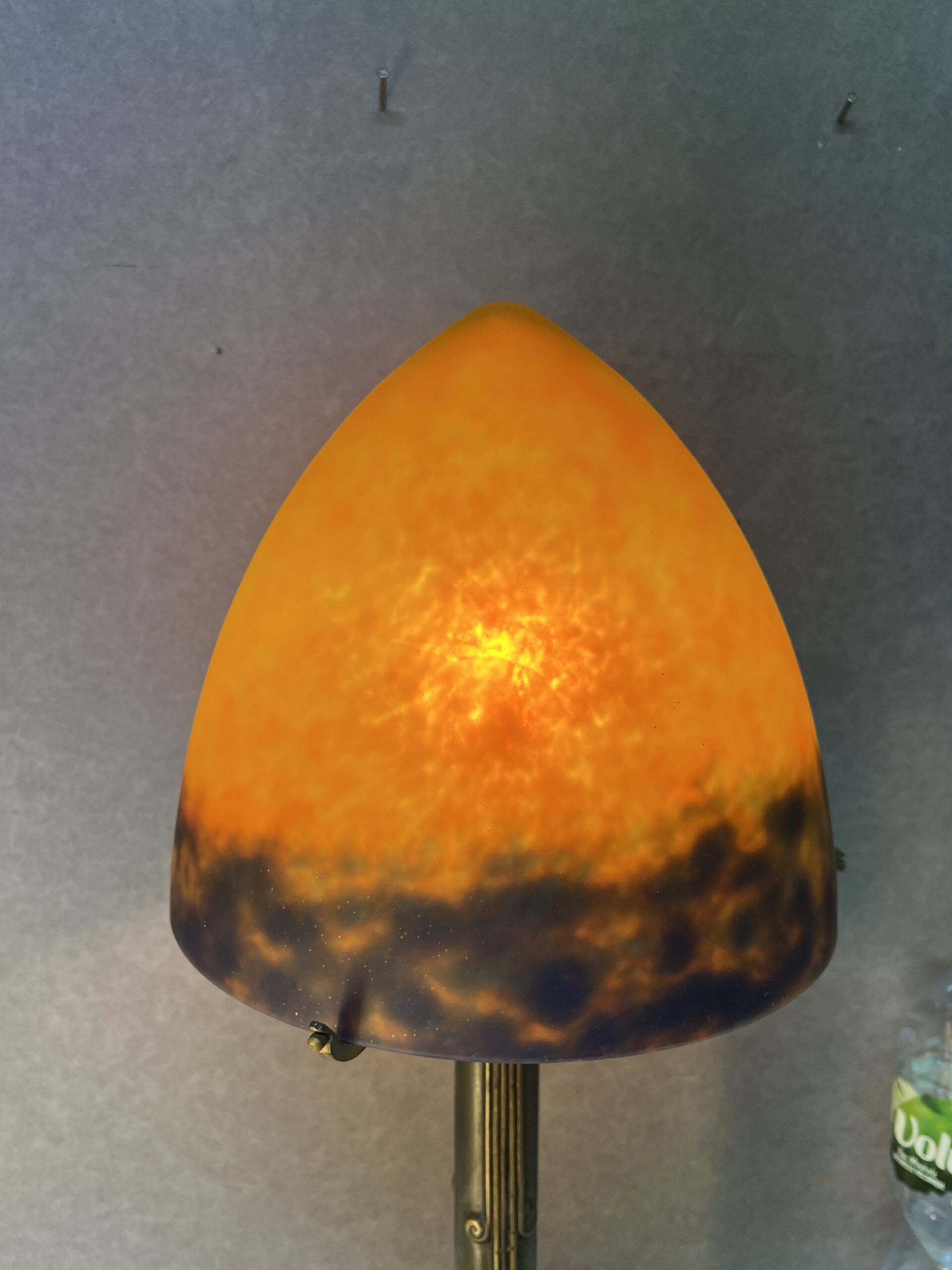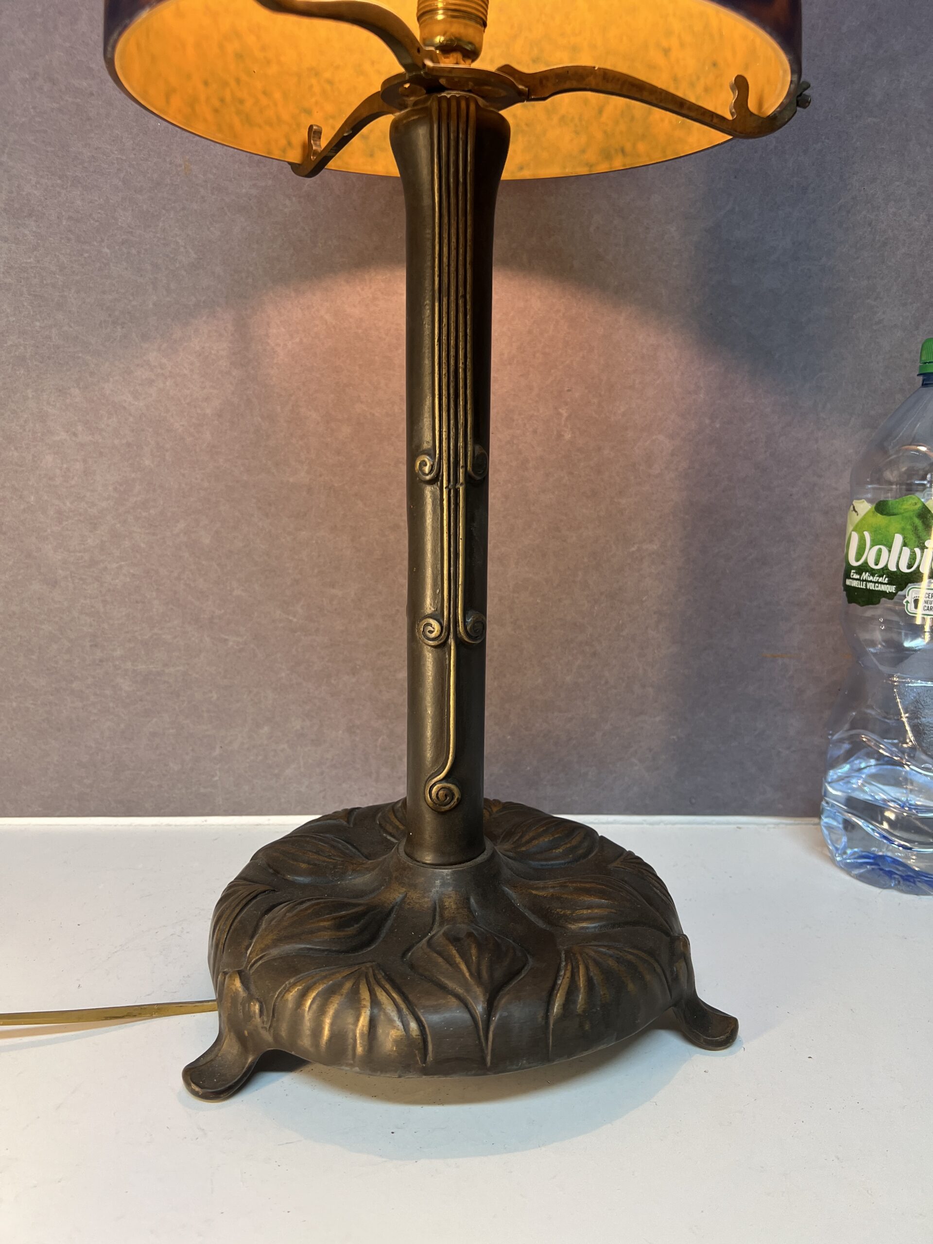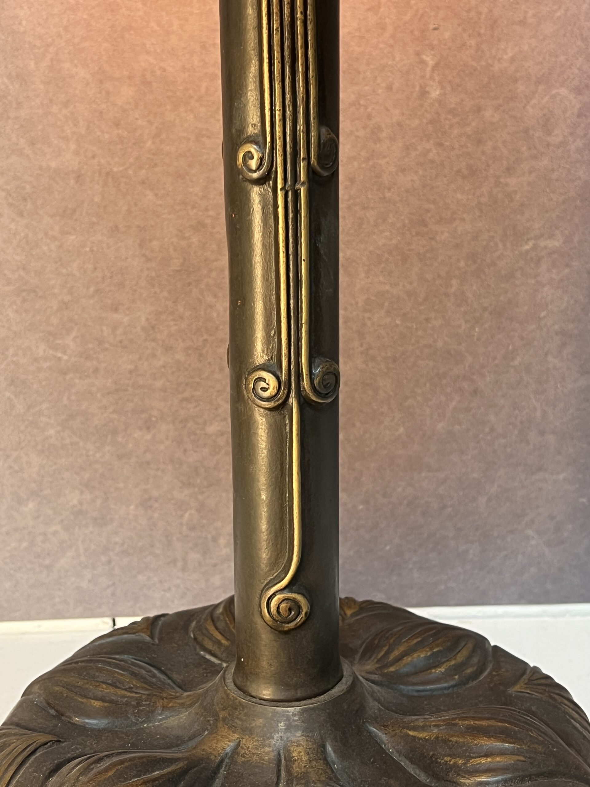Le piétement en bronze à patine brune est le premier élément qui attire le regard. Cette matière noble confère à la lampe une robustesse intemporelle, tandis que la patine brune ajoute une profondeur subtile à sa couleur, lui conférant une aura de sophistication. Mais ce qui rend ce piétement vraiment unique, ce sont les détails exquis de fleurs stylisées qui l’ornent. Ces motifs floraux évoquent le glamour et l’opulence des années 1920 et 1930, période où l’Art Déco a prospéré, tout en offrant une touche de fraîcheur et de modernité.
