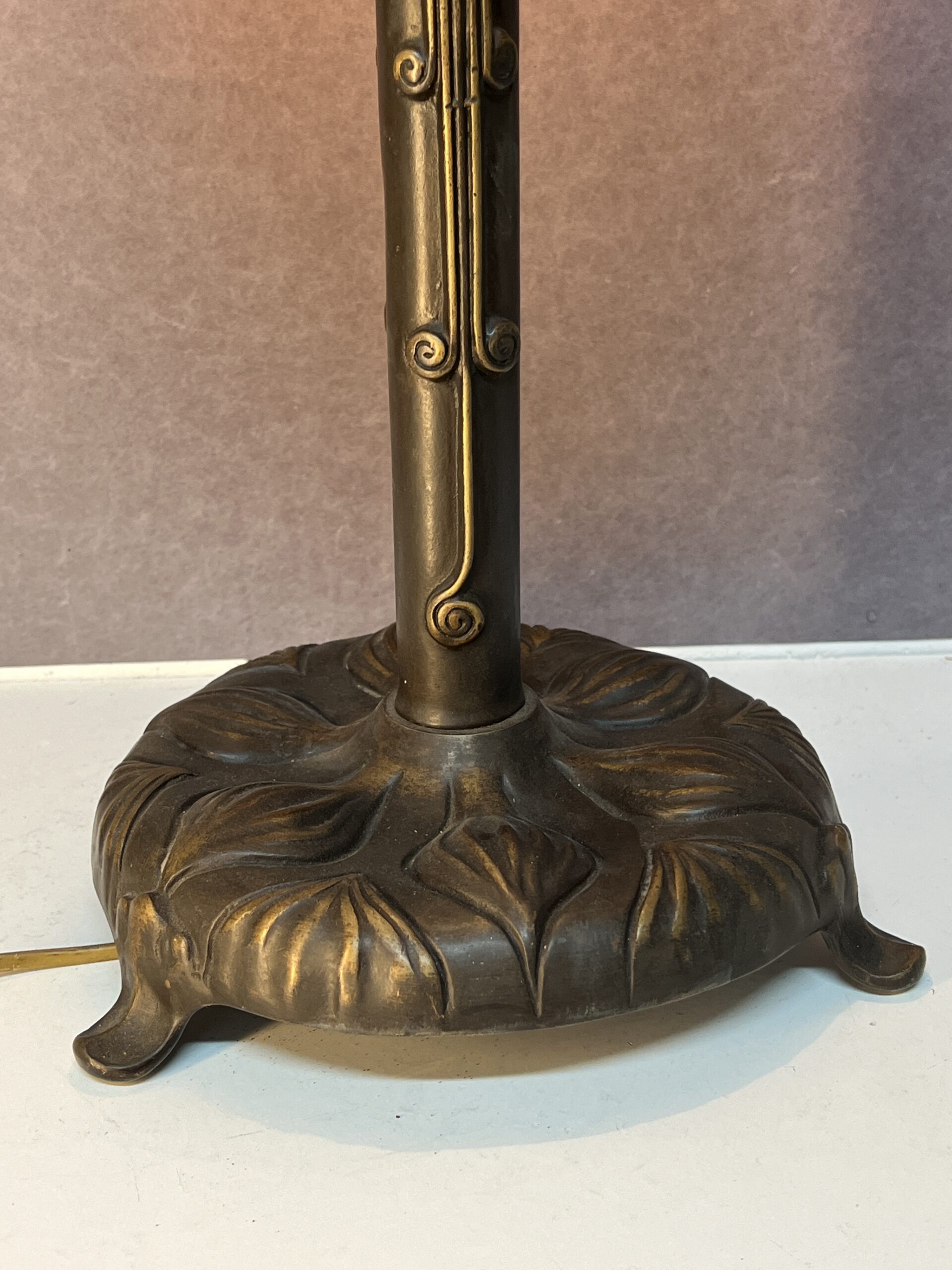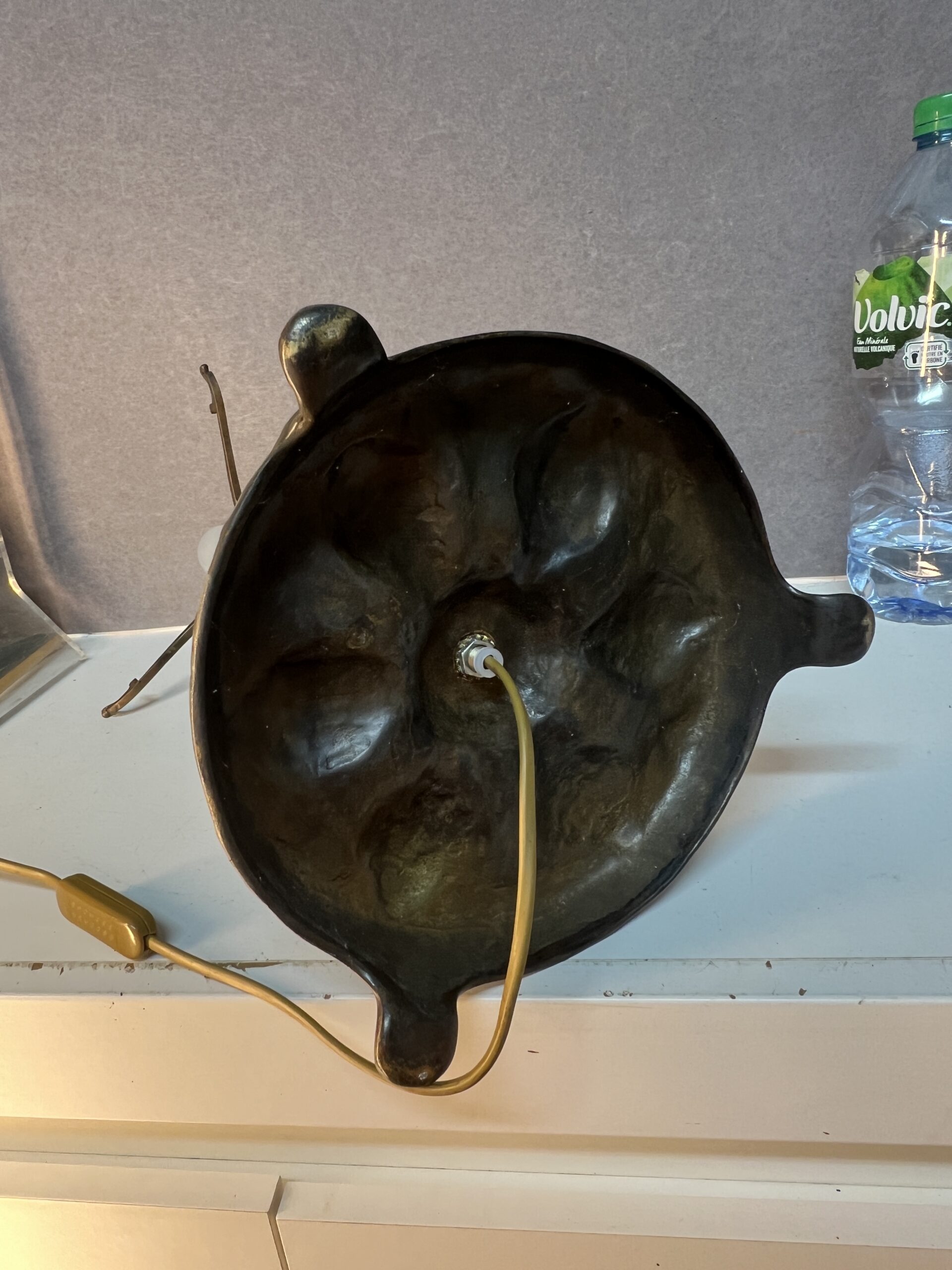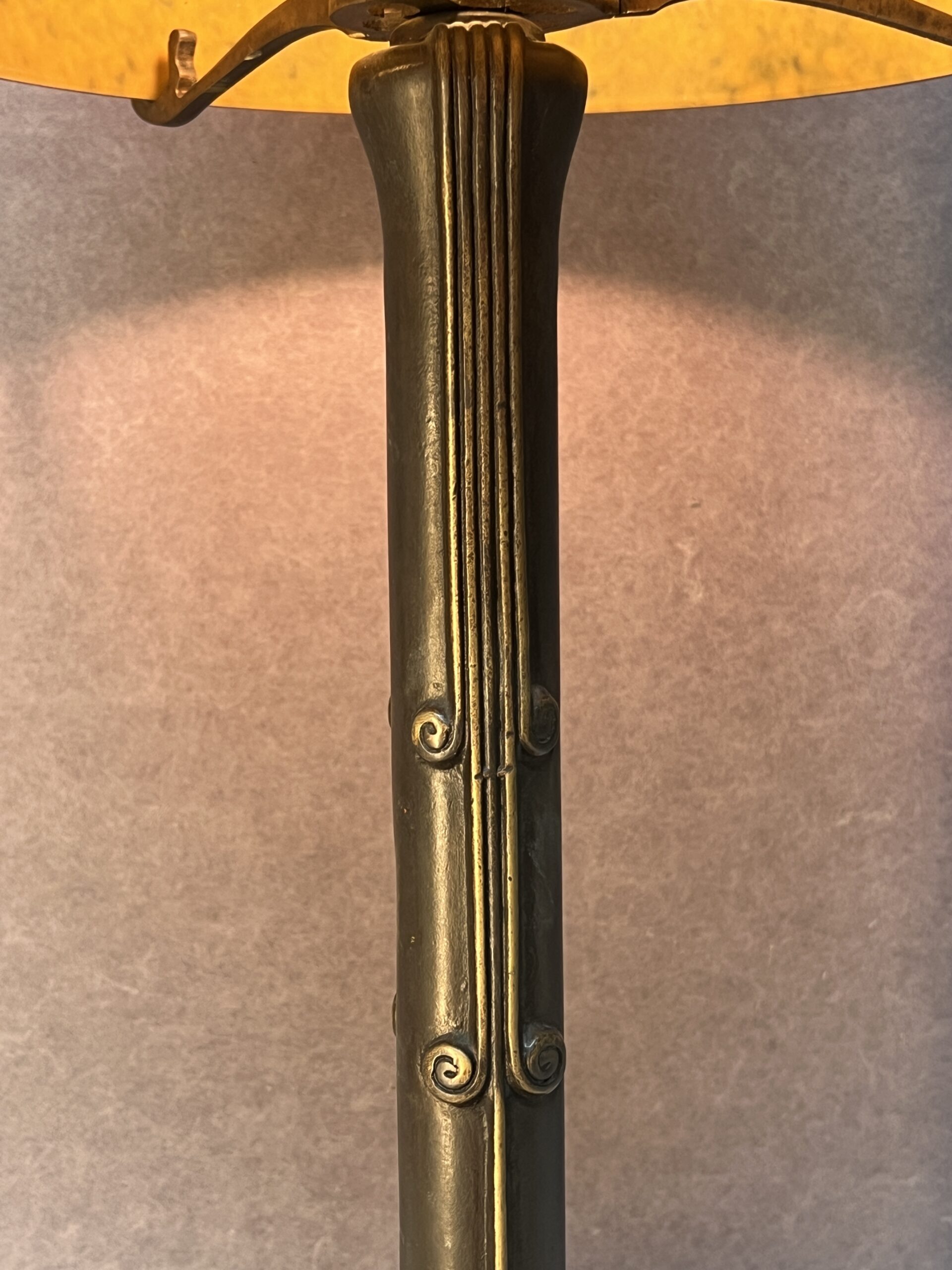 Le piétement en bronze à patine brune est le premier élément qui attire le regard. Cette matière noble confère à la lampe une robustesse intemporelle, tandis que la patine brune ajoute une profondeur subtile à sa couleur, lui conférant une aura de sophistication. Mais ce qui rend ce piétement vraiment unique, ce sont les détails exquis de fleurs stylisées qui l’ornent. Ces motifs floraux évoquent le glamour et l’opulence des années 1920 et 1930, période où l’Art Déco a prospéré, tout en offrant une touche de fraîcheur et de modernité.