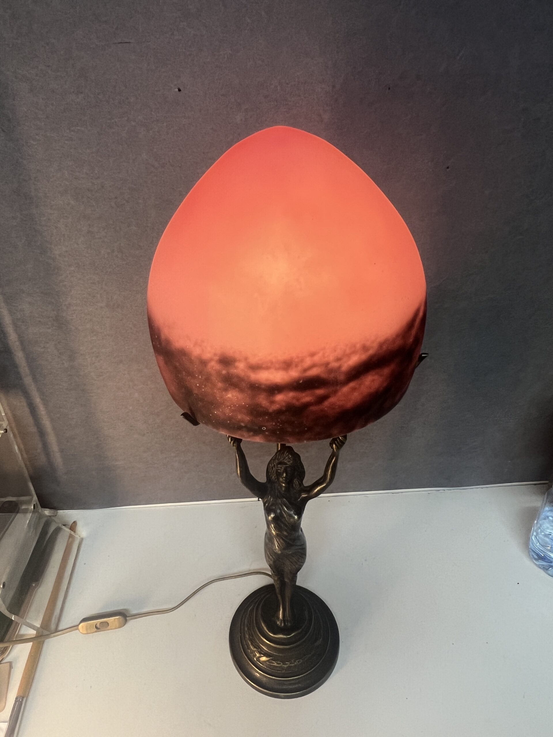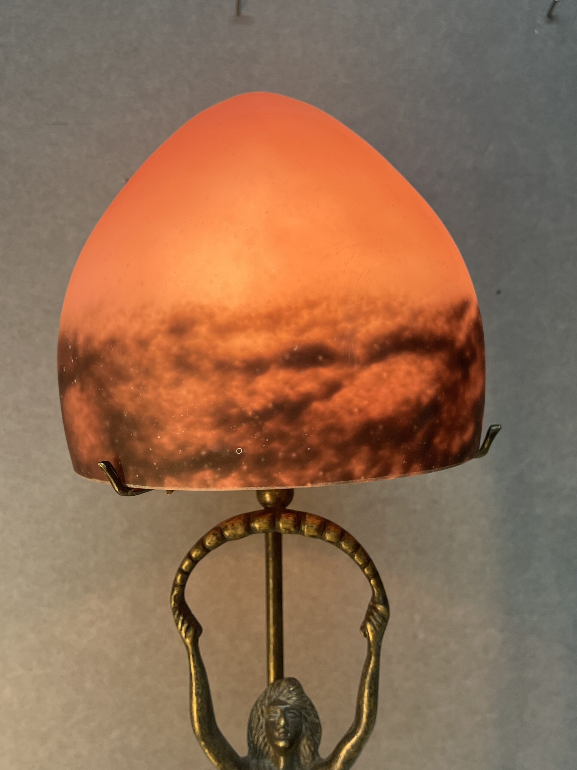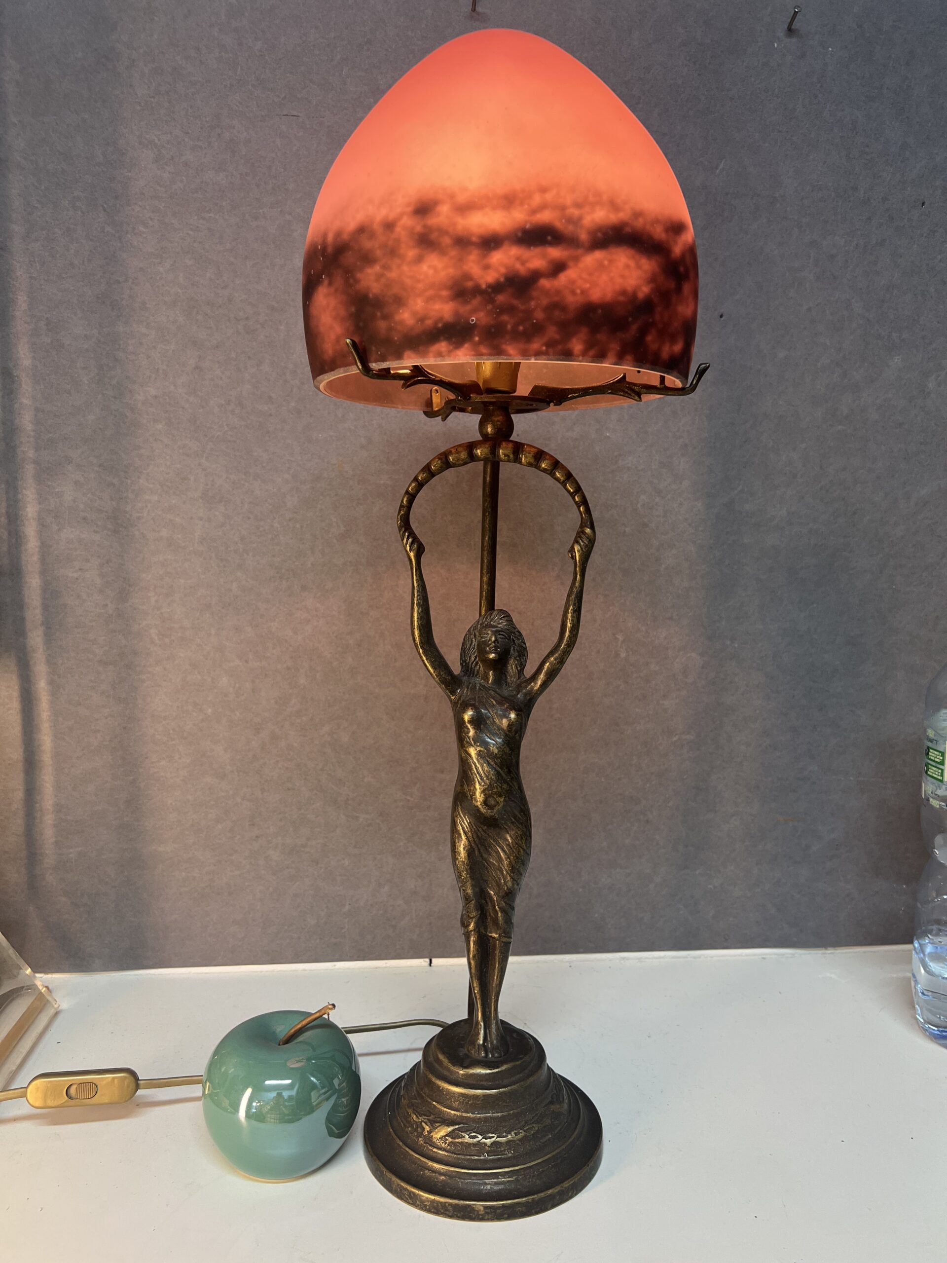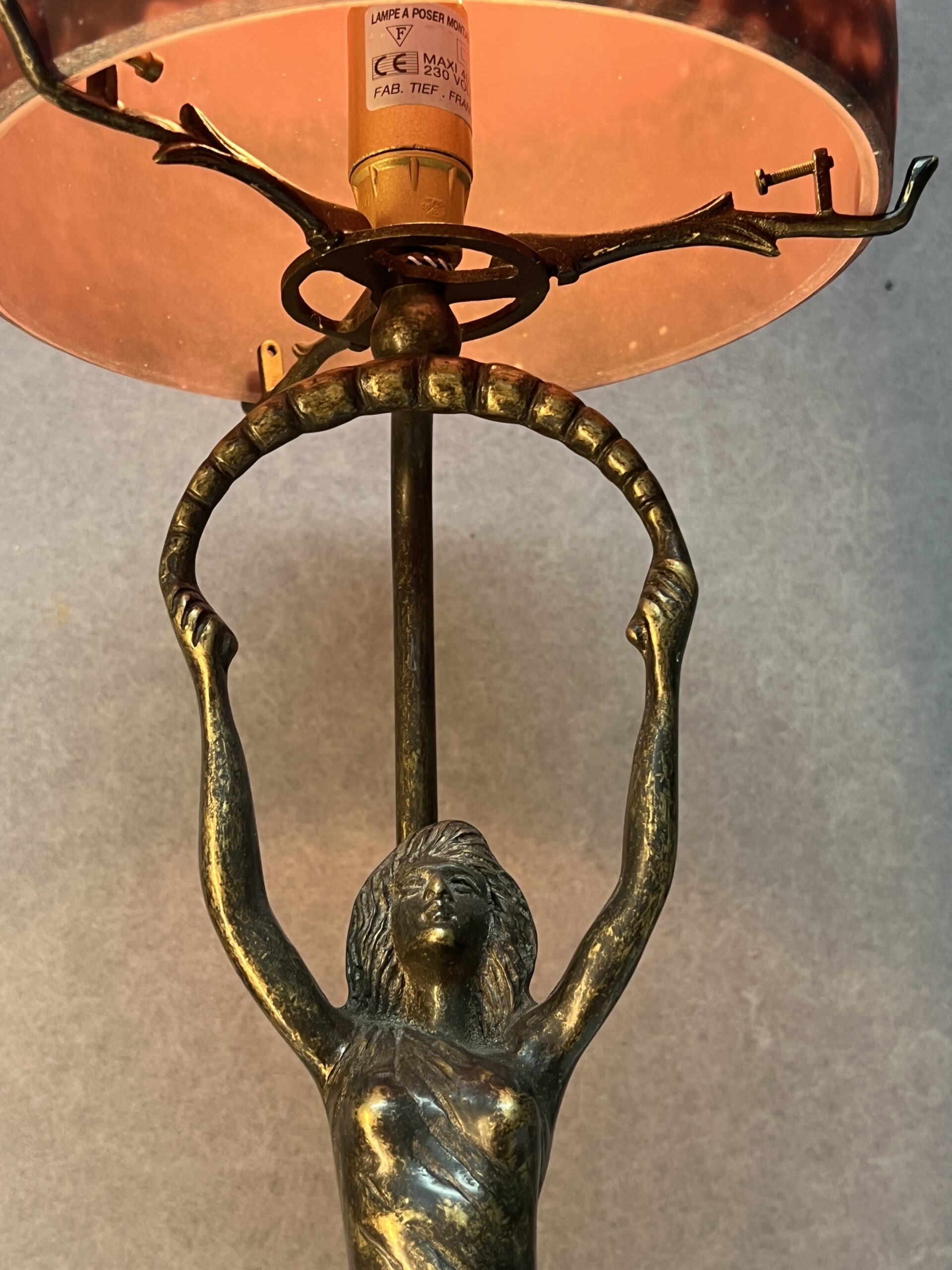 Lampe contemporaine en laiton massif patiné, décor femme drapée, obus en pâte de verre Tief