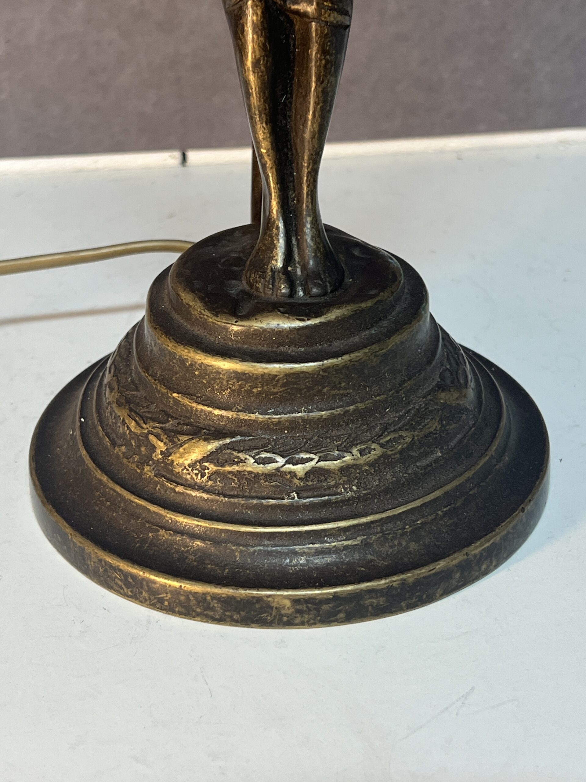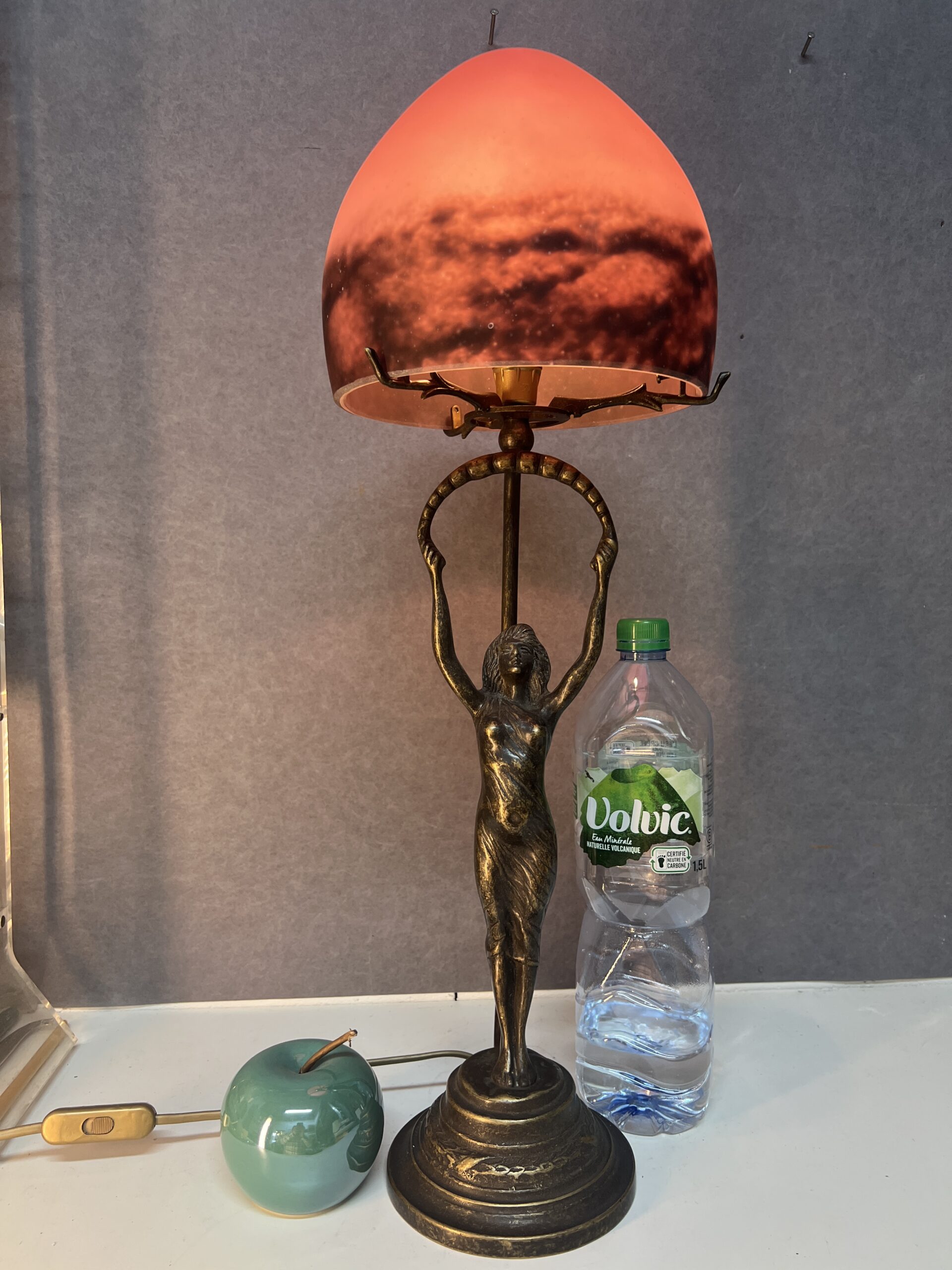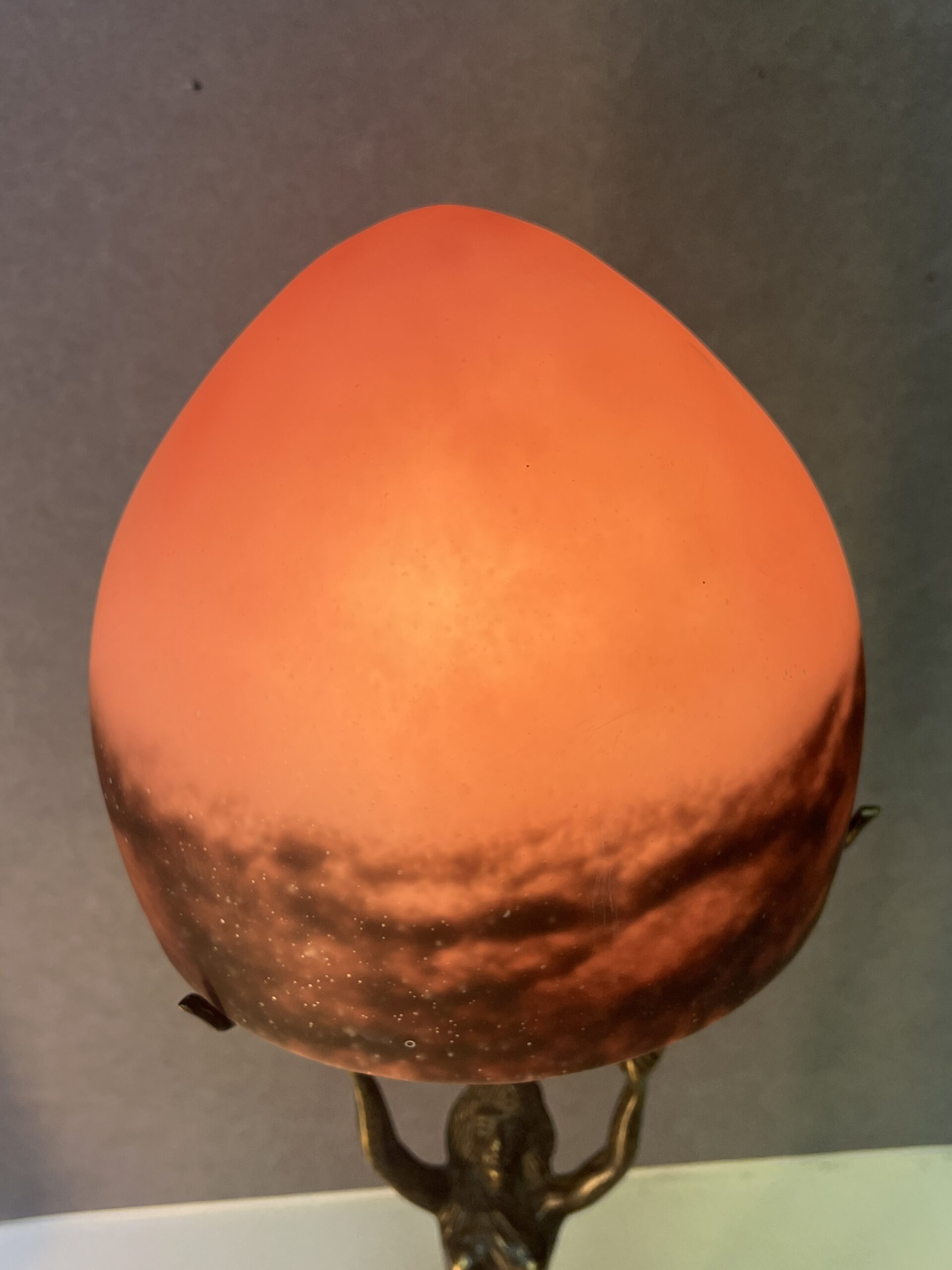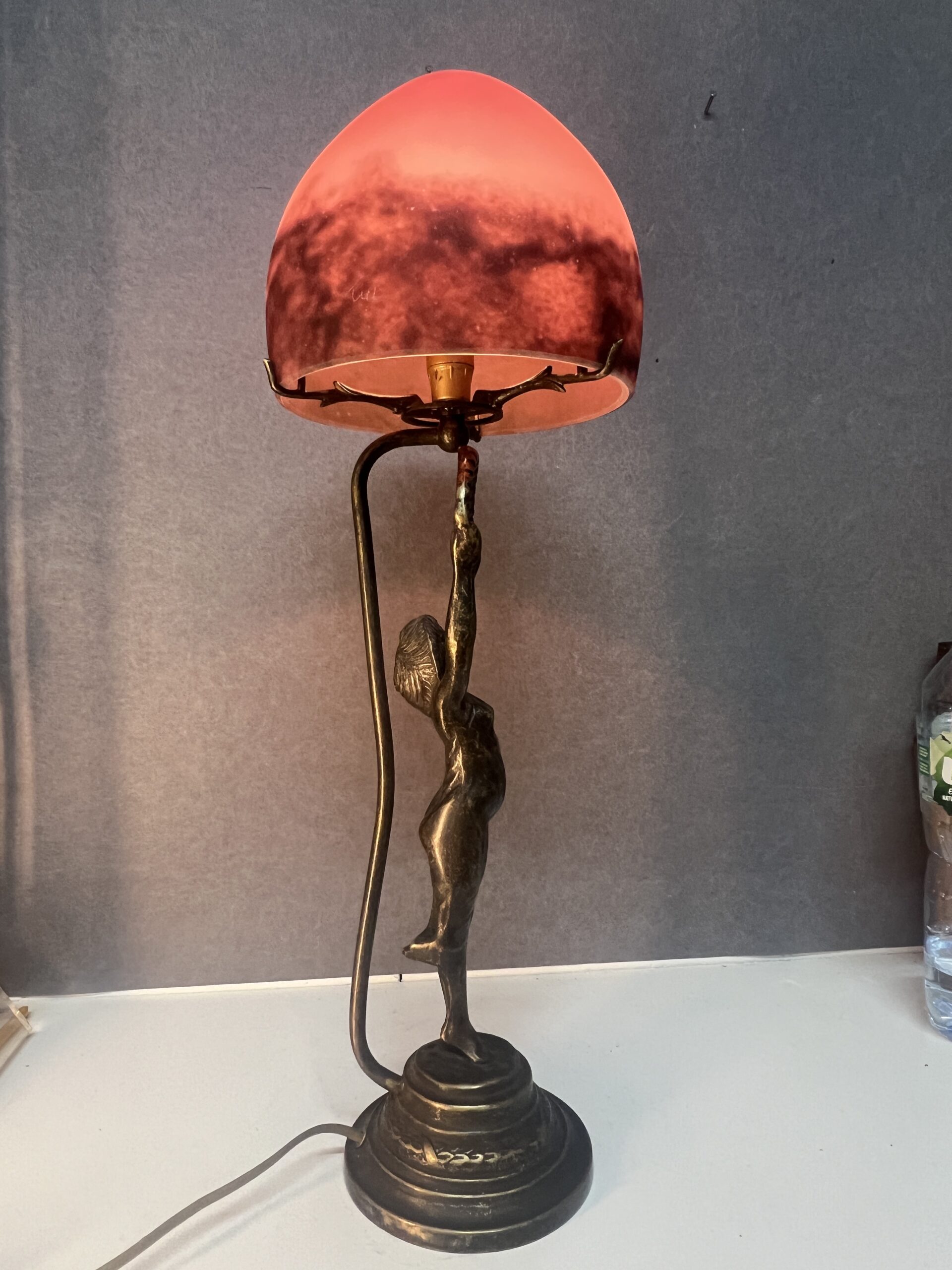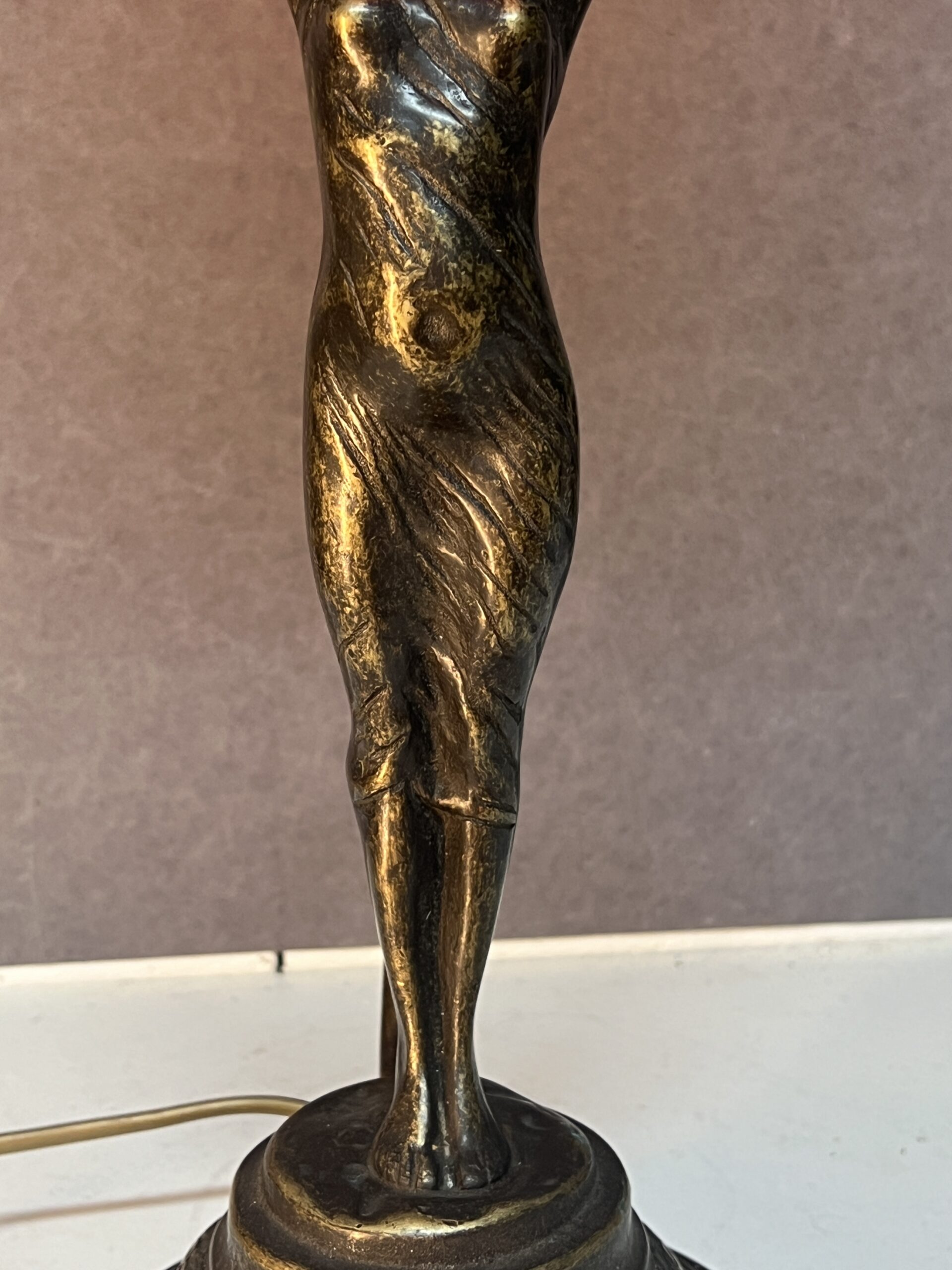 Lampe contemporaine en laiton massif patiné, décor femme drapée, obus en pâte de verre Tief
