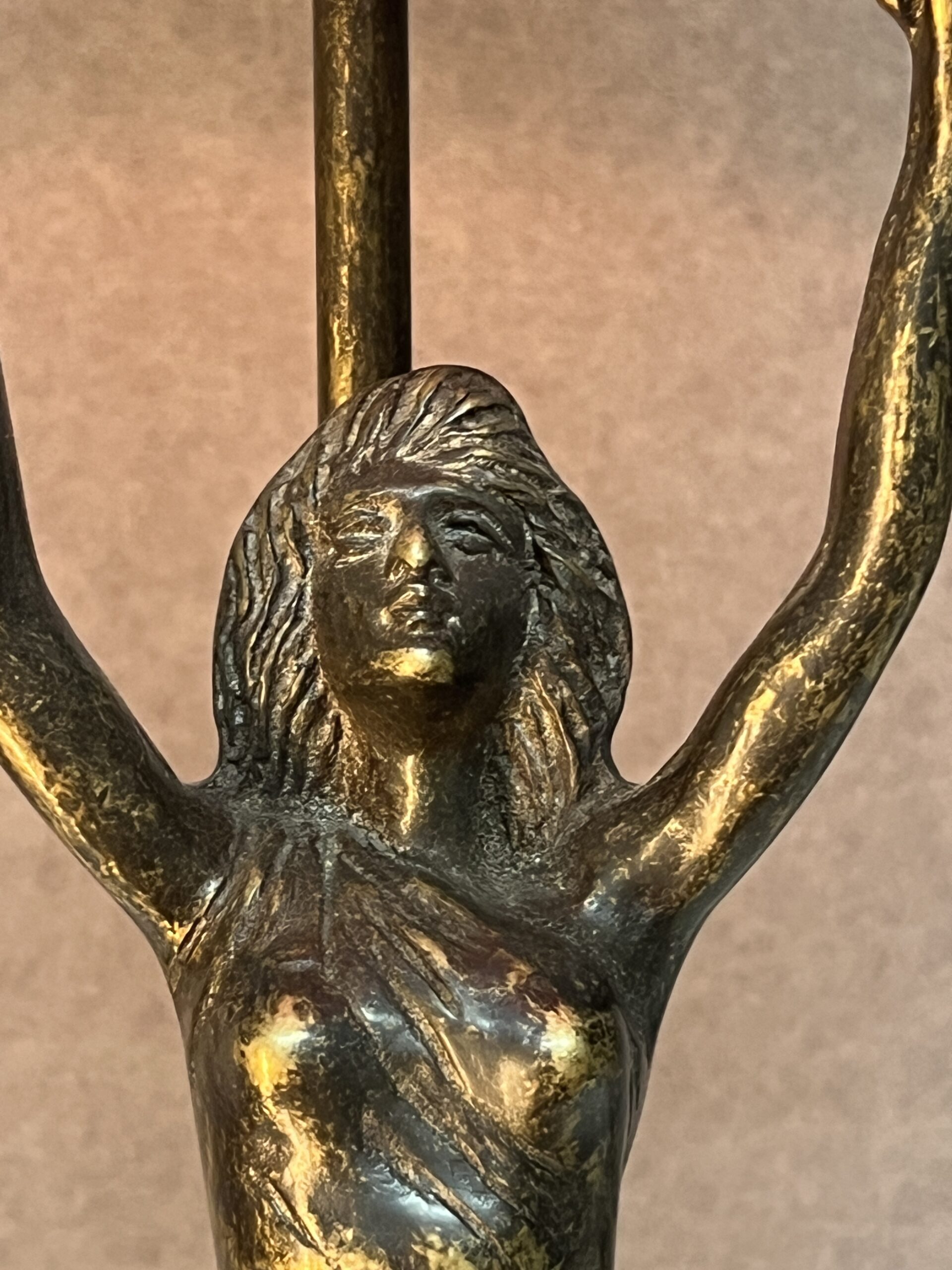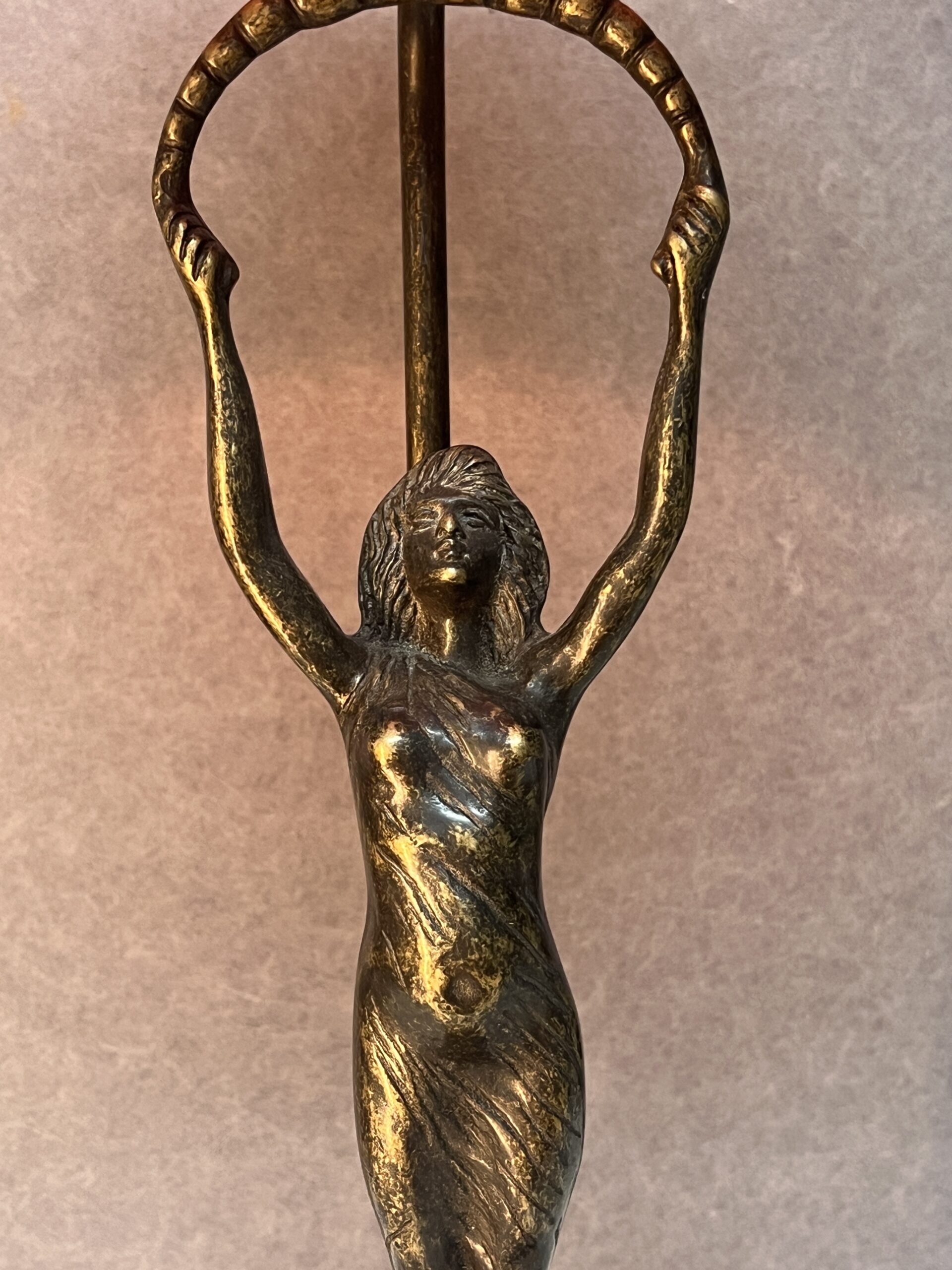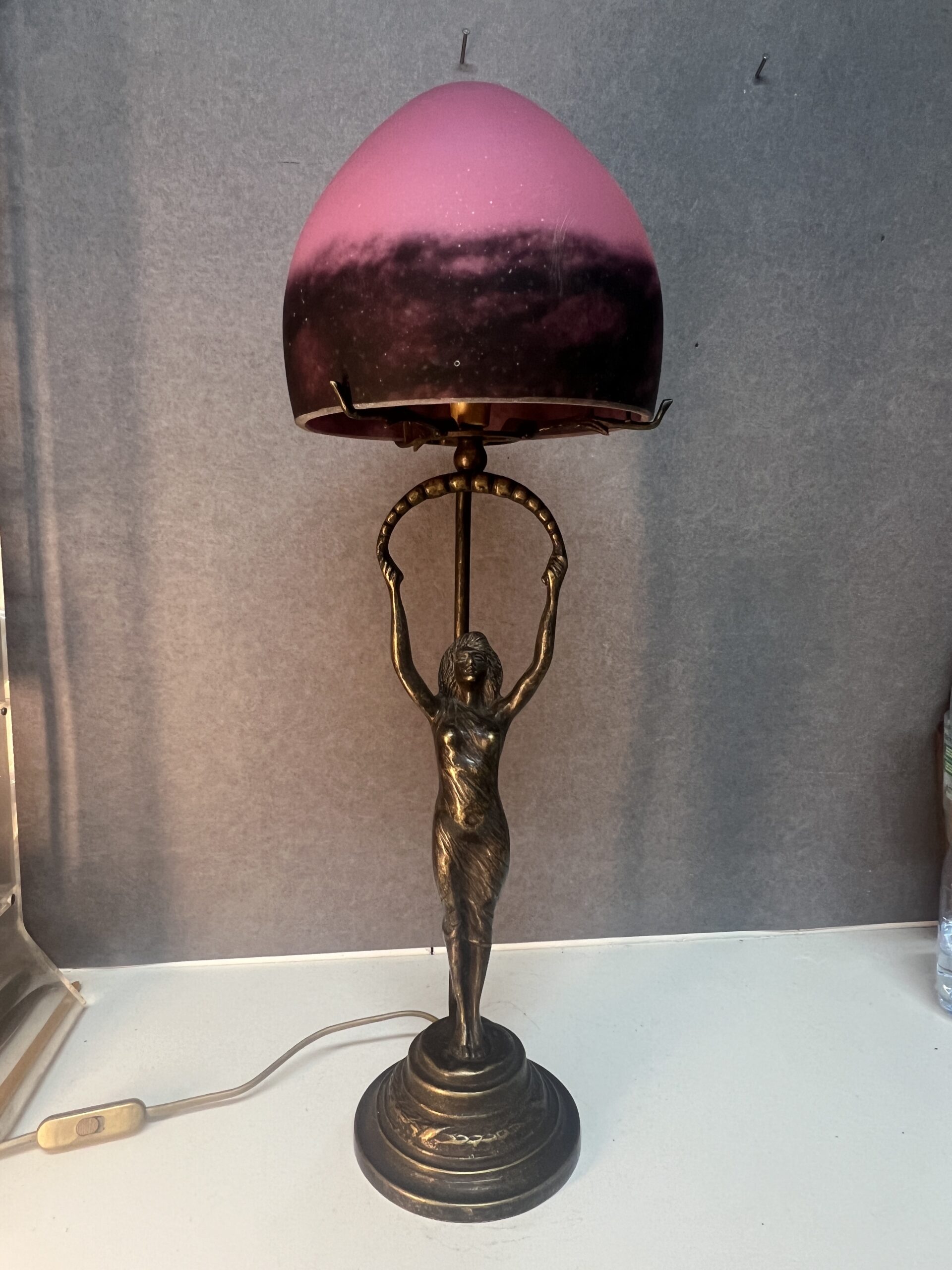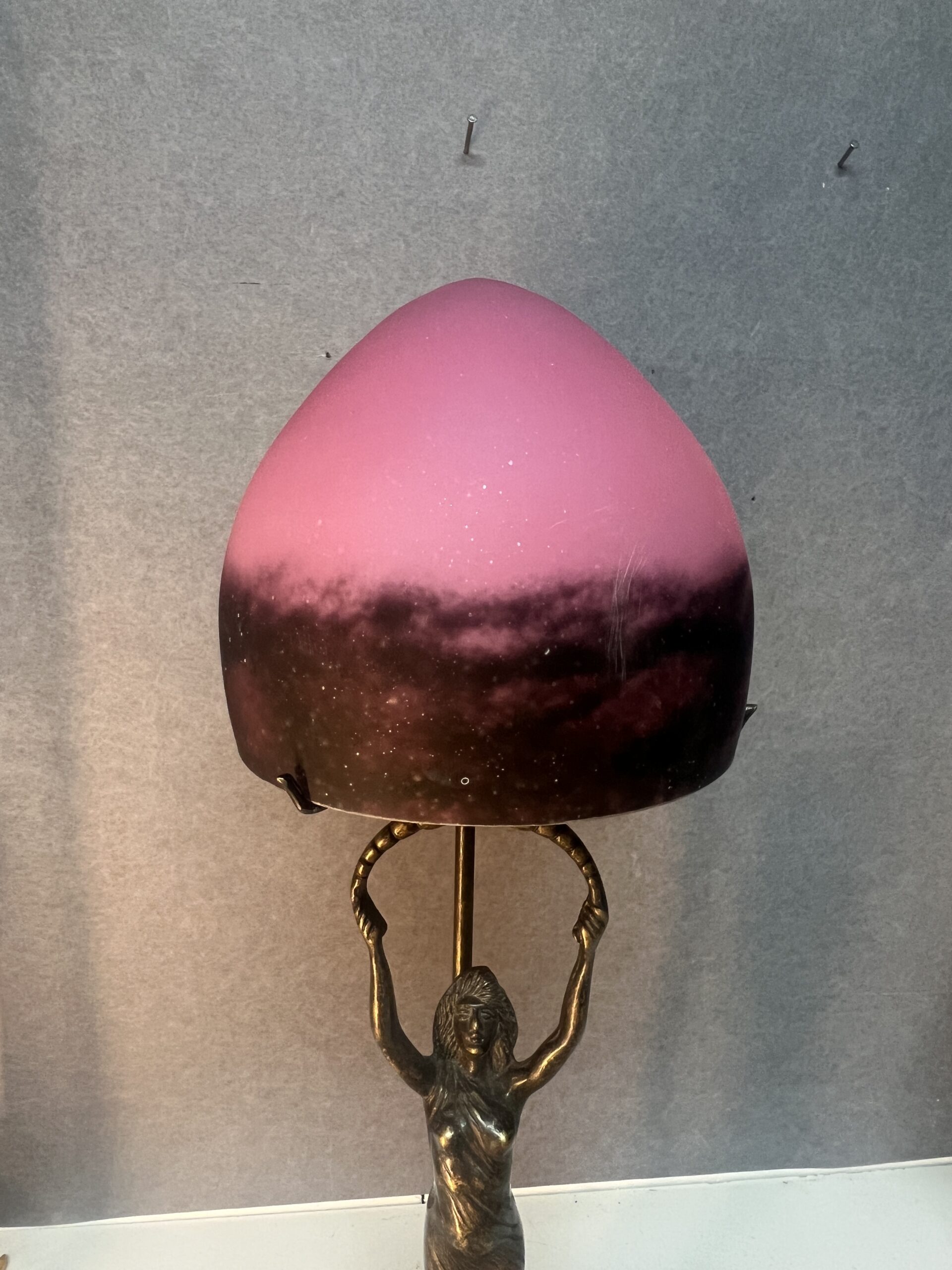 Lampe contemporaine en laiton massif patiné, décor femme drapée, obus en pâte de verre Tief