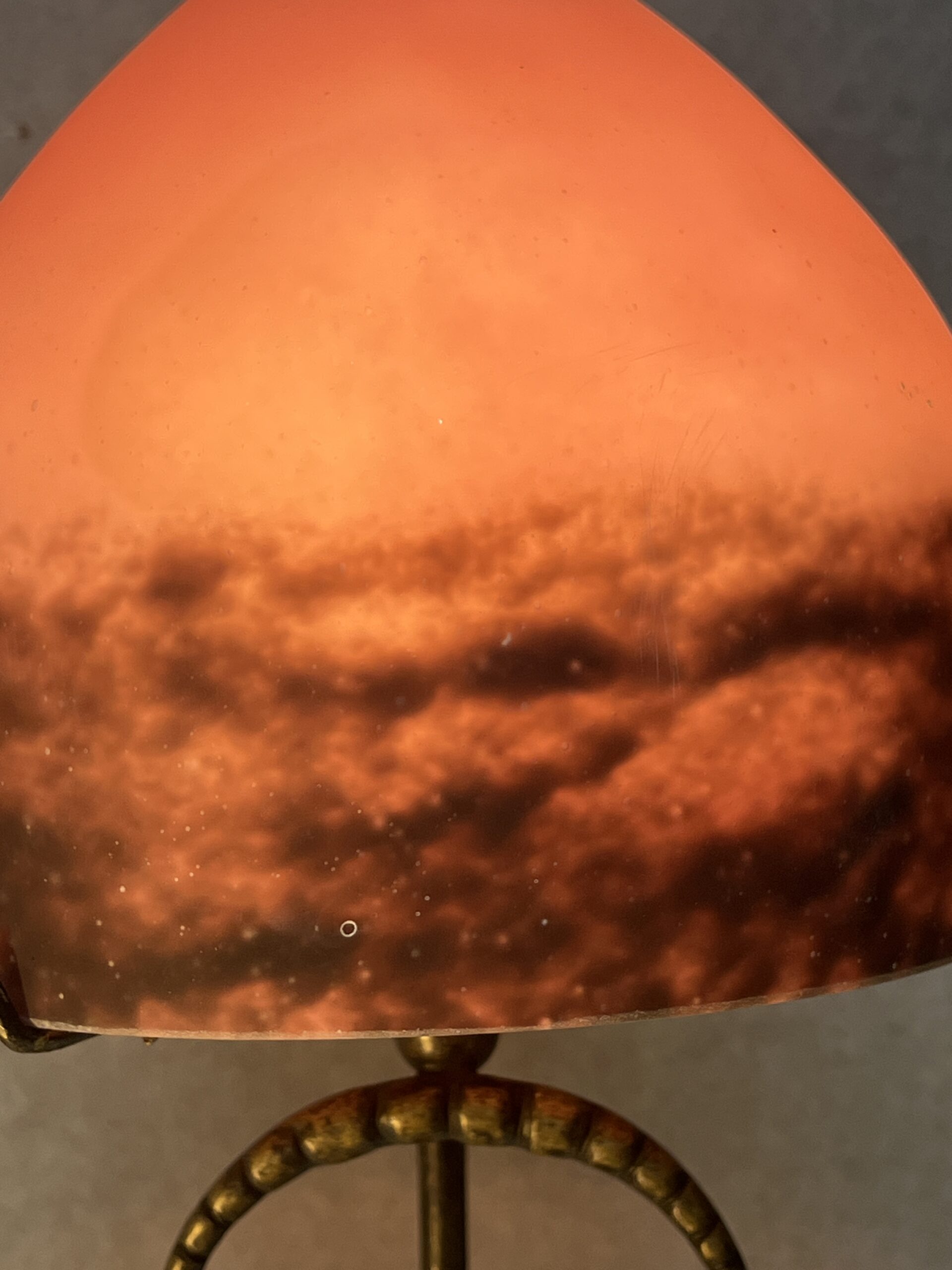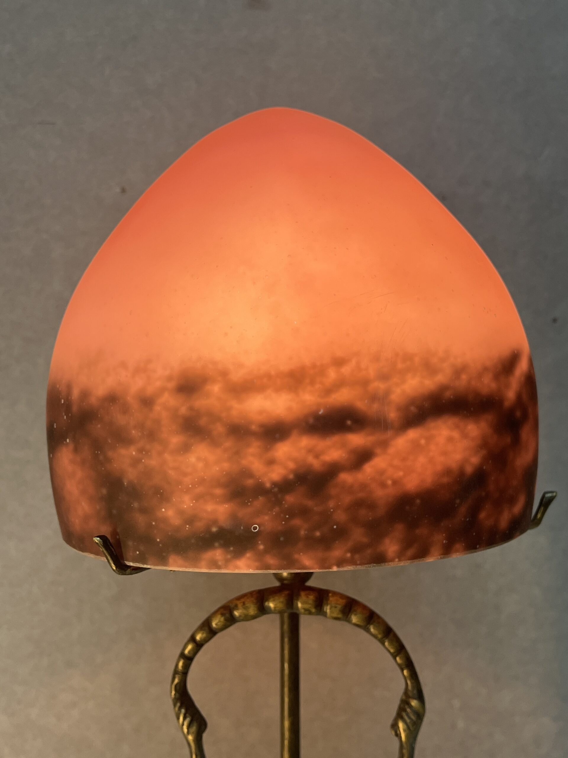 L’abat-jour en pâte de verre vient compléter cette pièce avec une élégance subtile. Sa couleur violet nuancé de brun en bordure crée un contraste saisissant avec le laiton patiné, tout en apportant une touche de chaleur et de raffinement à l’ensemble. La texture délicate de la pâte de verre diffuse la lumière de manière douce et enveloppante, créant une ambiance apaisante et accueillante dans n’importe quel espace.
