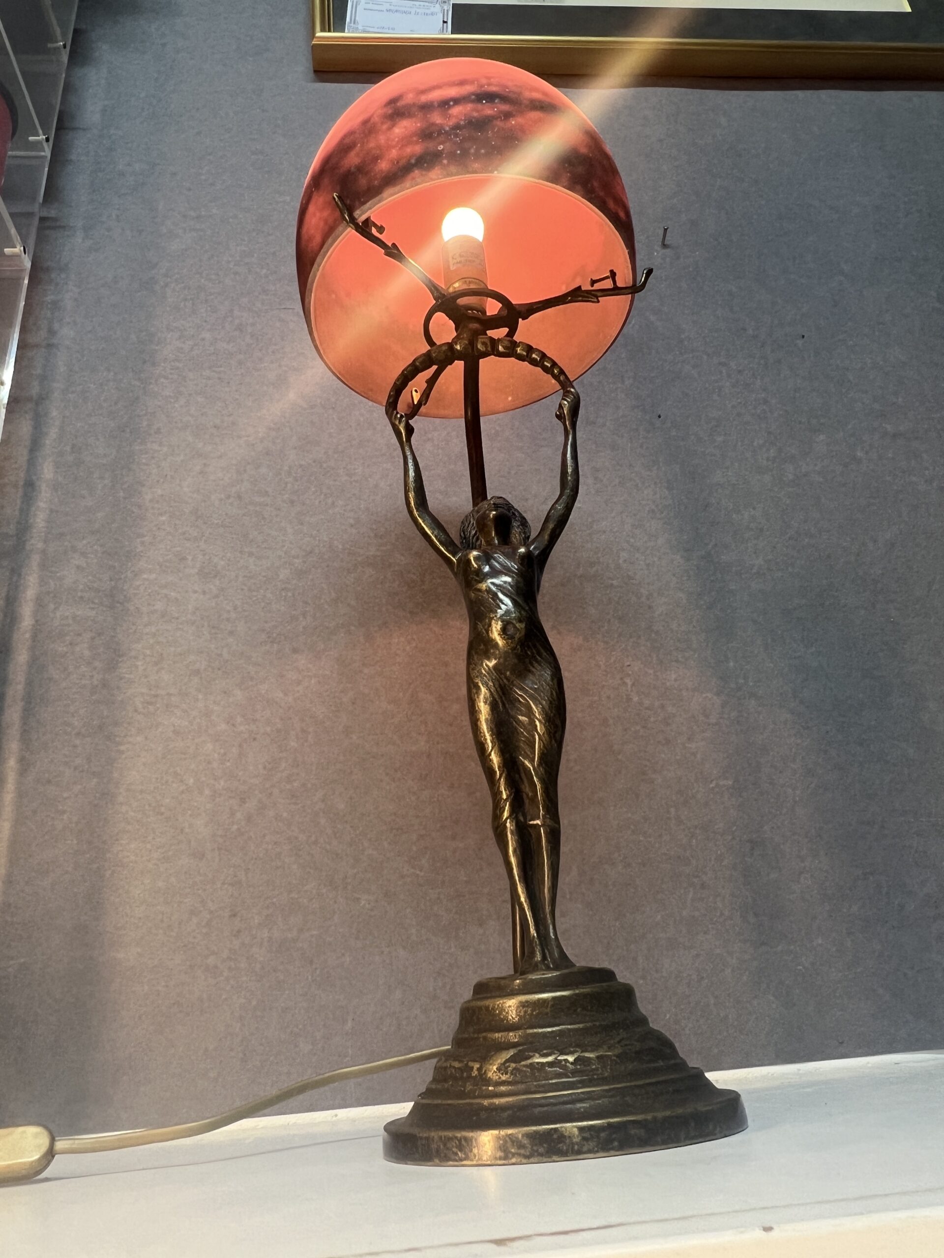 Au cœur de cette lampe, trône une figure féminine envoûtante, drapée dans un tissu délicat. Son allure éthérée évoque à la fois la grâce et la puissance, capturant l’essence de la féminité avec une finesse remarquable. Son visage, sculpté avec une précision, semble presque prendre vie sous l’éclat doux de la lumière qui l’entoure. Cette représentation artistique ajoute une dimension narrative à la lampe, invitant l’observateur à s’immerger dans son histoire mystérieuse.