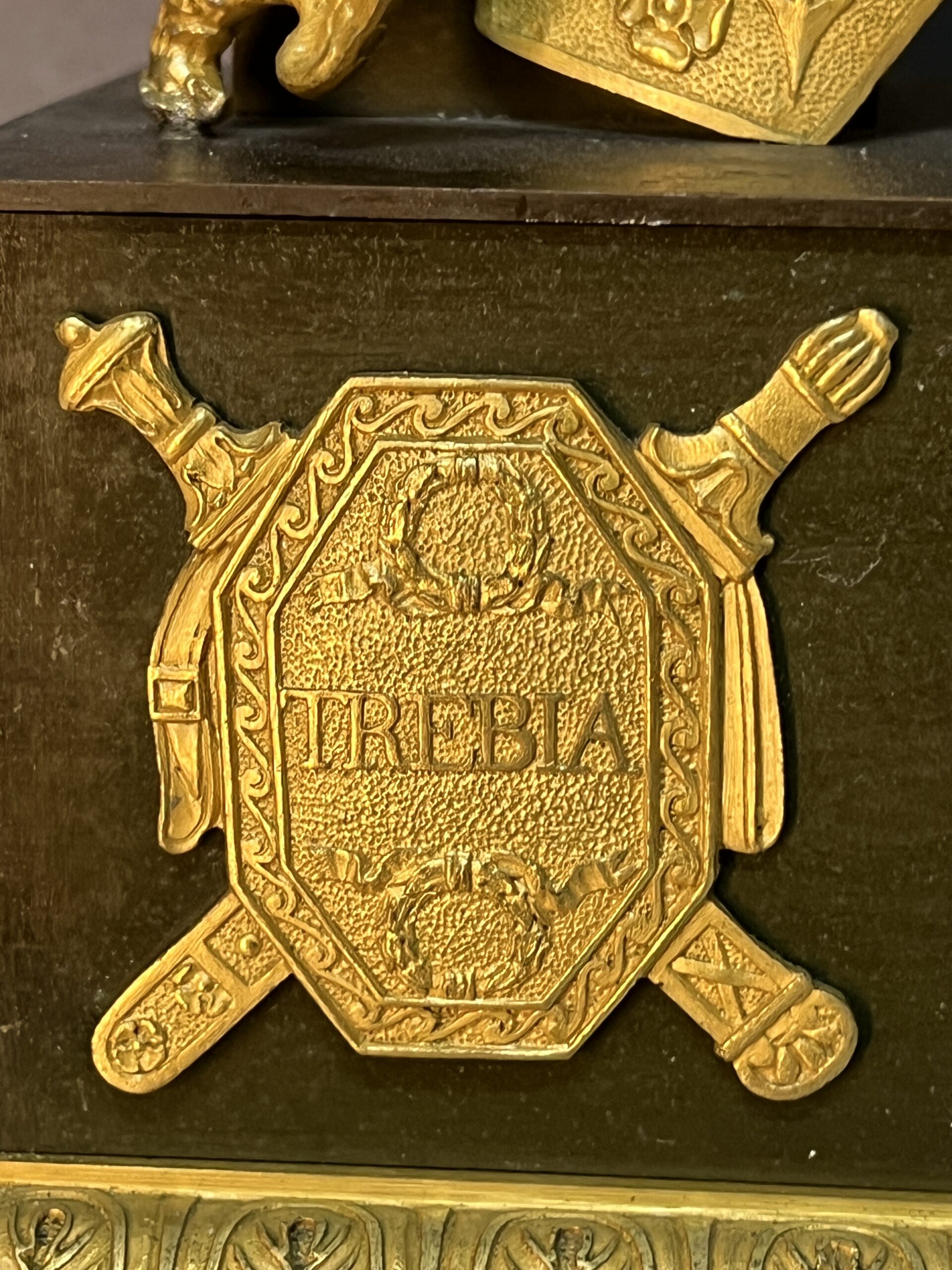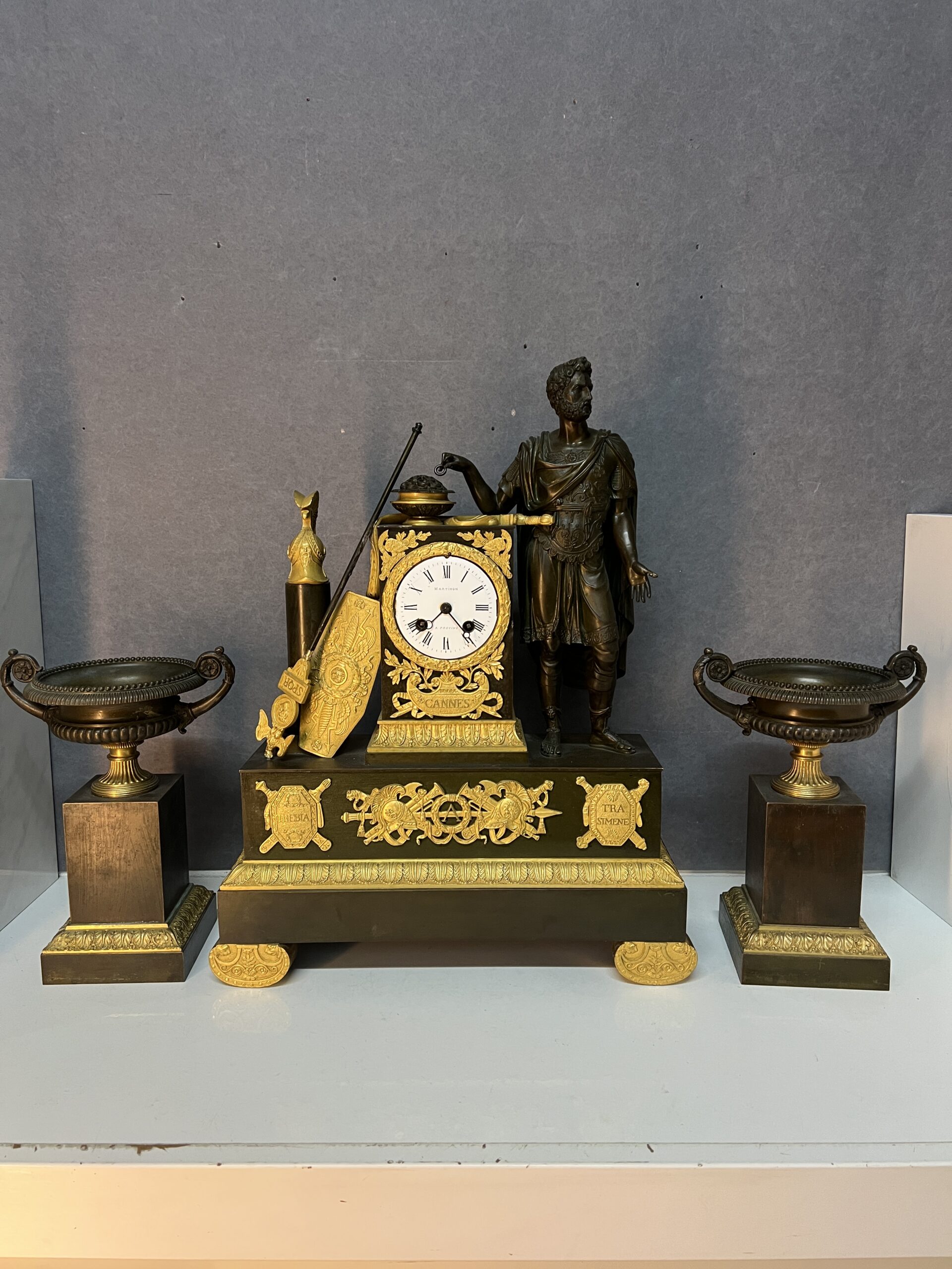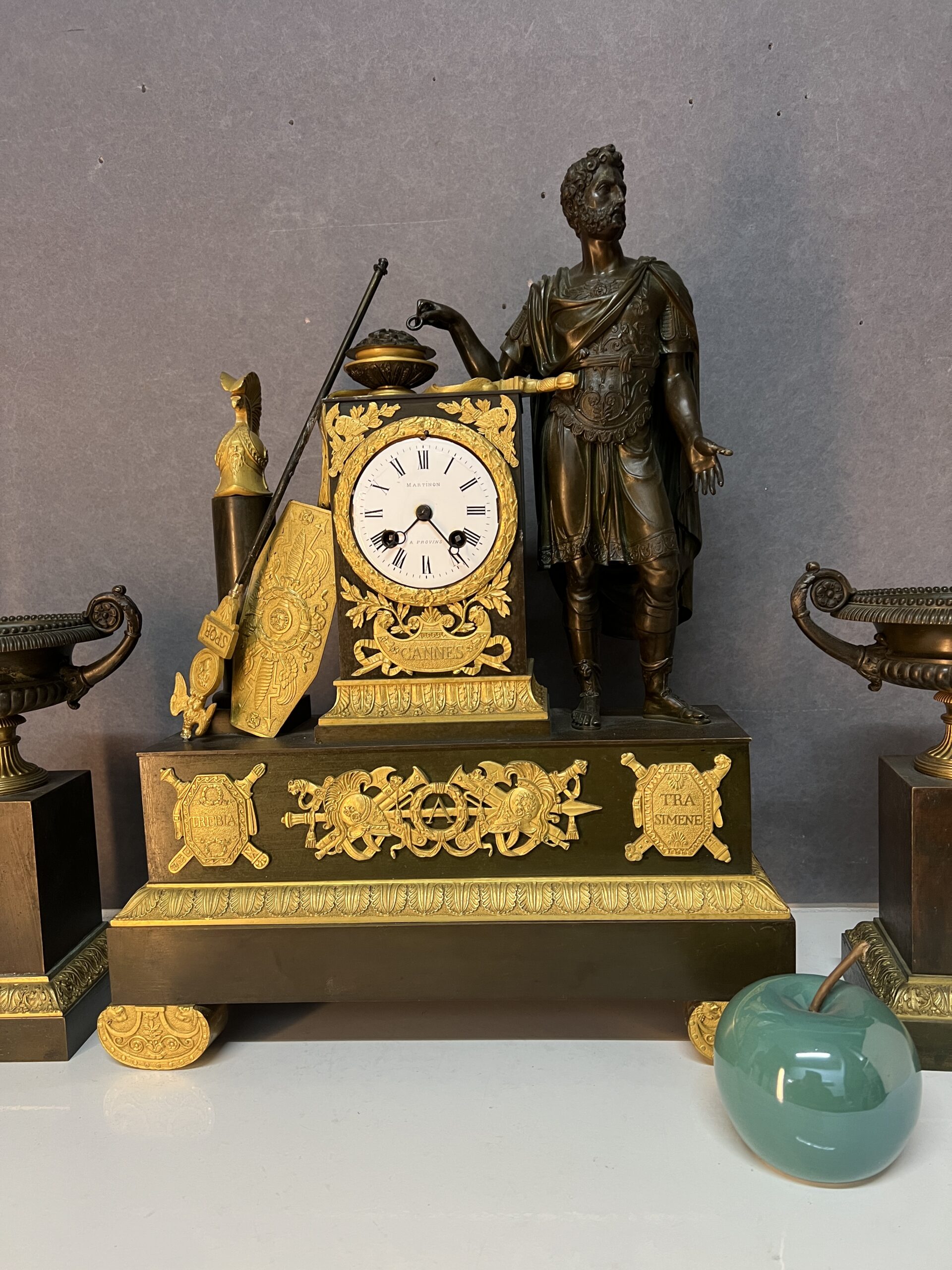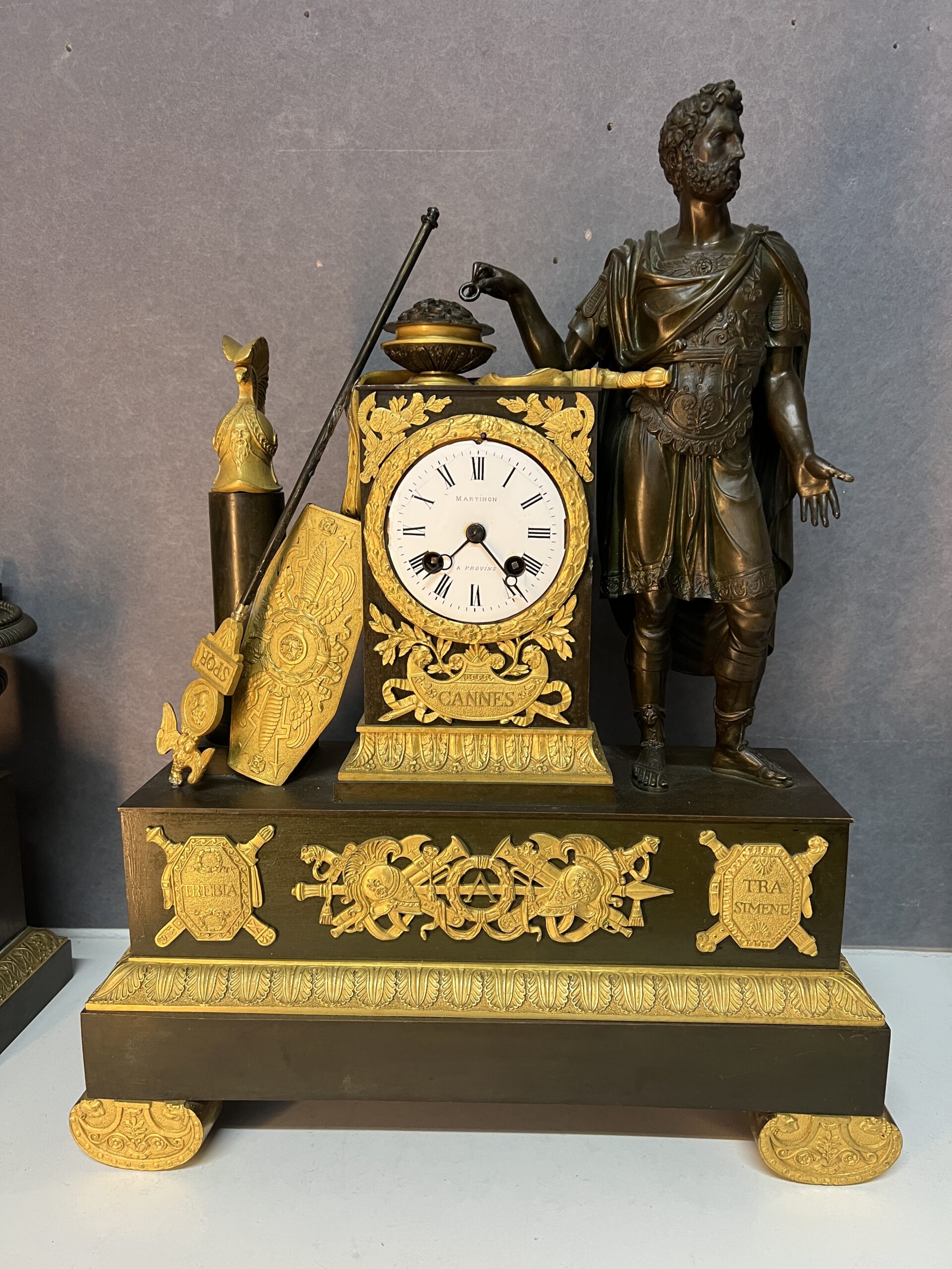 La façade de la pendule est richement décorée de motifs et d’inscriptions évoquant les batailles légendaires de « Cannes », « Trasimène » et « Trébie ».